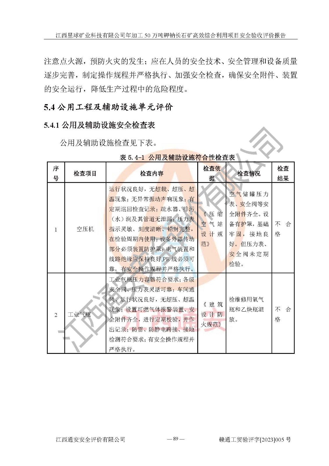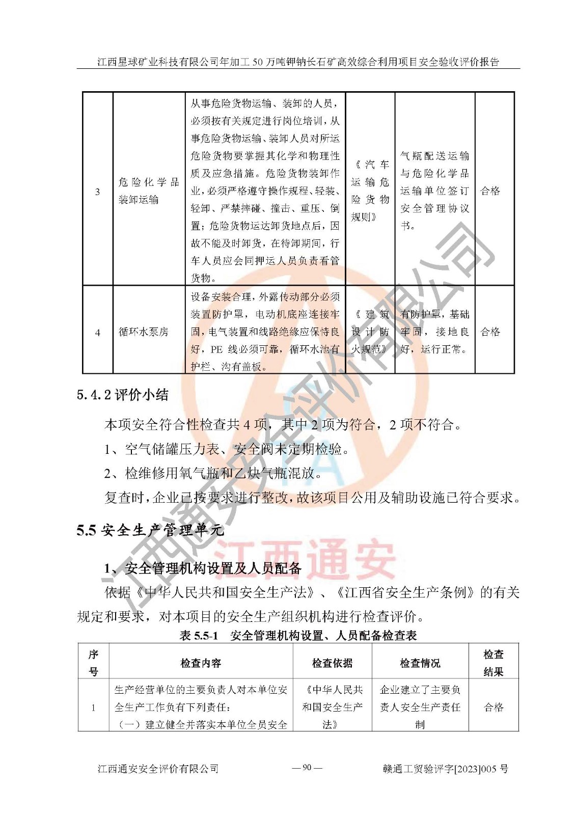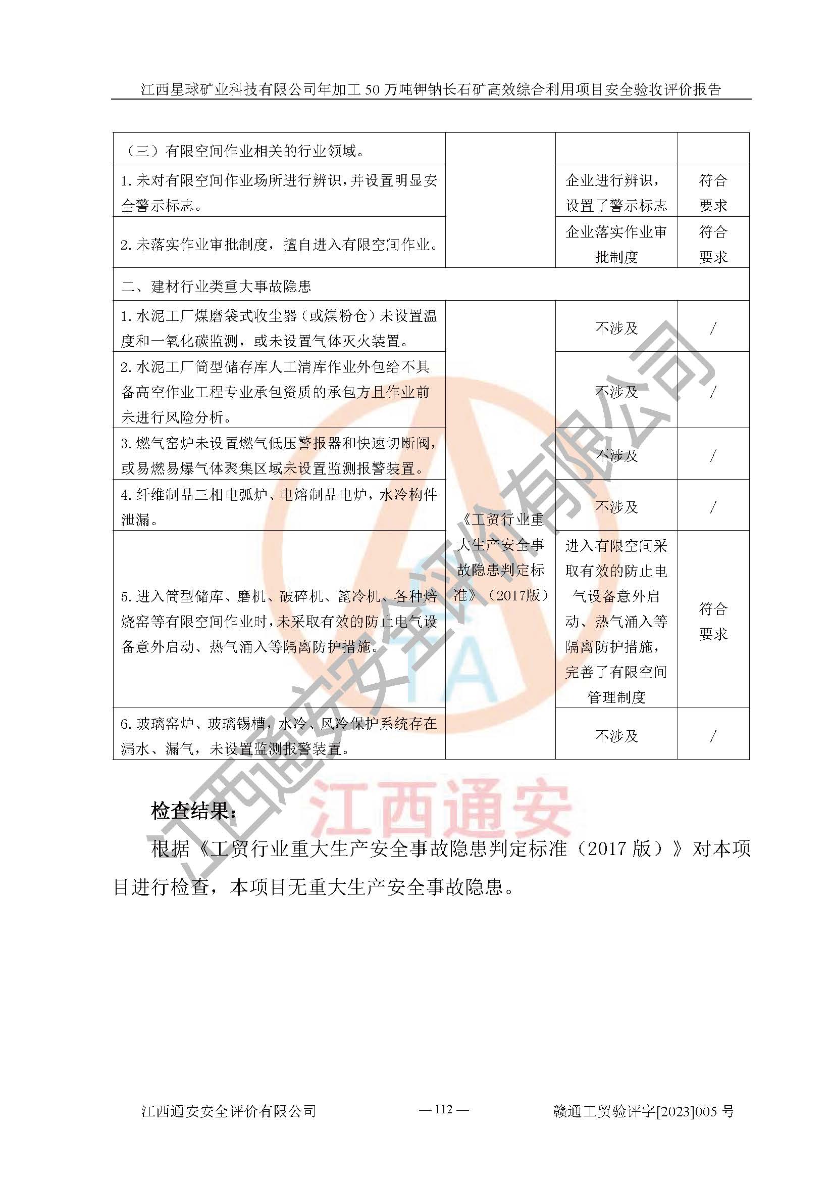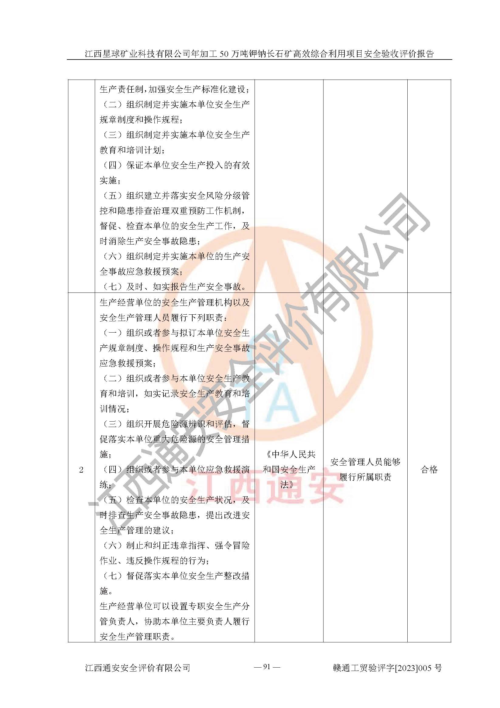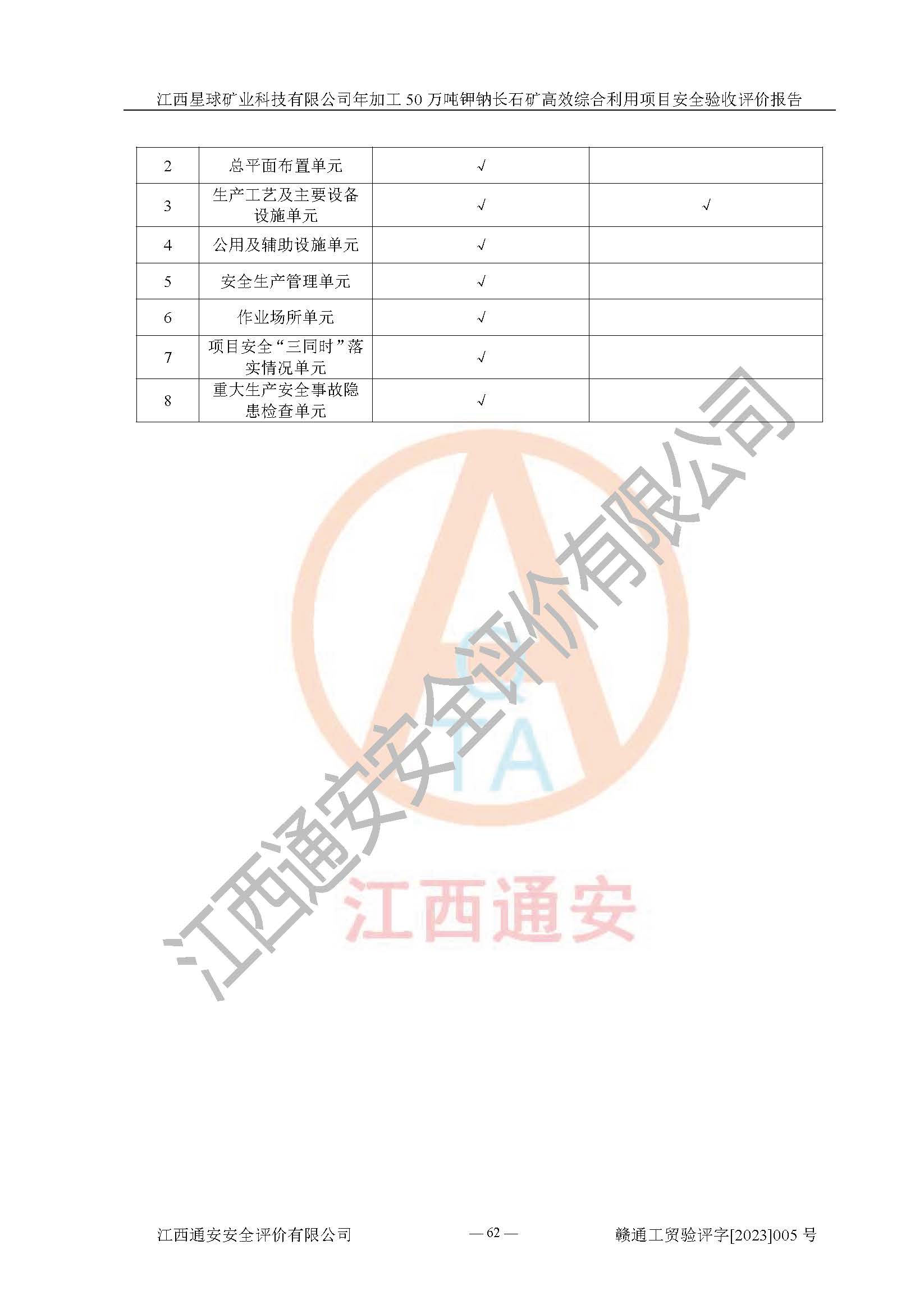 其它 | 根據(jù)《中華人民共和國安全生產(chǎn)法》、《新建項(xiàng)目安全設(shè)施“三同時(shí)”監(jiān)督管理辦法》(原**安全生產(chǎn)監(jiān)督管理總局令第77號(hào)修訂)等法律法規(guī)的要求,對(duì)江西星球礦業(yè)科技有限公司年加工50萬噸鉀鈉長石礦**綜合利用項(xiàng)目安全驗(yàn)收的基本條件進(jìn)行分析,結(jié)果如下: 1)本項(xiàng)目在初步設(shè)計(jì)及建設(shè)過程中基本能貫徹執(zhí)行**、地方及有關(guān)部門的安全生產(chǎn)法律法規(guī)、標(biāo)準(zhǔn)要求,取得了**相關(guān)部門的許可、備案。項(xiàng)目的設(shè)計(jì)、施工、監(jiān)理等單位均有相應(yīng)資質(zhì)。 2)本項(xiàng)目址選符合要求;總平面布置合理,主要建筑的防火間距符合符合《建筑設(shè)計(jì)防火規(guī)范》(GB50016-2014,2018版)、《工業(yè)企業(yè)總平面設(shè)計(jì)規(guī)范》(GB50187-2012)有關(guān)規(guī)范、標(biāo)準(zhǔn)的要求。 3)本項(xiàng)目生產(chǎn)工藝成熟、試運(yùn)行正常,試運(yùn)行中過程中工藝和裝置、設(shè)備(設(shè)施)安全、可靠,未發(fā)生安全事故。 4)本項(xiàng)目的特種設(shè)備由有資質(zhì)單位設(shè)計(jì)、制造、安裝,特種設(shè)備經(jīng)宜春市特種設(shè)備檢驗(yàn)中心檢驗(yàn)合格,符合《中華人民共和國特種設(shè)備安全法》、《特種設(shè)備安全監(jiān)察條例》(中華人民共和國***令第549號(hào))的規(guī)定。特種設(shè)備作業(yè)人員、特種作業(yè)人員均持證上崗。 5)公司主要負(fù)責(zé)人及安全管理人員取得了江西省億源企業(yè)咨詢服務(wù)有限公司頒發(fā)的培訓(xùn)證書,特種作業(yè)人員操作證在**期內(nèi),其他從業(yè)人員經(jīng)安全培訓(xùn)符合,取得上崗證。符合要求。 6)公司建立有安全管理制度,制定有各類人員的安全生產(chǎn)責(zé)任制、各項(xiàng)安全管理制度和操作規(guī)程。按照**有關(guān)規(guī)定編制了事故應(yīng)急救援預(yù)案并進(jìn)行了備案,并定期進(jìn)行演練等,符合要求。 7)本項(xiàng)目作業(yè)條件危險(xiǎn)性分析結(jié)果:在選定的單元的危險(xiǎn)程度均為“可能危險(xiǎn),需要注意”或“稍有危險(xiǎn),可以接受”,作業(yè)條件相對(duì)安全。 評(píng)價(jià)結(jié)論: 江西星球礦業(yè)科技有限公司年加工50萬噸鉀鈉長石礦**綜合利用項(xiàng)目的安全設(shè)施及安全管理符合**及有關(guān)部門關(guān)于安全生產(chǎn)法律、法規(guī)、標(biāo)準(zhǔn)的要求,該項(xiàng)目試生產(chǎn)以來,工藝設(shè)備、安全設(shè)施及企業(yè)安全管理機(jī)制等運(yùn)行正常,安全設(shè)施、措施達(dá)到設(shè)計(jì)要求和預(yù)期結(jié)果,可以滿足建設(shè)項(xiàng)目安全生產(chǎn)的要求,安全生產(chǎn)管理**,具備竣工驗(yàn)收條件。 | ||||