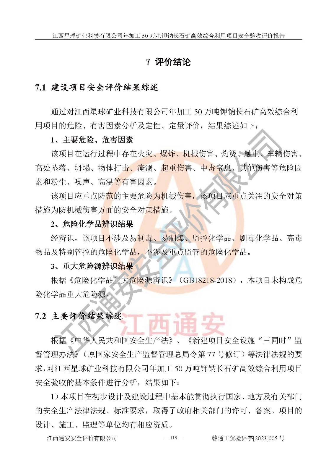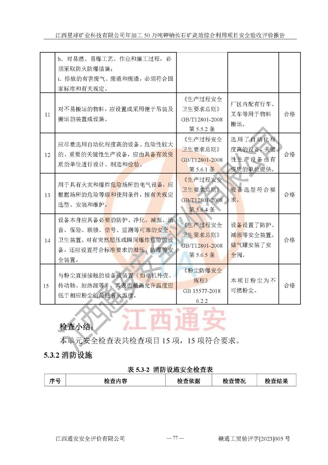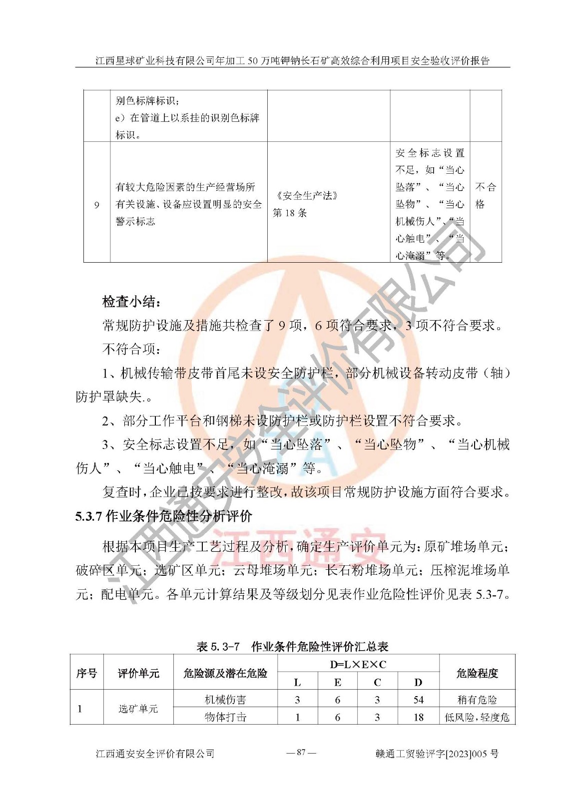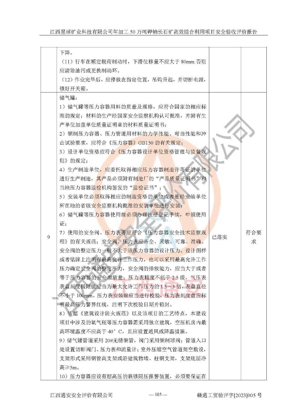 其它 | 根據(jù)《中華人民共和國安全生產(chǎn)法》、《新建項(xiàng)目安全設(shè)施“三同時(shí)”監(jiān)督管理辦法》(原**安全生產(chǎn)監(jiān)督管理總局令第77號(hào)修訂)等法律法規(guī)的要求,對(duì)江西星球礦業(yè)科技有限公司年加工50萬噸鉀鈉長石礦**綜合利用項(xiàng)目安全驗(yàn)收的基本條件進(jìn)行分析,結(jié)果如下: 1)本項(xiàng)目在初步設(shè)計(jì)及建設(shè)過程中基本能貫徹執(zhí)行**、地方及有關(guān)部門的安全生產(chǎn)法律法規(guī)、標(biāo)準(zhǔn)要求,取得了**相關(guān)部門的許可、備案。項(xiàng)目的設(shè)計(jì)、施工、監(jiān)理等單位均有相應(yīng)資質(zhì)。 2)本項(xiàng)目址選符合要求;總平面布置合理,主要建筑的防火間距符合符合《建筑設(shè)計(jì)防火規(guī)范》(GB50016-2014,2018版)、《工業(yè)企業(yè)總平面設(shè)計(jì)規(guī)范》(GB50187-2012)有關(guān)規(guī)范、標(biāo)準(zhǔn)的要求。 3)本項(xiàng)目生產(chǎn)工藝成熟、試運(yùn)行正常,試運(yùn)行中過程中工藝和裝置、設(shè)備(設(shè)施)安全、可靠,未發(fā)生安全事故。 4)本項(xiàng)目的特種設(shè)備由有資質(zhì)單位設(shè)計(jì)、制造、安裝,特種設(shè)備經(jīng)宜春市特種設(shè)備檢驗(yàn)中心檢驗(yàn)合格,符合《中華人民共和國特種設(shè)備安全法》、《特種設(shè)備安全監(jiān)察條例》(中華人民共和國***令第549號(hào))的規(guī)定。特種設(shè)備作業(yè)人員、特種作業(yè)人員均持證上崗。 5)公司主要負(fù)責(zé)人及安全管理人員取得了江西省億源企業(yè)咨詢服務(wù)有限公司頒發(fā)的培訓(xùn)證書,特種作業(yè)人員操作證在**期內(nèi),其他從業(yè)人員經(jīng)安全培訓(xùn)符合,取得上崗證。符合要求。 6)公司建立有安全管理制度,制定有各類人員的安全生產(chǎn)責(zé)任制、各項(xiàng)安全管理制度和操作規(guī)程。按照**有關(guān)規(guī)定編制了事故應(yīng)急救援預(yù)案并進(jìn)行了備案,并定期進(jìn)行演練等,符合要求。 7)本項(xiàng)目作業(yè)條件危險(xiǎn)性分析結(jié)果:在選定的單元的危險(xiǎn)程度均為“可能危險(xiǎn),需要注意”或“稍有危險(xiǎn),可以接受”,作業(yè)條件相對(duì)安全。 評(píng)價(jià)結(jié)論: 江西星球礦業(yè)科技有限公司年加工50萬噸鉀鈉長石礦**綜合利用項(xiàng)目的安全設(shè)施及安全管理符合**及有關(guān)部門關(guān)于安全生產(chǎn)法律、法規(guī)、標(biāo)準(zhǔn)的要求,該項(xiàng)目試生產(chǎn)以來,工藝設(shè)備、安全設(shè)施及企業(yè)安全管理機(jī)制等運(yùn)行正常,安全設(shè)施、措施達(dá)到設(shè)計(jì)要求和預(yù)期結(jié)果,可以滿足建設(shè)項(xiàng)目安全生產(chǎn)的要求,安全生產(chǎn)管理**,具備竣工驗(yàn)收條件。 | ||||