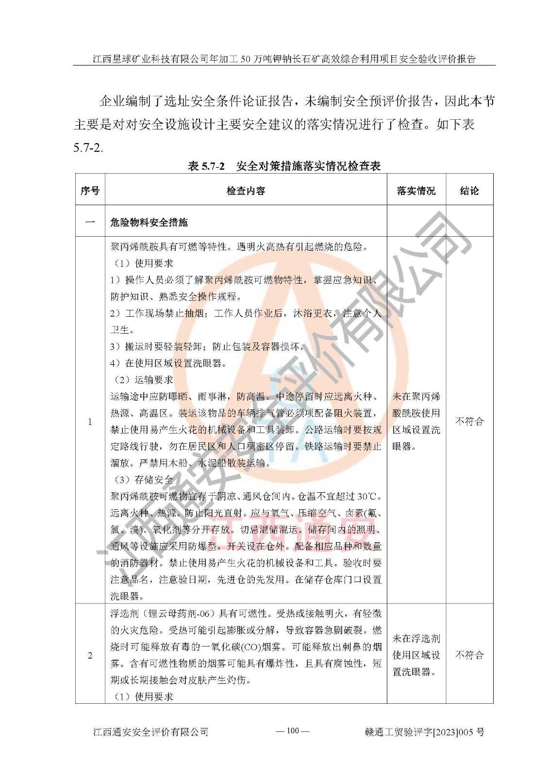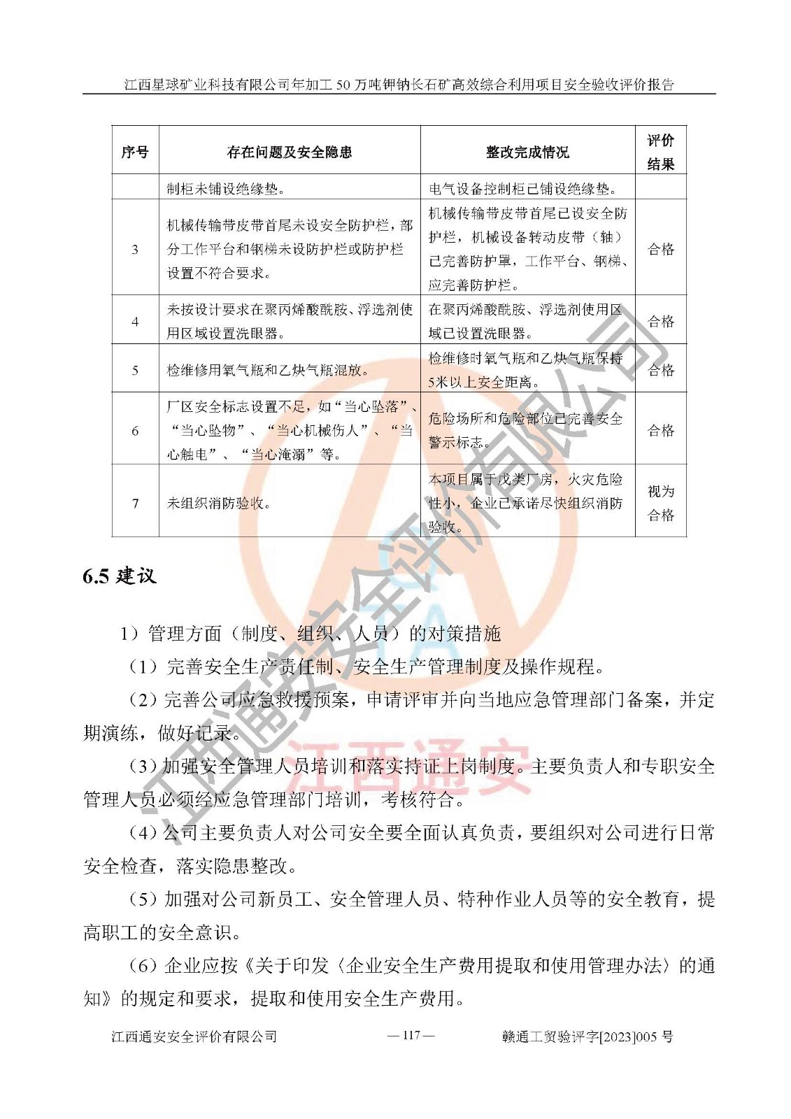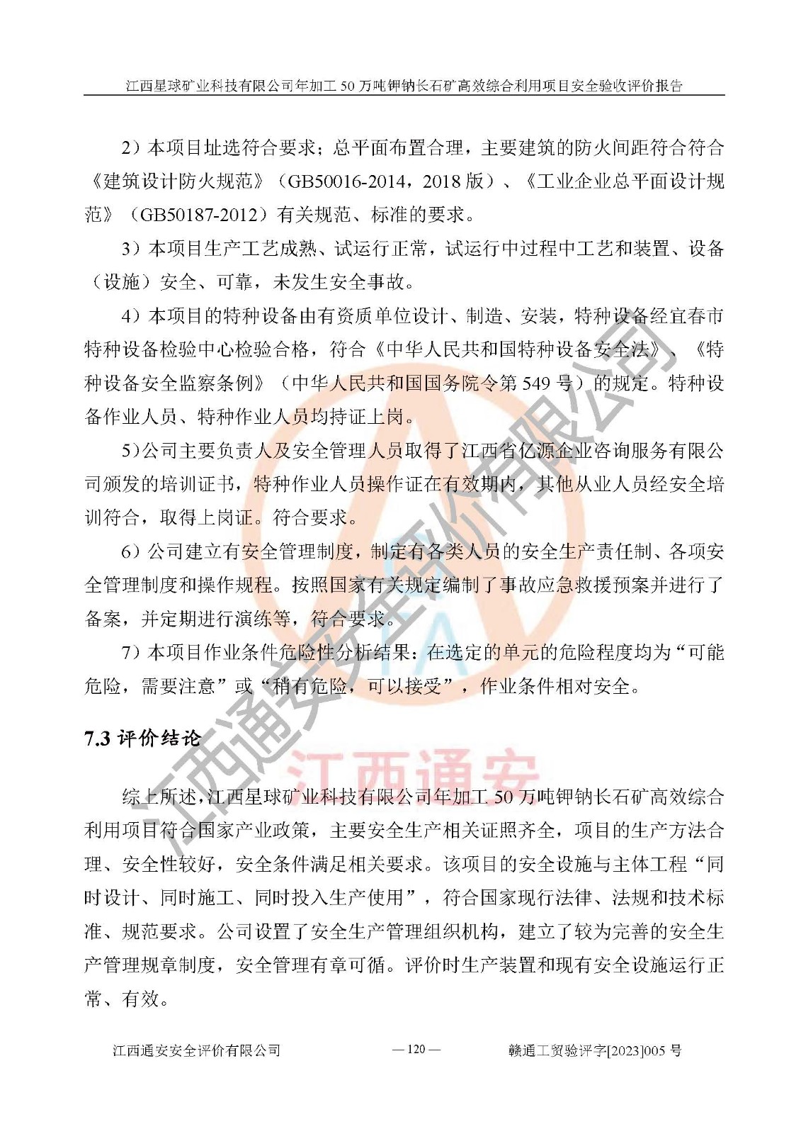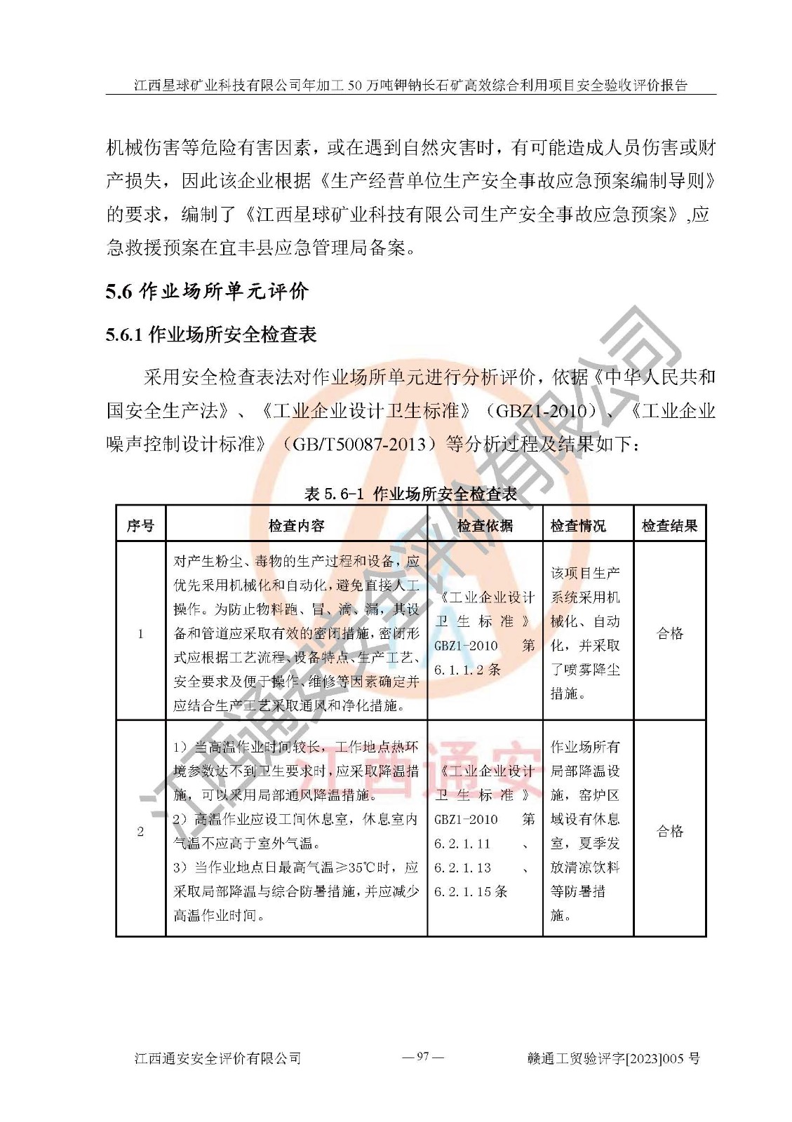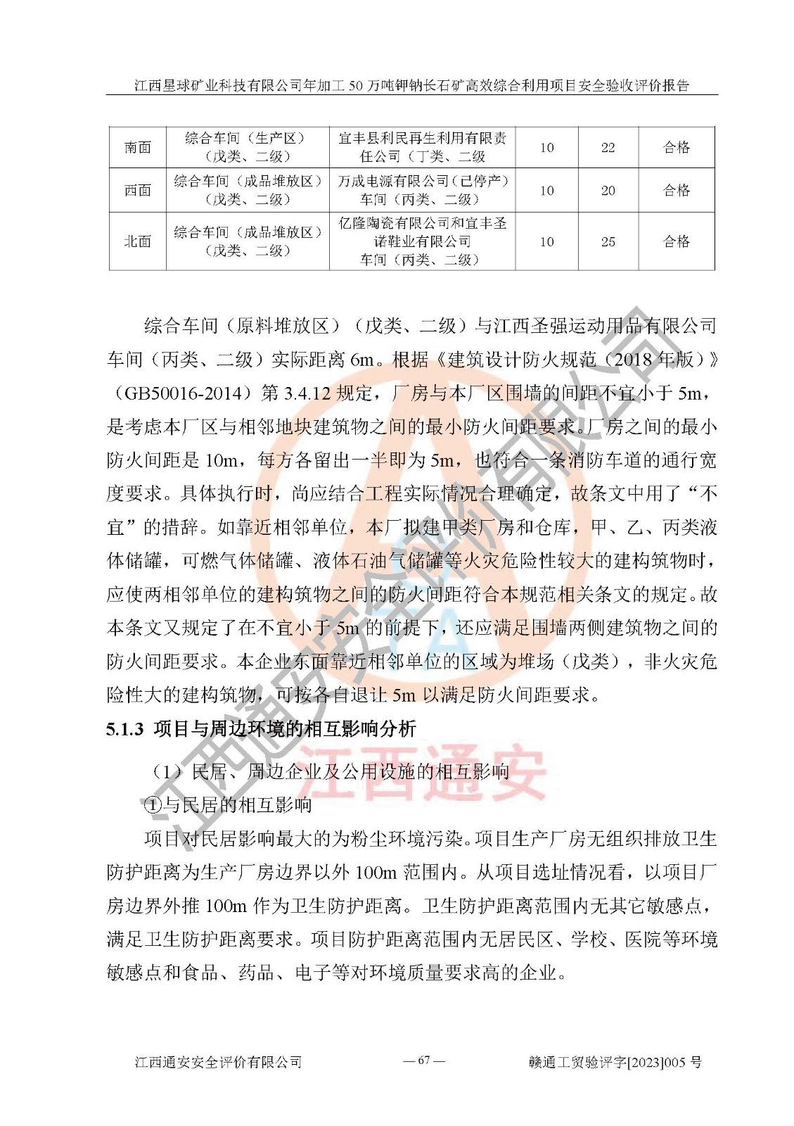 其它 | 根據(jù)《中華人民共和國安全生產(chǎn)法》、《新建項(xiàng)目安全設(shè)施“三同時(shí)”監(jiān)督管理辦法》(原**安全生產(chǎn)監(jiān)督管理總局令第77號(hào)修訂)等法律法規(guī)的要求,對(duì)江西星球礦業(yè)科技有限公司年加工50萬噸鉀鈉長石礦**綜合利用項(xiàng)目安全驗(yàn)收的基本條件進(jìn)行分析,結(jié)果如下: 1)本項(xiàng)目在初步設(shè)計(jì)及建設(shè)過程中基本能貫徹執(zhí)行**、地方及有關(guān)部門的安全生產(chǎn)法律法規(guī)、標(biāo)準(zhǔn)要求,取得了**相關(guān)部門的許可、備案。項(xiàng)目的設(shè)計(jì)、施工、監(jiān)理等單位均有相應(yīng)資質(zhì)。 2)本項(xiàng)目址選符合要求;總平面布置合理,主要建筑的防火間距符合符合《建筑設(shè)計(jì)防火規(guī)范》(GB50016-2014,2018版)、《工業(yè)企業(yè)總平面設(shè)計(jì)規(guī)范》(GB50187-2012)有關(guān)規(guī)范、標(biāo)準(zhǔn)的要求。 3)本項(xiàng)目生產(chǎn)工藝成熟、試運(yùn)行正常,試運(yùn)行中過程中工藝和裝置、設(shè)備(設(shè)施)安全、可靠,未發(fā)生安全事故。 4)本項(xiàng)目的特種設(shè)備由有資質(zhì)單位設(shè)計(jì)、制造、安裝,特種設(shè)備經(jīng)宜春市特種設(shè)備檢驗(yàn)中心檢驗(yàn)合格,符合《中華人民共和國特種設(shè)備安全法》、《特種設(shè)備安全監(jiān)察條例》(中華人民共和國***令第549號(hào))的規(guī)定。特種設(shè)備作業(yè)人員、特種作業(yè)人員均持證上崗。 5)公司主要負(fù)責(zé)人及安全管理人員取得了江西省億源企業(yè)咨詢服務(wù)有限公司頒發(fā)的培訓(xùn)證書,特種作業(yè)人員操作證在**期內(nèi),其他從業(yè)人員經(jīng)安全培訓(xùn)符合,取得上崗證。符合要求。 6)公司建立有安全管理制度,制定有各類人員的安全生產(chǎn)責(zé)任制、各項(xiàng)安全管理制度和操作規(guī)程。按照**有關(guān)規(guī)定編制了事故應(yīng)急救援預(yù)案并進(jìn)行了備案,并定期進(jìn)行演練等,符合要求。 7)本項(xiàng)目作業(yè)條件危險(xiǎn)性分析結(jié)果:在選定的單元的危險(xiǎn)程度均為“可能危險(xiǎn),需要注意”或“稍有危險(xiǎn),可以接受”,作業(yè)條件相對(duì)安全。 評(píng)價(jià)結(jié)論: 江西星球礦業(yè)科技有限公司年加工50萬噸鉀鈉長石礦**綜合利用項(xiàng)目的安全設(shè)施及安全管理符合**及有關(guān)部門關(guān)于安全生產(chǎn)法律、法規(guī)、標(biāo)準(zhǔn)的要求,該項(xiàng)目試生產(chǎn)以來,工藝設(shè)備、安全設(shè)施及企業(yè)安全管理機(jī)制等運(yùn)行正常,安全設(shè)施、措施達(dá)到設(shè)計(jì)要求和預(yù)期結(jié)果,可以滿足建設(shè)項(xiàng)目安全生產(chǎn)的要求,安全生產(chǎn)管理**,具備竣工驗(yàn)收條件。 | ||||