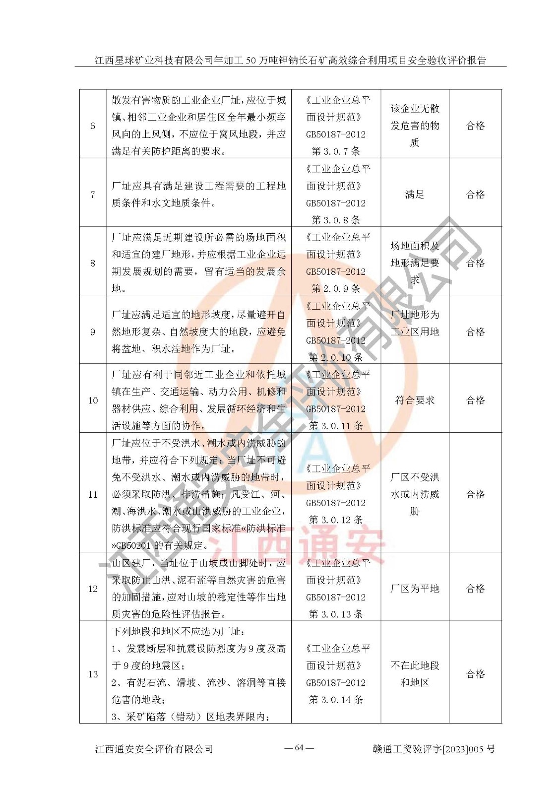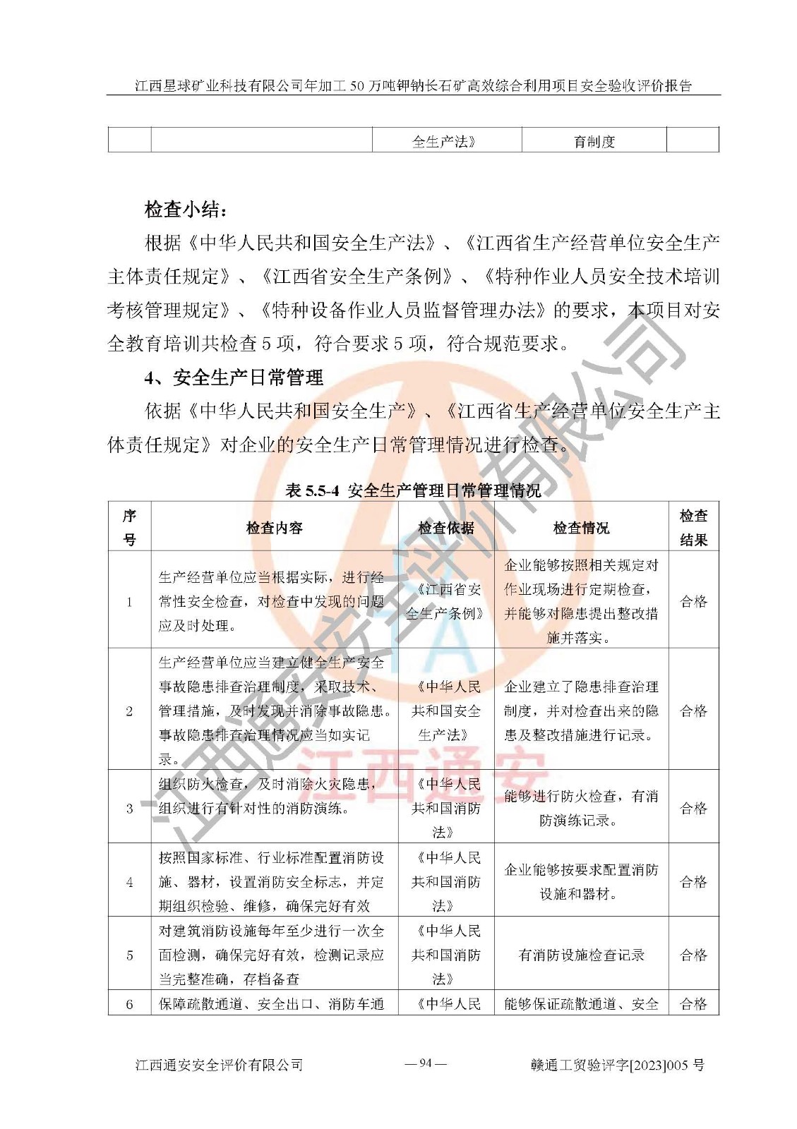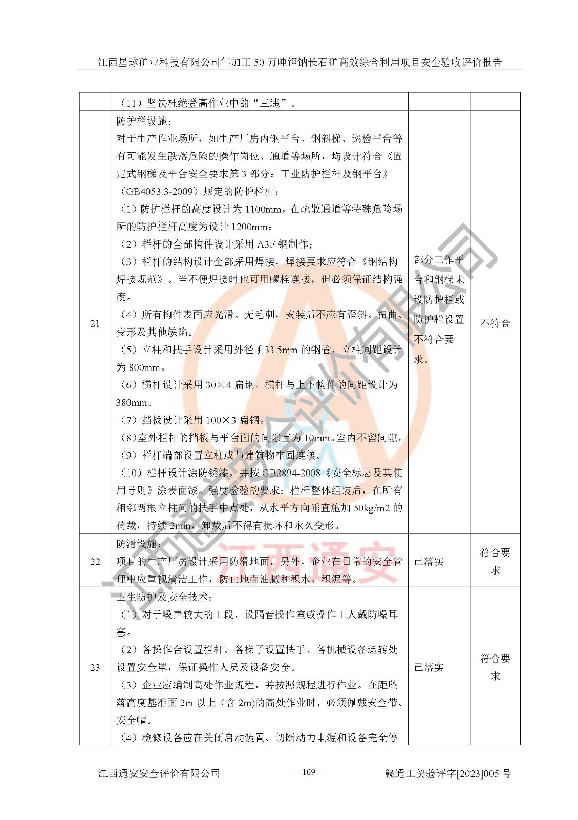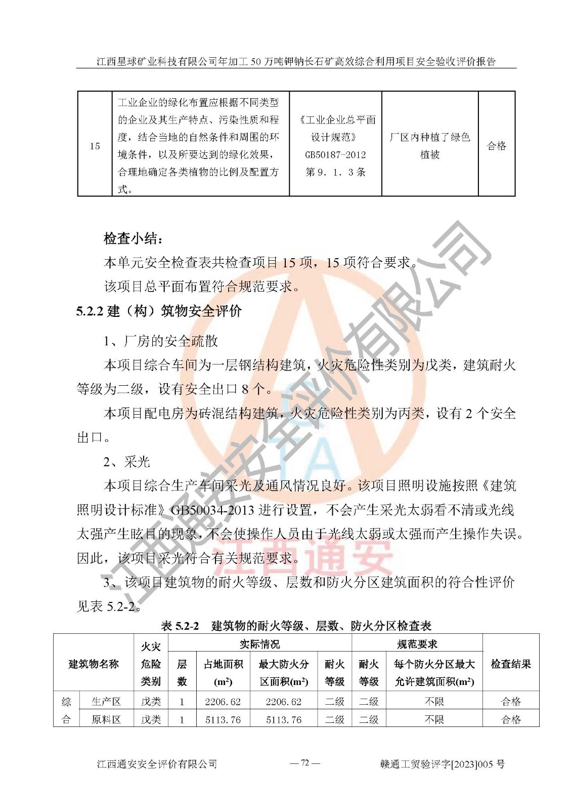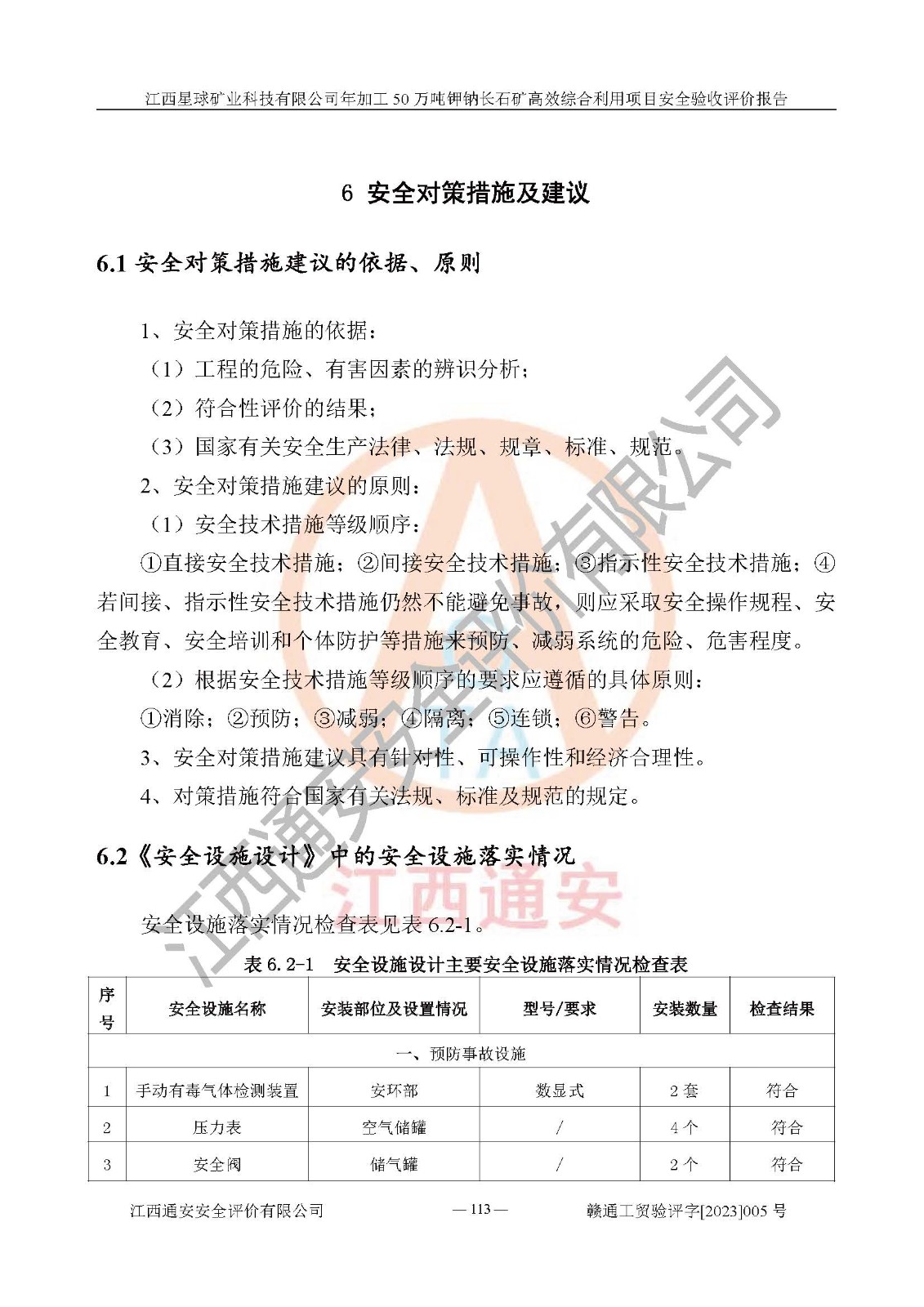其它 | 根據(jù)《中華人民共和國安全生產(chǎn)法》、《新建項(xiàng)目安全設(shè)施“三同時(shí)”監(jiān)督管理辦法》(原**安全生產(chǎn)監(jiān)督管理總局令第77號(hào)修訂)等法律法規(guī)的要求,對(duì)江西星球礦業(yè)科技有限公司年加工50萬噸鉀鈉長石礦**綜合利用項(xiàng)目安全驗(yàn)收的基本條件進(jìn)行分析,結(jié)果如下: 1)本項(xiàng)目在初步設(shè)計(jì)及建設(shè)過程中基本能貫徹執(zhí)行**、地方及有關(guān)部門的安全生產(chǎn)法律法規(guī)、標(biāo)準(zhǔn)要求,取得了**相關(guān)部門的許可、備案。項(xiàng)目的設(shè)計(jì)、施工、監(jiān)理等單位均有相應(yīng)資質(zhì)。 2)本項(xiàng)目址選符合要求;總平面布置合理,主要建筑的防火間距符合符合《建筑設(shè)計(jì)防火規(guī)范》(GB50016-2014,2018版)、《工業(yè)企業(yè)總平面設(shè)計(jì)規(guī)范》(GB50187-2012)有關(guān)規(guī)范、標(biāo)準(zhǔn)的要求。 3)本項(xiàng)目生產(chǎn)工藝成熟、試運(yùn)行正常,試運(yùn)行中過程中工藝和裝置、設(shè)備(設(shè)施)安全、可靠,未發(fā)生安全事故。 4)本項(xiàng)目的特種設(shè)備由有資質(zhì)單位設(shè)計(jì)、制造、安裝,特種設(shè)備經(jīng)宜春市特種設(shè)備檢驗(yàn)中心檢驗(yàn)合格,符合《中華人民共和國特種設(shè)備安全法》、《特種設(shè)備安全監(jiān)察條例》(中華人民共和國***令第549號(hào))的規(guī)定。特種設(shè)備作業(yè)人員、特種作業(yè)人員均持證上崗。 5)公司主要負(fù)責(zé)人及安全管理人員取得了江西省億源企業(yè)咨詢服務(wù)有限公司頒發(fā)的培訓(xùn)證書,特種作業(yè)人員操作證在**期內(nèi),其他從業(yè)人員經(jīng)安全培訓(xùn)符合,取得上崗證。符合要求。 6)公司建立有安全管理制度,制定有各類人員的安全生產(chǎn)責(zé)任制、各項(xiàng)安全管理制度和操作規(guī)程。按照**有關(guān)規(guī)定編制了事故應(yīng)急救援預(yù)案并進(jìn)行了備案,并定期進(jìn)行演練等,符合要求。 7)本項(xiàng)目作業(yè)條件危險(xiǎn)性分析結(jié)果:在選定的單元的危險(xiǎn)程度均為“可能危險(xiǎn),需要注意”或“稍有危險(xiǎn),可以接受”,作業(yè)條件相對(duì)安全。 評(píng)價(jià)結(jié)論: 江西星球礦業(yè)科技有限公司年加工50萬噸鉀鈉長石礦**綜合利用項(xiàng)目的安全設(shè)施及安全管理符合**及有關(guān)部門關(guān)于安全生產(chǎn)法律、法規(guī)、標(biāo)準(zhǔn)的要求,該項(xiàng)目試生產(chǎn)以來,工藝設(shè)備、安全設(shè)施及企業(yè)安全管理機(jī)制等運(yùn)行正常,安全設(shè)施、措施達(dá)到設(shè)計(jì)要求和預(yù)期結(jié)果,可以滿足建設(shè)項(xiàng)目安全生產(chǎn)的要求,安全生產(chǎn)管理**,具備竣工驗(yàn)收條件。 | ||||