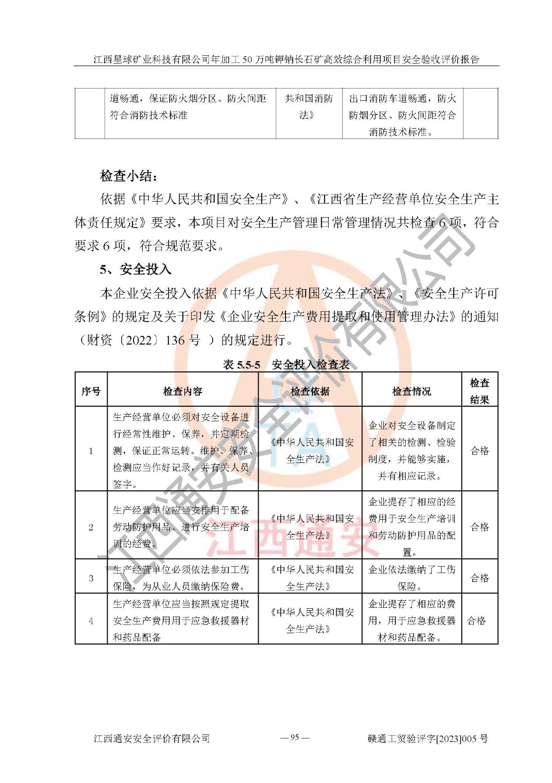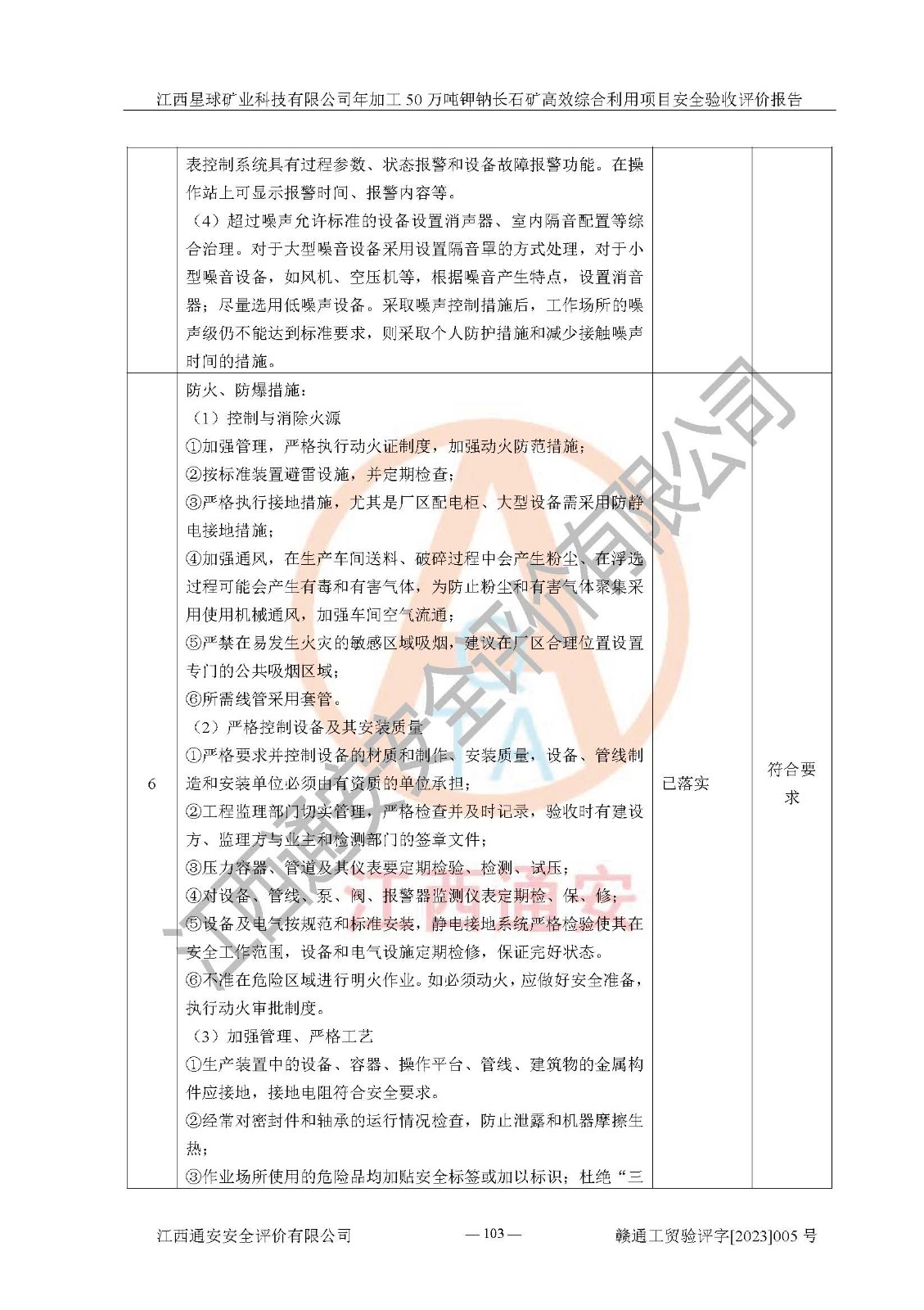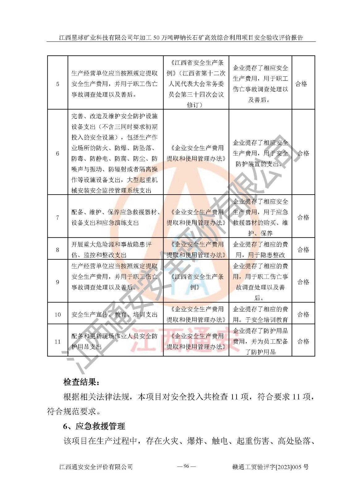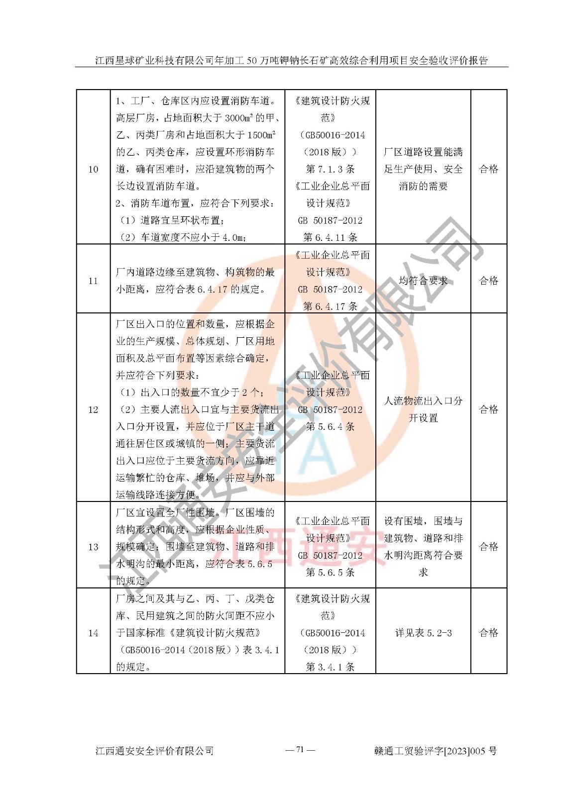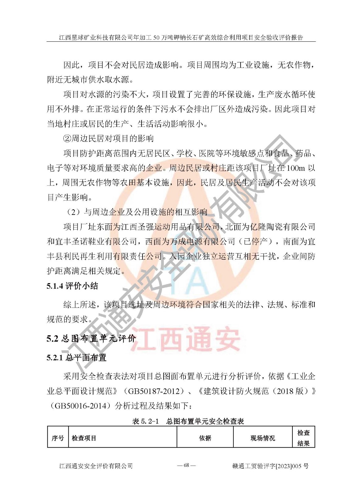 其它 | 根據(jù)《中華人民共和國安全生產(chǎn)法》、《新建項(xiàng)目安全設(shè)施“三同時(shí)”監(jiān)督管理辦法》(原**安全生產(chǎn)監(jiān)督管理總局令第77號(hào)修訂)等法律法規(guī)的要求,對(duì)江西星球礦業(yè)科技有限公司年加工50萬噸鉀鈉長石礦**綜合利用項(xiàng)目安全驗(yàn)收的基本條件進(jìn)行分析,結(jié)果如下: 1)本項(xiàng)目在初步設(shè)計(jì)及建設(shè)過程中基本能貫徹執(zhí)行**、地方及有關(guān)部門的安全生產(chǎn)法律法規(guī)、標(biāo)準(zhǔn)要求,取得了**相關(guān)部門的許可、備案。項(xiàng)目的設(shè)計(jì)、施工、監(jiān)理等單位均有相應(yīng)資質(zhì)。 2)本項(xiàng)目址選符合要求;總平面布置合理,主要建筑的防火間距符合符合《建筑設(shè)計(jì)防火規(guī)范》(GB50016-2014,2018版)、《工業(yè)企業(yè)總平面設(shè)計(jì)規(guī)范》(GB50187-2012)有關(guān)規(guī)范、標(biāo)準(zhǔn)的要求。 3)本項(xiàng)目生產(chǎn)工藝成熟、試運(yùn)行正常,試運(yùn)行中過程中工藝和裝置、設(shè)備(設(shè)施)安全、可靠,未發(fā)生安全事故。 4)本項(xiàng)目的特種設(shè)備由有資質(zhì)單位設(shè)計(jì)、制造、安裝,特種設(shè)備經(jīng)宜春市特種設(shè)備檢驗(yàn)中心檢驗(yàn)合格,符合《中華人民共和國特種設(shè)備安全法》、《特種設(shè)備安全監(jiān)察條例》(中華人民共和國***令第549號(hào))的規(guī)定。特種設(shè)備作業(yè)人員、特種作業(yè)人員均持證上崗。 5)公司主要負(fù)責(zé)人及安全管理人員取得了江西省億源企業(yè)咨詢服務(wù)有限公司頒發(fā)的培訓(xùn)證書,特種作業(yè)人員操作證在**期內(nèi),其他從業(yè)人員經(jīng)安全培訓(xùn)符合,取得上崗證。符合要求。 6)公司建立有安全管理制度,制定有各類人員的安全生產(chǎn)責(zé)任制、各項(xiàng)安全管理制度和操作規(guī)程。按照**有關(guān)規(guī)定編制了事故應(yīng)急救援預(yù)案并進(jìn)行了備案,并定期進(jìn)行演練等,符合要求。 7)本項(xiàng)目作業(yè)條件危險(xiǎn)性分析結(jié)果:在選定的單元的危險(xiǎn)程度均為“可能危險(xiǎn),需要注意”或“稍有危險(xiǎn),可以接受”,作業(yè)條件相對(duì)安全。 評(píng)價(jià)結(jié)論: 江西星球礦業(yè)科技有限公司年加工50萬噸鉀鈉長石礦**綜合利用項(xiàng)目的安全設(shè)施及安全管理符合**及有關(guān)部門關(guān)于安全生產(chǎn)法律、法規(guī)、標(biāo)準(zhǔn)的要求,該項(xiàng)目試生產(chǎn)以來,工藝設(shè)備、安全設(shè)施及企業(yè)安全管理機(jī)制等運(yùn)行正常,安全設(shè)施、措施達(dá)到設(shè)計(jì)要求和預(yù)期結(jié)果,可以滿足建設(shè)項(xiàng)目安全生產(chǎn)的要求,安全生產(chǎn)管理**,具備竣工驗(yàn)收條件。 | ||||