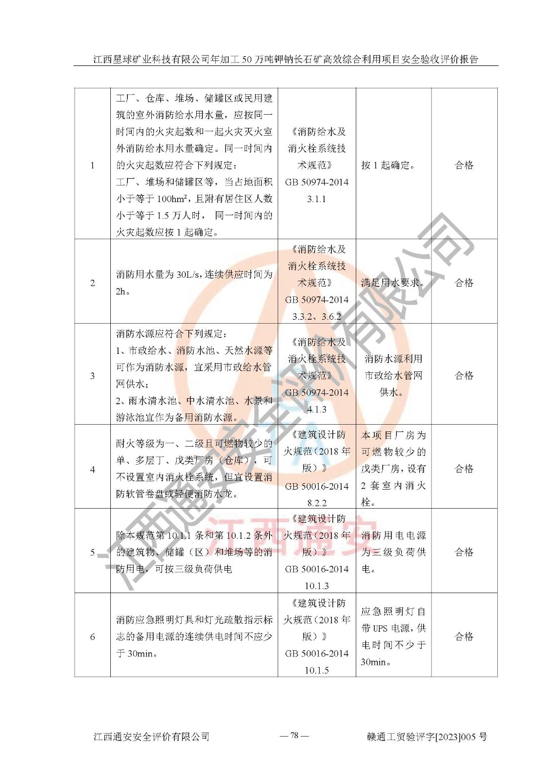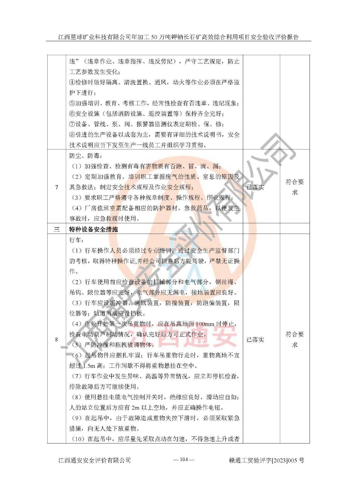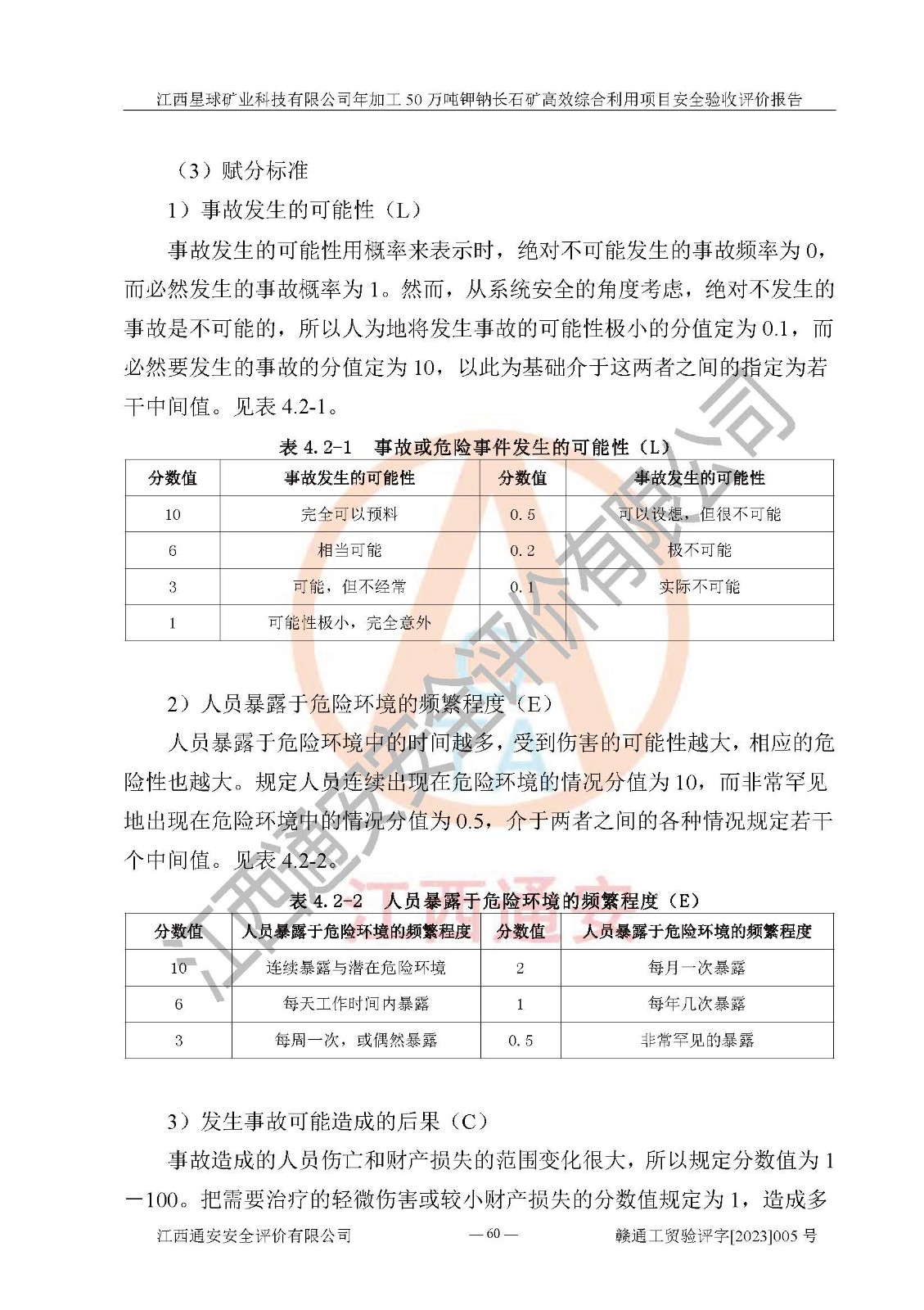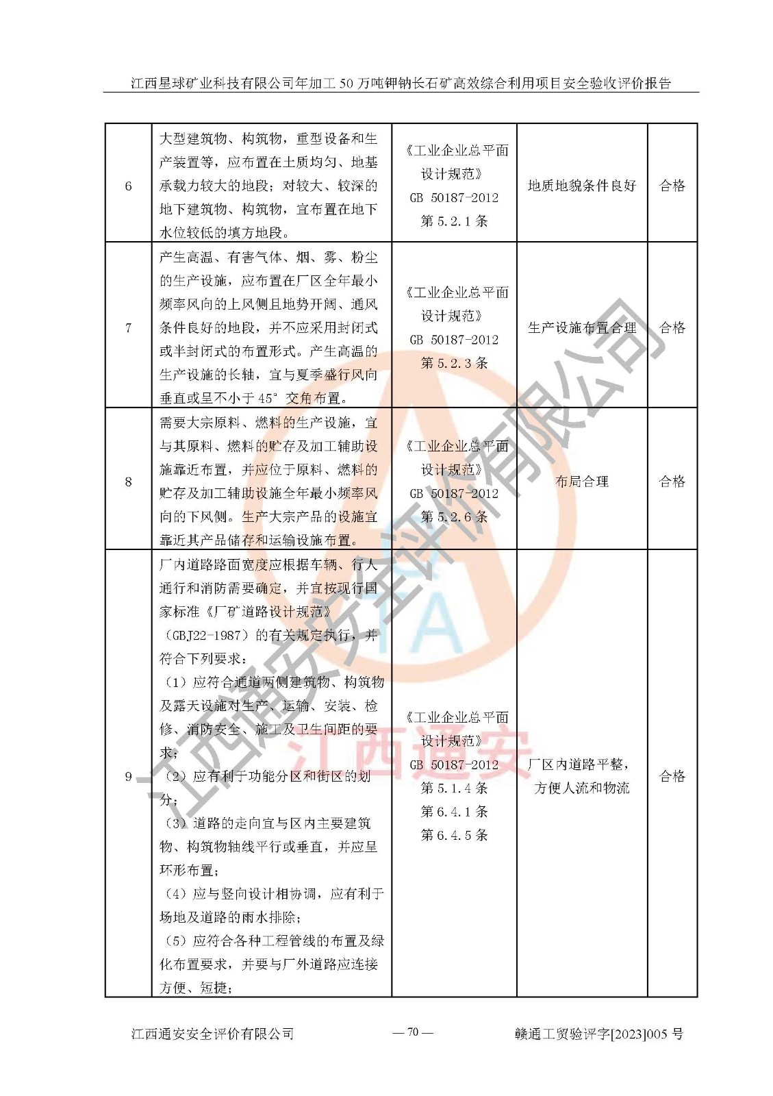 其它 | 根據(jù)《中華人民共和國安全生產(chǎn)法》、《新建項(xiàng)目安全設(shè)施“三同時(shí)”監(jiān)督管理辦法》(原**安全生產(chǎn)監(jiān)督管理總局令第77號(hào)修訂)等法律法規(guī)的要求,對(duì)江西星球礦業(yè)科技有限公司年加工50萬噸鉀鈉長石礦**綜合利用項(xiàng)目安全驗(yàn)收的基本條件進(jìn)行分析,結(jié)果如下: 1)本項(xiàng)目在初步設(shè)計(jì)及建設(shè)過程中基本能貫徹執(zhí)行**、地方及有關(guān)部門的安全生產(chǎn)法律法規(guī)、標(biāo)準(zhǔn)要求,取得了**相關(guān)部門的許可、備案。項(xiàng)目的設(shè)計(jì)、施工、監(jiān)理等單位均有相應(yīng)資質(zhì)。 2)本項(xiàng)目址選符合要求;總平面布置合理,主要建筑的防火間距符合符合《建筑設(shè)計(jì)防火規(guī)范》(GB50016-2014,2018版)、《工業(yè)企業(yè)總平面設(shè)計(jì)規(guī)范》(GB50187-2012)有關(guān)規(guī)范、標(biāo)準(zhǔn)的要求。 3)本項(xiàng)目生產(chǎn)工藝成熟、試運(yùn)行正常,試運(yùn)行中過程中工藝和裝置、設(shè)備(設(shè)施)安全、可靠,未發(fā)生安全事故。 4)本項(xiàng)目的特種設(shè)備由有資質(zhì)單位設(shè)計(jì)、制造、安裝,特種設(shè)備經(jīng)宜春市特種設(shè)備檢驗(yàn)中心檢驗(yàn)合格,符合《中華人民共和國特種設(shè)備安全法》、《特種設(shè)備安全監(jiān)察條例》(中華人民共和國***令第549號(hào))的規(guī)定。特種設(shè)備作業(yè)人員、特種作業(yè)人員均持證上崗。 5)公司主要負(fù)責(zé)人及安全管理人員取得了江西省億源企業(yè)咨詢服務(wù)有限公司頒發(fā)的培訓(xùn)證書,特種作業(yè)人員操作證在**期內(nèi),其他從業(yè)人員經(jīng)安全培訓(xùn)符合,取得上崗證。符合要求。 6)公司建立有安全管理制度,制定有各類人員的安全生產(chǎn)責(zé)任制、各項(xiàng)安全管理制度和操作規(guī)程。按照**有關(guān)規(guī)定編制了事故應(yīng)急救援預(yù)案并進(jìn)行了備案,并定期進(jìn)行演練等,符合要求。 7)本項(xiàng)目作業(yè)條件危險(xiǎn)性分析結(jié)果:在選定的單元的危險(xiǎn)程度均為“可能危險(xiǎn),需要注意”或“稍有危險(xiǎn),可以接受”,作業(yè)條件相對(duì)安全。 評(píng)價(jià)結(jié)論: 江西星球礦業(yè)科技有限公司年加工50萬噸鉀鈉長石礦**綜合利用項(xiàng)目的安全設(shè)施及安全管理符合**及有關(guān)部門關(guān)于安全生產(chǎn)法律、法規(guī)、標(biāo)準(zhǔn)的要求,該項(xiàng)目試生產(chǎn)以來,工藝設(shè)備、安全設(shè)施及企業(yè)安全管理機(jī)制等運(yùn)行正常,安全設(shè)施、措施達(dá)到設(shè)計(jì)要求和預(yù)期結(jié)果,可以滿足建設(shè)項(xiàng)目安全生產(chǎn)的要求,安全生產(chǎn)管理**,具備竣工驗(yàn)收條件。 | ||||