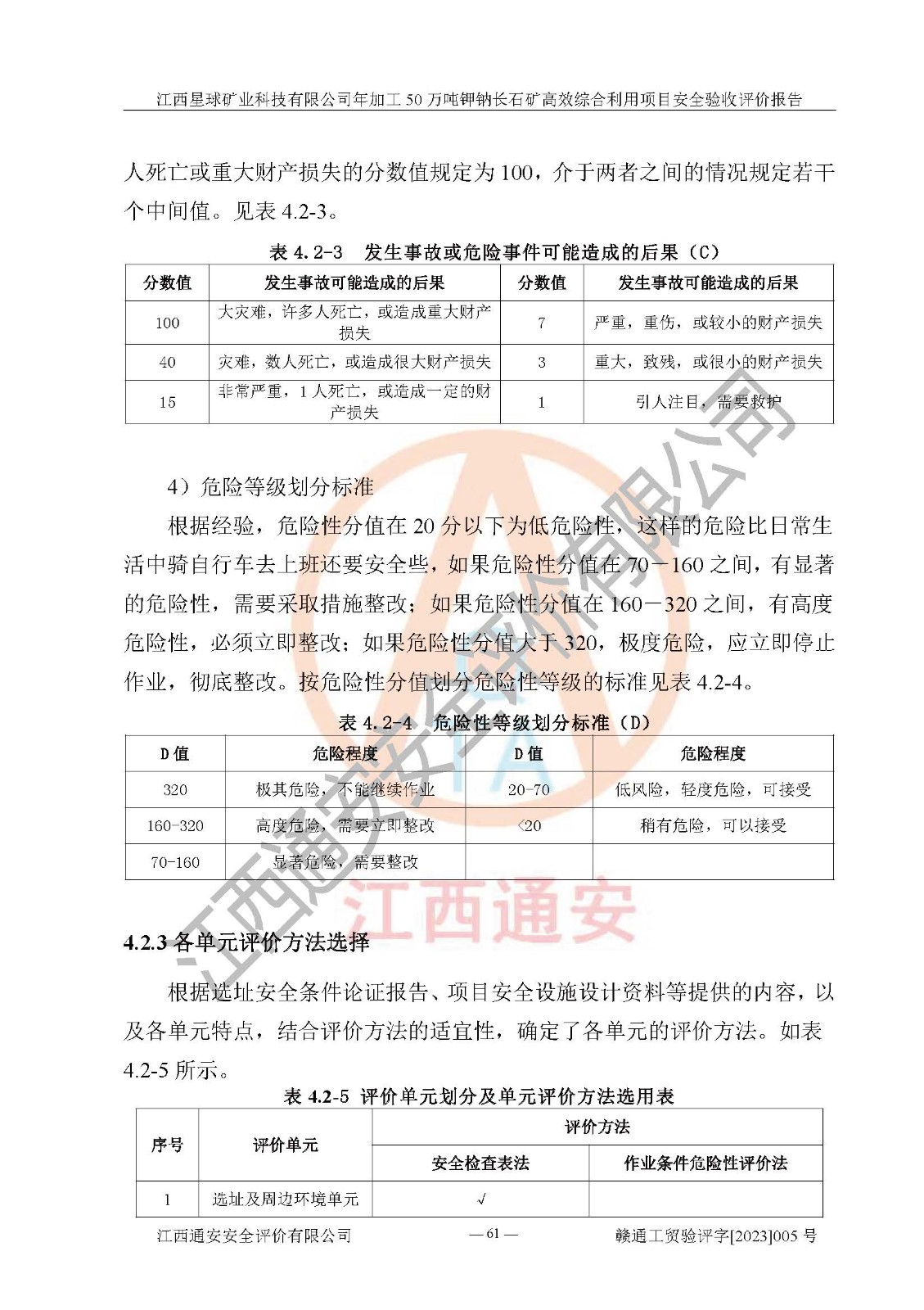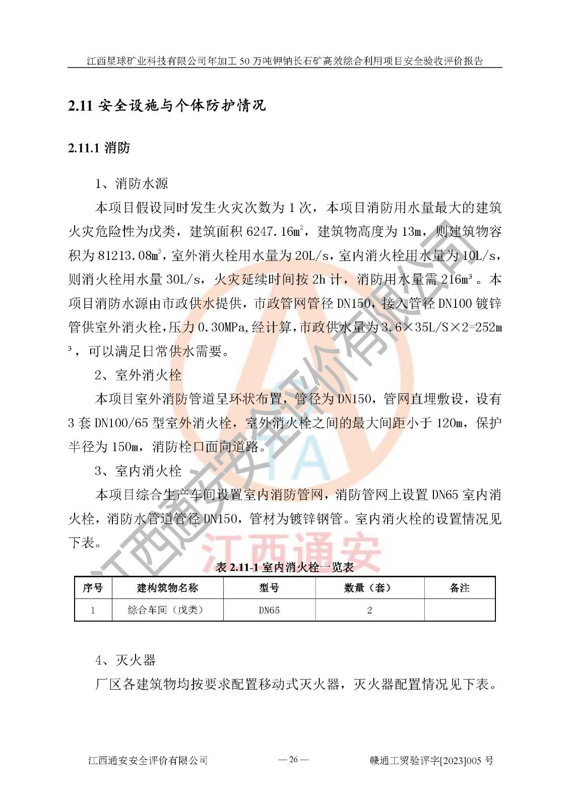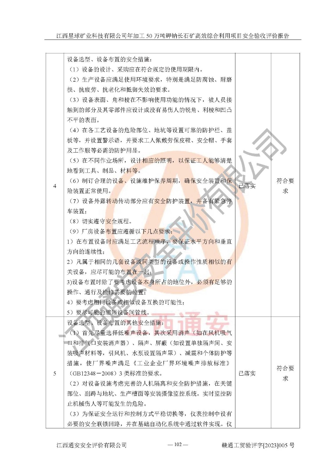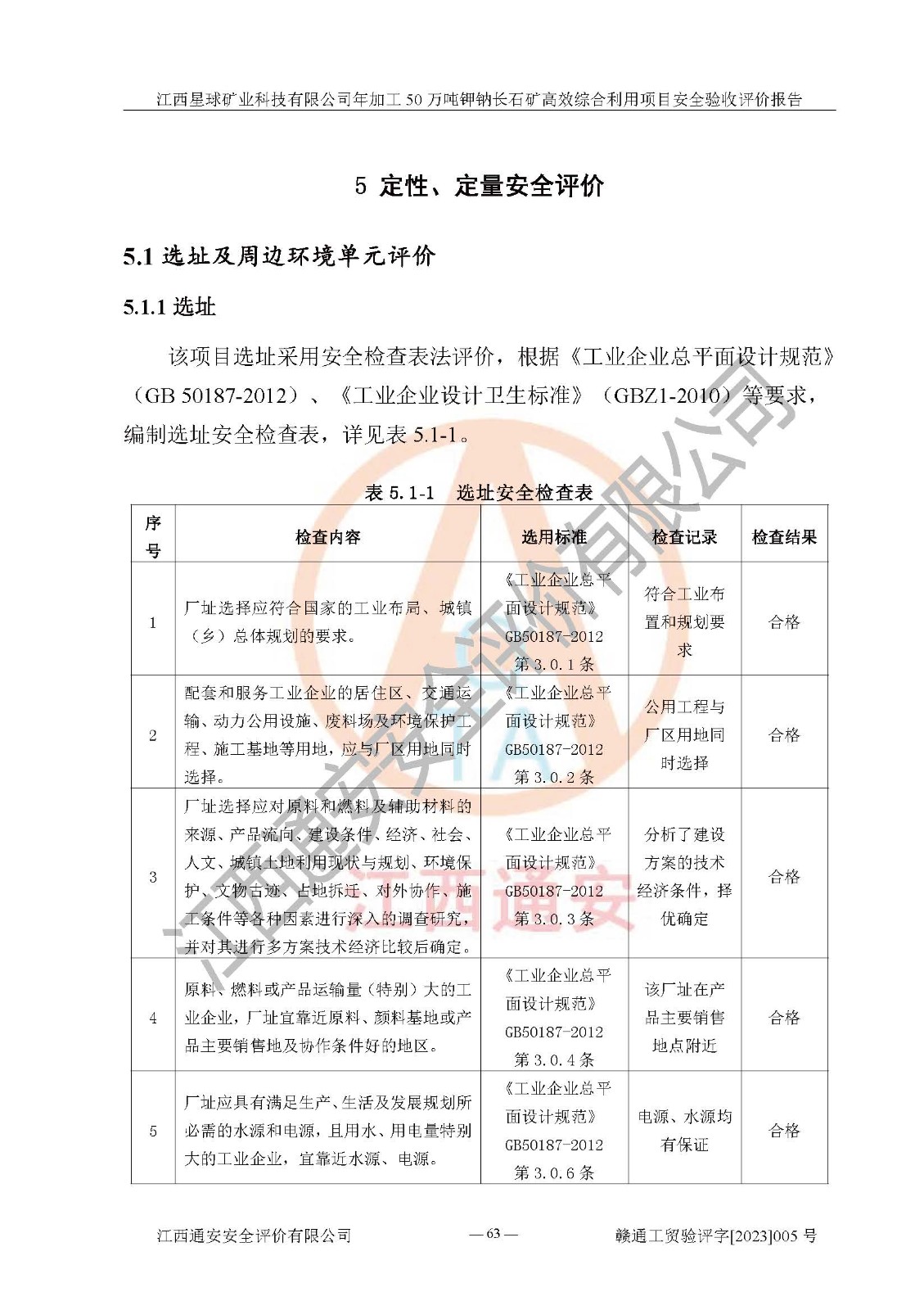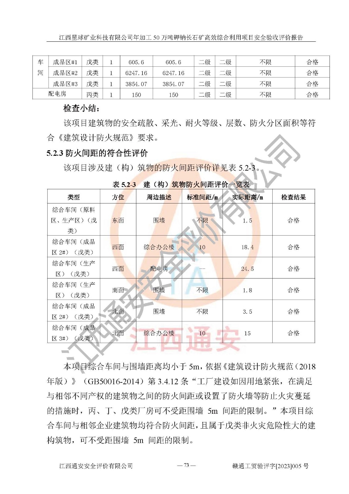其它 | 根據(jù)《中華人民共和國安全生產(chǎn)法》、《新建項(xiàng)目安全設(shè)施“三同時(shí)”監(jiān)督管理辦法》(原**安全生產(chǎn)監(jiān)督管理總局令第77號(hào)修訂)等法律法規(guī)的要求,對(duì)江西星球礦業(yè)科技有限公司年加工50萬噸鉀鈉長石礦**綜合利用項(xiàng)目安全驗(yàn)收的基本條件進(jìn)行分析,結(jié)果如下: 1)本項(xiàng)目在初步設(shè)計(jì)及建設(shè)過程中基本能貫徹執(zhí)行**、地方及有關(guān)部門的安全生產(chǎn)法律法規(guī)、標(biāo)準(zhǔn)要求,取得了**相關(guān)部門的許可、備案。項(xiàng)目的設(shè)計(jì)、施工、監(jiān)理等單位均有相應(yīng)資質(zhì)。 2)本項(xiàng)目址選符合要求;總平面布置合理,主要建筑的防火間距符合符合《建筑設(shè)計(jì)防火規(guī)范》(GB50016-2014,2018版)、《工業(yè)企業(yè)總平面設(shè)計(jì)規(guī)范》(GB50187-2012)有關(guān)規(guī)范、標(biāo)準(zhǔn)的要求。 3)本項(xiàng)目生產(chǎn)工藝成熟、試運(yùn)行正常,試運(yùn)行中過程中工藝和裝置、設(shè)備(設(shè)施)安全、可靠,未發(fā)生安全事故。 4)本項(xiàng)目的特種設(shè)備由有資質(zhì)單位設(shè)計(jì)、制造、安裝,特種設(shè)備經(jīng)宜春市特種設(shè)備檢驗(yàn)中心檢驗(yàn)合格,符合《中華人民共和國特種設(shè)備安全法》、《特種設(shè)備安全監(jiān)察條例》(中華人民共和國***令第549號(hào))的規(guī)定。特種設(shè)備作業(yè)人員、特種作業(yè)人員均持證上崗。 5)公司主要負(fù)責(zé)人及安全管理人員取得了江西省億源企業(yè)咨詢服務(wù)有限公司頒發(fā)的培訓(xùn)證書,特種作業(yè)人員操作證在**期內(nèi),其他從業(yè)人員經(jīng)安全培訓(xùn)符合,取得上崗證。符合要求。 6)公司建立有安全管理制度,制定有各類人員的安全生產(chǎn)責(zé)任制、各項(xiàng)安全管理制度和操作規(guī)程。按照**有關(guān)規(guī)定編制了事故應(yīng)急救援預(yù)案并進(jìn)行了備案,并定期進(jìn)行演練等,符合要求。 7)本項(xiàng)目作業(yè)條件危險(xiǎn)性分析結(jié)果:在選定的單元的危險(xiǎn)程度均為“可能危險(xiǎn),需要注意”或“稍有危險(xiǎn),可以接受”,作業(yè)條件相對(duì)安全。 評(píng)價(jià)結(jié)論: 江西星球礦業(yè)科技有限公司年加工50萬噸鉀鈉長石礦**綜合利用項(xiàng)目的安全設(shè)施及安全管理符合**及有關(guān)部門關(guān)于安全生產(chǎn)法律、法規(guī)、標(biāo)準(zhǔn)的要求,該項(xiàng)目試生產(chǎn)以來,工藝設(shè)備、安全設(shè)施及企業(yè)安全管理機(jī)制等運(yùn)行正常,安全設(shè)施、措施達(dá)到設(shè)計(jì)要求和預(yù)期結(jié)果,可以滿足建設(shè)項(xiàng)目安全生產(chǎn)的要求,安全生產(chǎn)管理**,具備竣工驗(yàn)收條件。 | ||||
