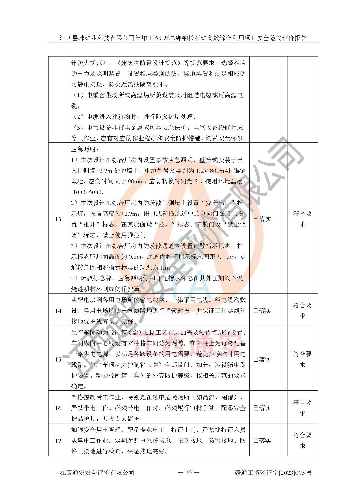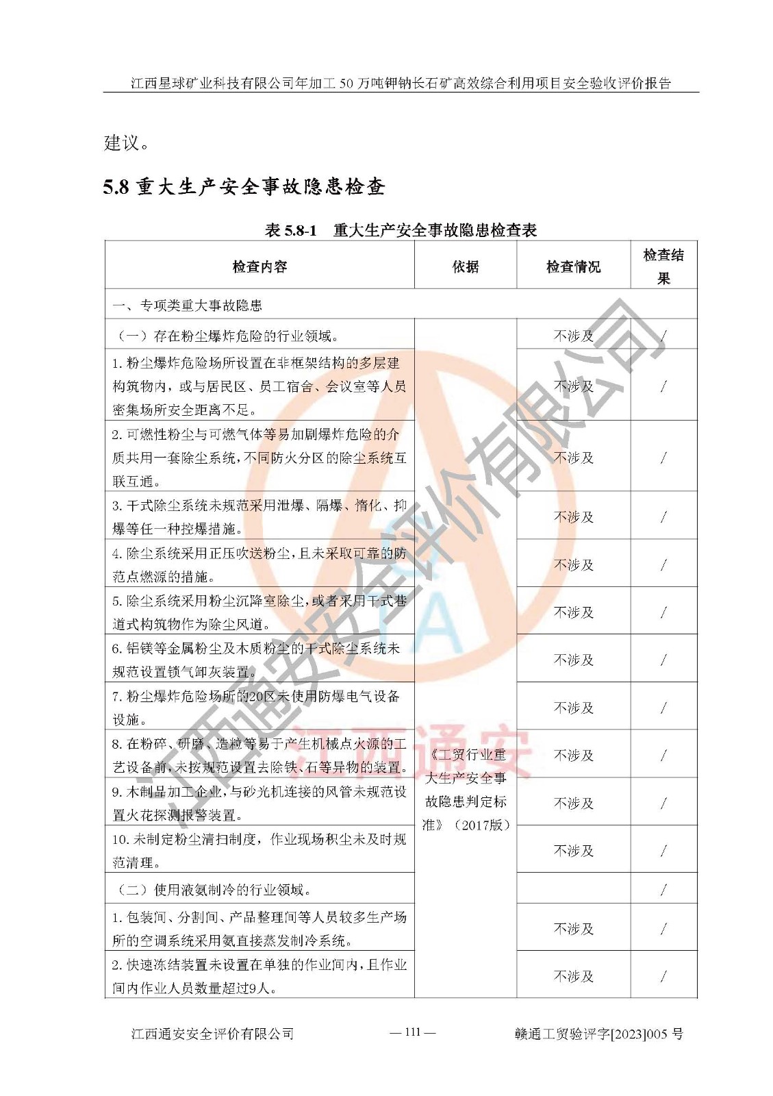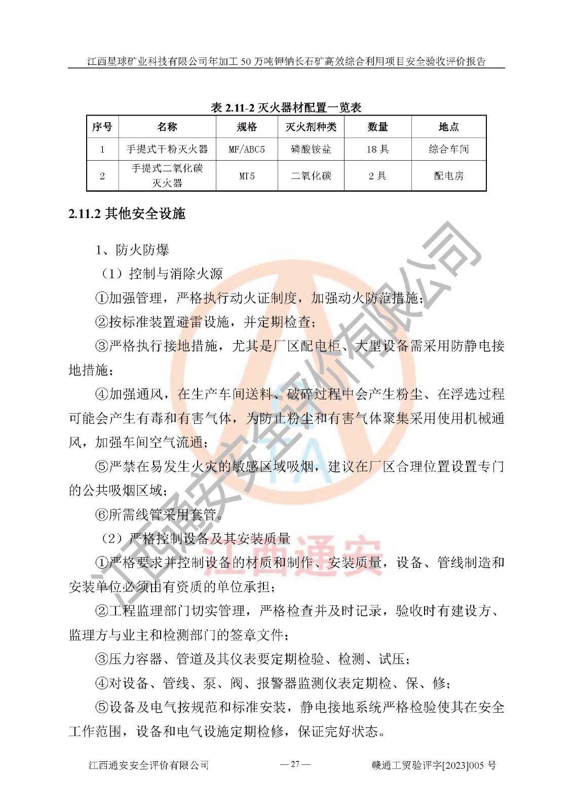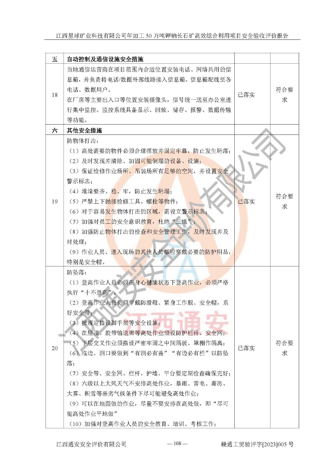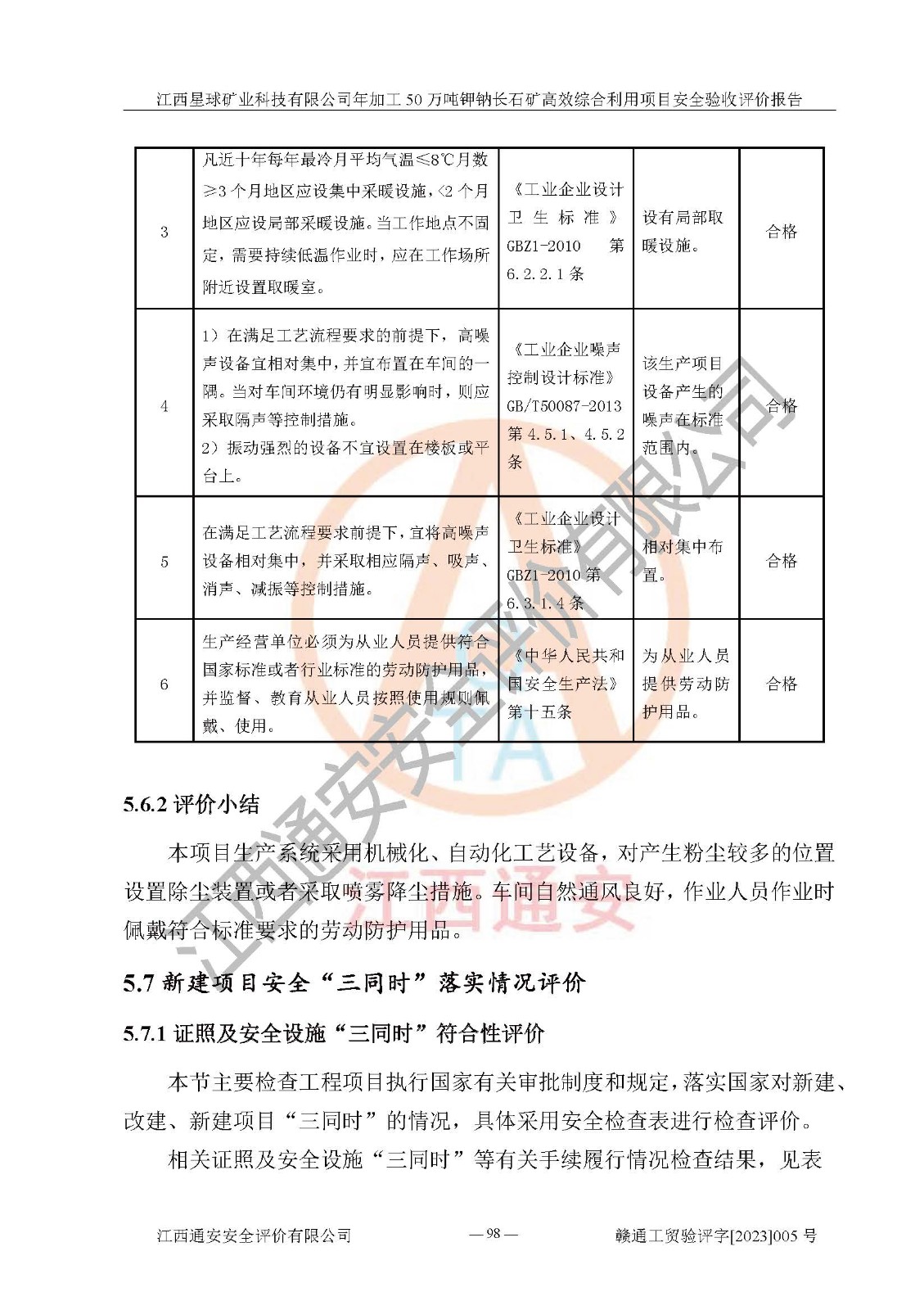 其它 | 根據(jù)《中華人民共和國安全生產(chǎn)法》、《新建項(xiàng)目安全設(shè)施“三同時(shí)”監(jiān)督管理辦法》(原**安全生產(chǎn)監(jiān)督管理總局令第77號(hào)修訂)等法律法規(guī)的要求,對(duì)江西星球礦業(yè)科技有限公司年加工50萬噸鉀鈉長石礦**綜合利用項(xiàng)目安全驗(yàn)收的基本條件進(jìn)行分析,結(jié)果如下: 1)本項(xiàng)目在初步設(shè)計(jì)及建設(shè)過程中基本能貫徹執(zhí)行**、地方及有關(guān)部門的安全生產(chǎn)法律法規(guī)、標(biāo)準(zhǔn)要求,取得了**相關(guān)部門的許可、備案。項(xiàng)目的設(shè)計(jì)、施工、監(jiān)理等單位均有相應(yīng)資質(zhì)。 2)本項(xiàng)目址選符合要求;總平面布置合理,主要建筑的防火間距符合符合《建筑設(shè)計(jì)防火規(guī)范》(GB50016-2014,2018版)、《工業(yè)企業(yè)總平面設(shè)計(jì)規(guī)范》(GB50187-2012)有關(guān)規(guī)范、標(biāo)準(zhǔn)的要求。 3)本項(xiàng)目生產(chǎn)工藝成熟、試運(yùn)行正常,試運(yùn)行中過程中工藝和裝置、設(shè)備(設(shè)施)安全、可靠,未發(fā)生安全事故。 4)本項(xiàng)目的特種設(shè)備由有資質(zhì)單位設(shè)計(jì)、制造、安裝,特種設(shè)備經(jīng)宜春市特種設(shè)備檢驗(yàn)中心檢驗(yàn)合格,符合《中華人民共和國特種設(shè)備安全法》、《特種設(shè)備安全監(jiān)察條例》(中華人民共和國***令第549號(hào))的規(guī)定。特種設(shè)備作業(yè)人員、特種作業(yè)人員均持證上崗。 5)公司主要負(fù)責(zé)人及安全管理人員取得了江西省億源企業(yè)咨詢服務(wù)有限公司頒發(fā)的培訓(xùn)證書,特種作業(yè)人員操作證在**期內(nèi),其他從業(yè)人員經(jīng)安全培訓(xùn)符合,取得上崗證。符合要求。 6)公司建立有安全管理制度,制定有各類人員的安全生產(chǎn)責(zé)任制、各項(xiàng)安全管理制度和操作規(guī)程。按照**有關(guān)規(guī)定編制了事故應(yīng)急救援預(yù)案并進(jìn)行了備案,并定期進(jìn)行演練等,符合要求。 7)本項(xiàng)目作業(yè)條件危險(xiǎn)性分析結(jié)果:在選定的單元的危險(xiǎn)程度均為“可能危險(xiǎn),需要注意”或“稍有危險(xiǎn),可以接受”,作業(yè)條件相對(duì)安全。 評(píng)價(jià)結(jié)論: 江西星球礦業(yè)科技有限公司年加工50萬噸鉀鈉長石礦**綜合利用項(xiàng)目的安全設(shè)施及安全管理符合**及有關(guān)部門關(guān)于安全生產(chǎn)法律、法規(guī)、標(biāo)準(zhǔn)的要求,該項(xiàng)目試生產(chǎn)以來,工藝設(shè)備、安全設(shè)施及企業(yè)安全管理機(jī)制等運(yùn)行正常,安全設(shè)施、措施達(dá)到設(shè)計(jì)要求和預(yù)期結(jié)果,可以滿足建設(shè)項(xiàng)目安全生產(chǎn)的要求,安全生產(chǎn)管理**,具備竣工驗(yàn)收條件。 | ||||