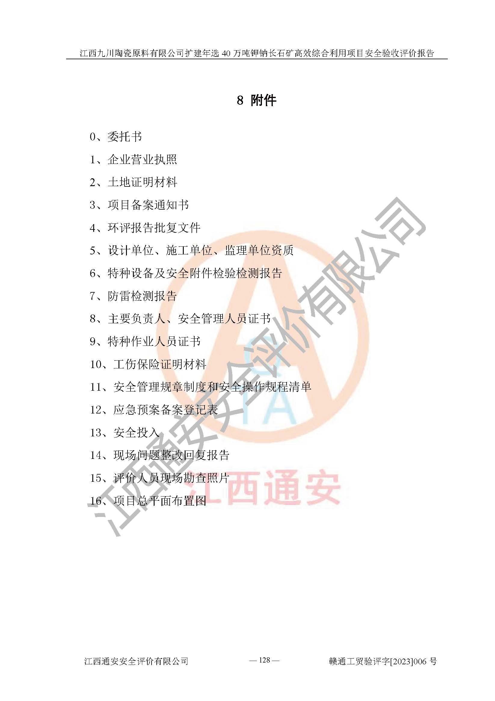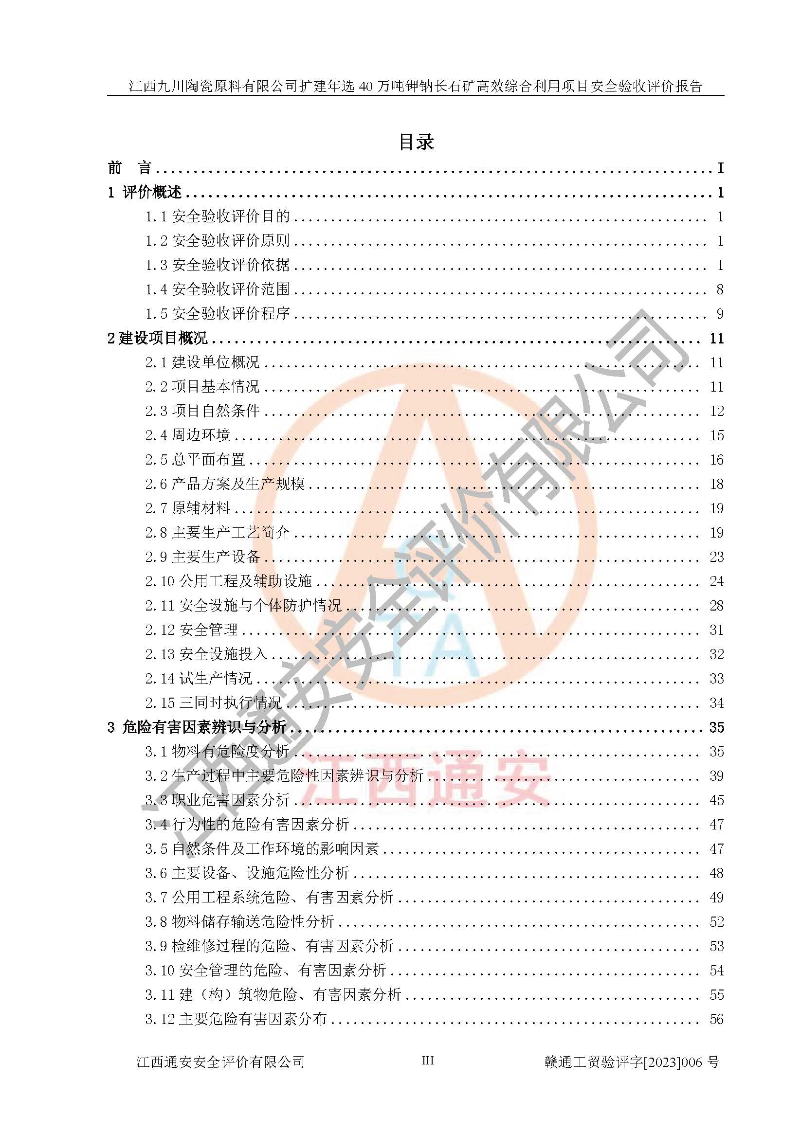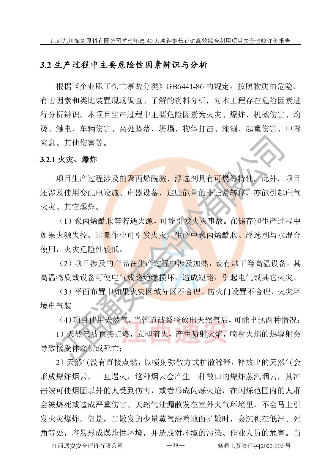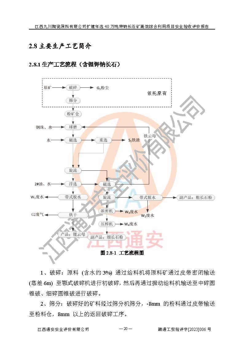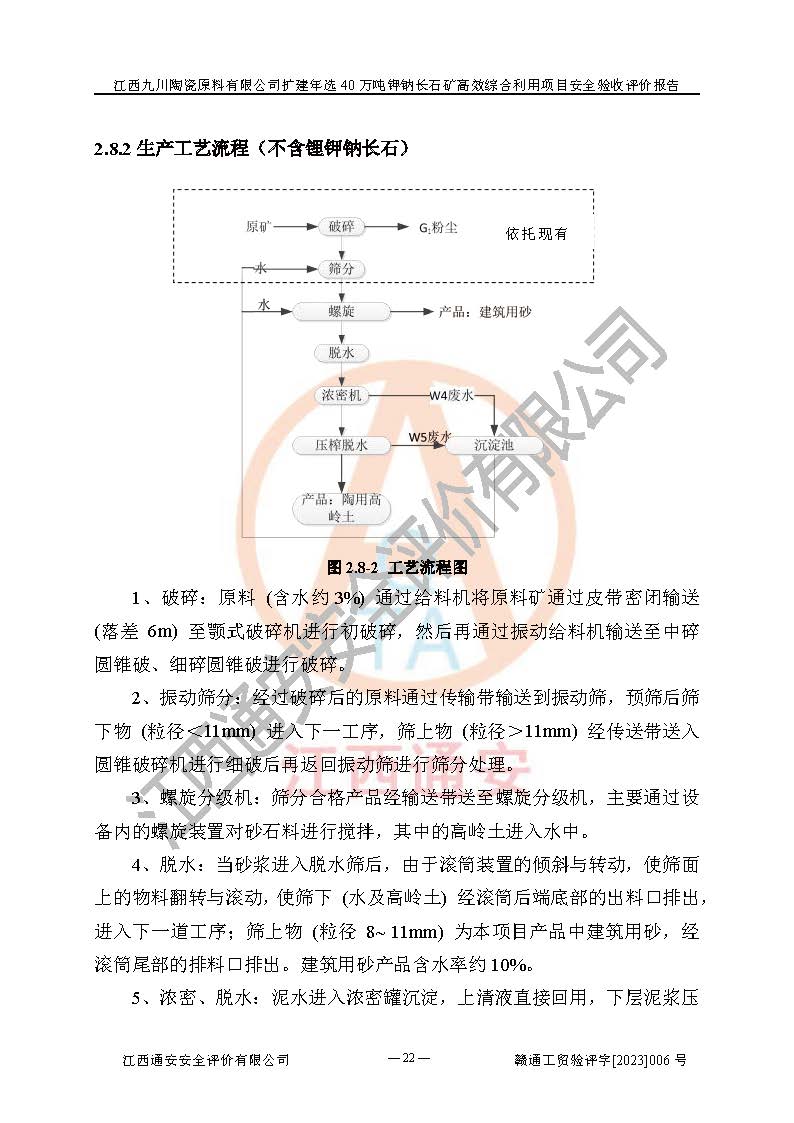 項目簡介 | 本報告為江西九川陶瓷原料有限公司擴(kuò)建年選40萬噸鉀鈉長石礦**綜合利用項目安全驗收評價報告。江西九川陶瓷原料有限公司成立于2012年5月18日,統(tǒng)一社會信用代碼:913609245965074856,注冊地址江西省宜春市宜豐縣工業(yè)園,注冊資金200萬元,法人**為趙宏業(yè),經(jīng)營范圍:瓷土、高嶺土、鉀長石、粘土陶瓷熔塊加工銷售。(依法須經(jīng)批準(zhǔn)的項目,經(jīng)相關(guān)部門批準(zhǔn)后方可開展經(jīng)營法動)。本項目為擴(kuò)建年選40萬噸鉀鈉長石礦**綜合利用項目,總投資4000萬元。 江西九川陶瓷原料有限公司于2014年前后建設(shè)投產(chǎn)了江西九川陶瓷原料有限公司年產(chǎn)75萬噸鉀長石項目,為宜春市陶瓷產(chǎn)業(yè)提供優(yōu)質(zhì)的鉀長石原料。為了適應(yīng)市場需求以及公司更好的發(fā)展,從鋰瓷石礦中提取優(yōu)質(zhì)的鋰云母資源,江西九川陶瓷原料有限公司決定依托現(xiàn)有破碎車間,利用現(xiàn)有原料堆棚改造為選礦車間,擴(kuò)建年選40萬噸鉀鈉長石礦**綜合利用項目。本次擴(kuò)建主要增加鋰云母提取工藝,為宜春市各鋰電產(chǎn)業(yè)提供優(yōu)質(zhì)的鋰云母原料。 本項目于2019年04月01日在宜豐縣發(fā)展和改革委員會備案,取得《江西省企業(yè)投資項目備案通知書》(宜豐縣發(fā)展和改革委員會,項目統(tǒng)一代碼為:2019-360924-30-03-005264),2022年4月組織技術(shù)人員編制了《江西九川陶瓷原料有限公司擴(kuò)建年選40萬噸鉀鈉長石礦建設(shè)項目選址安全條件論證報告》,2022年10月委托中裕工程集團(tuán)有限公司編制了《江西九川陶瓷原料有限公司擴(kuò)建年選40萬噸鉀鈉長石礦**綜合利用項目安全設(shè)施設(shè)計》。本項目外購礦石,通過破碎、球磨、選礦、脫水、烘干后*終產(chǎn)出鋰云母精礦、長石粉及尾泥。其中在生產(chǎn)工藝中主要涉及的化學(xué)品為聚丙烯酸酰胺、浮選劑,檢維修工序使用到的氧氣、乙炔,裝載車使用到的燃料柴油以及管道天然氣。經(jīng)辨識,該項目不構(gòu)成危險品重大危險源。根據(jù)生產(chǎn)工藝特點及物料的理化特性可知,該項目生產(chǎn)過程中存在火災(zāi)、爆炸、機(jī)械傷害、灼燙、觸電、**傷害、高處墜落、坍塌、物體打擊、淹溺、起重傷害、中毒窒息、其他傷害等危險有害因素。
