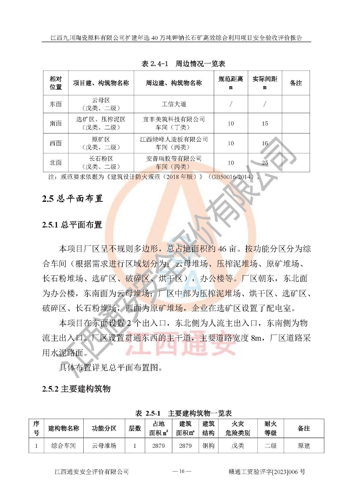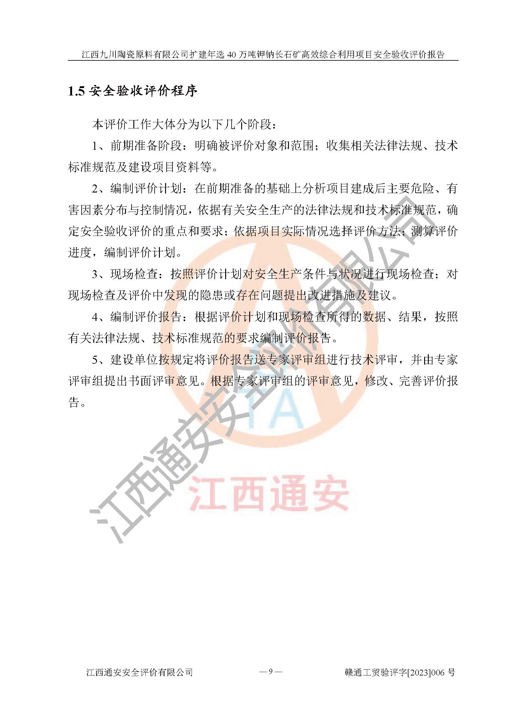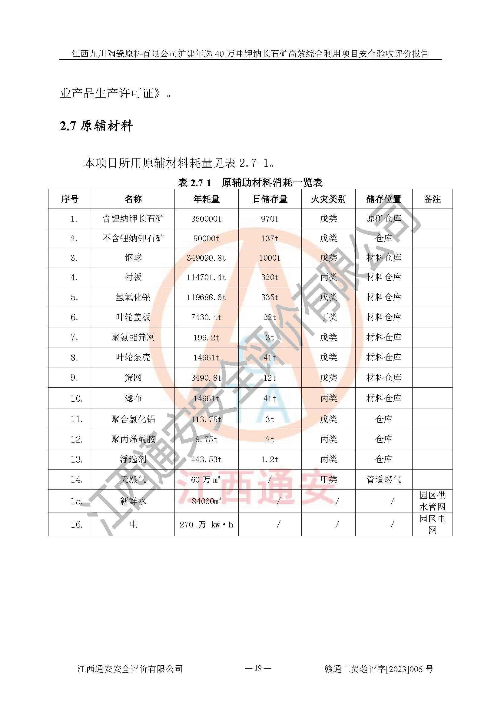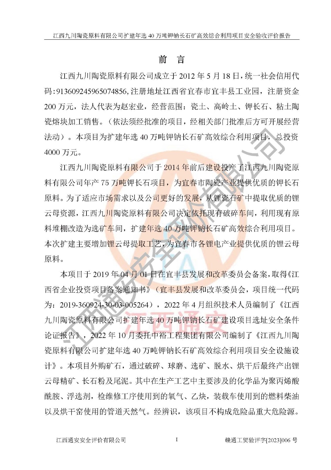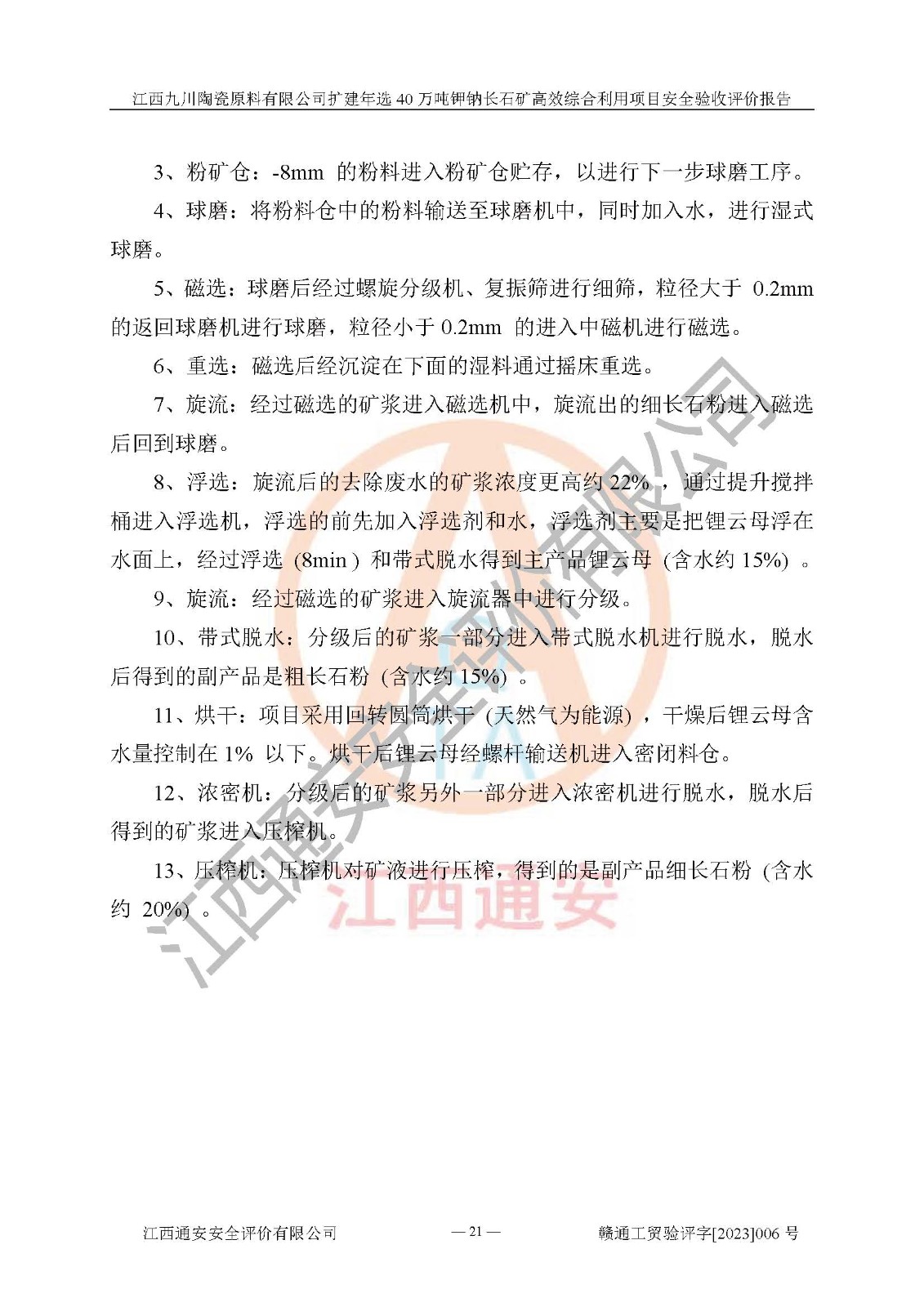 項目簡介 | 本報告為江西九川陶瓷原料有限公司擴(kuò)建年選40萬噸鉀鈉長石礦**綜合利用項目安全驗收評價報告。江西九川陶瓷原料有限公司成立于2012年5月18日,統(tǒng)一社會信用代碼:913609245965074856,注冊地址江西省宜春市宜豐縣工業(yè)園,注冊資金200萬元,法人**為趙宏業(yè),經(jīng)營范圍:瓷土、高嶺土、鉀長石、粘土陶瓷熔塊加工銷售。(依法須經(jīng)批準(zhǔn)的項目,經(jīng)相關(guān)部門批準(zhǔn)后方可開展經(jīng)營法動)。本項目為擴(kuò)建年選40萬噸鉀鈉長石礦**綜合利用項目,總投資4000萬元。 江西九川陶瓷原料有限公司于2014年前后建設(shè)投產(chǎn)了江西九川陶瓷原料有限公司年產(chǎn)75萬噸鉀長石項目,為宜春市陶瓷產(chǎn)業(yè)提供優(yōu)質(zhì)的鉀長石原料。為了適應(yīng)市場需求以及公司更好的發(fā)展,從鋰瓷石礦中提取優(yōu)質(zhì)的鋰云母資源,江西九川陶瓷原料有限公司決定依托現(xiàn)有破碎車間,利用現(xiàn)有原料堆棚改造為選礦車間,擴(kuò)建年選40萬噸鉀鈉長石礦**綜合利用項目。本次擴(kuò)建主要增加鋰云母提取工藝,為宜春市各鋰電產(chǎn)業(yè)提供優(yōu)質(zhì)的鋰云母原料。 本項目于2019年04月01日在宜豐縣發(fā)展和改革委員會備案,取得《江西省企業(yè)投資項目備案通知書》(宜豐縣發(fā)展和改革委員會,項目統(tǒng)一代碼為:2019-360924-30-03-005264),2022年4月組織技術(shù)人員編制了《江西九川陶瓷原料有限公司擴(kuò)建年選40萬噸鉀鈉長石礦建設(shè)項目選址安全條件論證報告》,2022年10月委托中裕工程集團(tuán)有限公司編制了《江西九川陶瓷原料有限公司擴(kuò)建年選40萬噸鉀鈉長石礦**綜合利用項目安全設(shè)施設(shè)計》。本項目外購礦石,通過破碎、球磨、選礦、脫水、烘干后*終產(chǎn)出鋰云母精礦、長石粉及尾泥。其中在生產(chǎn)工藝中主要涉及的化學(xué)品為聚丙烯酸酰胺、浮選劑,檢維修工序使用到的氧氣、乙炔,裝載車使用到的燃料柴油以及管道天然氣。經(jīng)辨識,該項目不構(gòu)成危險品重大危險源。根據(jù)生產(chǎn)工藝特點及物料的理化特性可知,該項目生產(chǎn)過程中存在火災(zāi)、爆炸、機(jī)械傷害、灼燙、觸電、**傷害、高處墜落、坍塌、物體打擊、淹溺、起重傷害、中毒窒息、其他傷害等危險有害因素。