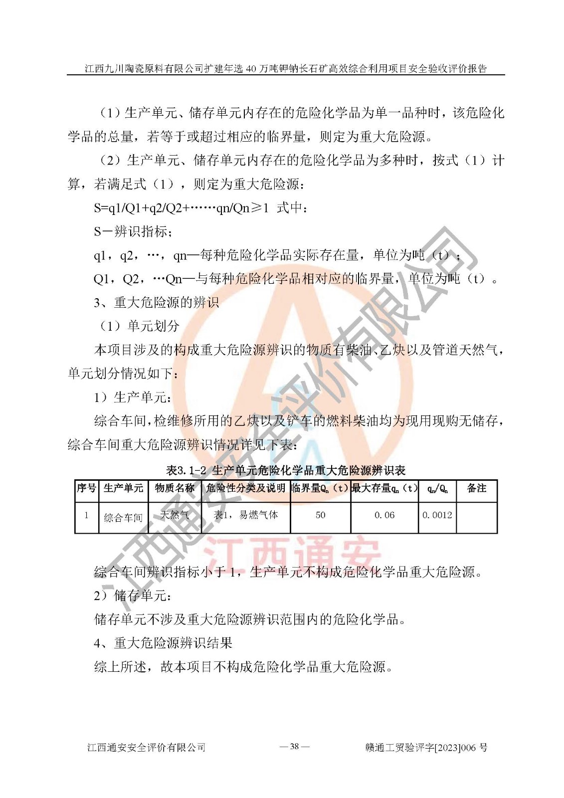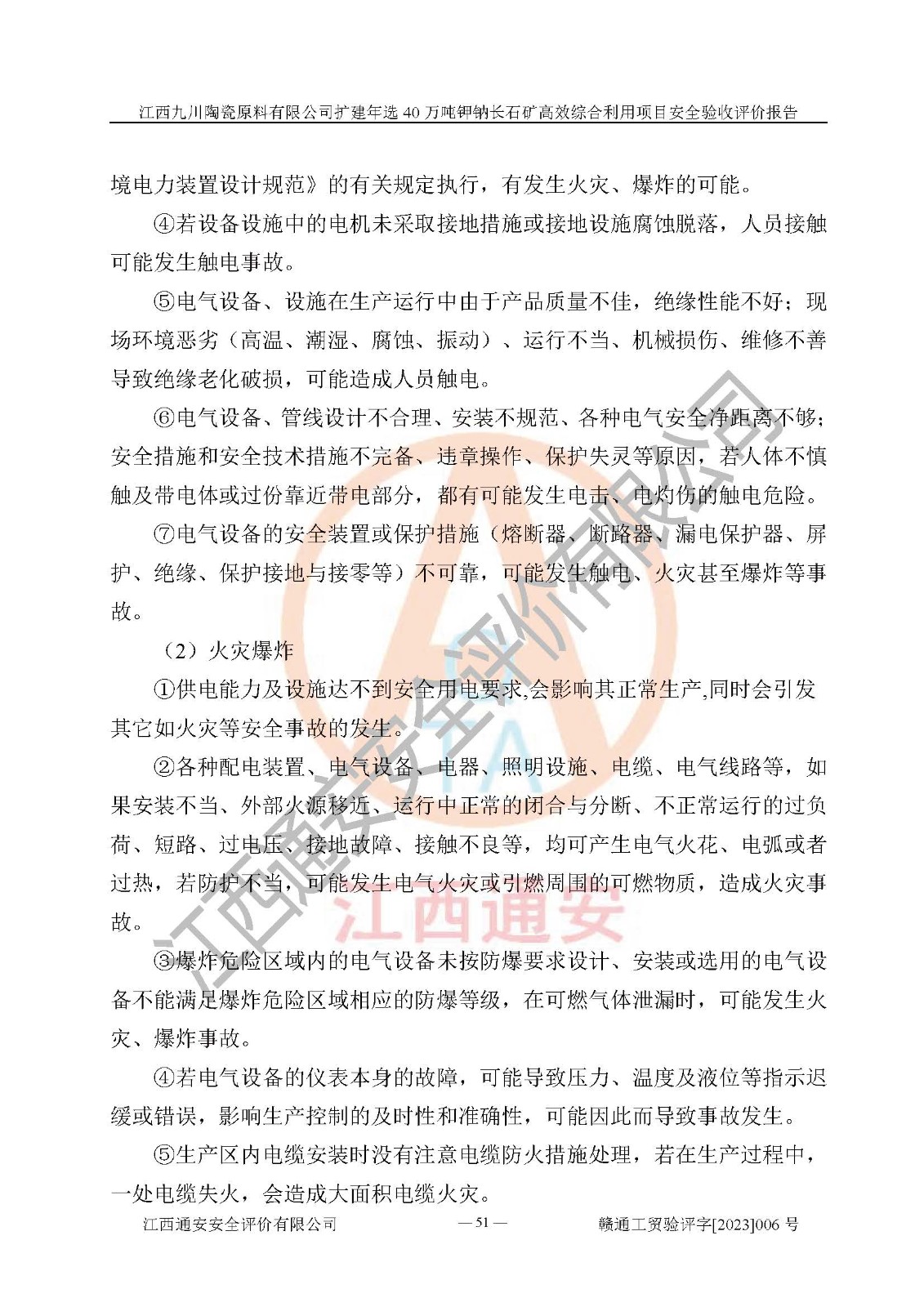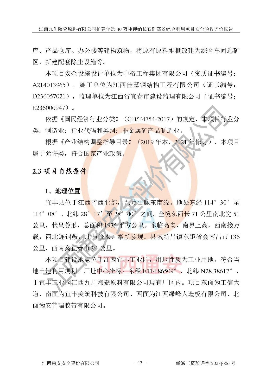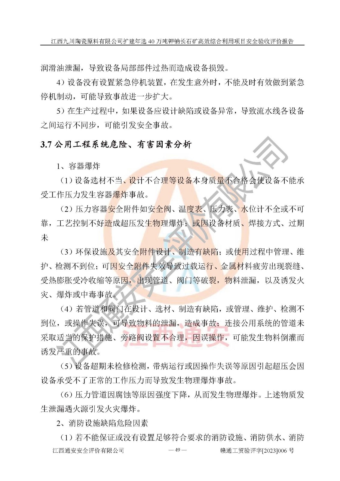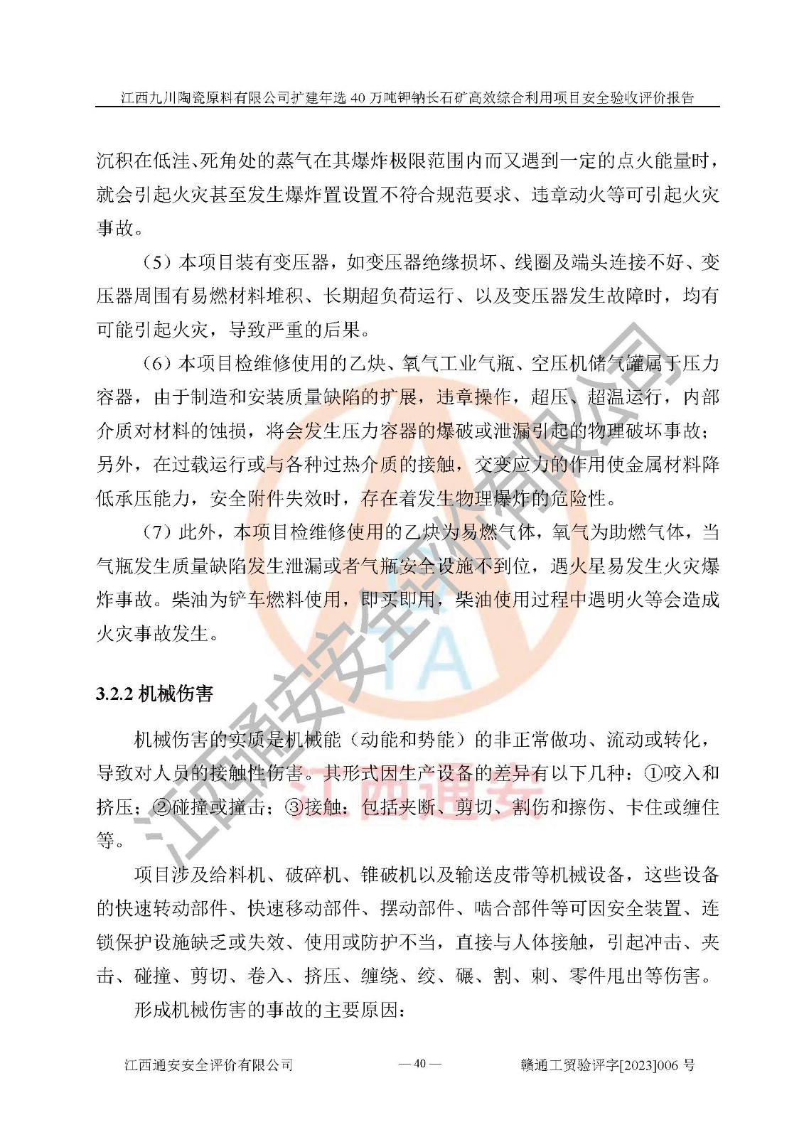 項目簡介 | 本報告為江西九川陶瓷原料有限公司擴(kuò)建年選40萬噸鉀鈉長石礦**綜合利用項目安全驗收評價報告。江西九川陶瓷原料有限公司成立于2012年5月18日,統(tǒng)一社會信用代碼:913609245965074856,注冊地址江西省宜春市宜豐縣工業(yè)園,注冊資金200萬元,法人**為趙宏業(yè),經(jīng)營范圍:瓷土、高嶺土、鉀長石、粘土陶瓷熔塊加工銷售。(依法須經(jīng)批準(zhǔn)的項目,經(jīng)相關(guān)部門批準(zhǔn)后方可開展經(jīng)營法動)。本項目為擴(kuò)建年選40萬噸鉀鈉長石礦**綜合利用項目,總投資4000萬元。 江西九川陶瓷原料有限公司于2014年前后建設(shè)投產(chǎn)了江西九川陶瓷原料有限公司年產(chǎn)75萬噸鉀長石項目,為宜春市陶瓷產(chǎn)業(yè)提供優(yōu)質(zhì)的鉀長石原料。為了適應(yīng)市場需求以及公司更好的發(fā)展,從鋰瓷石礦中提取優(yōu)質(zhì)的鋰云母資源,江西九川陶瓷原料有限公司決定依托現(xiàn)有破碎車間,利用現(xiàn)有原料堆棚改造為選礦車間,擴(kuò)建年選40萬噸鉀鈉長石礦**綜合利用項目。本次擴(kuò)建主要增加鋰云母提取工藝,為宜春市各鋰電產(chǎn)業(yè)提供優(yōu)質(zhì)的鋰云母原料。 本項目于2019年04月01日在宜豐縣發(fā)展和改革委員會備案,取得《江西省企業(yè)投資項目備案通知書》(宜豐縣發(fā)展和改革委員會,項目統(tǒng)一代碼為:2019-360924-30-03-005264),2022年4月組織技術(shù)人員編制了《江西九川陶瓷原料有限公司擴(kuò)建年選40萬噸鉀鈉長石礦建設(shè)項目選址安全條件論證報告》,2022年10月委托中裕工程集團(tuán)有限公司編制了《江西九川陶瓷原料有限公司擴(kuò)建年選40萬噸鉀鈉長石礦**綜合利用項目安全設(shè)施設(shè)計》。本項目外購礦石,通過破碎、球磨、選礦、脫水、烘干后*終產(chǎn)出鋰云母精礦、長石粉及尾泥。其中在生產(chǎn)工藝中主要涉及的化學(xué)品為聚丙烯酸酰胺、浮選劑,檢維修工序使用到的氧氣、乙炔,裝載車使用到的燃料柴油以及管道天然氣。經(jīng)辨識,該項目不構(gòu)成危險品重大危險源。根據(jù)生產(chǎn)工藝特點及物料的理化特性可知,該項目生產(chǎn)過程中存在火災(zāi)、爆炸、機(jī)械傷害、灼燙、觸電、**傷害、高處墜落、坍塌、物體打擊、淹溺、起重傷害、中毒窒息、其他傷害等危險有害因素。