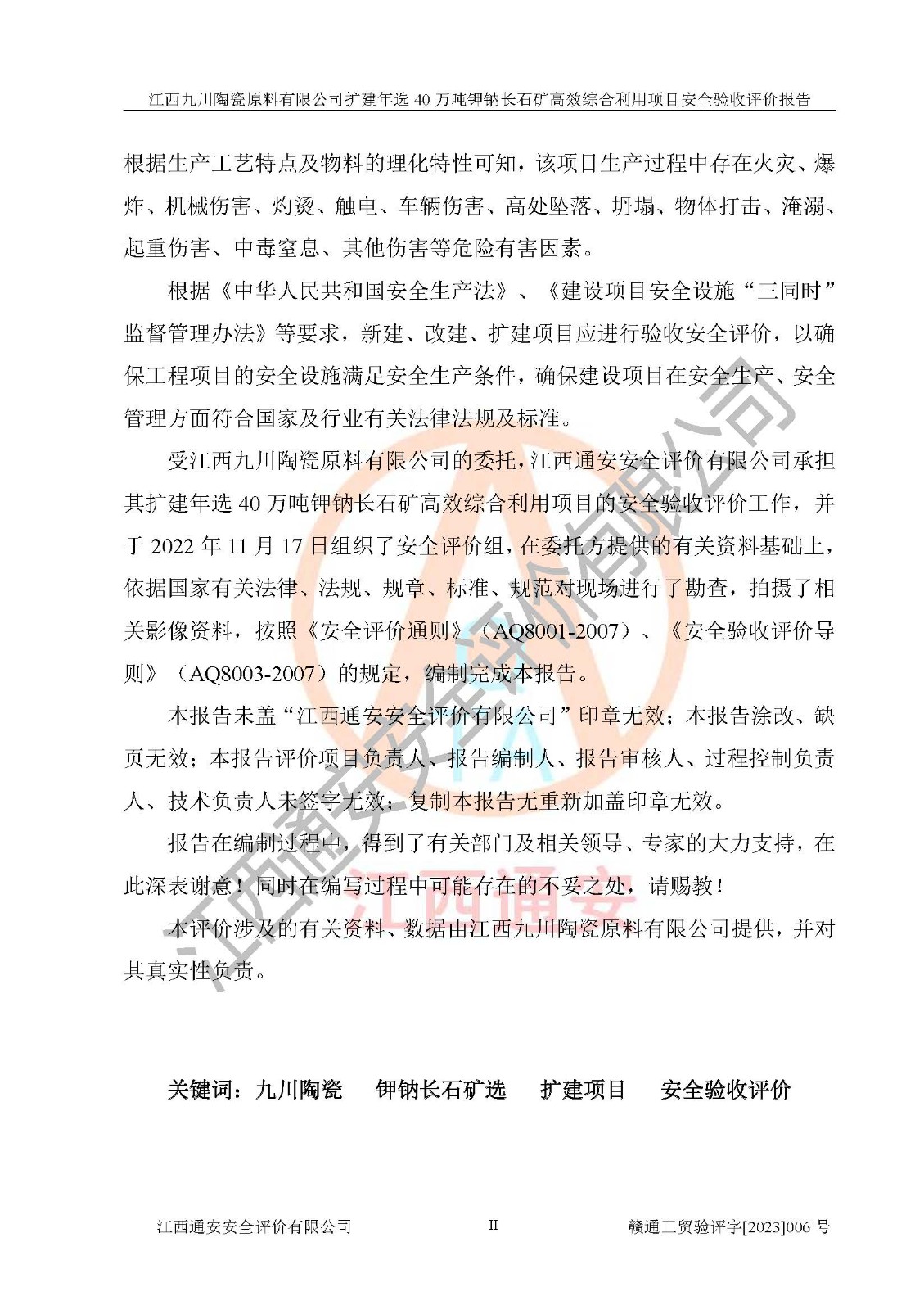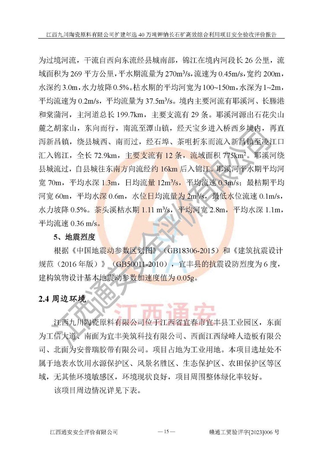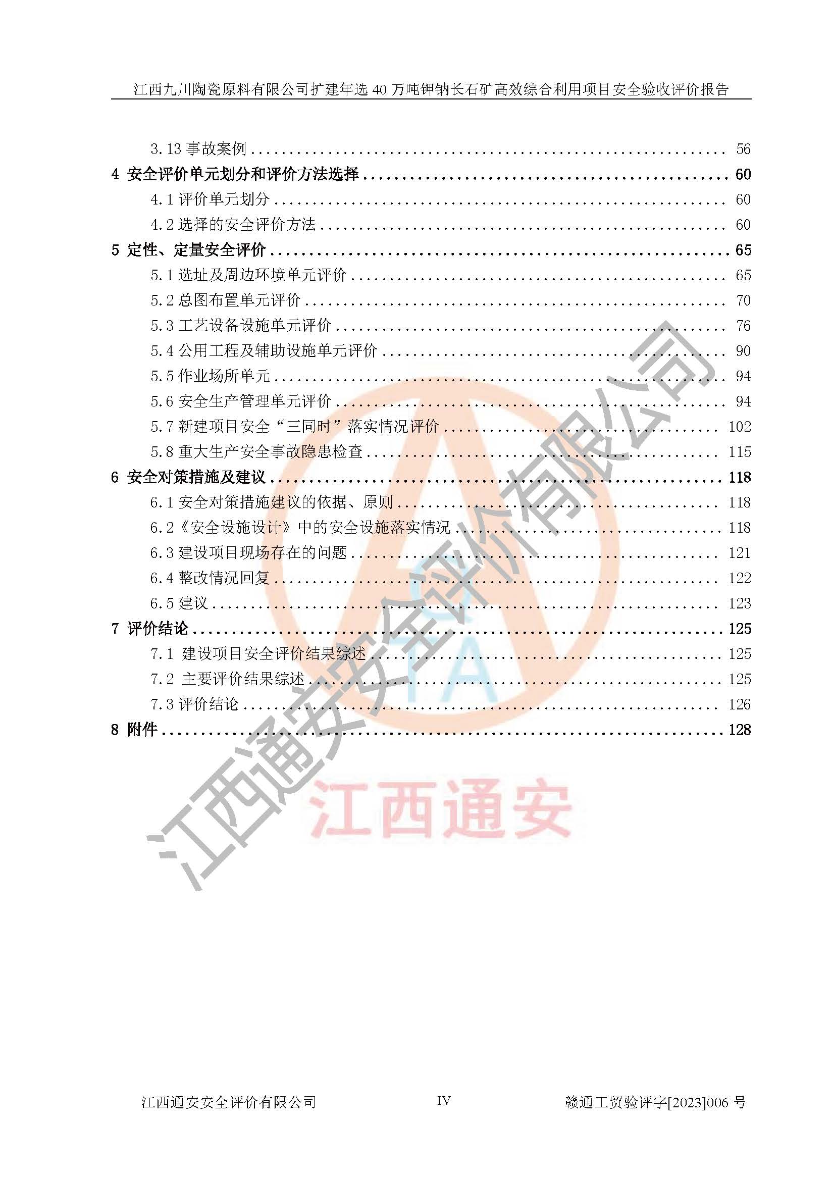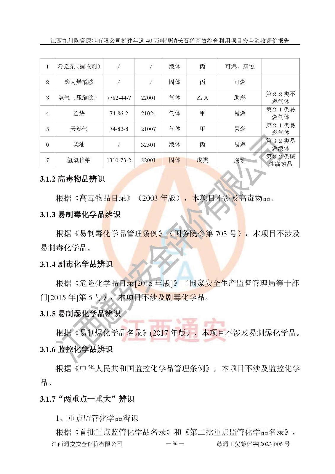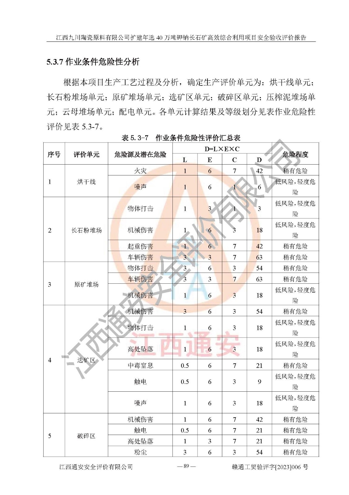 項目簡介 | 本報告為江西九川陶瓷原料有限公司擴(kuò)建年選40萬噸鉀鈉長石礦**綜合利用項目安全驗收評價報告。江西九川陶瓷原料有限公司成立于2012年5月18日,統(tǒng)一社會信用代碼:913609245965074856,注冊地址江西省宜春市宜豐縣工業(yè)園,注冊資金200萬元,法人**為趙宏業(yè),經(jīng)營范圍:瓷土、高嶺土、鉀長石、粘土陶瓷熔塊加工銷售。(依法須經(jīng)批準(zhǔn)的項目,經(jīng)相關(guān)部門批準(zhǔn)后方可開展經(jīng)營法動)。本項目為擴(kuò)建年選40萬噸鉀鈉長石礦**綜合利用項目,總投資4000萬元。 江西九川陶瓷原料有限公司于2014年前后建設(shè)投產(chǎn)了江西九川陶瓷原料有限公司年產(chǎn)75萬噸鉀長石項目,為宜春市陶瓷產(chǎn)業(yè)提供優(yōu)質(zhì)的鉀長石原料。為了適應(yīng)市場需求以及公司更好的發(fā)展,從鋰瓷石礦中提取優(yōu)質(zhì)的鋰云母資源,江西九川陶瓷原料有限公司決定依托現(xiàn)有破碎車間,利用現(xiàn)有原料堆棚改造為選礦車間,擴(kuò)建年選40萬噸鉀鈉長石礦**綜合利用項目。本次擴(kuò)建主要增加鋰云母提取工藝,為宜春市各鋰電產(chǎn)業(yè)提供優(yōu)質(zhì)的鋰云母原料。 本項目于2019年04月01日在宜豐縣發(fā)展和改革委員會備案,取得《江西省企業(yè)投資項目備案通知書》(宜豐縣發(fā)展和改革委員會,項目統(tǒng)一代碼為:2019-360924-30-03-005264),2022年4月組織技術(shù)人員編制了《江西九川陶瓷原料有限公司擴(kuò)建年選40萬噸鉀鈉長石礦建設(shè)項目選址安全條件論證報告》,2022年10月委托中裕工程集團(tuán)有限公司編制了《江西九川陶瓷原料有限公司擴(kuò)建年選40萬噸鉀鈉長石礦**綜合利用項目安全設(shè)施設(shè)計》。本項目外購礦石,通過破碎、球磨、選礦、脫水、烘干后*終產(chǎn)出鋰云母精礦、長石粉及尾泥。其中在生產(chǎn)工藝中主要涉及的化學(xué)品為聚丙烯酸酰胺、浮選劑,檢維修工序使用到的氧氣、乙炔,裝載車使用到的燃料柴油以及管道天然氣。經(jīng)辨識,該項目不構(gòu)成危險品重大危險源。根據(jù)生產(chǎn)工藝特點及物料的理化特性可知,該項目生產(chǎn)過程中存在火災(zāi)、爆炸、機(jī)械傷害、灼燙、觸電、**傷害、高處墜落、坍塌、物體打擊、淹溺、起重傷害、中毒窒息、其他傷害等危險有害因素。