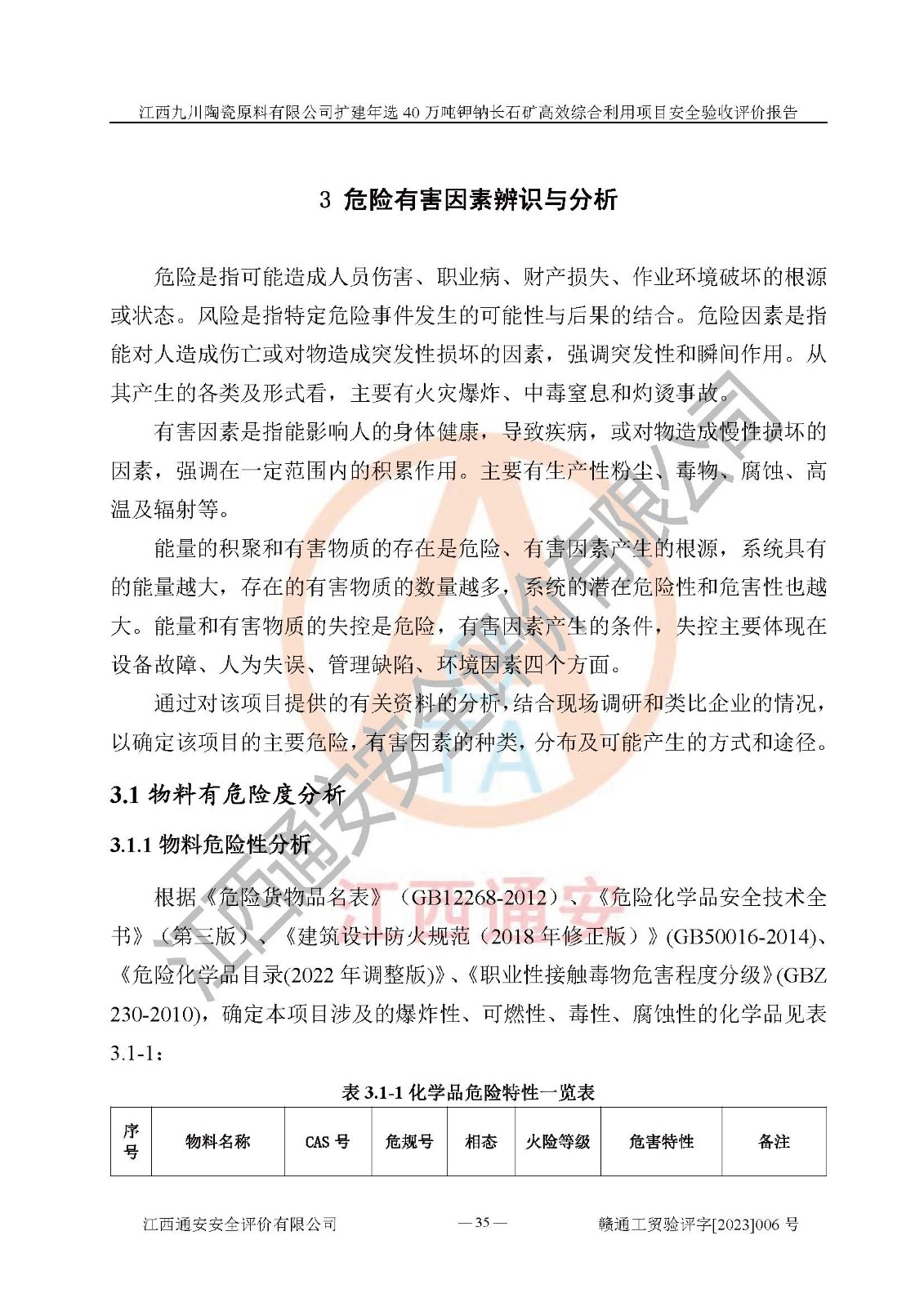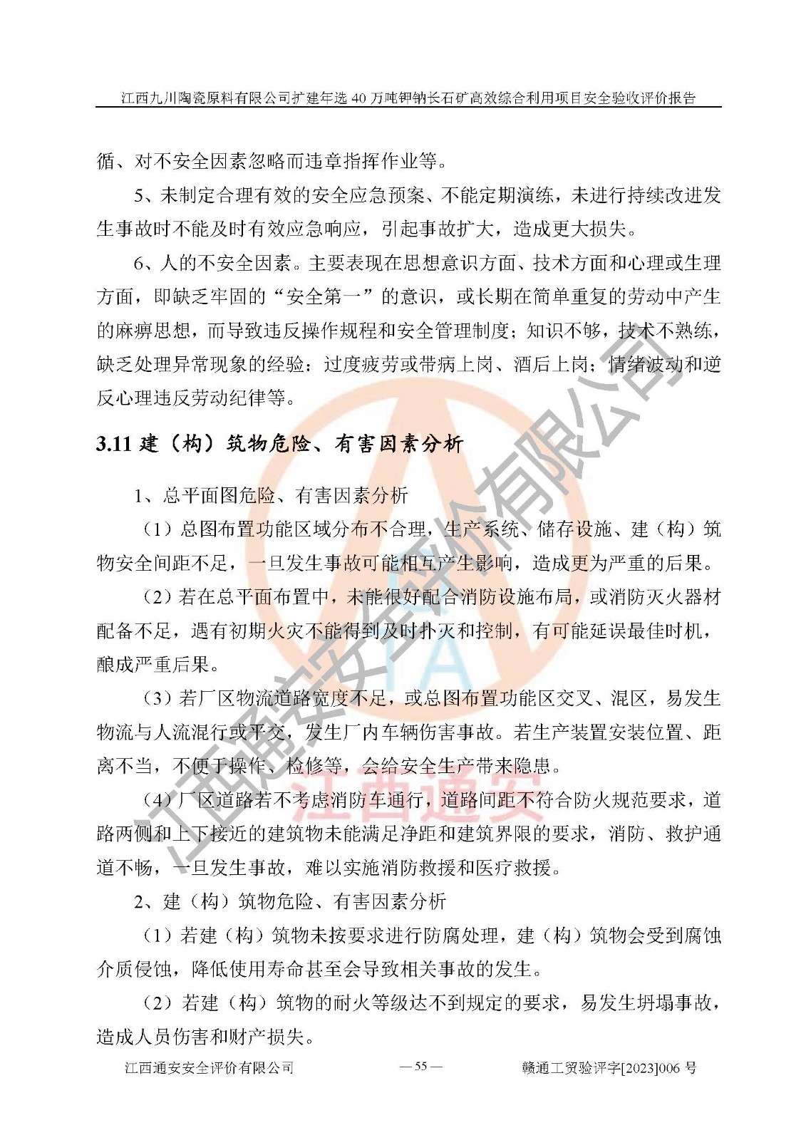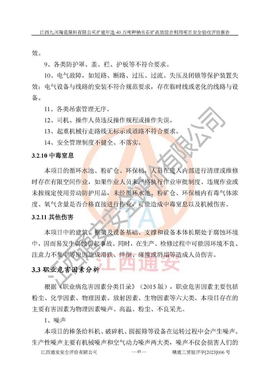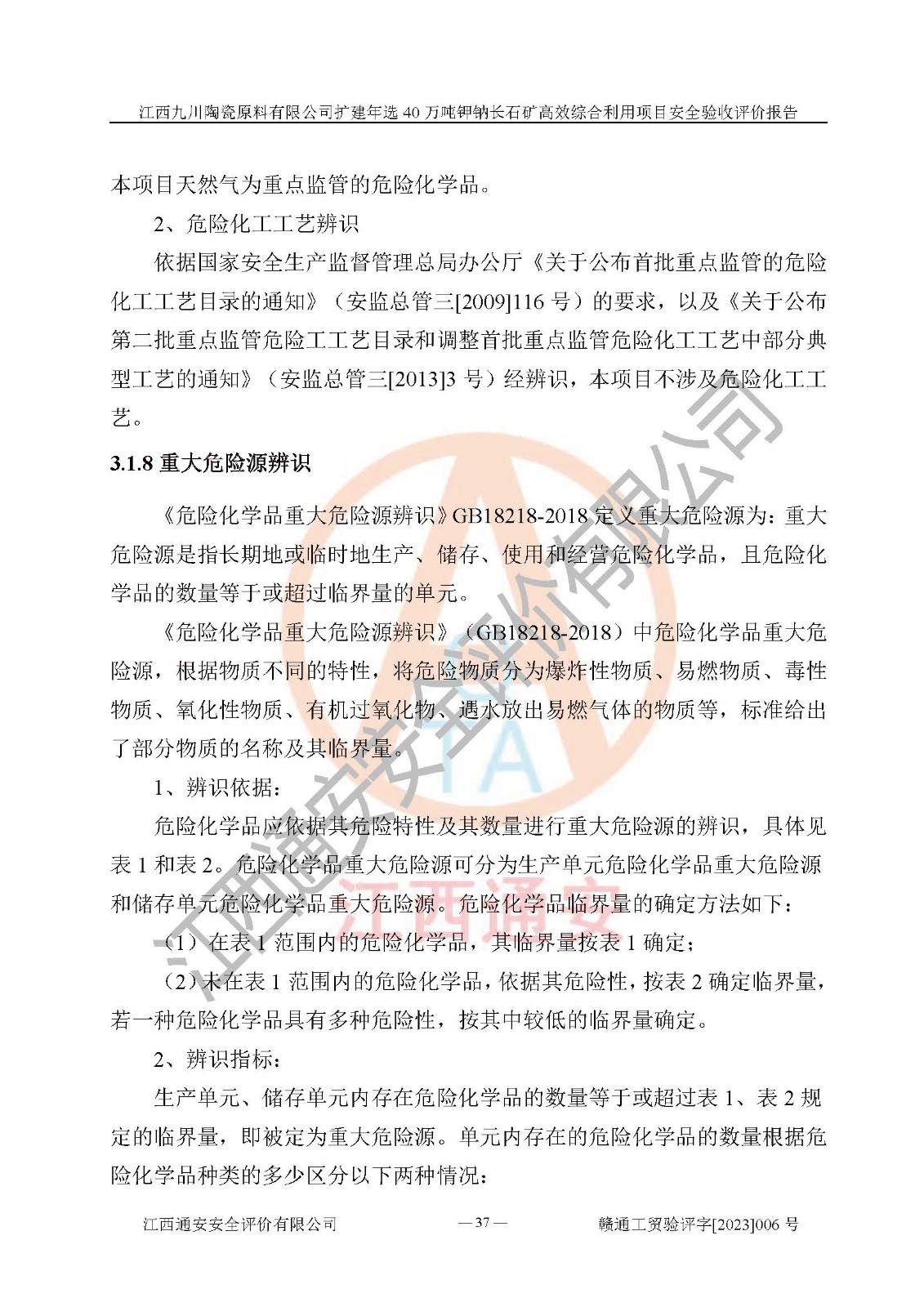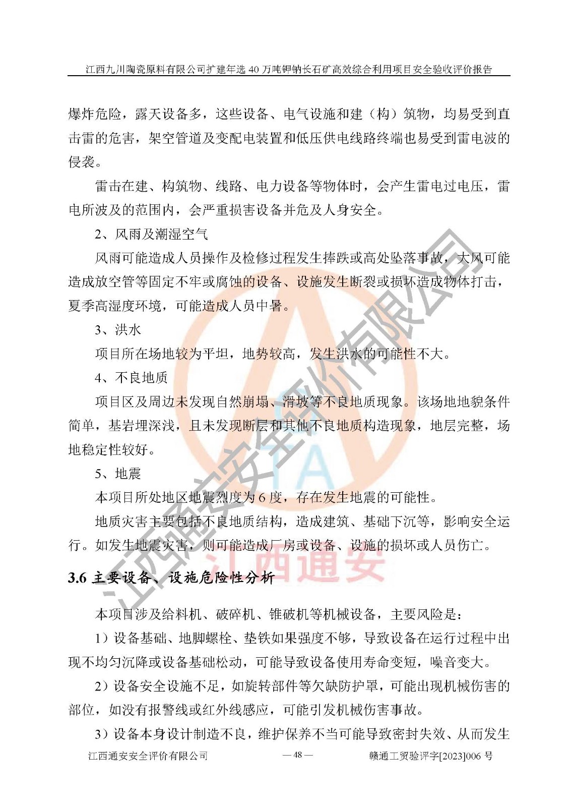 項目簡介 | 本報告為江西九川陶瓷原料有限公司擴(kuò)建年選40萬噸鉀鈉長石礦**綜合利用項目安全驗收評價報告。江西九川陶瓷原料有限公司成立于2012年5月18日,統(tǒng)一社會信用代碼:913609245965074856,注冊地址江西省宜春市宜豐縣工業(yè)園,注冊資金200萬元,法人**為趙宏業(yè),經(jīng)營范圍:瓷土、高嶺土、鉀長石、粘土陶瓷熔塊加工銷售。(依法須經(jīng)批準(zhǔn)的項目,經(jīng)相關(guān)部門批準(zhǔn)后方可開展經(jīng)營法動)。本項目為擴(kuò)建年選40萬噸鉀鈉長石礦**綜合利用項目,總投資4000萬元。 江西九川陶瓷原料有限公司于2014年前后建設(shè)投產(chǎn)了江西九川陶瓷原料有限公司年產(chǎn)75萬噸鉀長石項目,為宜春市陶瓷產(chǎn)業(yè)提供優(yōu)質(zhì)的鉀長石原料。為了適應(yīng)市場需求以及公司更好的發(fā)展,從鋰瓷石礦中提取優(yōu)質(zhì)的鋰云母資源,江西九川陶瓷原料有限公司決定依托現(xiàn)有破碎車間,利用現(xiàn)有原料堆棚改造為選礦車間,擴(kuò)建年選40萬噸鉀鈉長石礦**綜合利用項目。本次擴(kuò)建主要增加鋰云母提取工藝,為宜春市各鋰電產(chǎn)業(yè)提供優(yōu)質(zhì)的鋰云母原料。 本項目于2019年04月01日在宜豐縣發(fā)展和改革委員會備案,取得《江西省企業(yè)投資項目備案通知書》(宜豐縣發(fā)展和改革委員會,項目統(tǒng)一代碼為:2019-360924-30-03-005264),2022年4月組織技術(shù)人員編制了《江西九川陶瓷原料有限公司擴(kuò)建年選40萬噸鉀鈉長石礦建設(shè)項目選址安全條件論證報告》,2022年10月委托中裕工程集團(tuán)有限公司編制了《江西九川陶瓷原料有限公司擴(kuò)建年選40萬噸鉀鈉長石礦**綜合利用項目安全設(shè)施設(shè)計》。本項目外購礦石,通過破碎、球磨、選礦、脫水、烘干后*終產(chǎn)出鋰云母精礦、長石粉及尾泥。其中在生產(chǎn)工藝中主要涉及的化學(xué)品為聚丙烯酸酰胺、浮選劑,檢維修工序使用到的氧氣、乙炔,裝載車使用到的燃料柴油以及管道天然氣。經(jīng)辨識,該項目不構(gòu)成危險品重大危險源。根據(jù)生產(chǎn)工藝特點及物料的理化特性可知,該項目生產(chǎn)過程中存在火災(zāi)、爆炸、機(jī)械傷害、灼燙、觸電、**傷害、高處墜落、坍塌、物體打擊、淹溺、起重傷害、中毒窒息、其他傷害等危險有害因素。