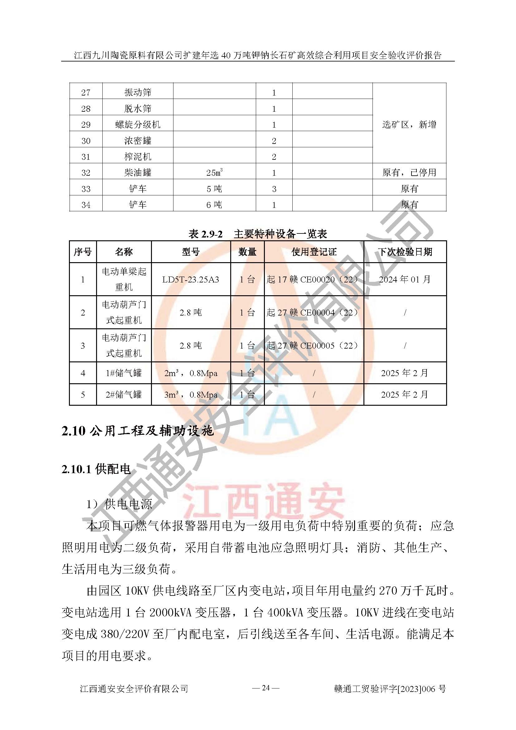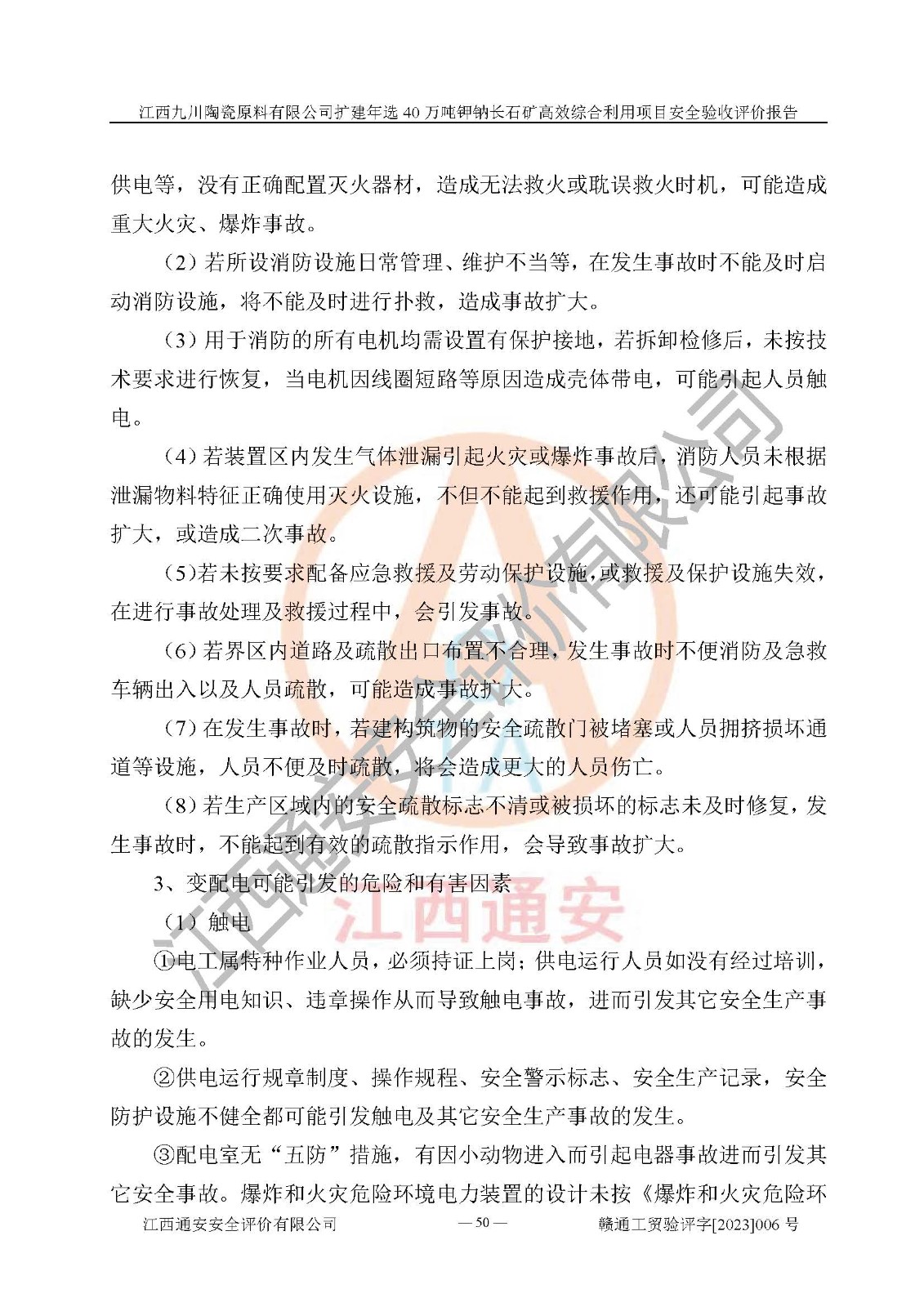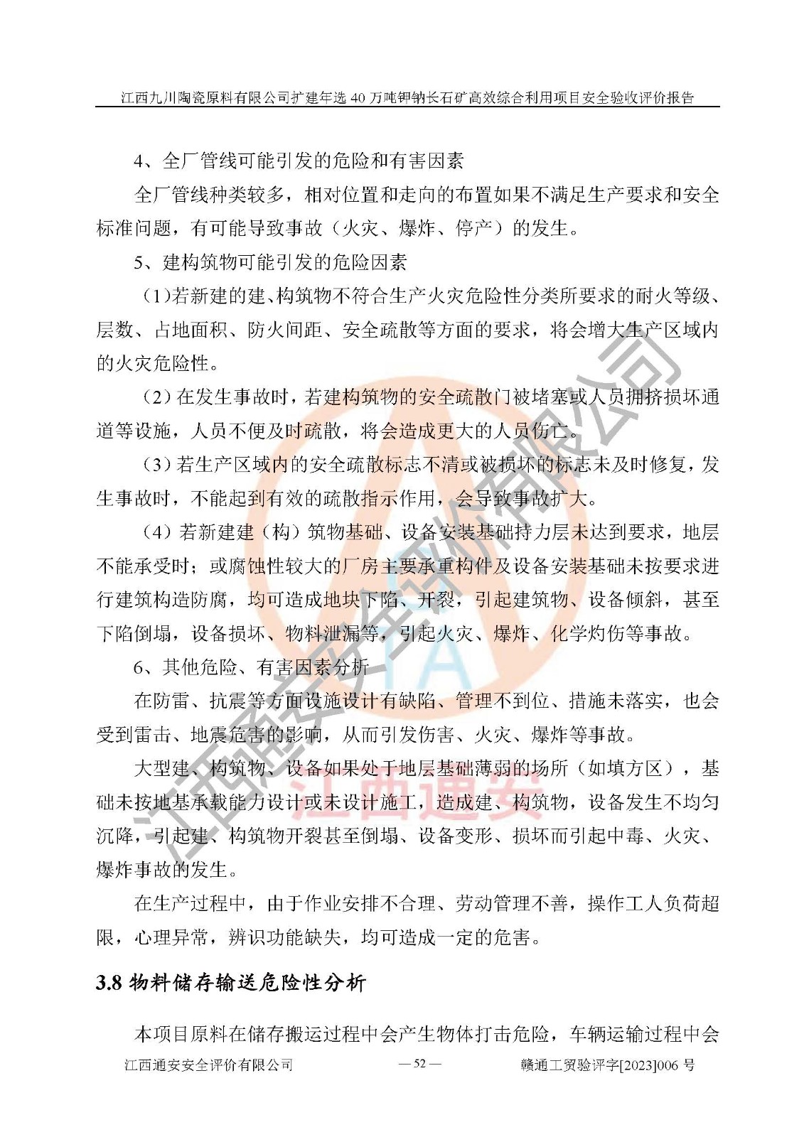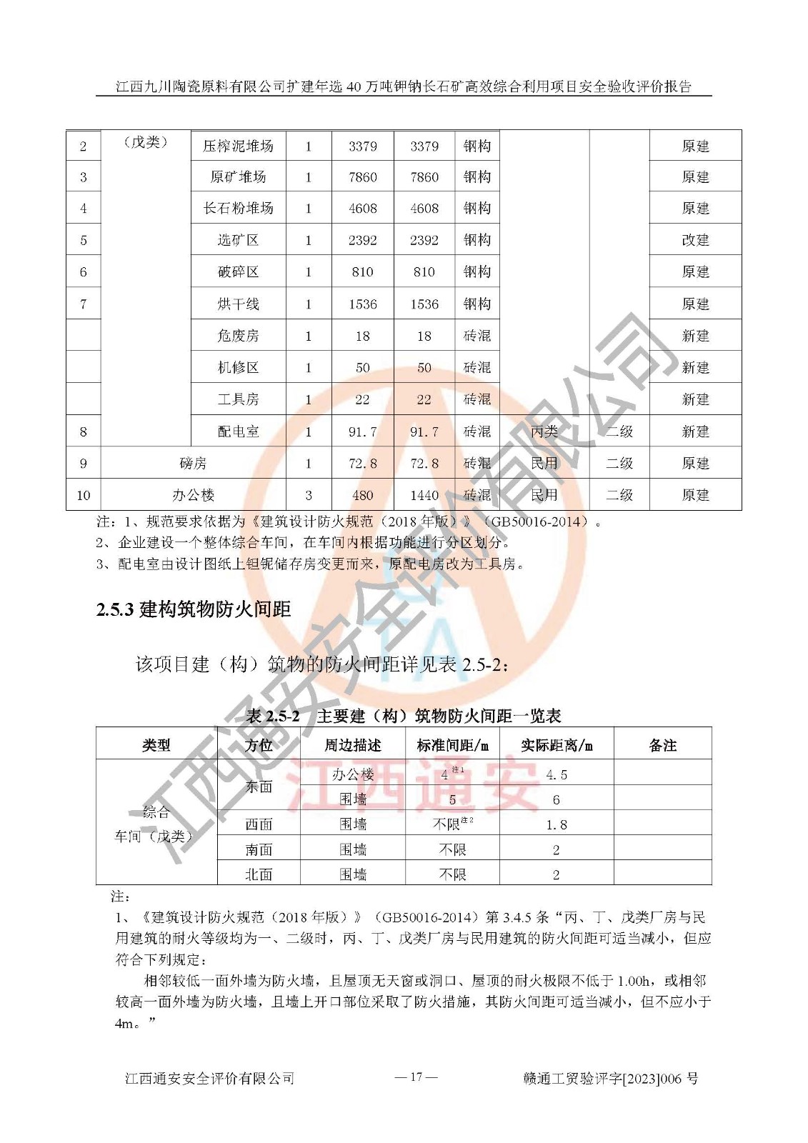 項目簡介 | 本報告為江西九川陶瓷原料有限公司擴(kuò)建年選40萬噸鉀鈉長石礦**綜合利用項目安全驗收評價報告。江西九川陶瓷原料有限公司成立于2012年5月18日,統(tǒng)一社會信用代碼:913609245965074856,注冊地址江西省宜春市宜豐縣工業(yè)園,注冊資金200萬元,法人**為趙宏業(yè),經(jīng)營范圍:瓷土、高嶺土、鉀長石、粘土陶瓷熔塊加工銷售。(依法須經(jīng)批準(zhǔn)的項目,經(jīng)相關(guān)部門批準(zhǔn)后方可開展經(jīng)營法動)。本項目為擴(kuò)建年選40萬噸鉀鈉長石礦**綜合利用項目,總投資4000萬元。 江西九川陶瓷原料有限公司于2014年前后建設(shè)投產(chǎn)了江西九川陶瓷原料有限公司年產(chǎn)75萬噸鉀長石項目,為宜春市陶瓷產(chǎn)業(yè)提供優(yōu)質(zhì)的鉀長石原料。為了適應(yīng)市場需求以及公司更好的發(fā)展,從鋰瓷石礦中提取優(yōu)質(zhì)的鋰云母資源,江西九川陶瓷原料有限公司決定依托現(xiàn)有破碎車間,利用現(xiàn)有原料堆棚改造為選礦車間,擴(kuò)建年選40萬噸鉀鈉長石礦**綜合利用項目。本次擴(kuò)建主要增加鋰云母提取工藝,為宜春市各鋰電產(chǎn)業(yè)提供優(yōu)質(zhì)的鋰云母原料。 本項目于2019年04月01日在宜豐縣發(fā)展和改革委員會備案,取得《江西省企業(yè)投資項目備案通知書》(宜豐縣發(fā)展和改革委員會,項目統(tǒng)一代碼為:2019-360924-30-03-005264),2022年4月組織技術(shù)人員編制了《江西九川陶瓷原料有限公司擴(kuò)建年選40萬噸鉀鈉長石礦建設(shè)項目選址安全條件論證報告》,2022年10月委托中裕工程集團(tuán)有限公司編制了《江西九川陶瓷原料有限公司擴(kuò)建年選40萬噸鉀鈉長石礦**綜合利用項目安全設(shè)施設(shè)計》。本項目外購礦石,通過破碎、球磨、選礦、脫水、烘干后*終產(chǎn)出鋰云母精礦、長石粉及尾泥。其中在生產(chǎn)工藝中主要涉及的化學(xué)品為聚丙烯酸酰胺、浮選劑,檢維修工序使用到的氧氣、乙炔,裝載車使用到的燃料柴油以及管道天然氣。經(jīng)辨識,該項目不構(gòu)成危險品重大危險源。根據(jù)生產(chǎn)工藝特點及物料的理化特性可知,該項目生產(chǎn)過程中存在火災(zāi)、爆炸、機(jī)械傷害、灼燙、觸電、**傷害、高處墜落、坍塌、物體打擊、淹溺、起重傷害、中毒窒息、其他傷害等危險有害因素。