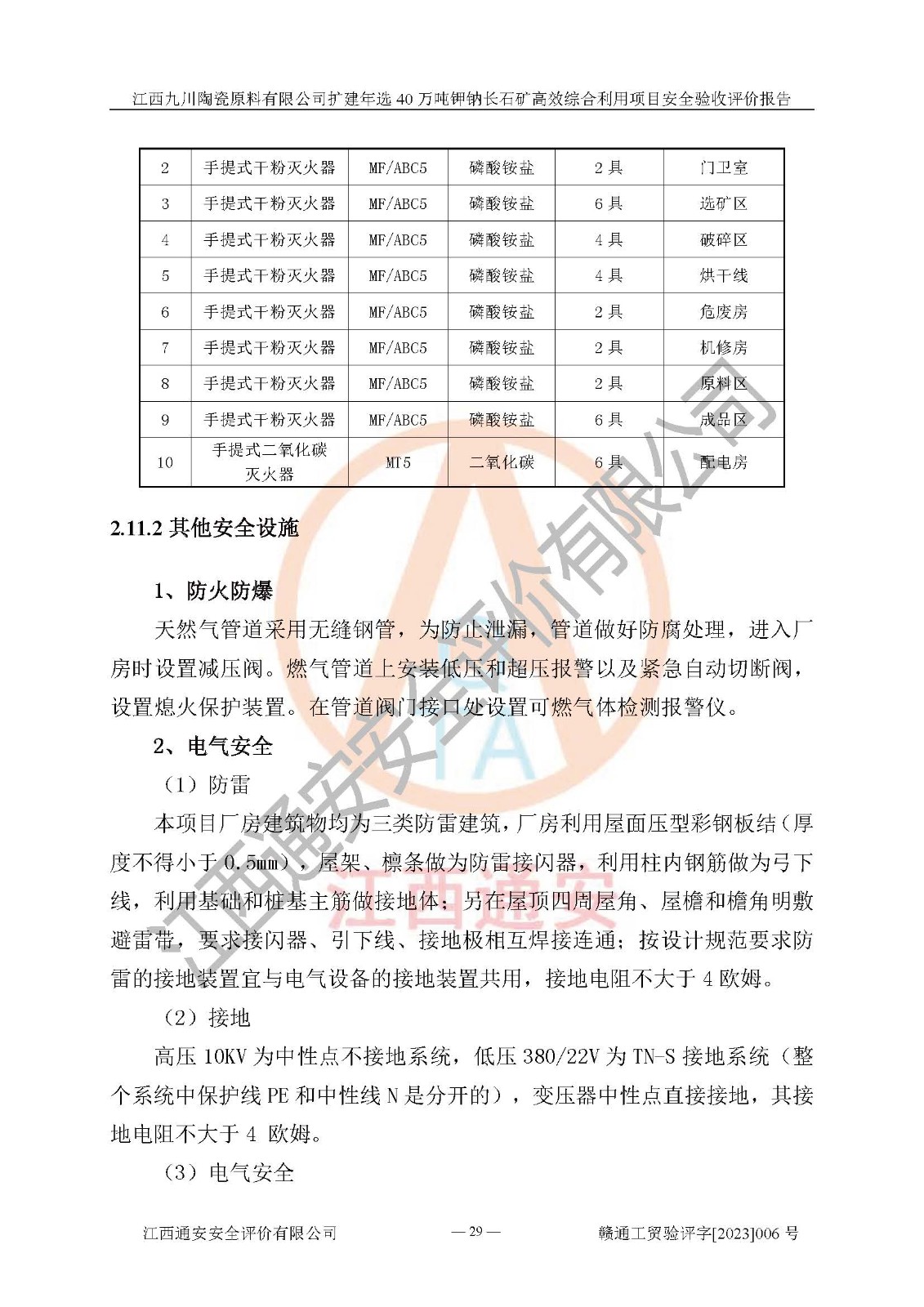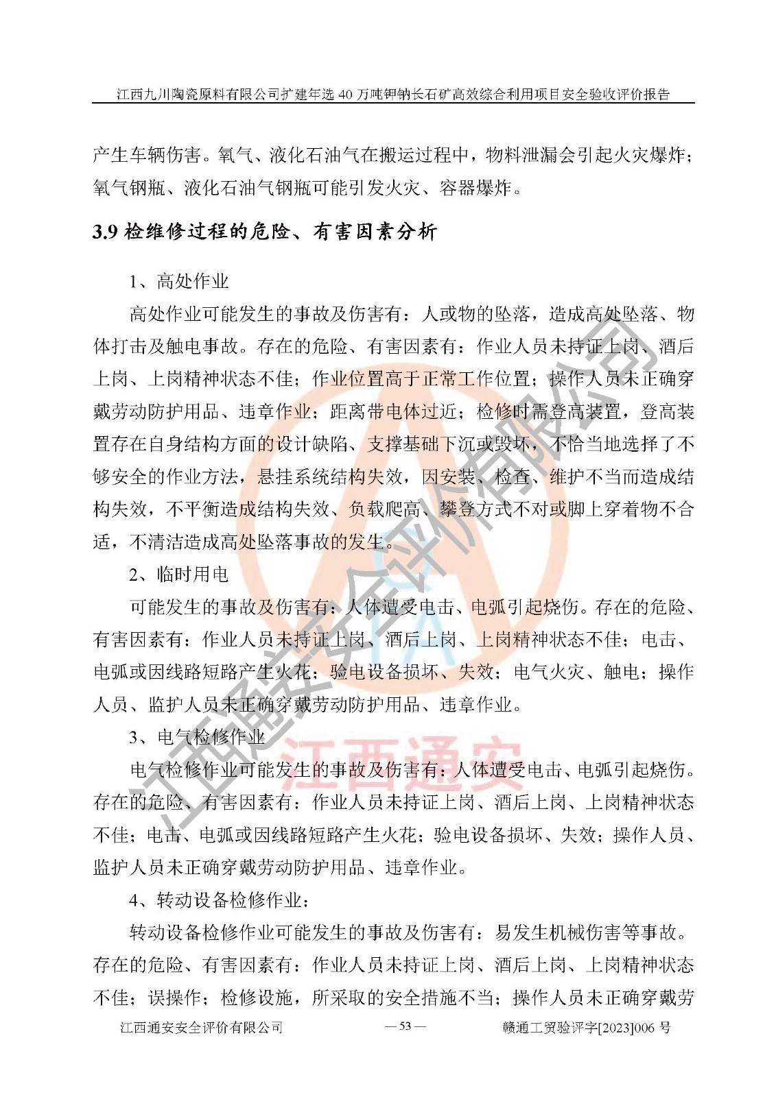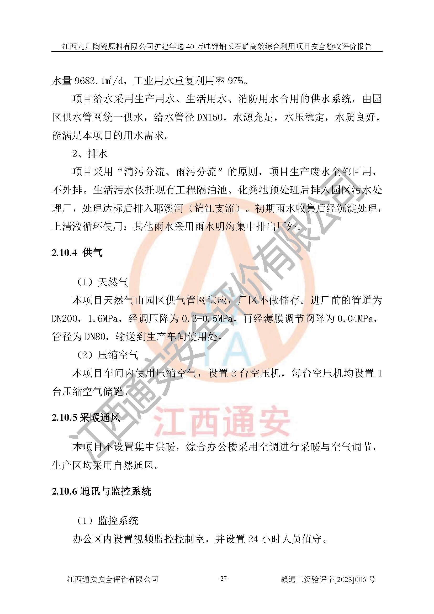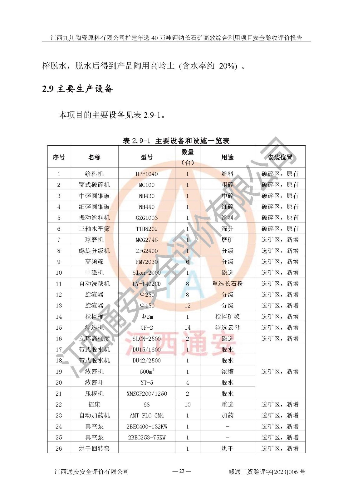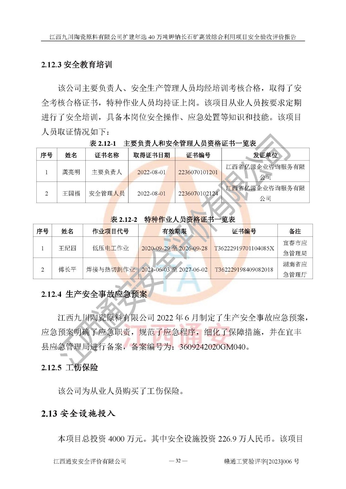 項目簡介 | 本報告為江西九川陶瓷原料有限公司擴(kuò)建年選40萬噸鉀鈉長石礦**綜合利用項目安全驗收評價報告。江西九川陶瓷原料有限公司成立于2012年5月18日,統(tǒng)一社會信用代碼:913609245965074856,注冊地址江西省宜春市宜豐縣工業(yè)園,注冊資金200萬元,法人**為趙宏業(yè),經(jīng)營范圍:瓷土、高嶺土、鉀長石、粘土陶瓷熔塊加工銷售。(依法須經(jīng)批準(zhǔn)的項目,經(jīng)相關(guān)部門批準(zhǔn)后方可開展經(jīng)營法動)。本項目為擴(kuò)建年選40萬噸鉀鈉長石礦**綜合利用項目,總投資4000萬元。 江西九川陶瓷原料有限公司于2014年前后建設(shè)投產(chǎn)了江西九川陶瓷原料有限公司年產(chǎn)75萬噸鉀長石項目,為宜春市陶瓷產(chǎn)業(yè)提供優(yōu)質(zhì)的鉀長石原料。為了適應(yīng)市場需求以及公司更好的發(fā)展,從鋰瓷石礦中提取優(yōu)質(zhì)的鋰云母資源,江西九川陶瓷原料有限公司決定依托現(xiàn)有破碎車間,利用現(xiàn)有原料堆棚改造為選礦車間,擴(kuò)建年選40萬噸鉀鈉長石礦**綜合利用項目。本次擴(kuò)建主要增加鋰云母提取工藝,為宜春市各鋰電產(chǎn)業(yè)提供優(yōu)質(zhì)的鋰云母原料。 本項目于2019年04月01日在宜豐縣發(fā)展和改革委員會備案,取得《江西省企業(yè)投資項目備案通知書》(宜豐縣發(fā)展和改革委員會,項目統(tǒng)一代碼為:2019-360924-30-03-005264),2022年4月組織技術(shù)人員編制了《江西九川陶瓷原料有限公司擴(kuò)建年選40萬噸鉀鈉長石礦建設(shè)項目選址安全條件論證報告》,2022年10月委托中裕工程集團(tuán)有限公司編制了《江西九川陶瓷原料有限公司擴(kuò)建年選40萬噸鉀鈉長石礦**綜合利用項目安全設(shè)施設(shè)計》。本項目外購礦石,通過破碎、球磨、選礦、脫水、烘干后*終產(chǎn)出鋰云母精礦、長石粉及尾泥。其中在生產(chǎn)工藝中主要涉及的化學(xué)品為聚丙烯酸酰胺、浮選劑,檢維修工序使用到的氧氣、乙炔,裝載車使用到的燃料柴油以及管道天然氣。經(jīng)辨識,該項目不構(gòu)成危險品重大危險源。根據(jù)生產(chǎn)工藝特點及物料的理化特性可知,該項目生產(chǎn)過程中存在火災(zāi)、爆炸、機(jī)械傷害、灼燙、觸電、**傷害、高處墜落、坍塌、物體打擊、淹溺、起重傷害、中毒窒息、其他傷害等危險有害因素。