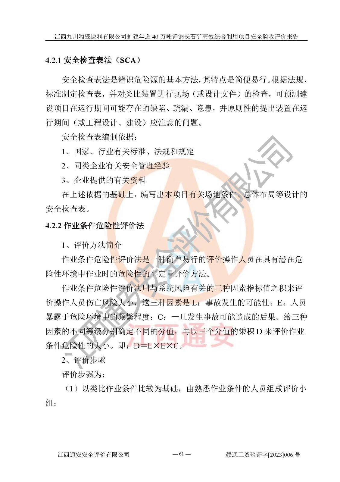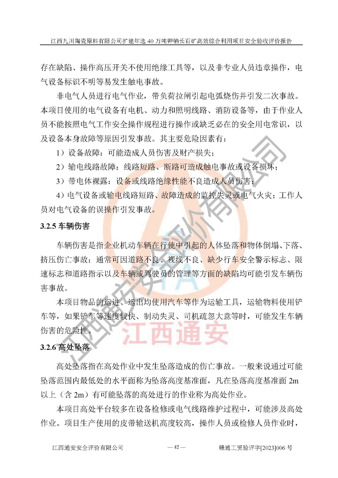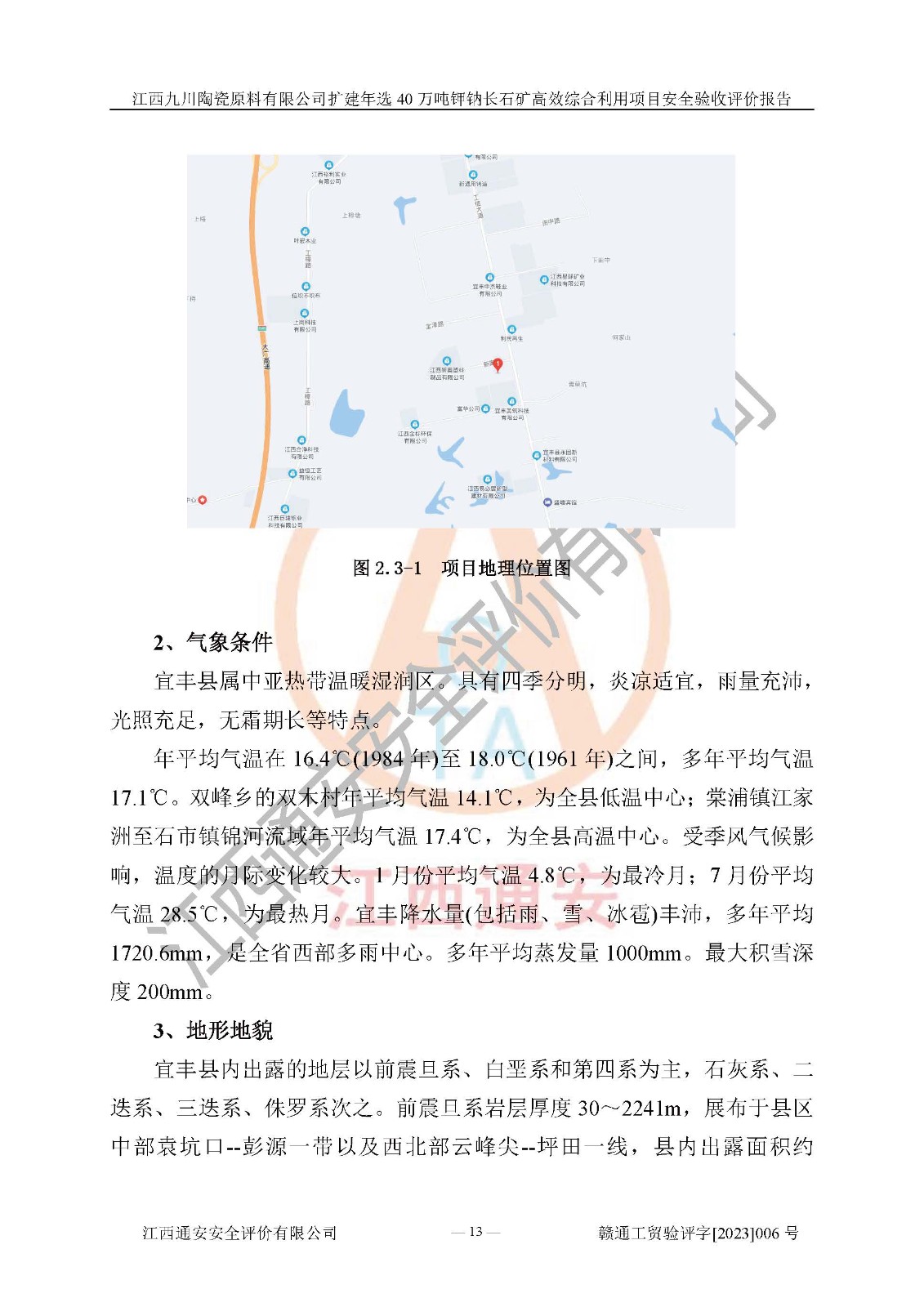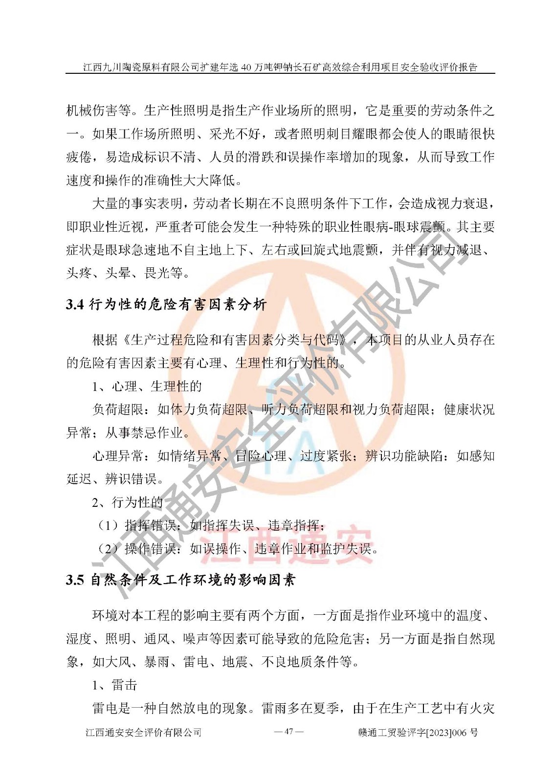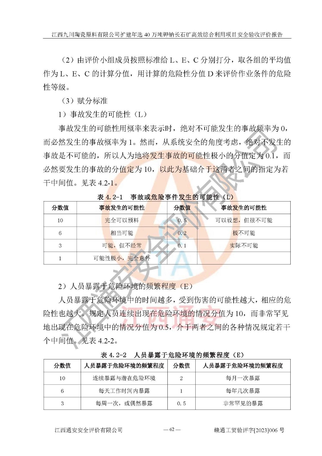 項目簡介 | 本報告為江西九川陶瓷原料有限公司擴(kuò)建年選40萬噸鉀鈉長石礦**綜合利用項目安全驗收評價報告。江西九川陶瓷原料有限公司成立于2012年5月18日,統(tǒng)一社會信用代碼:913609245965074856,注冊地址江西省宜春市宜豐縣工業(yè)園,注冊資金200萬元,法人**為趙宏業(yè),經(jīng)營范圍:瓷土、高嶺土、鉀長石、粘土陶瓷熔塊加工銷售。(依法須經(jīng)批準(zhǔn)的項目,經(jīng)相關(guān)部門批準(zhǔn)后方可開展經(jīng)營法動)。本項目為擴(kuò)建年選40萬噸鉀鈉長石礦**綜合利用項目,總投資4000萬元。 江西九川陶瓷原料有限公司于2014年前后建設(shè)投產(chǎn)了江西九川陶瓷原料有限公司年產(chǎn)75萬噸鉀長石項目,為宜春市陶瓷產(chǎn)業(yè)提供優(yōu)質(zhì)的鉀長石原料。為了適應(yīng)市場需求以及公司更好的發(fā)展,從鋰瓷石礦中提取優(yōu)質(zhì)的鋰云母資源,江西九川陶瓷原料有限公司決定依托現(xiàn)有破碎車間,利用現(xiàn)有原料堆棚改造為選礦車間,擴(kuò)建年選40萬噸鉀鈉長石礦**綜合利用項目。本次擴(kuò)建主要增加鋰云母提取工藝,為宜春市各鋰電產(chǎn)業(yè)提供優(yōu)質(zhì)的鋰云母原料。 本項目于2019年04月01日在宜豐縣發(fā)展和改革委員會備案,取得《江西省企業(yè)投資項目備案通知書》(宜豐縣發(fā)展和改革委員會,項目統(tǒng)一代碼為:2019-360924-30-03-005264),2022年4月組織技術(shù)人員編制了《江西九川陶瓷原料有限公司擴(kuò)建年選40萬噸鉀鈉長石礦建設(shè)項目選址安全條件論證報告》,2022年10月委托中裕工程集團(tuán)有限公司編制了《江西九川陶瓷原料有限公司擴(kuò)建年選40萬噸鉀鈉長石礦**綜合利用項目安全設(shè)施設(shè)計》。本項目外購礦石,通過破碎、球磨、選礦、脫水、烘干后*終產(chǎn)出鋰云母精礦、長石粉及尾泥。其中在生產(chǎn)工藝中主要涉及的化學(xué)品為聚丙烯酸酰胺、浮選劑,檢維修工序使用到的氧氣、乙炔,裝載車使用到的燃料柴油以及管道天然氣。經(jīng)辨識,該項目不構(gòu)成危險品重大危險源。根據(jù)生產(chǎn)工藝特點及物料的理化特性可知,該項目生產(chǎn)過程中存在火災(zāi)、爆炸、機(jī)械傷害、灼燙、觸電、**傷害、高處墜落、坍塌、物體打擊、淹溺、起重傷害、中毒窒息、其他傷害等危險有害因素。