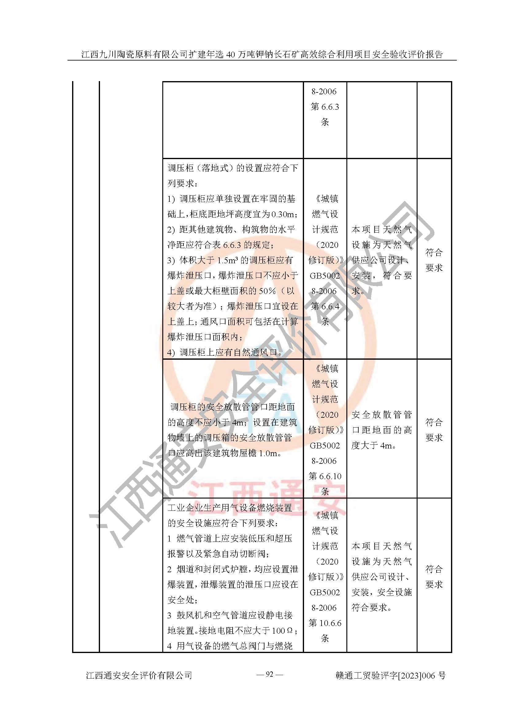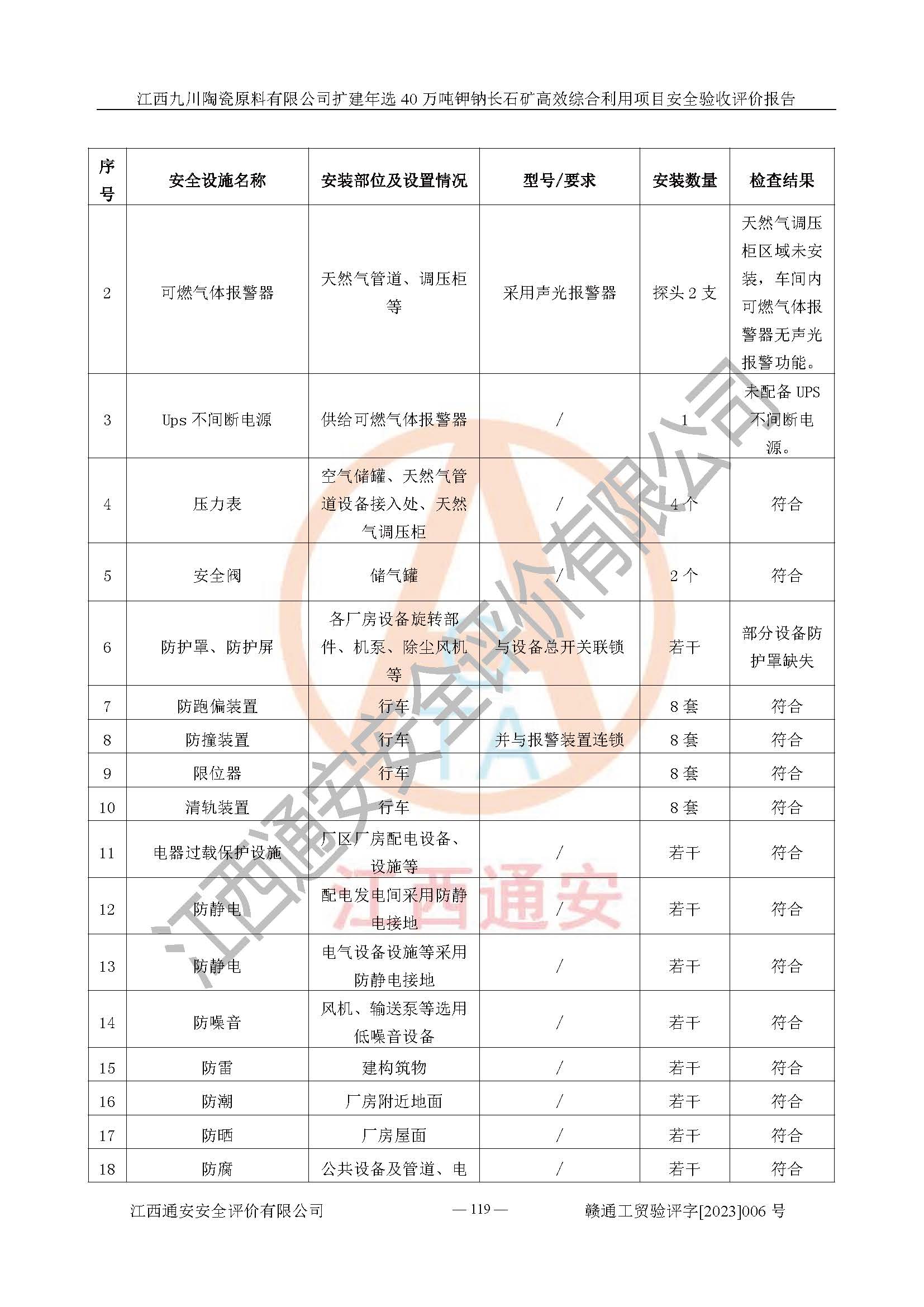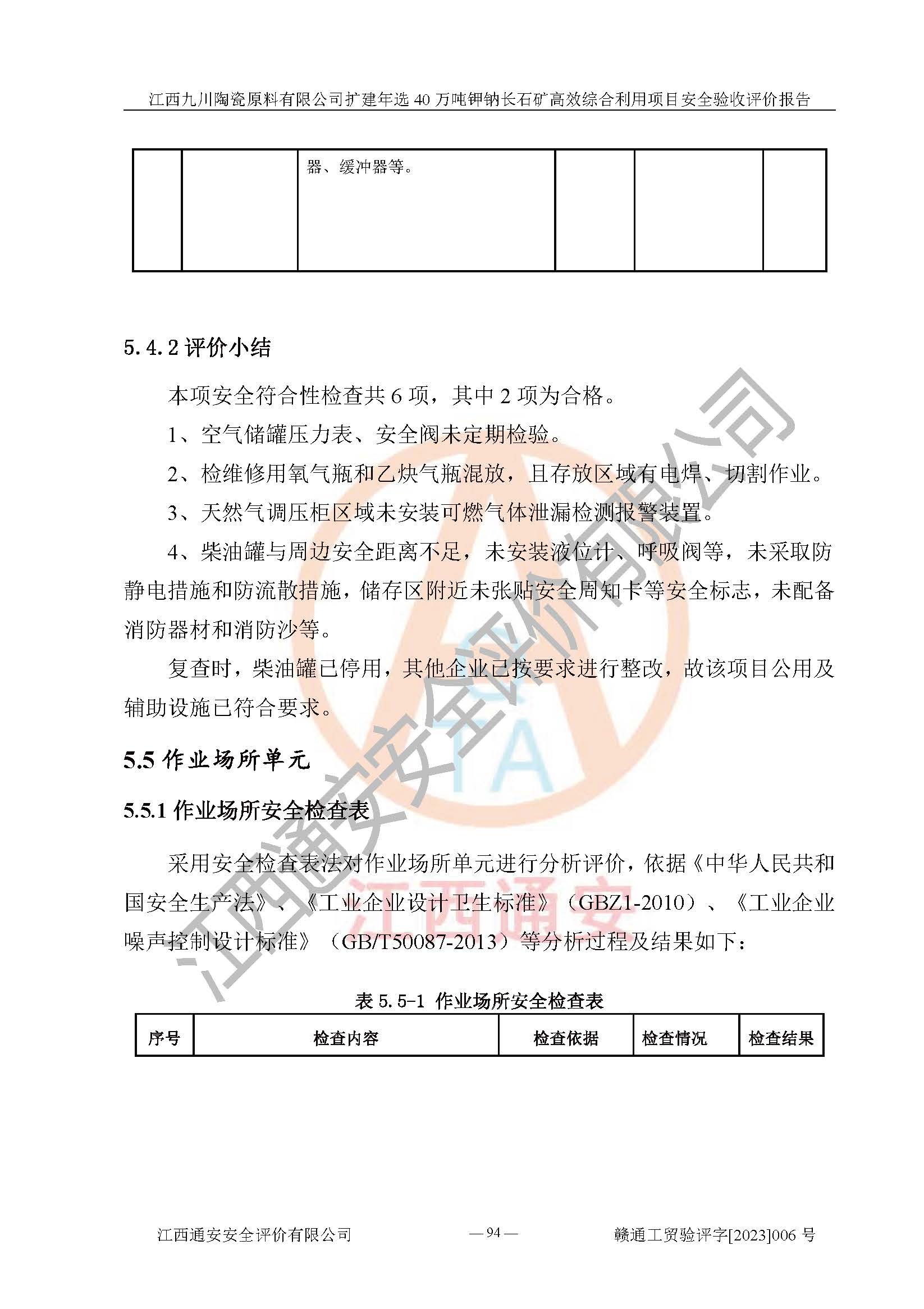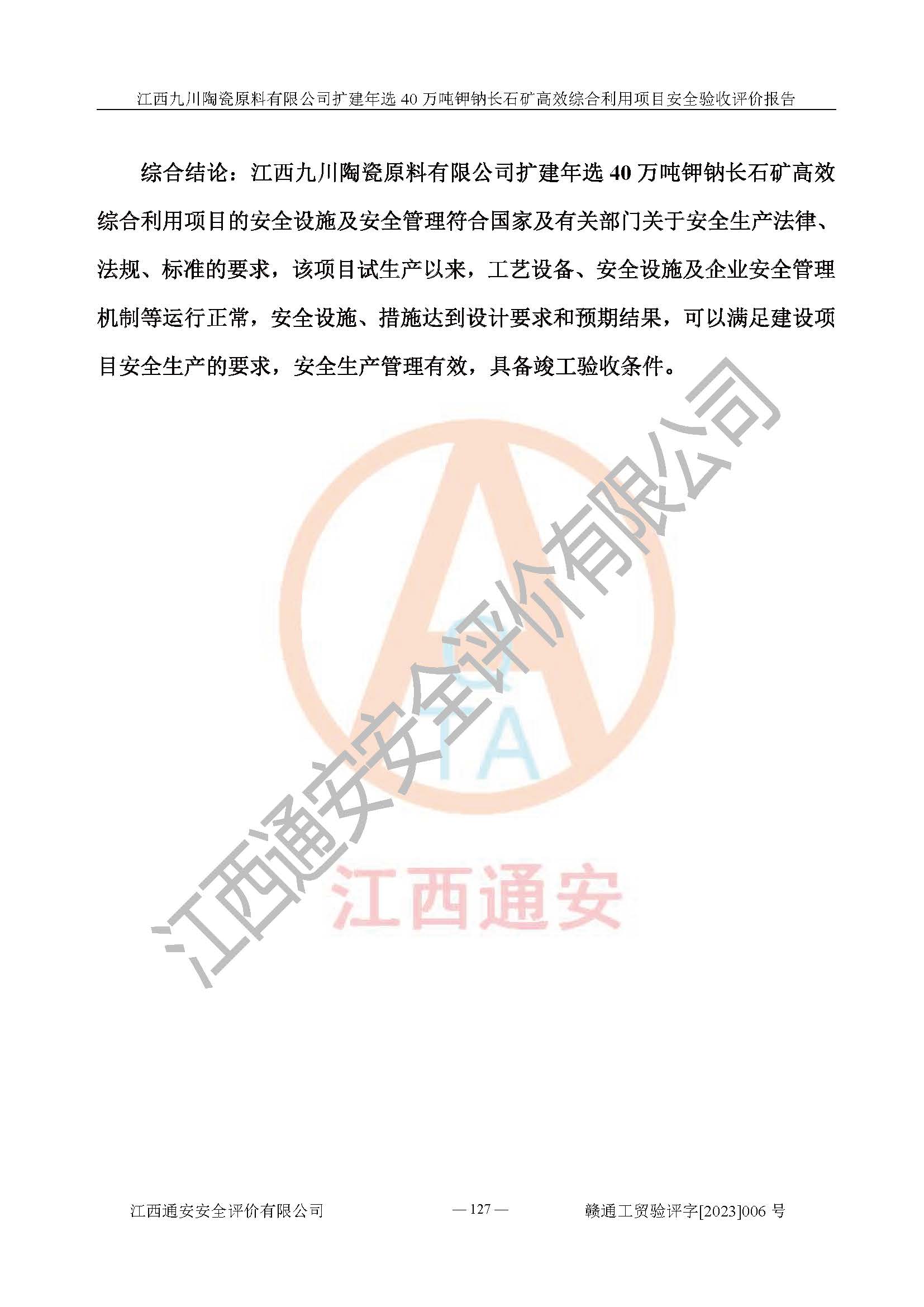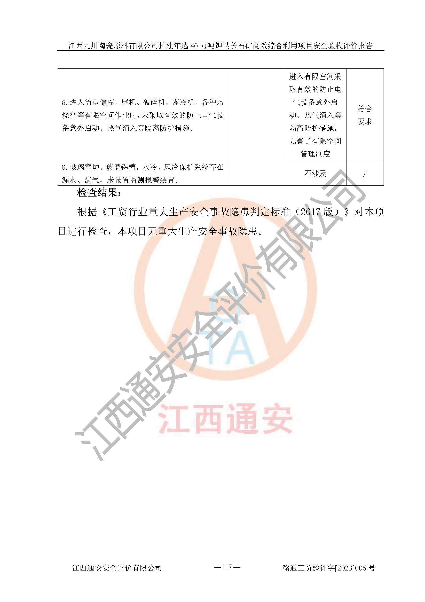 其它 | 根據(jù)《中華人民共和國安全生產(chǎn)法》、《新建項目安全設(shè)施“三同時”監(jiān)督管理辦法》(原**安全生產(chǎn)監(jiān)督管理總局令第77號修訂)等法律法規(guī)的要求,對江西九川陶瓷原料有限公司擴(kuò)建年選40萬噸鉀鈉長石礦**綜合利用項目安全驗收的基本條件進(jìn)行分析,結(jié)果如下: 1)本項目在初步設(shè)計及建設(shè)過程中基本能貫徹執(zhí)行**、地方及有關(guān)部門的安全生產(chǎn)法律法規(guī)、標(biāo)準(zhǔn)要求,取得了**相關(guān)部門的許可、備案。項目的設(shè)計、施工、監(jiān)理等單位均有相應(yīng)資質(zhì)。 2)本項目址選符合要求;總平面布置合理,主要建筑的防火間距符合符合《建筑設(shè)計防火規(guī)范(2018版)》(GB50016-2014)、《工業(yè)企業(yè)總平面設(shè)計規(guī)范》(GB50187-2012)有關(guān)規(guī)范、標(biāo)準(zhǔn)的要求。 3)本項目生產(chǎn)工藝成熟、試運行正常,試運行中過程中工藝和裝置、設(shè)備(設(shè)施)安全、可靠,未發(fā)生安全事故。 4)本項目的特種設(shè)備由有資質(zhì)單位設(shè)計、制造、安裝,特種設(shè)備經(jīng)宜春市特種設(shè)備檢驗中心檢驗合格,符合《中華人民共和國特種設(shè)備安全法》、《特種設(shè)備安全監(jiān)察條例》(中華人民共和國***令第549號)的規(guī)定。特種設(shè)備作業(yè)人員、特種作業(yè)人員均持證上崗。 5)企業(yè)主要負(fù)責(zé)人、安全管理人員均取得了江西省億源企業(yè)咨詢服務(wù)有限公司頒發(fā)的培訓(xùn)證書,特種作業(yè)人員操作證在**期內(nèi),其他從業(yè)人員經(jīng)安全培訓(xùn)符合,取得上崗證。 6)企業(yè)建立有安全管理制度,制定有各類人員的安全生產(chǎn)責(zé)任制、各項安全管理制度和操作規(guī)程。按照**有關(guān)規(guī)定編制了事故應(yīng)急救援預(yù)案并進(jìn)行了備案,并定期進(jìn)行演練等,符合要求。 7)本項目作業(yè)條件危險性分析結(jié)果:在選定的單元的危險程度均為“可能危險,需要注意”或“稍有危險,可以接受”,作業(yè)條件相對安全。 評價結(jié)論: 江西九川陶瓷原料有限公司擴(kuò)建年選40萬噸鉀鈉長石礦**綜合利用項目的安全設(shè)施及安全管理符合**及有關(guān)部門關(guān)于安全生產(chǎn)法律、法規(guī)、標(biāo)準(zhǔn)的要求,該項目試生產(chǎn)以來,工藝設(shè)備、安全設(shè)施及企業(yè)安全管理機(jī)制等運行正常,安全設(shè)施、措施達(dá)到設(shè)計要求和預(yù)期結(jié)果,可以滿足建設(shè)項目安全生產(chǎn)的要求,安全生產(chǎn)管理**,具備竣工驗收條件。 | ||||