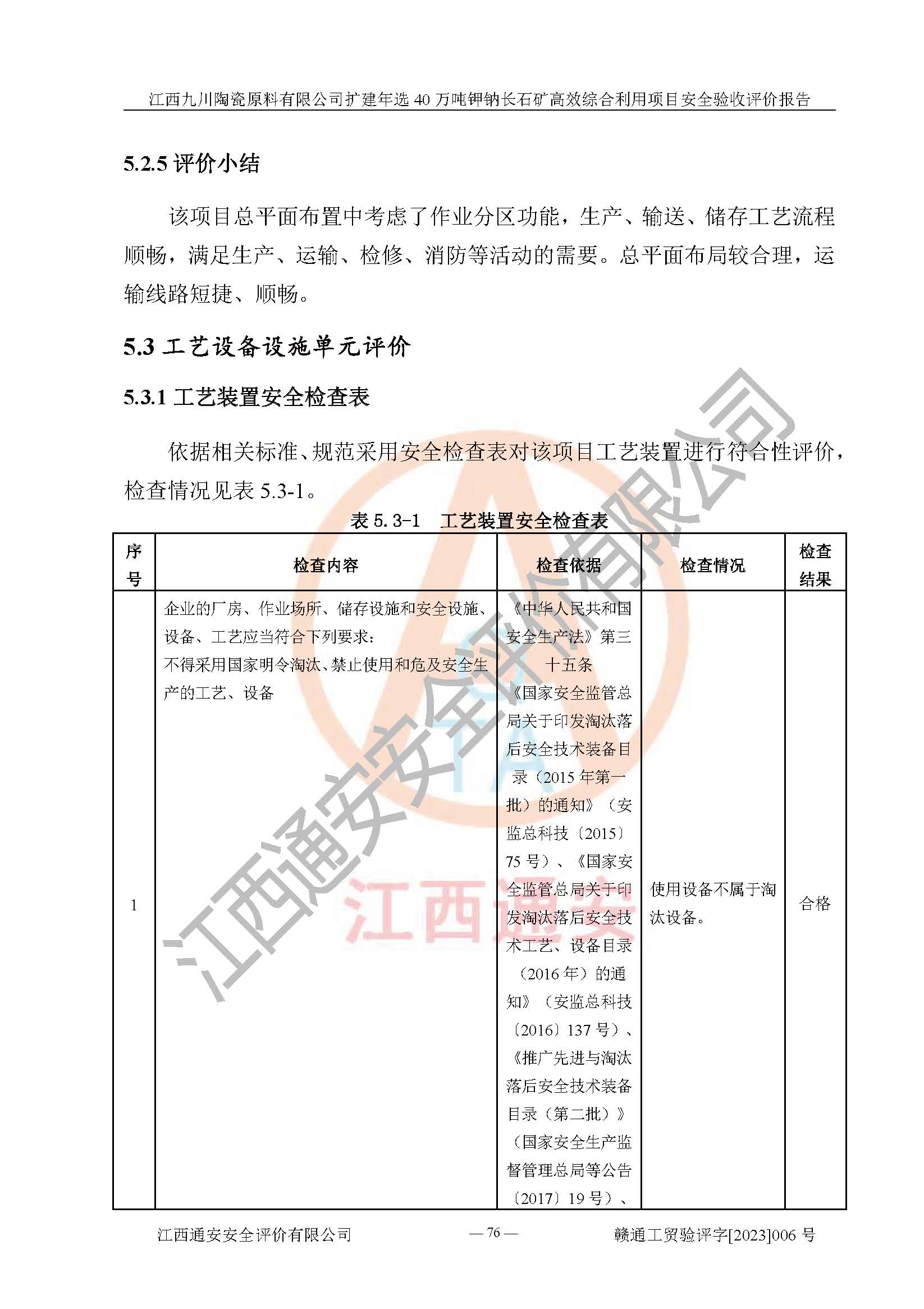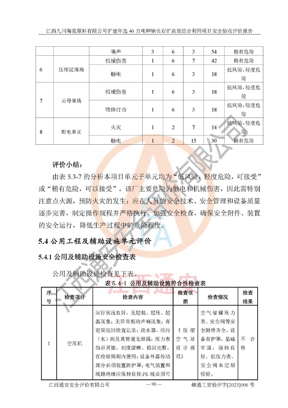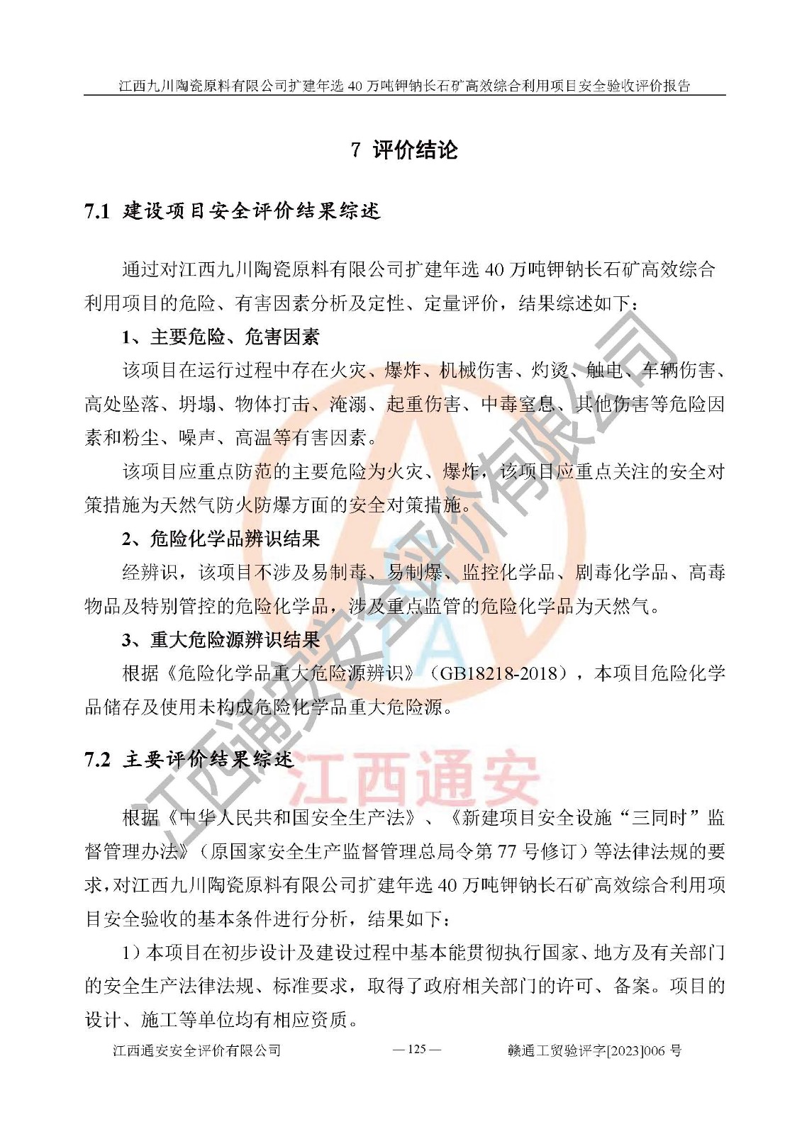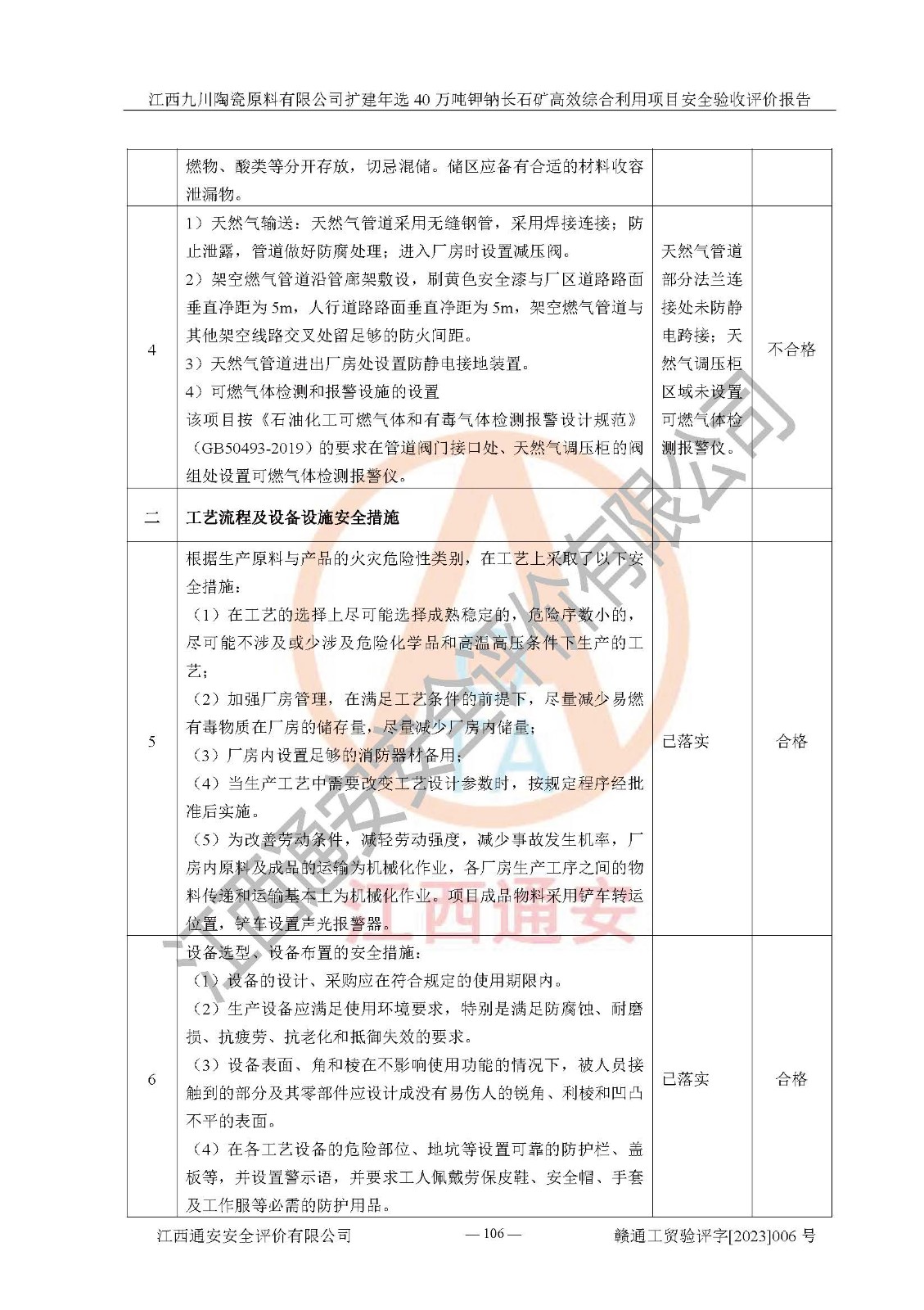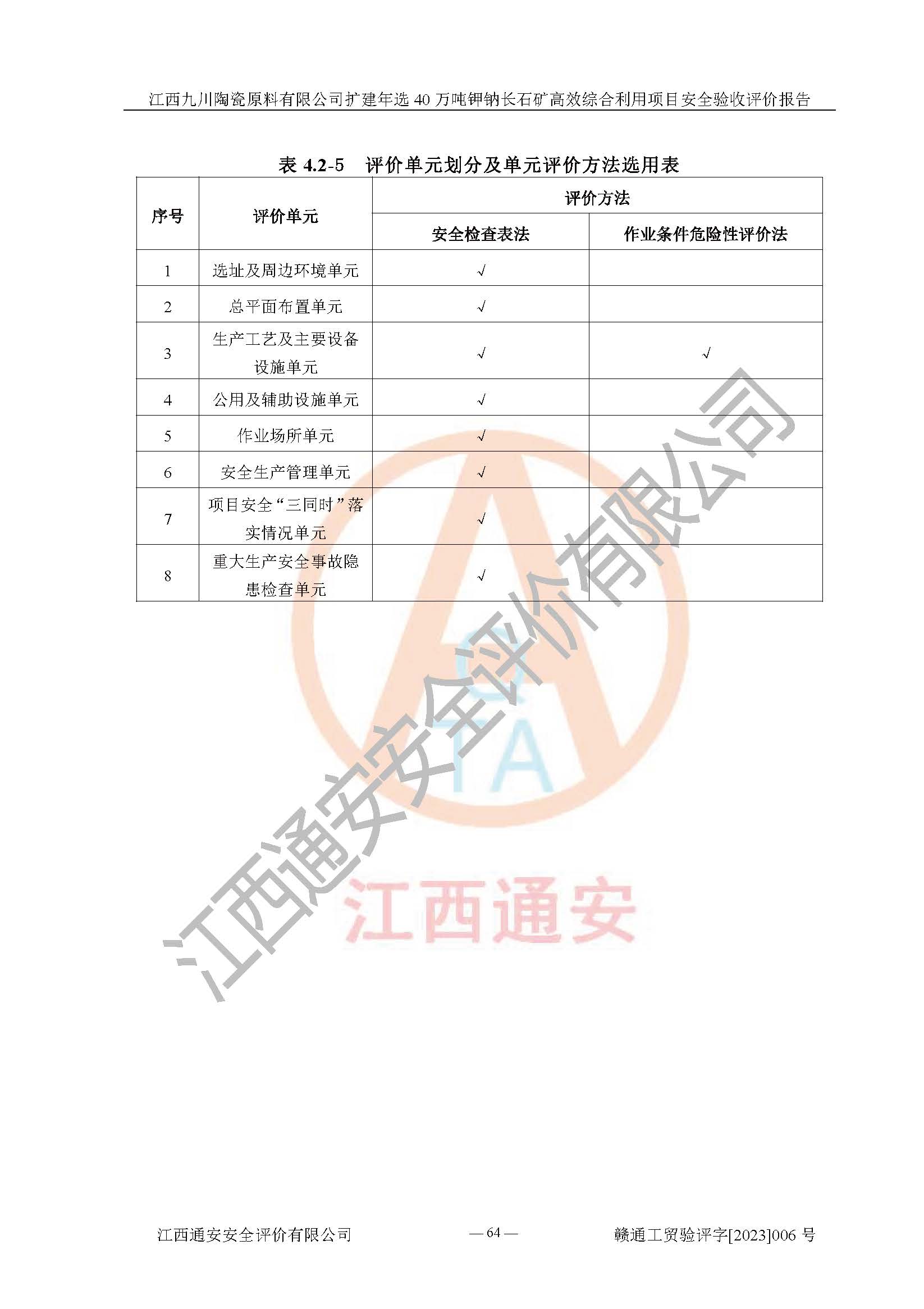其它 | 根據(jù)《中華人民共和國安全生產(chǎn)法》、《新建項目安全設(shè)施“三同時”監(jiān)督管理辦法》(原**安全生產(chǎn)監(jiān)督管理總局令第77號修訂)等法律法規(guī)的要求,對江西九川陶瓷原料有限公司擴(kuò)建年選40萬噸鉀鈉長石礦**綜合利用項目安全驗收的基本條件進(jìn)行分析,結(jié)果如下: 1)本項目在初步設(shè)計及建設(shè)過程中基本能貫徹執(zhí)行**、地方及有關(guān)部門的安全生產(chǎn)法律法規(guī)、標(biāo)準(zhǔn)要求,取得了**相關(guān)部門的許可、備案。項目的設(shè)計、施工、監(jiān)理等單位均有相應(yīng)資質(zhì)。 2)本項目址選符合要求;總平面布置合理,主要建筑的防火間距符合符合《建筑設(shè)計防火規(guī)范(2018版)》(GB50016-2014)、《工業(yè)企業(yè)總平面設(shè)計規(guī)范》(GB50187-2012)有關(guān)規(guī)范、標(biāo)準(zhǔn)的要求。 3)本項目生產(chǎn)工藝成熟、試運行正常,試運行中過程中工藝和裝置、設(shè)備(設(shè)施)安全、可靠,未發(fā)生安全事故。 4)本項目的特種設(shè)備由有資質(zhì)單位設(shè)計、制造、安裝,特種設(shè)備經(jīng)宜春市特種設(shè)備檢驗中心檢驗合格,符合《中華人民共和國特種設(shè)備安全法》、《特種設(shè)備安全監(jiān)察條例》(中華人民共和國***令第549號)的規(guī)定。特種設(shè)備作業(yè)人員、特種作業(yè)人員均持證上崗。 5)企業(yè)主要負(fù)責(zé)人、安全管理人員均取得了江西省億源企業(yè)咨詢服務(wù)有限公司頒發(fā)的培訓(xùn)證書,特種作業(yè)人員操作證在**期內(nèi),其他從業(yè)人員經(jīng)安全培訓(xùn)符合,取得上崗證。 6)企業(yè)建立有安全管理制度,制定有各類人員的安全生產(chǎn)責(zé)任制、各項安全管理制度和操作規(guī)程。按照**有關(guān)規(guī)定編制了事故應(yīng)急救援預(yù)案并進(jìn)行了備案,并定期進(jìn)行演練等,符合要求。 7)本項目作業(yè)條件危險性分析結(jié)果:在選定的單元的危險程度均為“可能危險,需要注意”或“稍有危險,可以接受”,作業(yè)條件相對安全。 評價結(jié)論: 江西九川陶瓷原料有限公司擴(kuò)建年選40萬噸鉀鈉長石礦**綜合利用項目的安全設(shè)施及安全管理符合**及有關(guān)部門關(guān)于安全生產(chǎn)法律、法規(guī)、標(biāo)準(zhǔn)的要求,該項目試生產(chǎn)以來,工藝設(shè)備、安全設(shè)施及企業(yè)安全管理機(jī)制等運行正常,安全設(shè)施、措施達(dá)到設(shè)計要求和預(yù)期結(jié)果,可以滿足建設(shè)項目安全生產(chǎn)的要求,安全生產(chǎn)管理**,具備竣工驗收條件。 | ||||