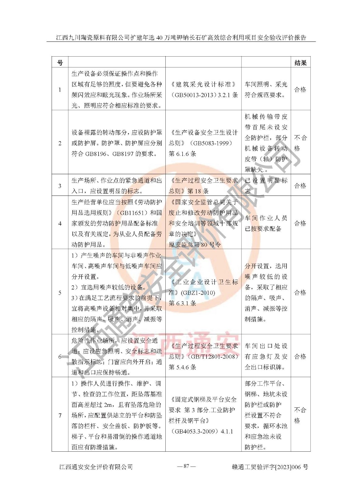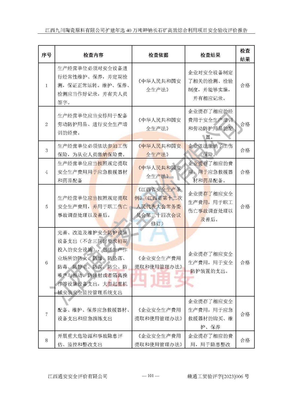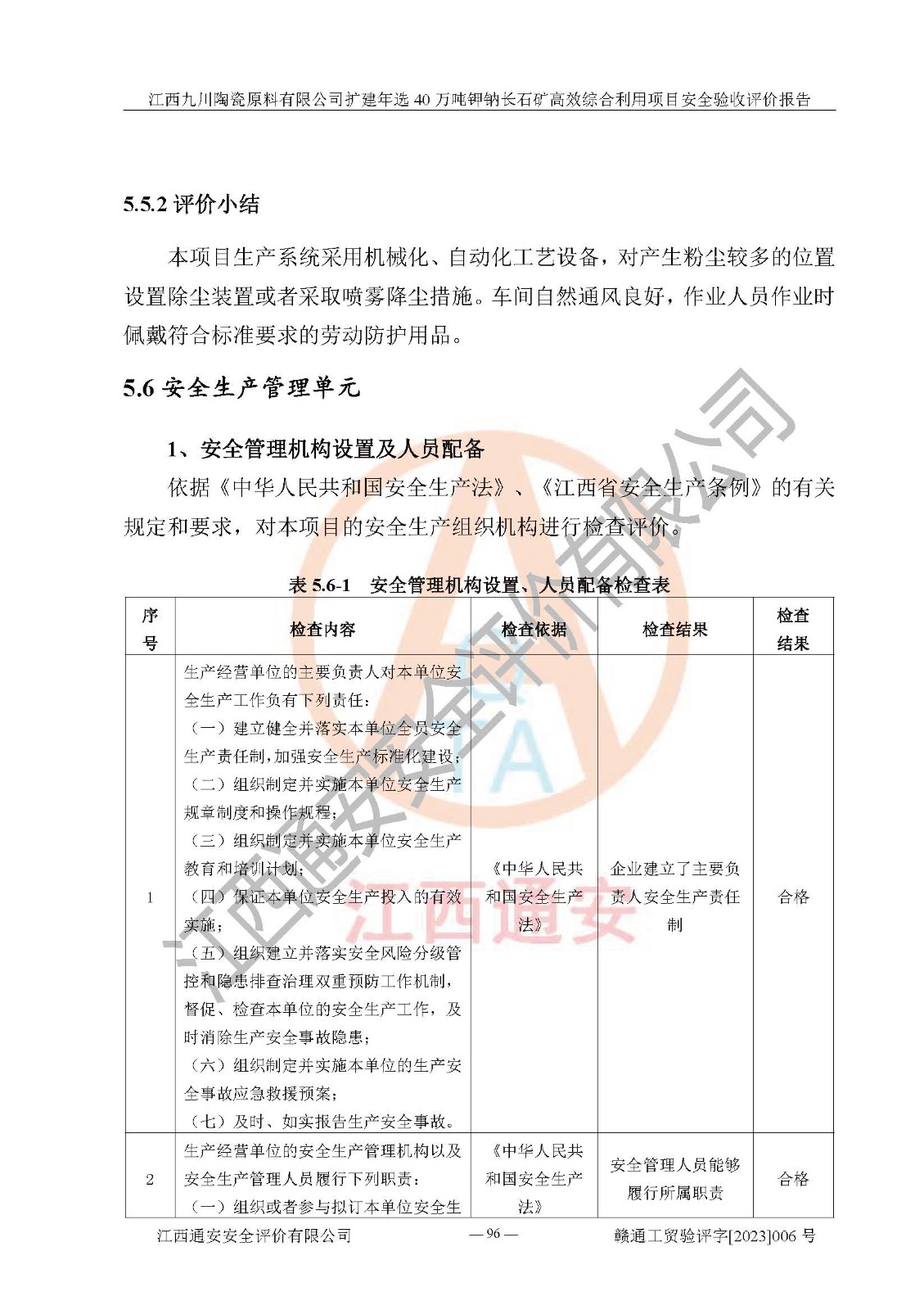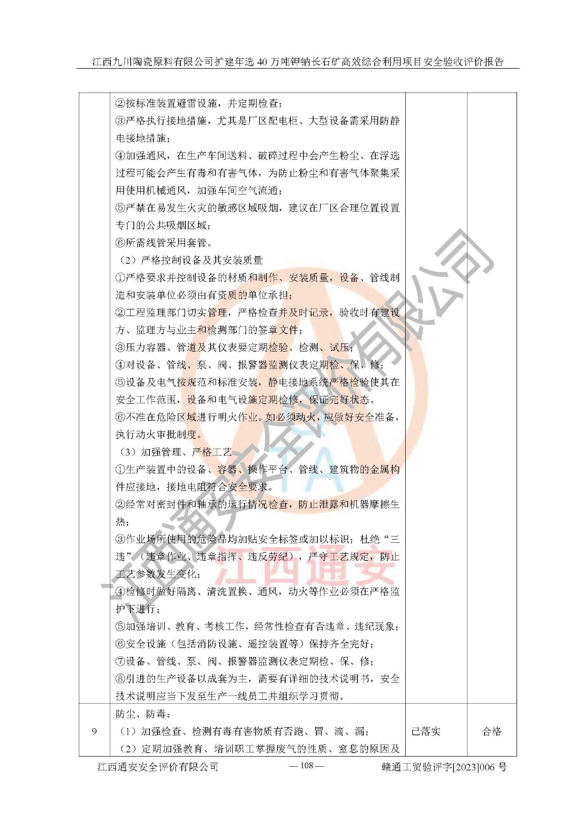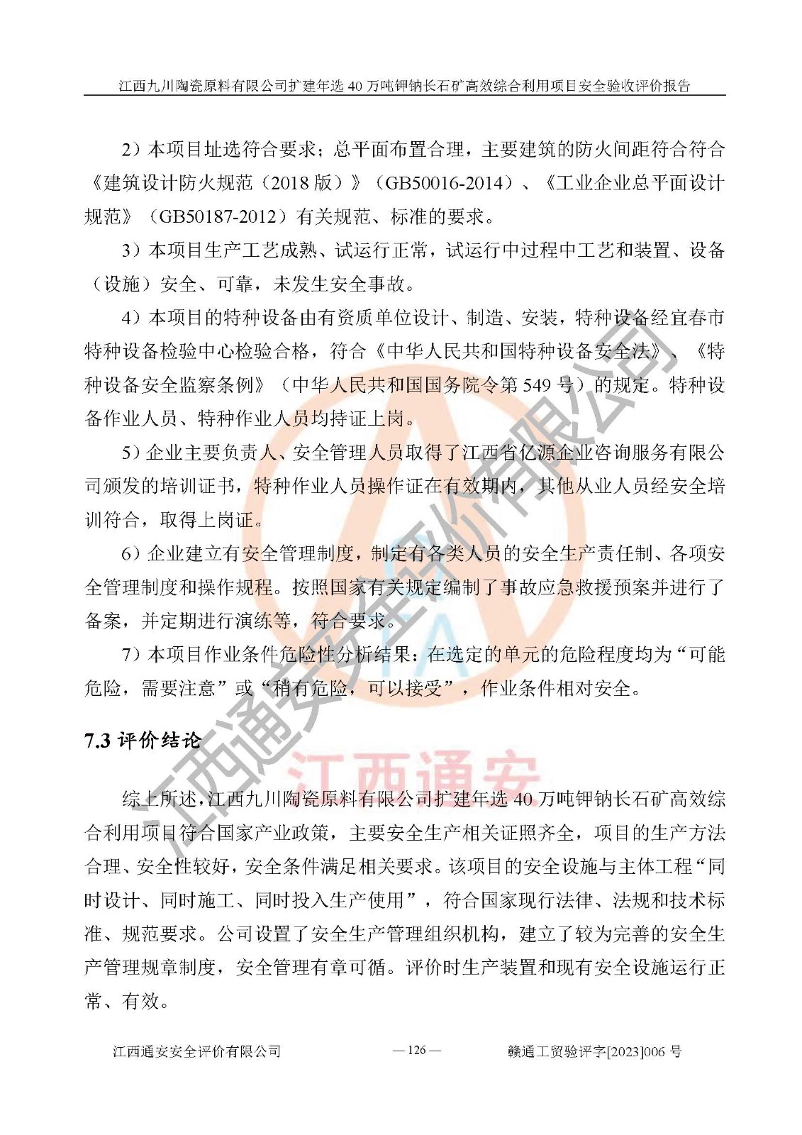 其它 | 根據(jù)《中華人民共和國安全生產(chǎn)法》、《新建項目安全設(shè)施“三同時”監(jiān)督管理辦法》(原**安全生產(chǎn)監(jiān)督管理總局令第77號修訂)等法律法規(guī)的要求,對江西九川陶瓷原料有限公司擴(kuò)建年選40萬噸鉀鈉長石礦**綜合利用項目安全驗收的基本條件進(jìn)行分析,結(jié)果如下: 1)本項目在初步設(shè)計及建設(shè)過程中基本能貫徹執(zhí)行**、地方及有關(guān)部門的安全生產(chǎn)法律法規(guī)、標(biāo)準(zhǔn)要求,取得了**相關(guān)部門的許可、備案。項目的設(shè)計、施工、監(jiān)理等單位均有相應(yīng)資質(zhì)。 2)本項目址選符合要求;總平面布置合理,主要建筑的防火間距符合符合《建筑設(shè)計防火規(guī)范(2018版)》(GB50016-2014)、《工業(yè)企業(yè)總平面設(shè)計規(guī)范》(GB50187-2012)有關(guān)規(guī)范、標(biāo)準(zhǔn)的要求。 3)本項目生產(chǎn)工藝成熟、試運行正常,試運行中過程中工藝和裝置、設(shè)備(設(shè)施)安全、可靠,未發(fā)生安全事故。 4)本項目的特種設(shè)備由有資質(zhì)單位設(shè)計、制造、安裝,特種設(shè)備經(jīng)宜春市特種設(shè)備檢驗中心檢驗合格,符合《中華人民共和國特種設(shè)備安全法》、《特種設(shè)備安全監(jiān)察條例》(中華人民共和國***令第549號)的規(guī)定。特種設(shè)備作業(yè)人員、特種作業(yè)人員均持證上崗。 5)企業(yè)主要負(fù)責(zé)人、安全管理人員均取得了江西省億源企業(yè)咨詢服務(wù)有限公司頒發(fā)的培訓(xùn)證書,特種作業(yè)人員操作證在**期內(nèi),其他從業(yè)人員經(jīng)安全培訓(xùn)符合,取得上崗證。 6)企業(yè)建立有安全管理制度,制定有各類人員的安全生產(chǎn)責(zé)任制、各項安全管理制度和操作規(guī)程。按照**有關(guān)規(guī)定編制了事故應(yīng)急救援預(yù)案并進(jìn)行了備案,并定期進(jìn)行演練等,符合要求。 7)本項目作業(yè)條件危險性分析結(jié)果:在選定的單元的危險程度均為“可能危險,需要注意”或“稍有危險,可以接受”,作業(yè)條件相對安全。 評價結(jié)論: 江西九川陶瓷原料有限公司擴(kuò)建年選40萬噸鉀鈉長石礦**綜合利用項目的安全設(shè)施及安全管理符合**及有關(guān)部門關(guān)于安全生產(chǎn)法律、法規(guī)、標(biāo)準(zhǔn)的要求,該項目試生產(chǎn)以來,工藝設(shè)備、安全設(shè)施及企業(yè)安全管理機(jī)制等運行正常,安全設(shè)施、措施達(dá)到設(shè)計要求和預(yù)期結(jié)果,可以滿足建設(shè)項目安全生產(chǎn)的要求,安全生產(chǎn)管理**,具備竣工驗收條件。 | ||||