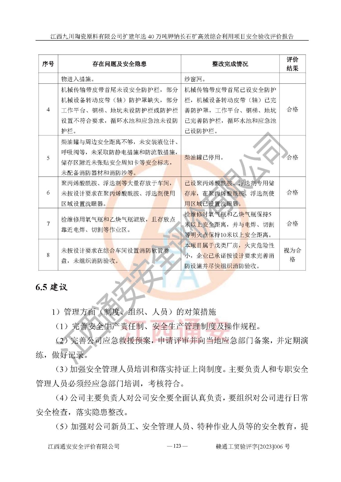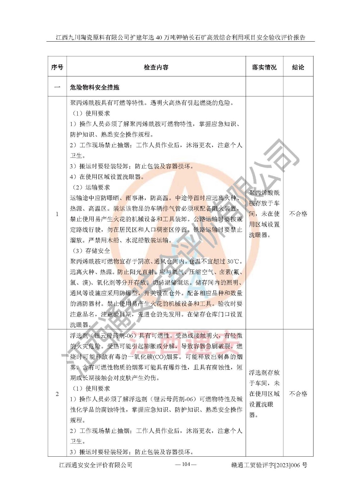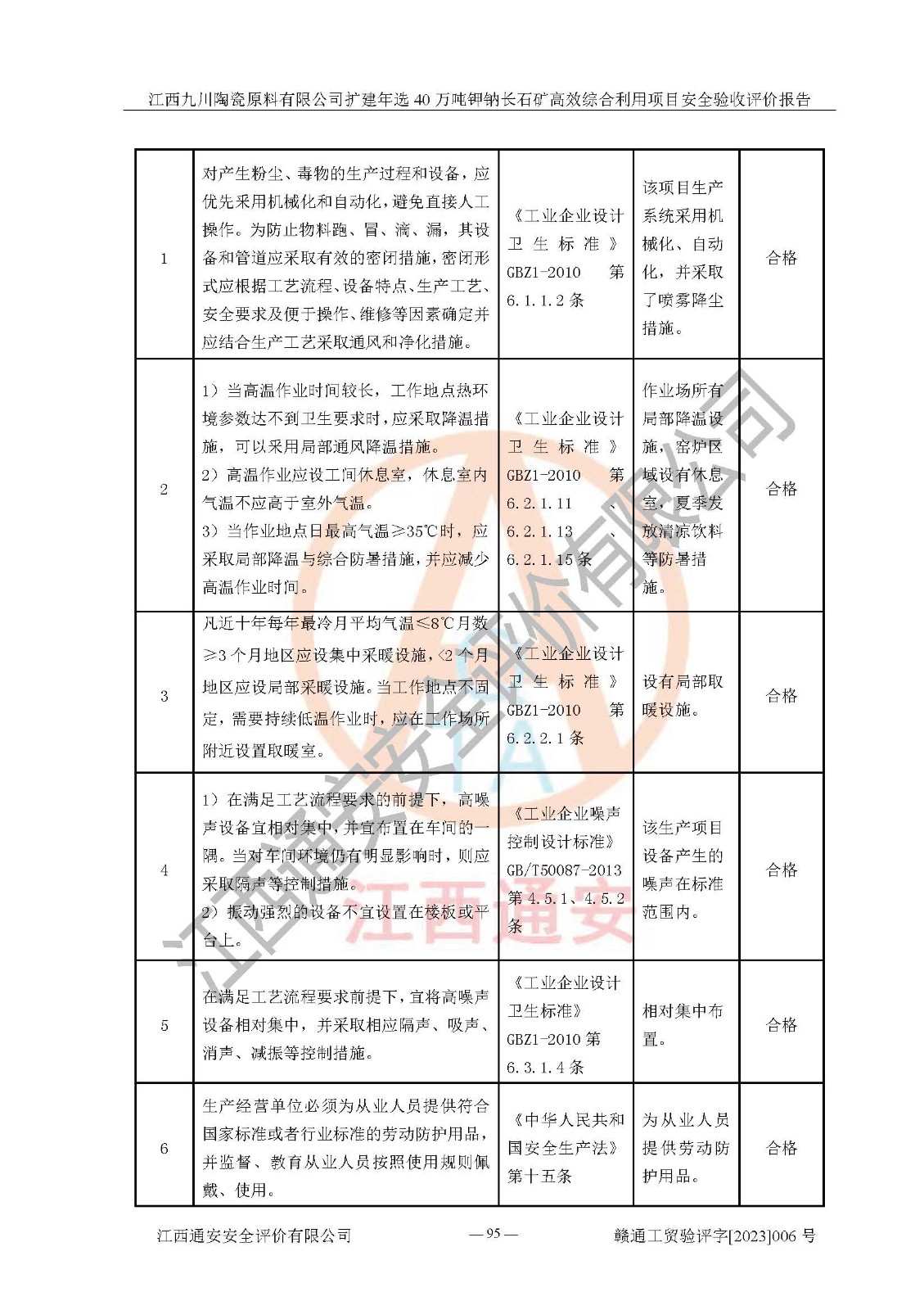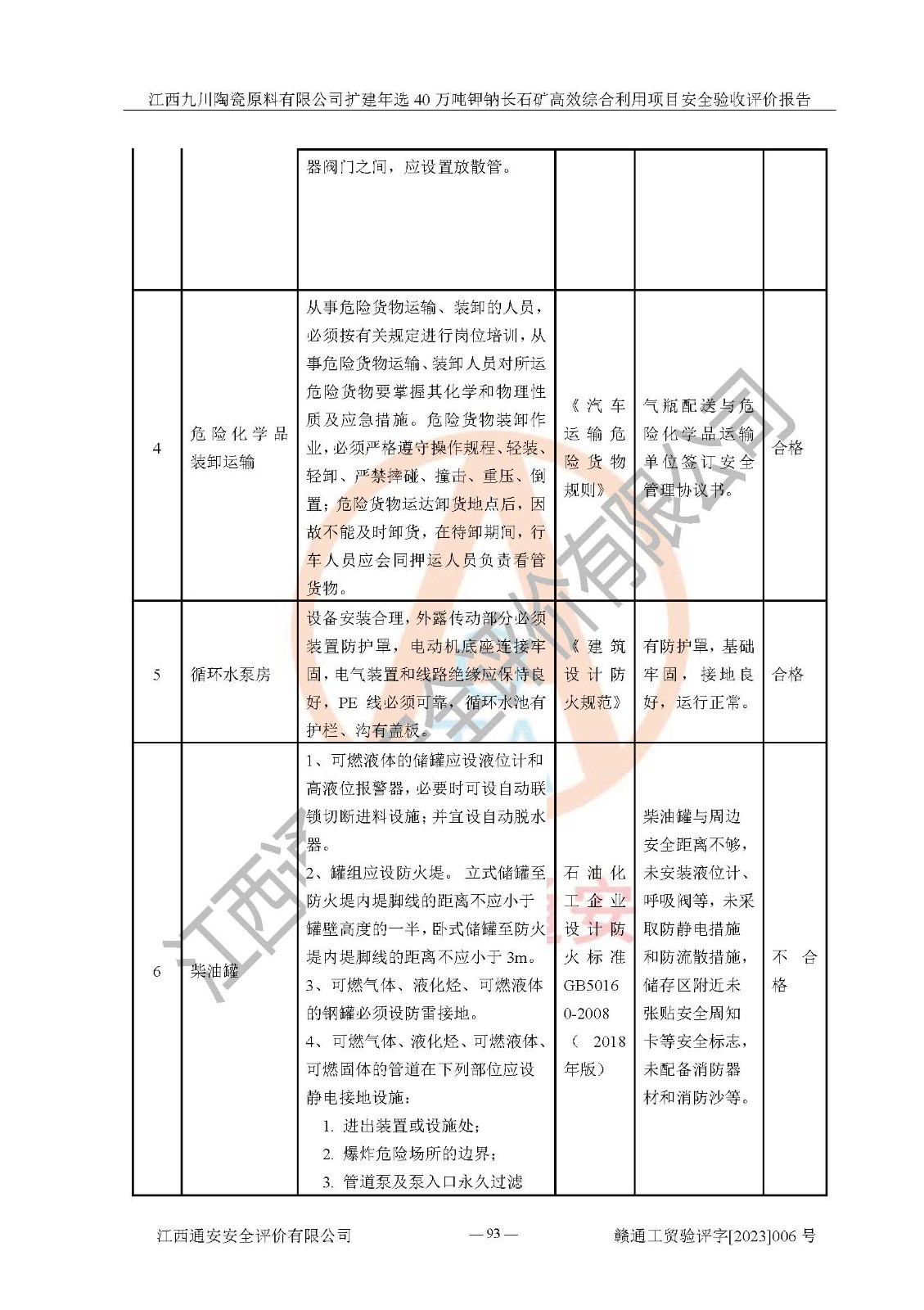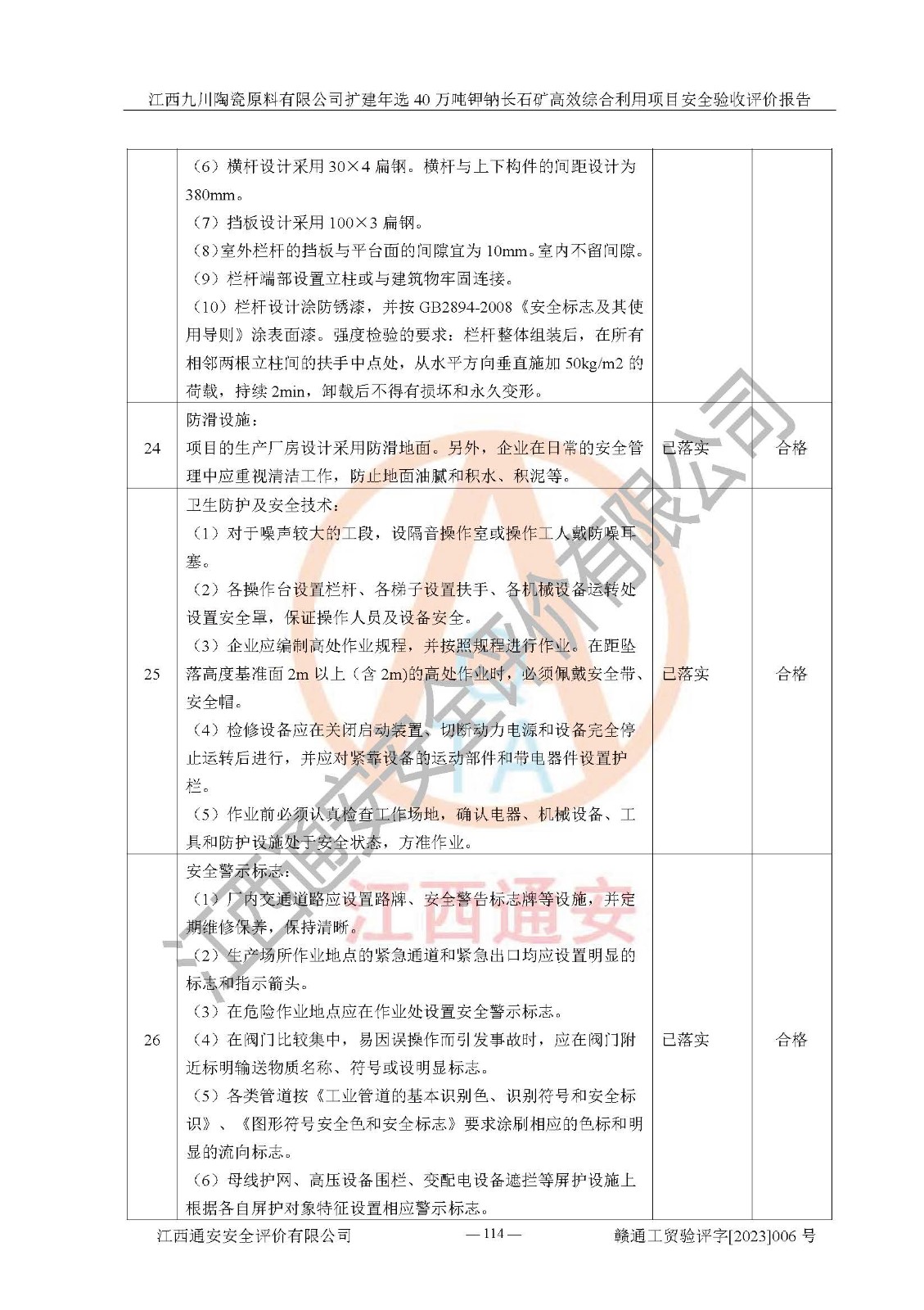 其它 | 根據(jù)《中華人民共和國安全生產(chǎn)法》、《新建項目安全設(shè)施“三同時”監(jiān)督管理辦法》(原**安全生產(chǎn)監(jiān)督管理總局令第77號修訂)等法律法規(guī)的要求,對江西九川陶瓷原料有限公司擴(kuò)建年選40萬噸鉀鈉長石礦**綜合利用項目安全驗收的基本條件進(jìn)行分析,結(jié)果如下: 1)本項目在初步設(shè)計及建設(shè)過程中基本能貫徹執(zhí)行**、地方及有關(guān)部門的安全生產(chǎn)法律法規(guī)、標(biāo)準(zhǔn)要求,取得了**相關(guān)部門的許可、備案。項目的設(shè)計、施工、監(jiān)理等單位均有相應(yīng)資質(zhì)。 2)本項目址選符合要求;總平面布置合理,主要建筑的防火間距符合符合《建筑設(shè)計防火規(guī)范(2018版)》(GB50016-2014)、《工業(yè)企業(yè)總平面設(shè)計規(guī)范》(GB50187-2012)有關(guān)規(guī)范、標(biāo)準(zhǔn)的要求。 3)本項目生產(chǎn)工藝成熟、試運行正常,試運行中過程中工藝和裝置、設(shè)備(設(shè)施)安全、可靠,未發(fā)生安全事故。 4)本項目的特種設(shè)備由有資質(zhì)單位設(shè)計、制造、安裝,特種設(shè)備經(jīng)宜春市特種設(shè)備檢驗中心檢驗合格,符合《中華人民共和國特種設(shè)備安全法》、《特種設(shè)備安全監(jiān)察條例》(中華人民共和國***令第549號)的規(guī)定。特種設(shè)備作業(yè)人員、特種作業(yè)人員均持證上崗。 5)企業(yè)主要負(fù)責(zé)人、安全管理人員均取得了江西省億源企業(yè)咨詢服務(wù)有限公司頒發(fā)的培訓(xùn)證書,特種作業(yè)人員操作證在**期內(nèi),其他從業(yè)人員經(jīng)安全培訓(xùn)符合,取得上崗證。 6)企業(yè)建立有安全管理制度,制定有各類人員的安全生產(chǎn)責(zé)任制、各項安全管理制度和操作規(guī)程。按照**有關(guān)規(guī)定編制了事故應(yīng)急救援預(yù)案并進(jìn)行了備案,并定期進(jìn)行演練等,符合要求。 7)本項目作業(yè)條件危險性分析結(jié)果:在選定的單元的危險程度均為“可能危險,需要注意”或“稍有危險,可以接受”,作業(yè)條件相對安全。 評價結(jié)論: 江西九川陶瓷原料有限公司擴(kuò)建年選40萬噸鉀鈉長石礦**綜合利用項目的安全設(shè)施及安全管理符合**及有關(guān)部門關(guān)于安全生產(chǎn)法律、法規(guī)、標(biāo)準(zhǔn)的要求,該項目試生產(chǎn)以來,工藝設(shè)備、安全設(shè)施及企業(yè)安全管理機(jī)制等運行正常,安全設(shè)施、措施達(dá)到設(shè)計要求和預(yù)期結(jié)果,可以滿足建設(shè)項目安全生產(chǎn)的要求,安全生產(chǎn)管理**,具備竣工驗收條件。 | ||||