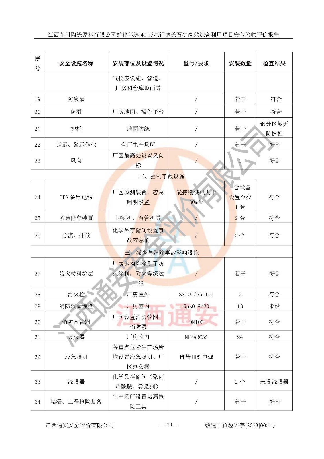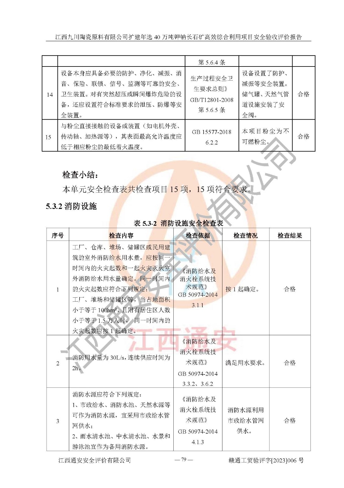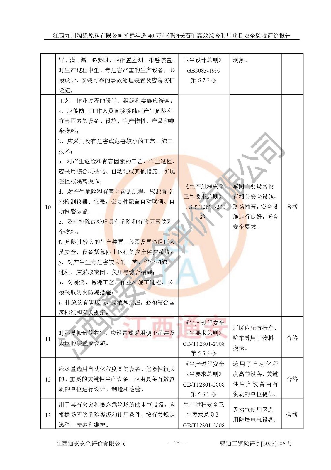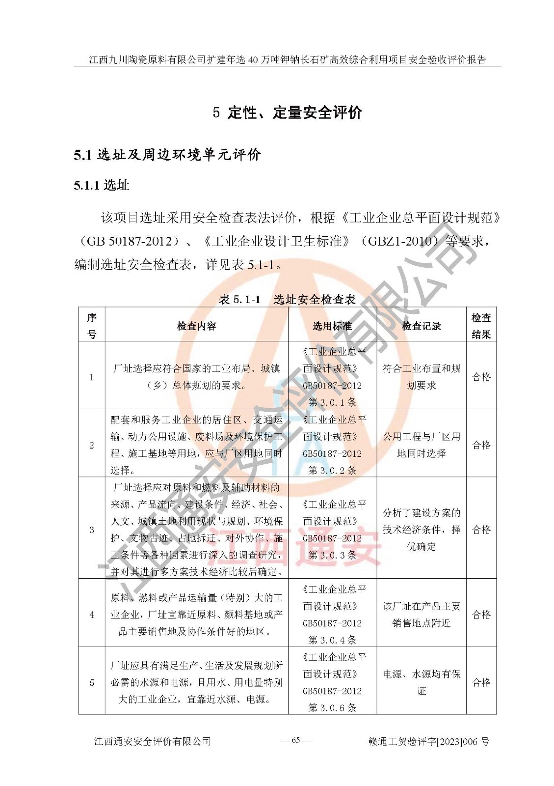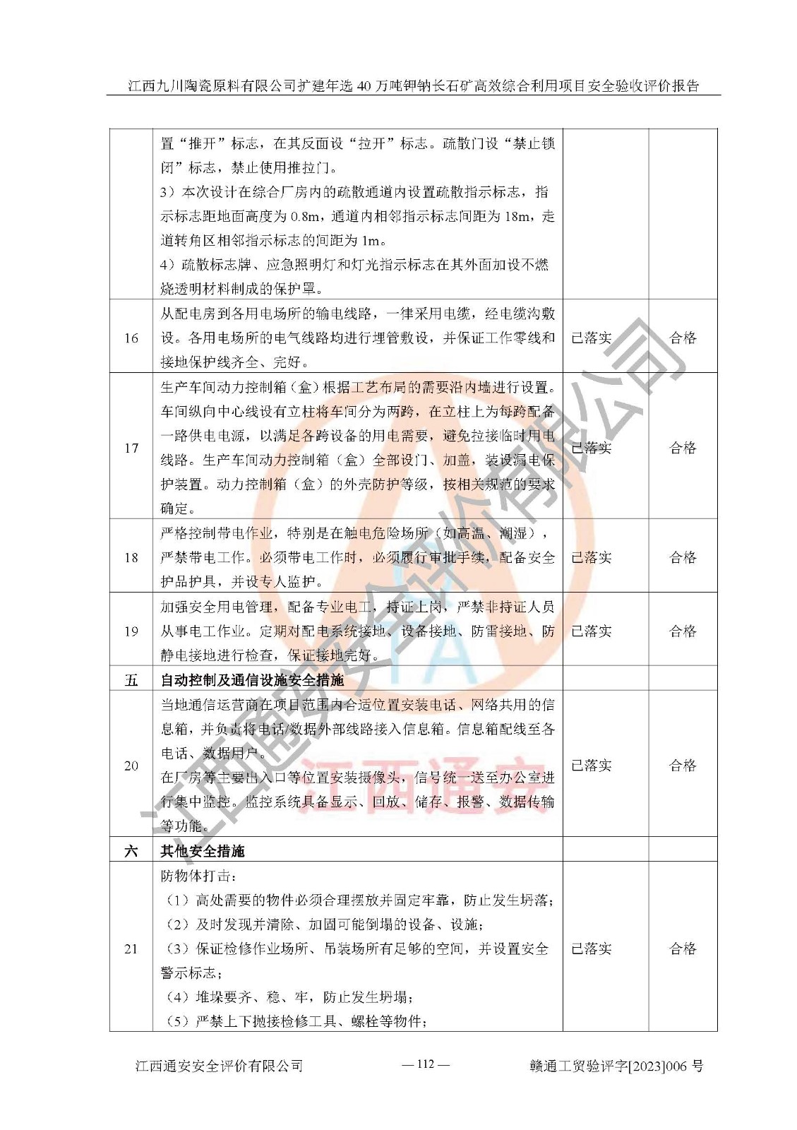 其它 | 根據(jù)《中華人民共和國安全生產(chǎn)法》、《新建項目安全設(shè)施“三同時”監(jiān)督管理辦法》(原**安全生產(chǎn)監(jiān)督管理總局令第77號修訂)等法律法規(guī)的要求,對江西九川陶瓷原料有限公司擴(kuò)建年選40萬噸鉀鈉長石礦**綜合利用項目安全驗收的基本條件進(jìn)行分析,結(jié)果如下: 1)本項目在初步設(shè)計及建設(shè)過程中基本能貫徹執(zhí)行**、地方及有關(guān)部門的安全生產(chǎn)法律法規(guī)、標(biāo)準(zhǔn)要求,取得了**相關(guān)部門的許可、備案。項目的設(shè)計、施工、監(jiān)理等單位均有相應(yīng)資質(zhì)。 2)本項目址選符合要求;總平面布置合理,主要建筑的防火間距符合符合《建筑設(shè)計防火規(guī)范(2018版)》(GB50016-2014)、《工業(yè)企業(yè)總平面設(shè)計規(guī)范》(GB50187-2012)有關(guān)規(guī)范、標(biāo)準(zhǔn)的要求。 3)本項目生產(chǎn)工藝成熟、試運行正常,試運行中過程中工藝和裝置、設(shè)備(設(shè)施)安全、可靠,未發(fā)生安全事故。 4)本項目的特種設(shè)備由有資質(zhì)單位設(shè)計、制造、安裝,特種設(shè)備經(jīng)宜春市特種設(shè)備檢驗中心檢驗合格,符合《中華人民共和國特種設(shè)備安全法》、《特種設(shè)備安全監(jiān)察條例》(中華人民共和國***令第549號)的規(guī)定。特種設(shè)備作業(yè)人員、特種作業(yè)人員均持證上崗。 5)企業(yè)主要負(fù)責(zé)人、安全管理人員均取得了江西省億源企業(yè)咨詢服務(wù)有限公司頒發(fā)的培訓(xùn)證書,特種作業(yè)人員操作證在**期內(nèi),其他從業(yè)人員經(jīng)安全培訓(xùn)符合,取得上崗證。 6)企業(yè)建立有安全管理制度,制定有各類人員的安全生產(chǎn)責(zé)任制、各項安全管理制度和操作規(guī)程。按照**有關(guān)規(guī)定編制了事故應(yīng)急救援預(yù)案并進(jìn)行了備案,并定期進(jìn)行演練等,符合要求。 7)本項目作業(yè)條件危險性分析結(jié)果:在選定的單元的危險程度均為“可能危險,需要注意”或“稍有危險,可以接受”,作業(yè)條件相對安全。 評價結(jié)論: 江西九川陶瓷原料有限公司擴(kuò)建年選40萬噸鉀鈉長石礦**綜合利用項目的安全設(shè)施及安全管理符合**及有關(guān)部門關(guān)于安全生產(chǎn)法律、法規(guī)、標(biāo)準(zhǔn)的要求,該項目試生產(chǎn)以來,工藝設(shè)備、安全設(shè)施及企業(yè)安全管理機(jī)制等運行正常,安全設(shè)施、措施達(dá)到設(shè)計要求和預(yù)期結(jié)果,可以滿足建設(shè)項目安全生產(chǎn)的要求,安全生產(chǎn)管理**,具備竣工驗收條件。 | ||||