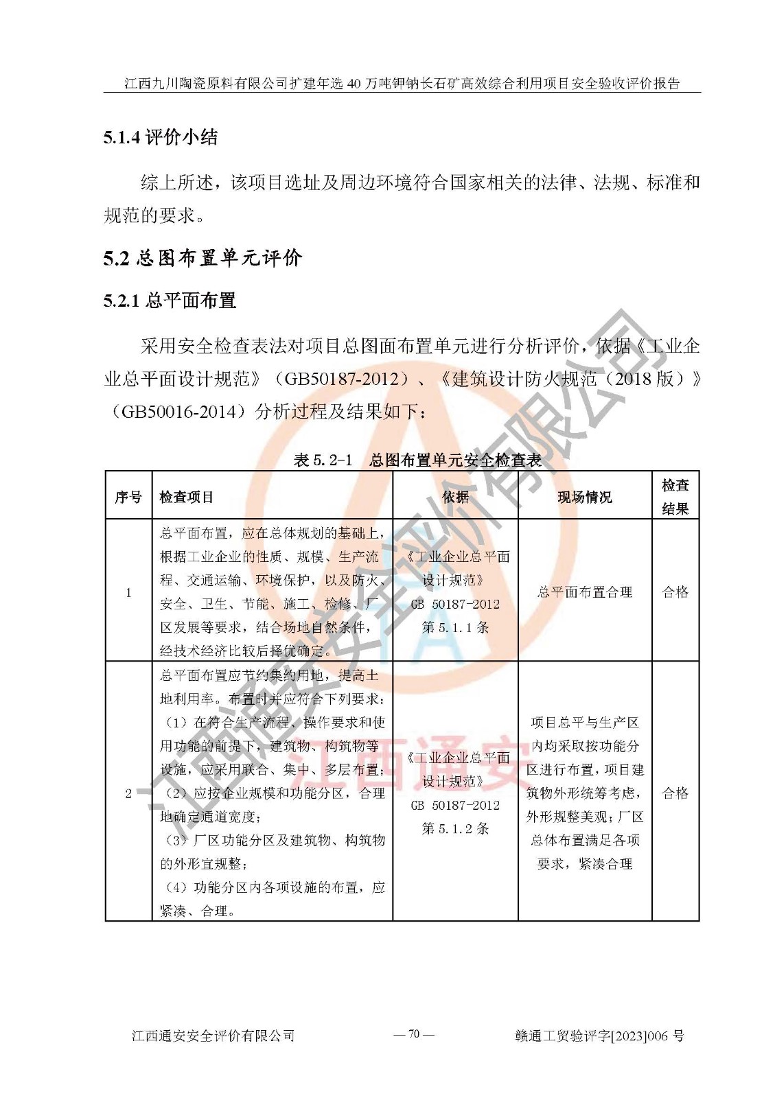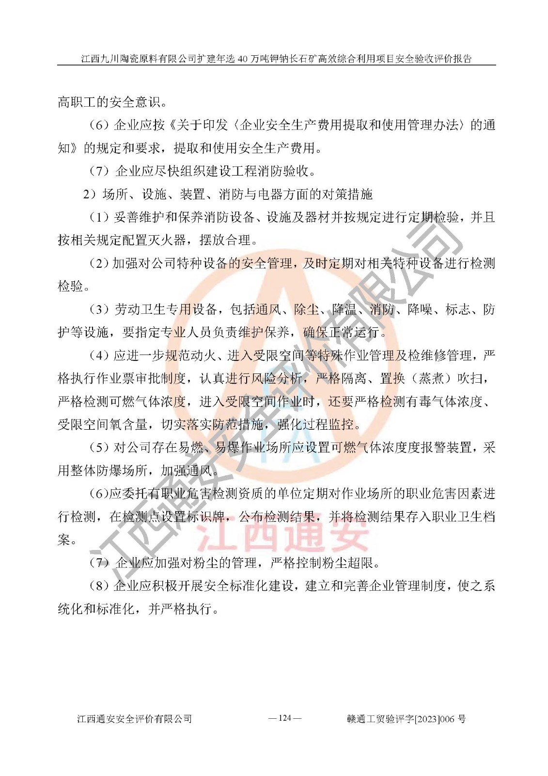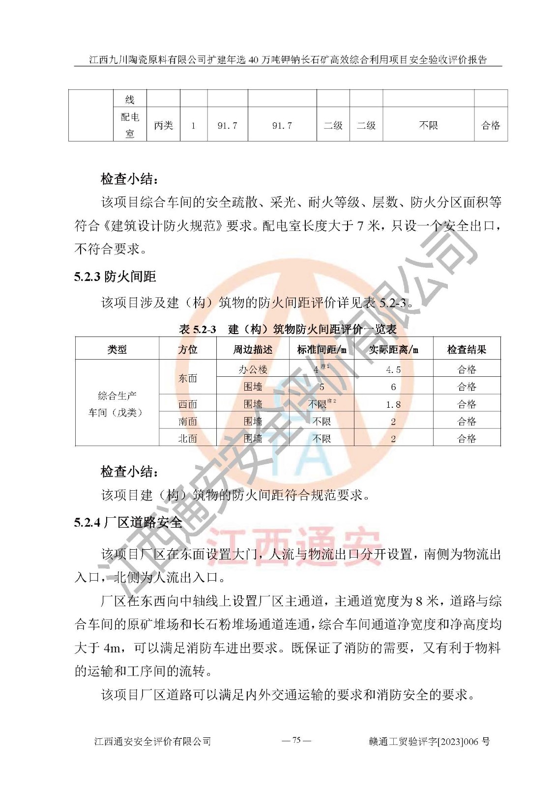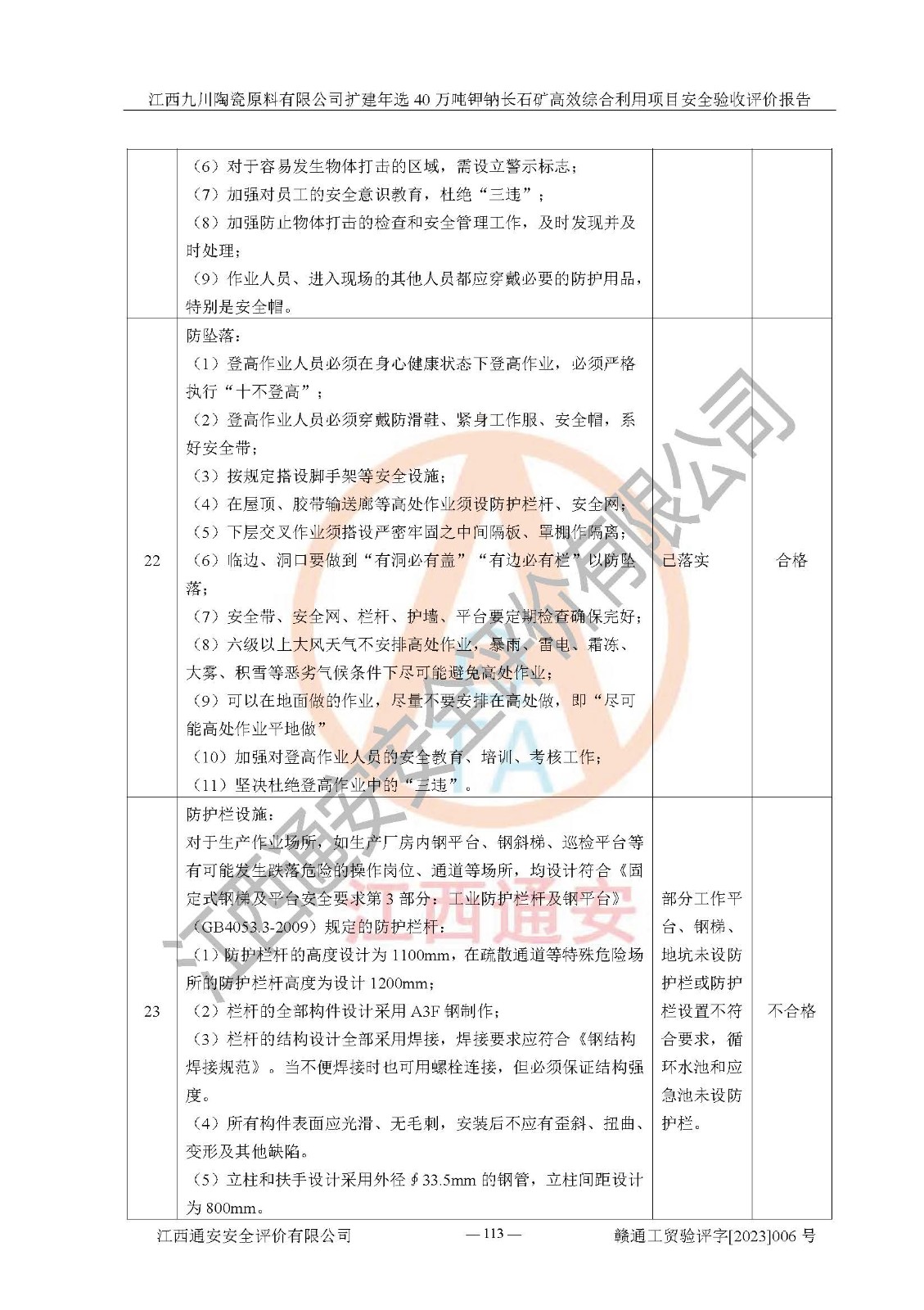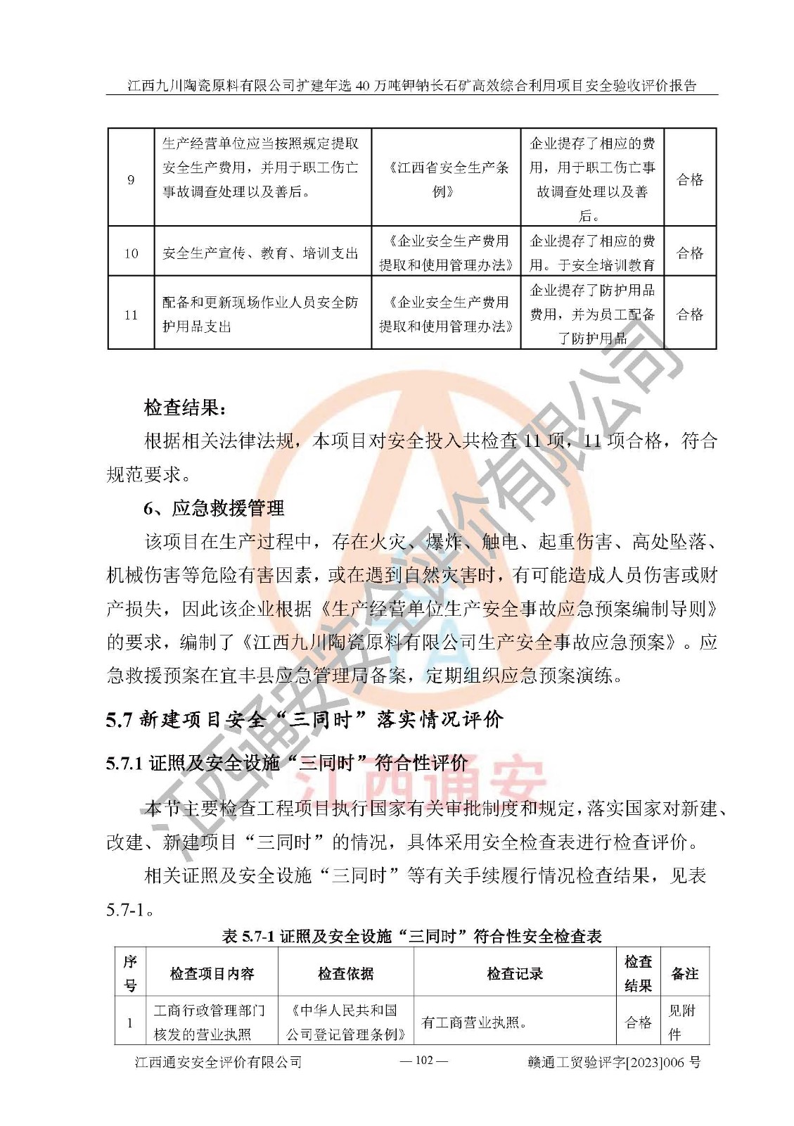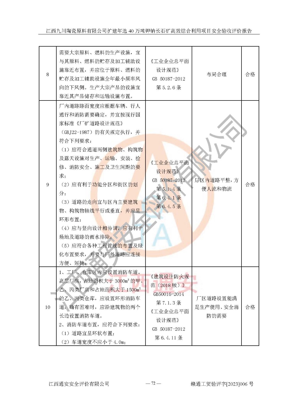 其它 | 根據(jù)《中華人民共和國安全生產(chǎn)法》、《新建項目安全設(shè)施“三同時”監(jiān)督管理辦法》(原**安全生產(chǎn)監(jiān)督管理總局令第77號修訂)等法律法規(guī)的要求,對江西九川陶瓷原料有限公司擴(kuò)建年選40萬噸鉀鈉長石礦**綜合利用項目安全驗收的基本條件進(jìn)行分析,結(jié)果如下: 1)本項目在初步設(shè)計及建設(shè)過程中基本能貫徹執(zhí)行**、地方及有關(guān)部門的安全生產(chǎn)法律法規(guī)、標(biāo)準(zhǔn)要求,取得了**相關(guān)部門的許可、備案。項目的設(shè)計、施工、監(jiān)理等單位均有相應(yīng)資質(zhì)。 2)本項目址選符合要求;總平面布置合理,主要建筑的防火間距符合符合《建筑設(shè)計防火規(guī)范(2018版)》(GB50016-2014)、《工業(yè)企業(yè)總平面設(shè)計規(guī)范》(GB50187-2012)有關(guān)規(guī)范、標(biāo)準(zhǔn)的要求。 3)本項目生產(chǎn)工藝成熟、試運行正常,試運行中過程中工藝和裝置、設(shè)備(設(shè)施)安全、可靠,未發(fā)生安全事故。 4)本項目的特種設(shè)備由有資質(zhì)單位設(shè)計、制造、安裝,特種設(shè)備經(jīng)宜春市特種設(shè)備檢驗中心檢驗合格,符合《中華人民共和國特種設(shè)備安全法》、《特種設(shè)備安全監(jiān)察條例》(中華人民共和國***令第549號)的規(guī)定。特種設(shè)備作業(yè)人員、特種作業(yè)人員均持證上崗。 5)企業(yè)主要負(fù)責(zé)人、安全管理人員均取得了江西省億源企業(yè)咨詢服務(wù)有限公司頒發(fā)的培訓(xùn)證書,特種作業(yè)人員操作證在**期內(nèi),其他從業(yè)人員經(jīng)安全培訓(xùn)符合,取得上崗證。 6)企業(yè)建立有安全管理制度,制定有各類人員的安全生產(chǎn)責(zé)任制、各項安全管理制度和操作規(guī)程。按照**有關(guān)規(guī)定編制了事故應(yīng)急救援預(yù)案并進(jìn)行了備案,并定期進(jìn)行演練等,符合要求。 7)本項目作業(yè)條件危險性分析結(jié)果:在選定的單元的危險程度均為“可能危險,需要注意”或“稍有危險,可以接受”,作業(yè)條件相對安全。 評價結(jié)論: 江西九川陶瓷原料有限公司擴(kuò)建年選40萬噸鉀鈉長石礦**綜合利用項目的安全設(shè)施及安全管理符合**及有關(guān)部門關(guān)于安全生產(chǎn)法律、法規(guī)、標(biāo)準(zhǔn)的要求,該項目試生產(chǎn)以來,工藝設(shè)備、安全設(shè)施及企業(yè)安全管理機(jī)制等運行正常,安全設(shè)施、措施達(dá)到設(shè)計要求和預(yù)期結(jié)果,可以滿足建設(shè)項目安全生產(chǎn)的要求,安全生產(chǎn)管理**,具備竣工驗收條件。 | ||||