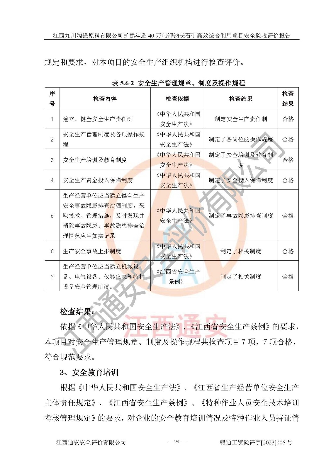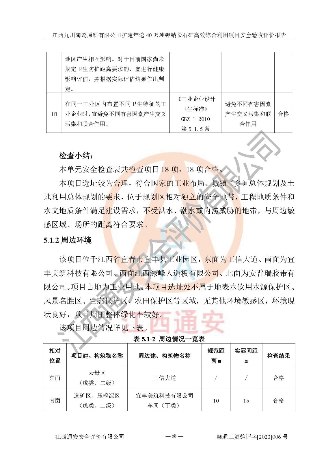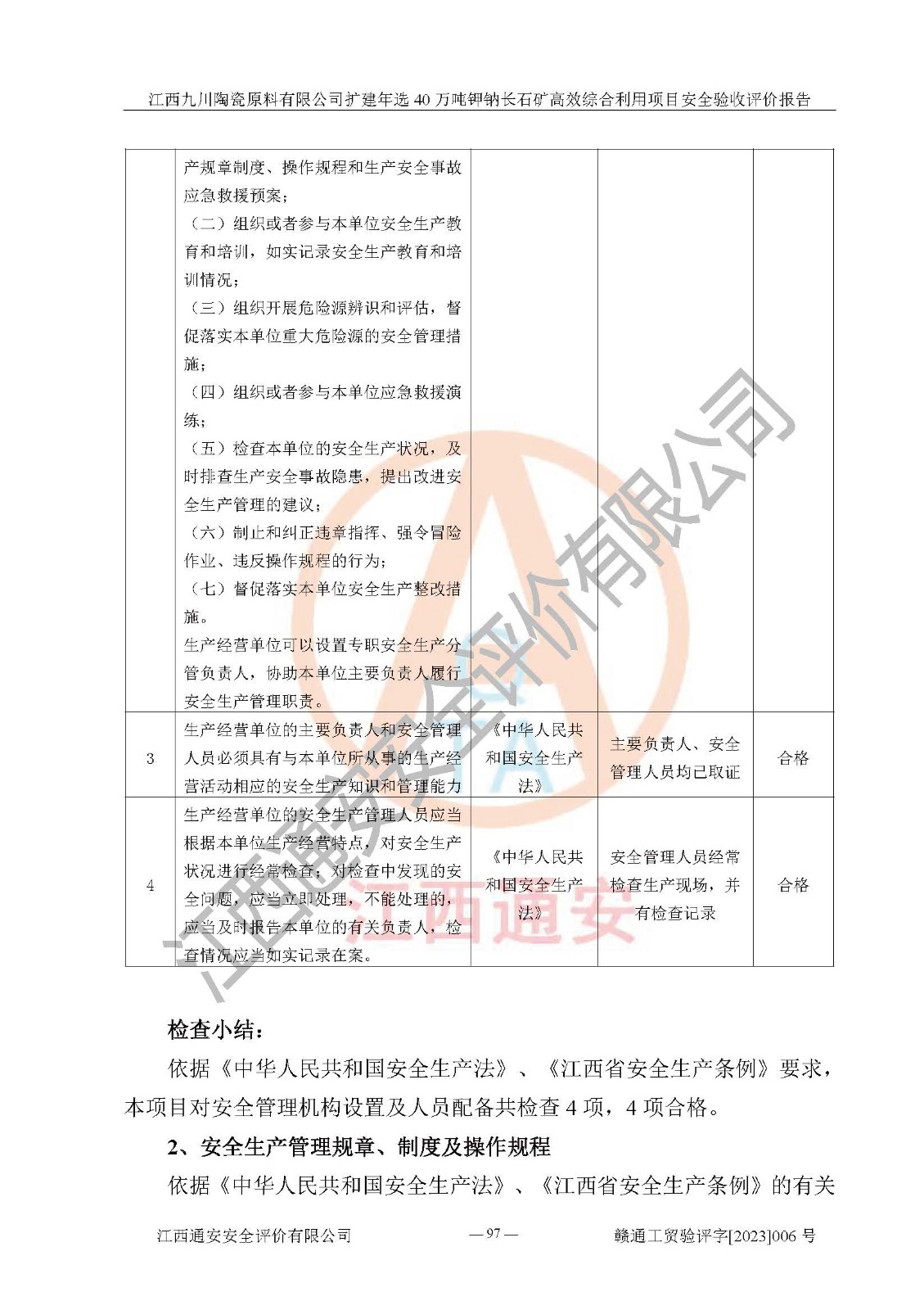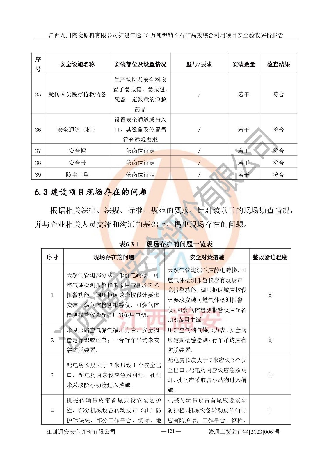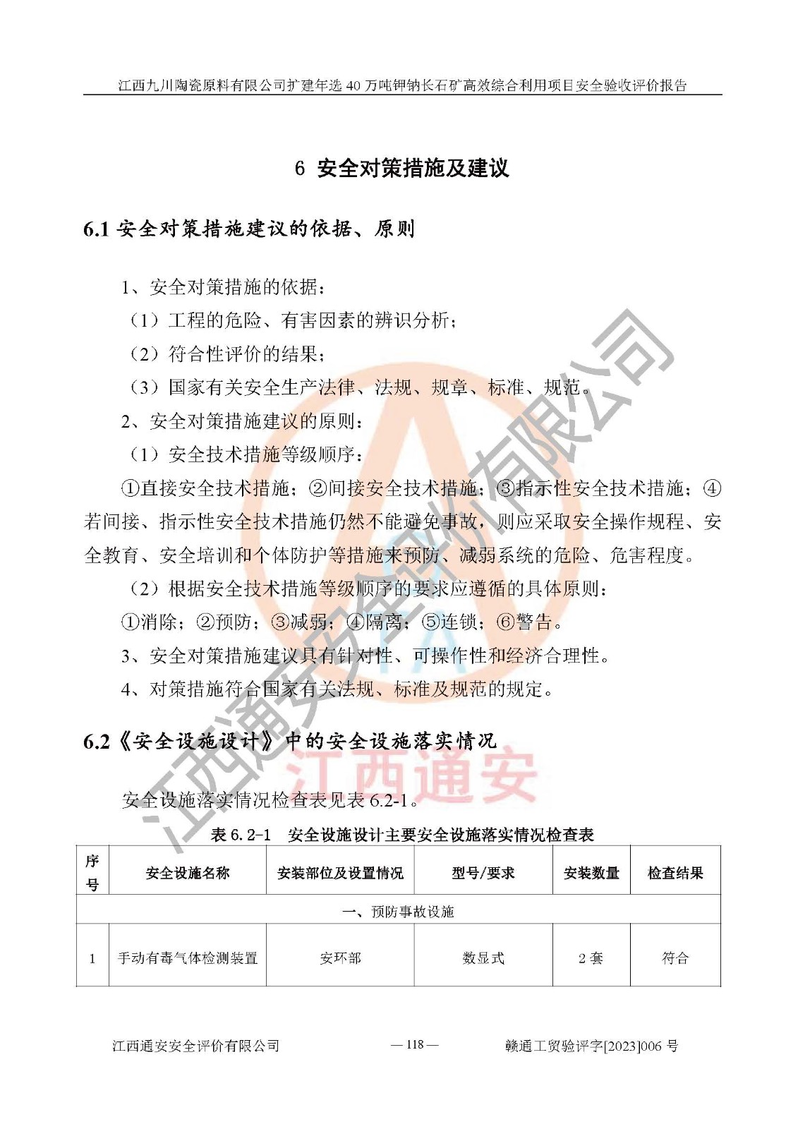 其它 | 根據(jù)《中華人民共和國安全生產(chǎn)法》、《新建項目安全設(shè)施“三同時”監(jiān)督管理辦法》(原**安全生產(chǎn)監(jiān)督管理總局令第77號修訂)等法律法規(guī)的要求,對江西九川陶瓷原料有限公司擴(kuò)建年選40萬噸鉀鈉長石礦**綜合利用項目安全驗收的基本條件進(jìn)行分析,結(jié)果如下: 1)本項目在初步設(shè)計及建設(shè)過程中基本能貫徹執(zhí)行**、地方及有關(guān)部門的安全生產(chǎn)法律法規(guī)、標(biāo)準(zhǔn)要求,取得了**相關(guān)部門的許可、備案。項目的設(shè)計、施工、監(jiān)理等單位均有相應(yīng)資質(zhì)。 2)本項目址選符合要求;總平面布置合理,主要建筑的防火間距符合符合《建筑設(shè)計防火規(guī)范(2018版)》(GB50016-2014)、《工業(yè)企業(yè)總平面設(shè)計規(guī)范》(GB50187-2012)有關(guān)規(guī)范、標(biāo)準(zhǔn)的要求。 3)本項目生產(chǎn)工藝成熟、試運行正常,試運行中過程中工藝和裝置、設(shè)備(設(shè)施)安全、可靠,未發(fā)生安全事故。 4)本項目的特種設(shè)備由有資質(zhì)單位設(shè)計、制造、安裝,特種設(shè)備經(jīng)宜春市特種設(shè)備檢驗中心檢驗合格,符合《中華人民共和國特種設(shè)備安全法》、《特種設(shè)備安全監(jiān)察條例》(中華人民共和國***令第549號)的規(guī)定。特種設(shè)備作業(yè)人員、特種作業(yè)人員均持證上崗。 5)企業(yè)主要負(fù)責(zé)人、安全管理人員均取得了江西省億源企業(yè)咨詢服務(wù)有限公司頒發(fā)的培訓(xùn)證書,特種作業(yè)人員操作證在**期內(nèi),其他從業(yè)人員經(jīng)安全培訓(xùn)符合,取得上崗證。 6)企業(yè)建立有安全管理制度,制定有各類人員的安全生產(chǎn)責(zé)任制、各項安全管理制度和操作規(guī)程。按照**有關(guān)規(guī)定編制了事故應(yīng)急救援預(yù)案并進(jìn)行了備案,并定期進(jìn)行演練等,符合要求。 7)本項目作業(yè)條件危險性分析結(jié)果:在選定的單元的危險程度均為“可能危險,需要注意”或“稍有危險,可以接受”,作業(yè)條件相對安全。 評價結(jié)論: 江西九川陶瓷原料有限公司擴(kuò)建年選40萬噸鉀鈉長石礦**綜合利用項目的安全設(shè)施及安全管理符合**及有關(guān)部門關(guān)于安全生產(chǎn)法律、法規(guī)、標(biāo)準(zhǔn)的要求,該項目試生產(chǎn)以來,工藝設(shè)備、安全設(shè)施及企業(yè)安全管理機(jī)制等運行正常,安全設(shè)施、措施達(dá)到設(shè)計要求和預(yù)期結(jié)果,可以滿足建設(shè)項目安全生產(chǎn)的要求,安全生產(chǎn)管理**,具備竣工驗收條件。 | ||||