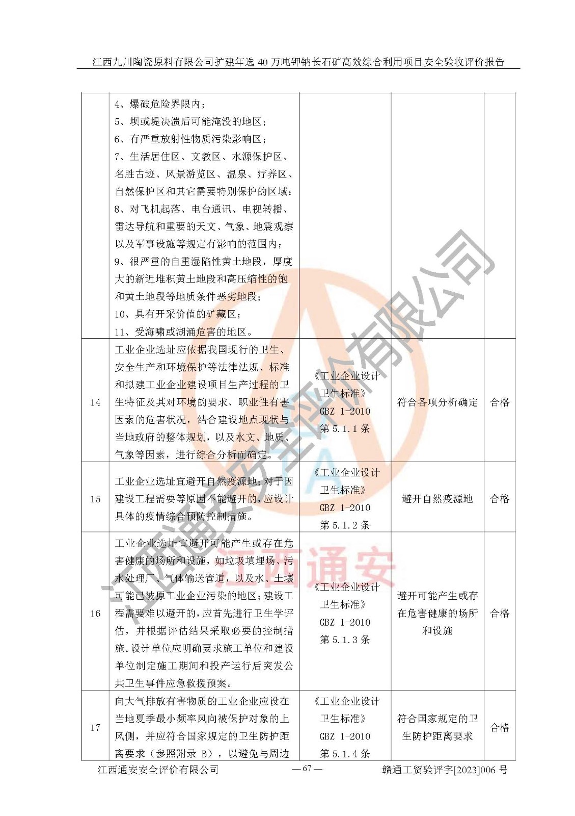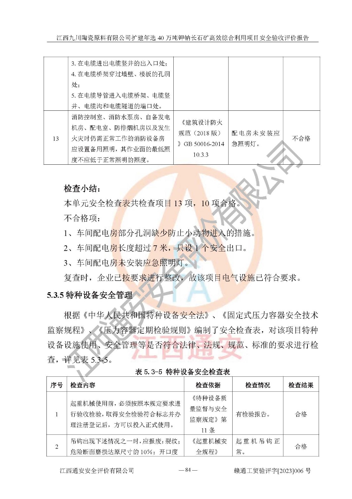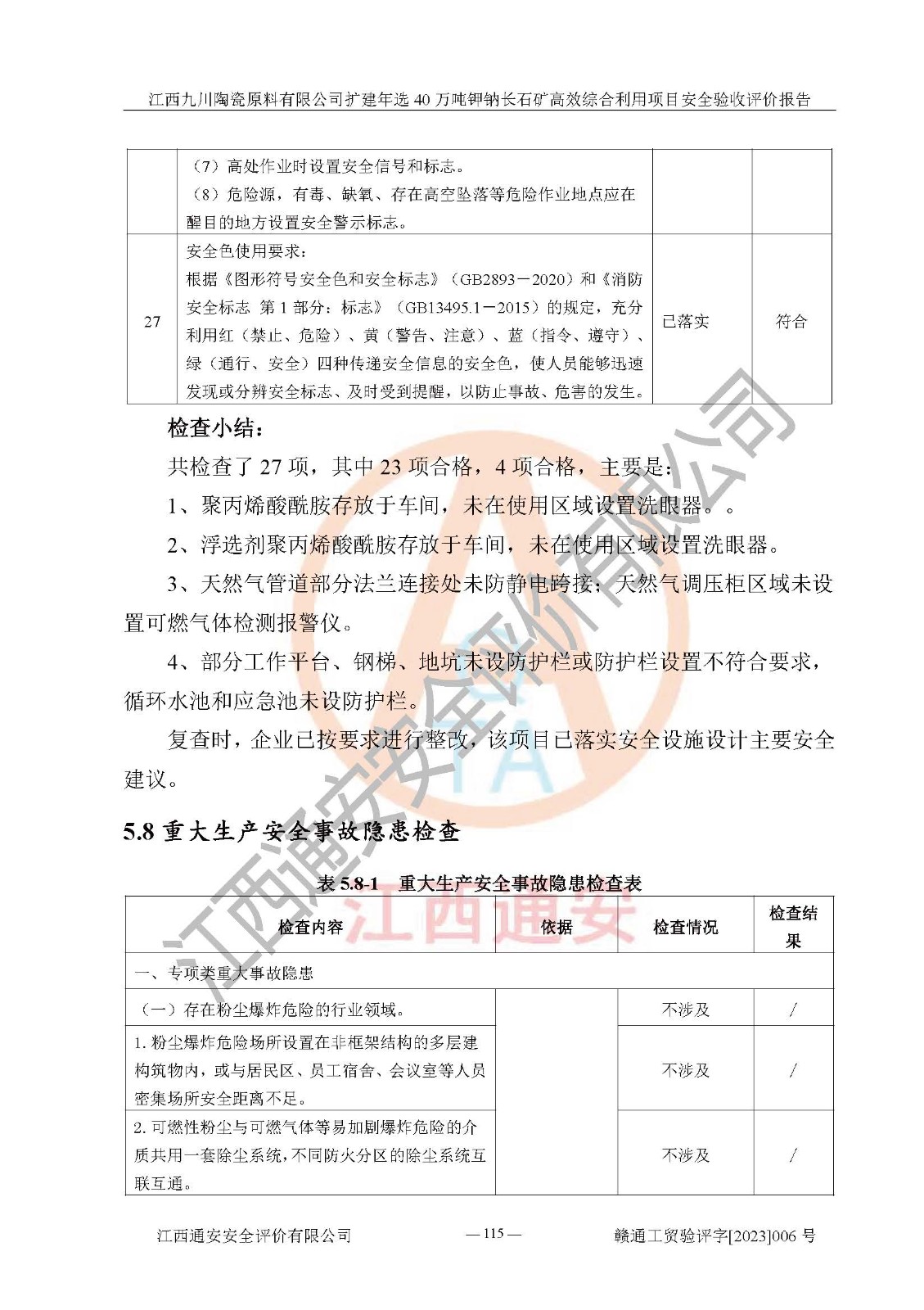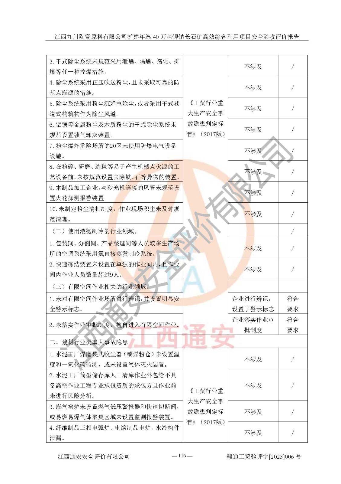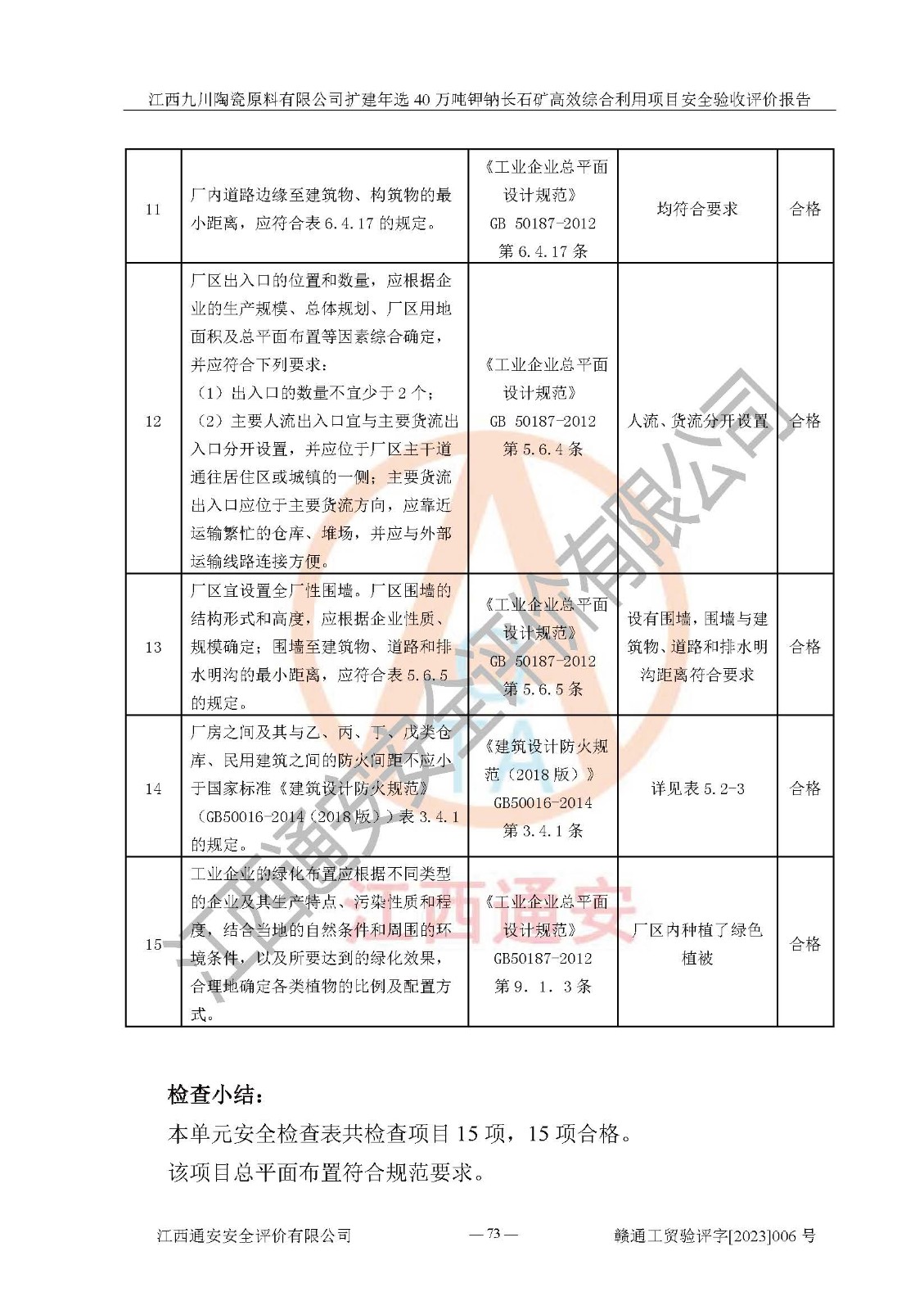 其它 | 根據(jù)《中華人民共和國安全生產(chǎn)法》、《新建項目安全設(shè)施“三同時”監(jiān)督管理辦法》(原**安全生產(chǎn)監(jiān)督管理總局令第77號修訂)等法律法規(guī)的要求,對江西九川陶瓷原料有限公司擴(kuò)建年選40萬噸鉀鈉長石礦**綜合利用項目安全驗收的基本條件進(jìn)行分析,結(jié)果如下: 1)本項目在初步設(shè)計及建設(shè)過程中基本能貫徹執(zhí)行**、地方及有關(guān)部門的安全生產(chǎn)法律法規(guī)、標(biāo)準(zhǔn)要求,取得了**相關(guān)部門的許可、備案。項目的設(shè)計、施工、監(jiān)理等單位均有相應(yīng)資質(zhì)。 2)本項目址選符合要求;總平面布置合理,主要建筑的防火間距符合符合《建筑設(shè)計防火規(guī)范(2018版)》(GB50016-2014)、《工業(yè)企業(yè)總平面設(shè)計規(guī)范》(GB50187-2012)有關(guān)規(guī)范、標(biāo)準(zhǔn)的要求。 3)本項目生產(chǎn)工藝成熟、試運行正常,試運行中過程中工藝和裝置、設(shè)備(設(shè)施)安全、可靠,未發(fā)生安全事故。 4)本項目的特種設(shè)備由有資質(zhì)單位設(shè)計、制造、安裝,特種設(shè)備經(jīng)宜春市特種設(shè)備檢驗中心檢驗合格,符合《中華人民共和國特種設(shè)備安全法》、《特種設(shè)備安全監(jiān)察條例》(中華人民共和國***令第549號)的規(guī)定。特種設(shè)備作業(yè)人員、特種作業(yè)人員均持證上崗。 5)企業(yè)主要負(fù)責(zé)人、安全管理人員均取得了江西省億源企業(yè)咨詢服務(wù)有限公司頒發(fā)的培訓(xùn)證書,特種作業(yè)人員操作證在**期內(nèi),其他從業(yè)人員經(jīng)安全培訓(xùn)符合,取得上崗證。 6)企業(yè)建立有安全管理制度,制定有各類人員的安全生產(chǎn)責(zé)任制、各項安全管理制度和操作規(guī)程。按照**有關(guān)規(guī)定編制了事故應(yīng)急救援預(yù)案并進(jìn)行了備案,并定期進(jìn)行演練等,符合要求。 7)本項目作業(yè)條件危險性分析結(jié)果:在選定的單元的危險程度均為“可能危險,需要注意”或“稍有危險,可以接受”,作業(yè)條件相對安全。 評價結(jié)論: 江西九川陶瓷原料有限公司擴(kuò)建年選40萬噸鉀鈉長石礦**綜合利用項目的安全設(shè)施及安全管理符合**及有關(guān)部門關(guān)于安全生產(chǎn)法律、法規(guī)、標(biāo)準(zhǔn)的要求,該項目試生產(chǎn)以來,工藝設(shè)備、安全設(shè)施及企業(yè)安全管理機(jī)制等運行正常,安全設(shè)施、措施達(dá)到設(shè)計要求和預(yù)期結(jié)果,可以滿足建設(shè)項目安全生產(chǎn)的要求,安全生產(chǎn)管理**,具備竣工驗收條件。 | ||||