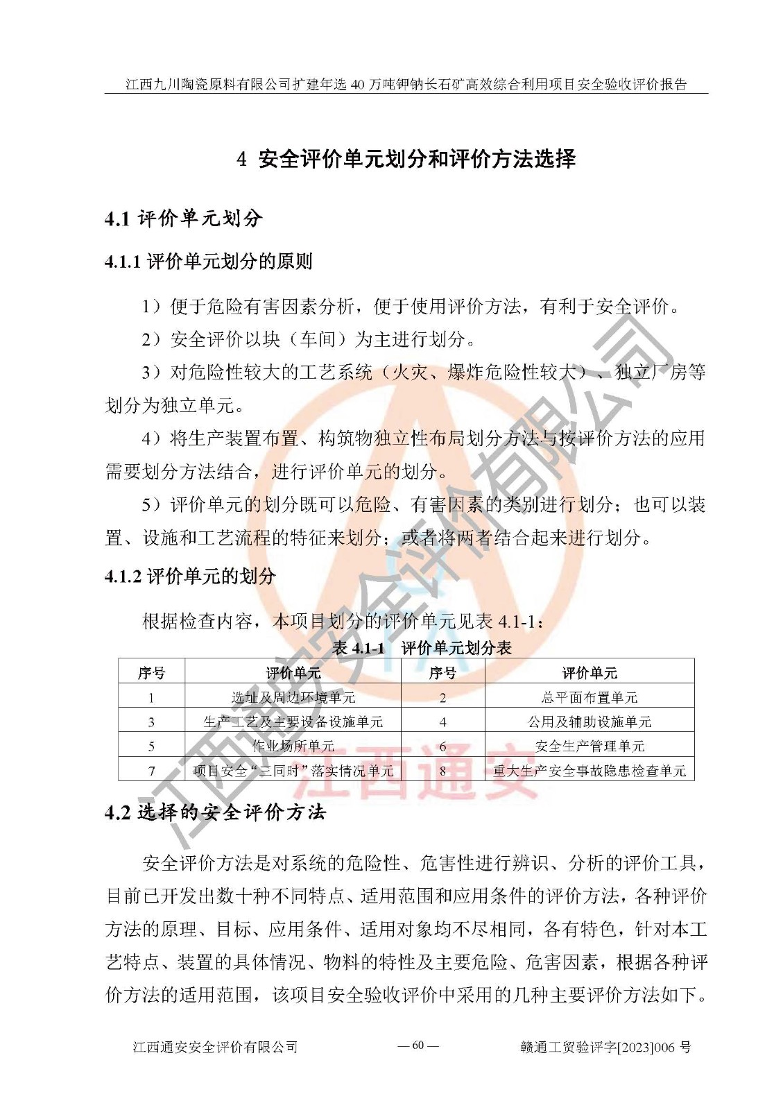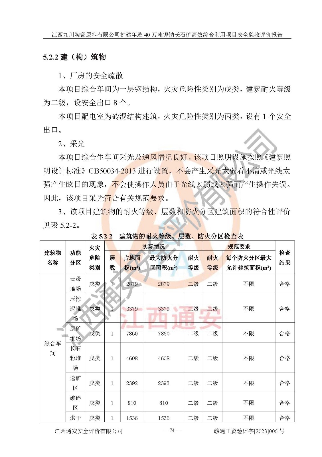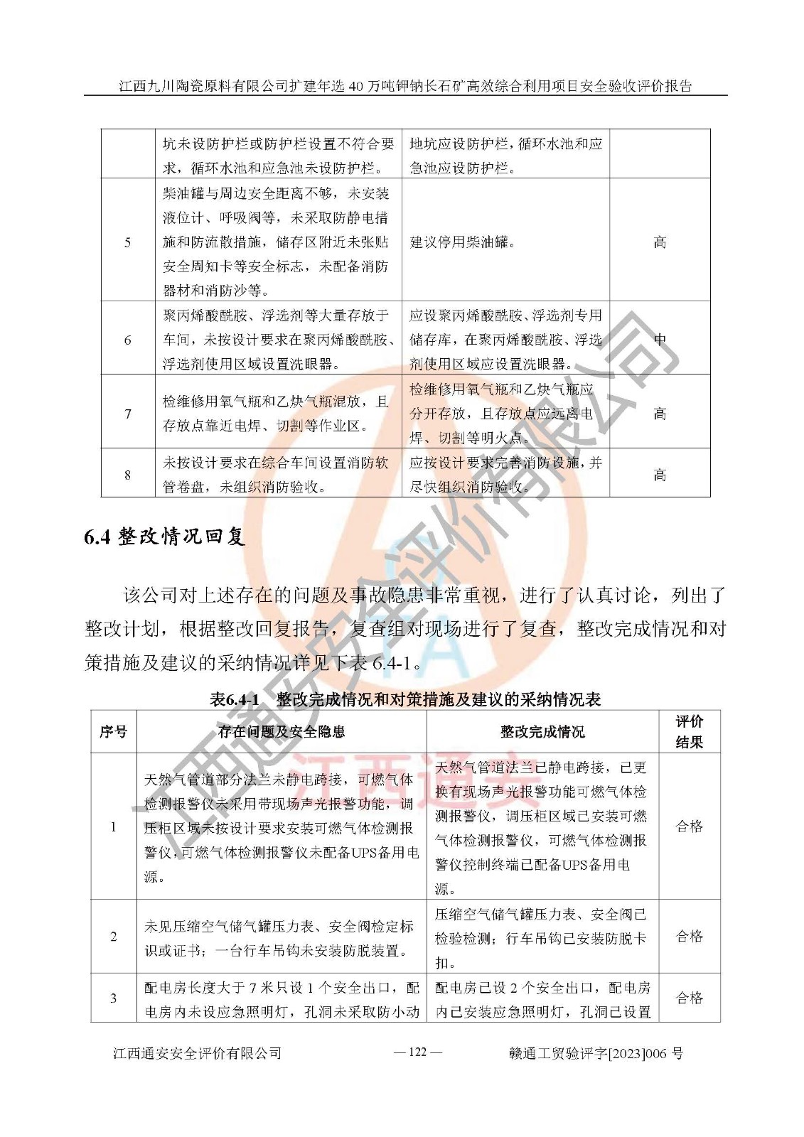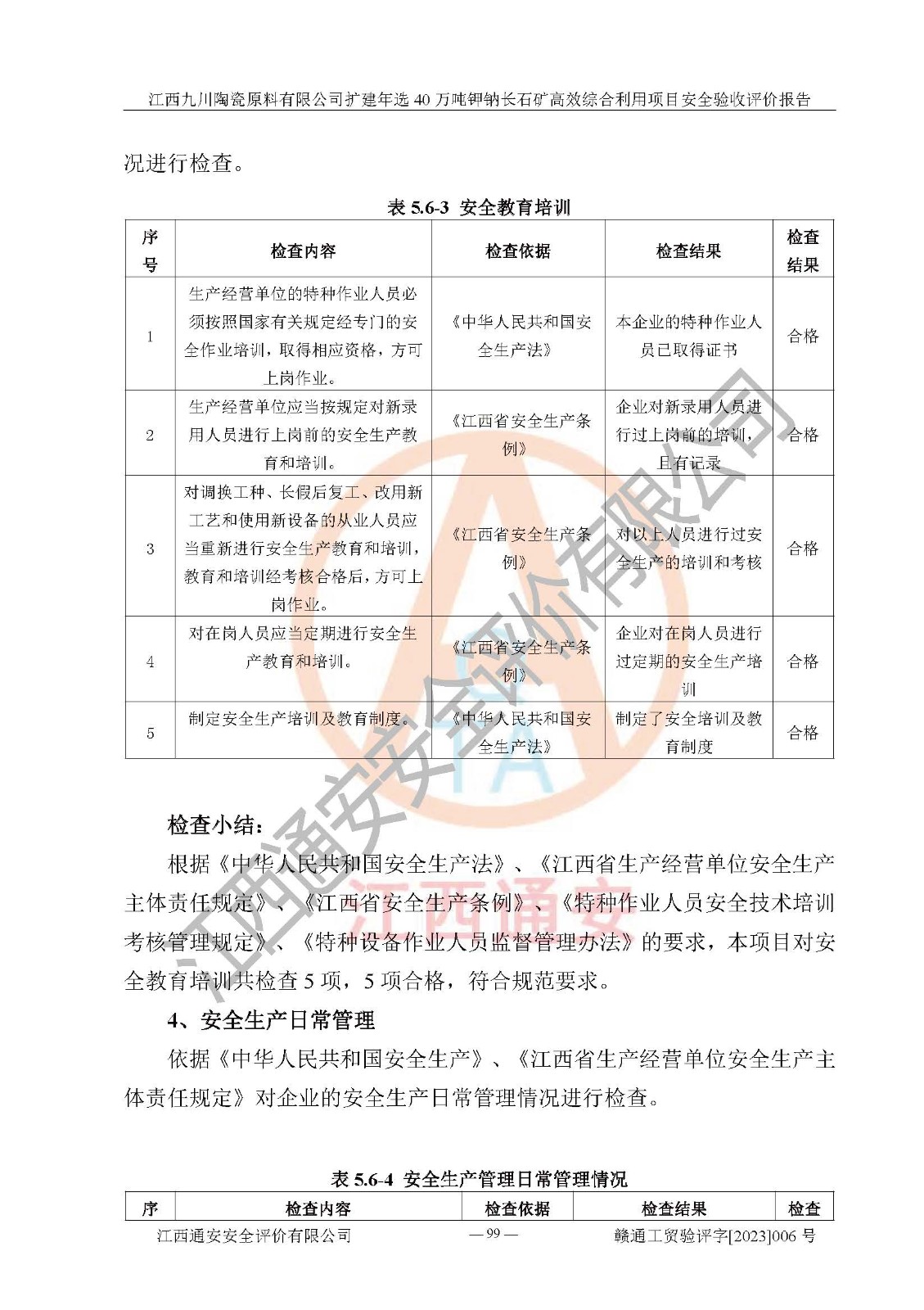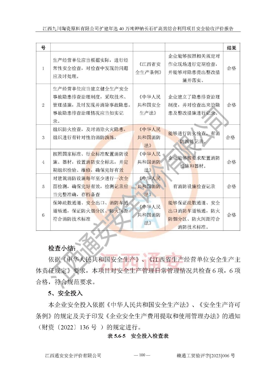 其它 | 根據(jù)《中華人民共和國安全生產(chǎn)法》、《新建項目安全設(shè)施“三同時”監(jiān)督管理辦法》(原**安全生產(chǎn)監(jiān)督管理總局令第77號修訂)等法律法規(guī)的要求,對江西九川陶瓷原料有限公司擴(kuò)建年選40萬噸鉀鈉長石礦**綜合利用項目安全驗收的基本條件進(jìn)行分析,結(jié)果如下: 1)本項目在初步設(shè)計及建設(shè)過程中基本能貫徹執(zhí)行**、地方及有關(guān)部門的安全生產(chǎn)法律法規(guī)、標(biāo)準(zhǔn)要求,取得了**相關(guān)部門的許可、備案。項目的設(shè)計、施工、監(jiān)理等單位均有相應(yīng)資質(zhì)。 2)本項目址選符合要求;總平面布置合理,主要建筑的防火間距符合符合《建筑設(shè)計防火規(guī)范(2018版)》(GB50016-2014)、《工業(yè)企業(yè)總平面設(shè)計規(guī)范》(GB50187-2012)有關(guān)規(guī)范、標(biāo)準(zhǔn)的要求。 3)本項目生產(chǎn)工藝成熟、試運行正常,試運行中過程中工藝和裝置、設(shè)備(設(shè)施)安全、可靠,未發(fā)生安全事故。 4)本項目的特種設(shè)備由有資質(zhì)單位設(shè)計、制造、安裝,特種設(shè)備經(jīng)宜春市特種設(shè)備檢驗中心檢驗合格,符合《中華人民共和國特種設(shè)備安全法》、《特種設(shè)備安全監(jiān)察條例》(中華人民共和國***令第549號)的規(guī)定。特種設(shè)備作業(yè)人員、特種作業(yè)人員均持證上崗。 5)企業(yè)主要負(fù)責(zé)人、安全管理人員均取得了江西省億源企業(yè)咨詢服務(wù)有限公司頒發(fā)的培訓(xùn)證書,特種作業(yè)人員操作證在**期內(nèi),其他從業(yè)人員經(jīng)安全培訓(xùn)符合,取得上崗證。 6)企業(yè)建立有安全管理制度,制定有各類人員的安全生產(chǎn)責(zé)任制、各項安全管理制度和操作規(guī)程。按照**有關(guān)規(guī)定編制了事故應(yīng)急救援預(yù)案并進(jìn)行了備案,并定期進(jìn)行演練等,符合要求。 7)本項目作業(yè)條件危險性分析結(jié)果:在選定的單元的危險程度均為“可能危險,需要注意”或“稍有危險,可以接受”,作業(yè)條件相對安全。 評價結(jié)論: 江西九川陶瓷原料有限公司擴(kuò)建年選40萬噸鉀鈉長石礦**綜合利用項目的安全設(shè)施及安全管理符合**及有關(guān)部門關(guān)于安全生產(chǎn)法律、法規(guī)、標(biāo)準(zhǔn)的要求,該項目試生產(chǎn)以來,工藝設(shè)備、安全設(shè)施及企業(yè)安全管理機(jī)制等運行正常,安全設(shè)施、措施達(dá)到設(shè)計要求和預(yù)期結(jié)果,可以滿足建設(shè)項目安全生產(chǎn)的要求,安全生產(chǎn)管理**,具備竣工驗收條件。 | ||||