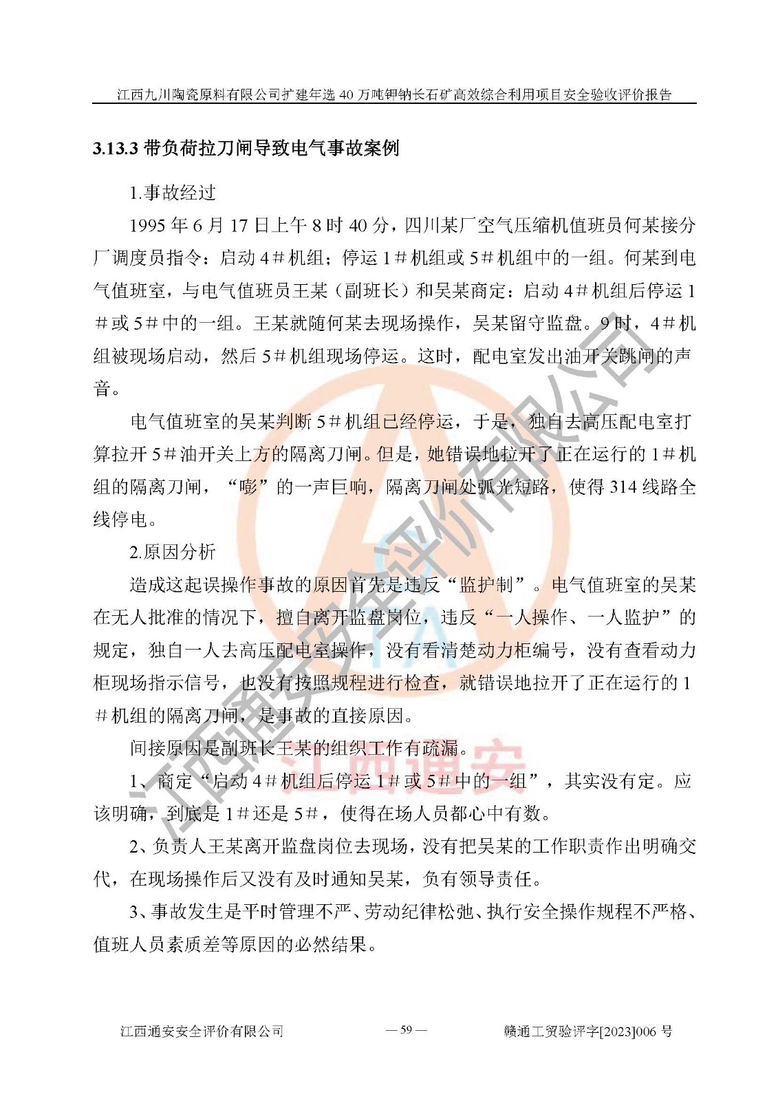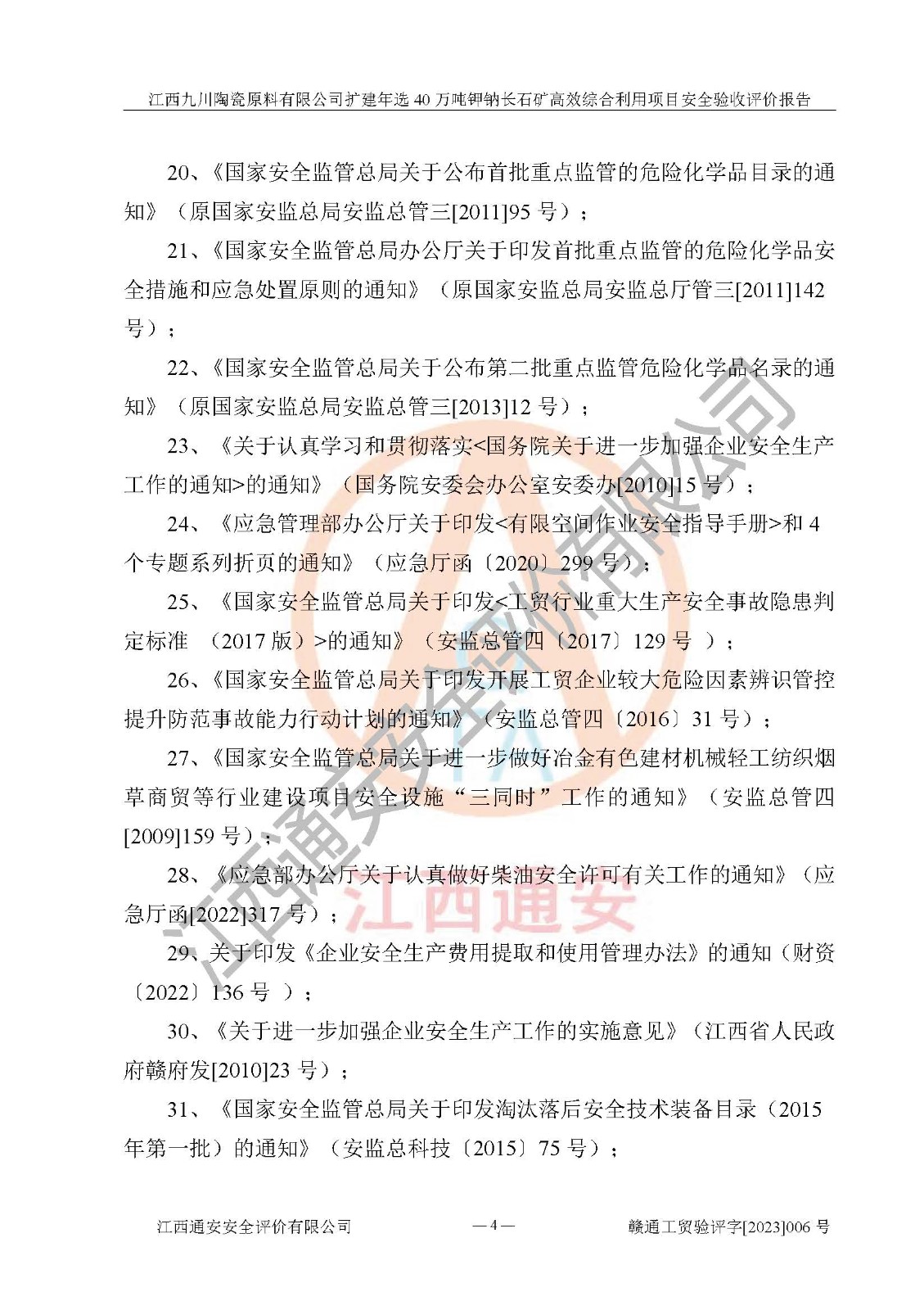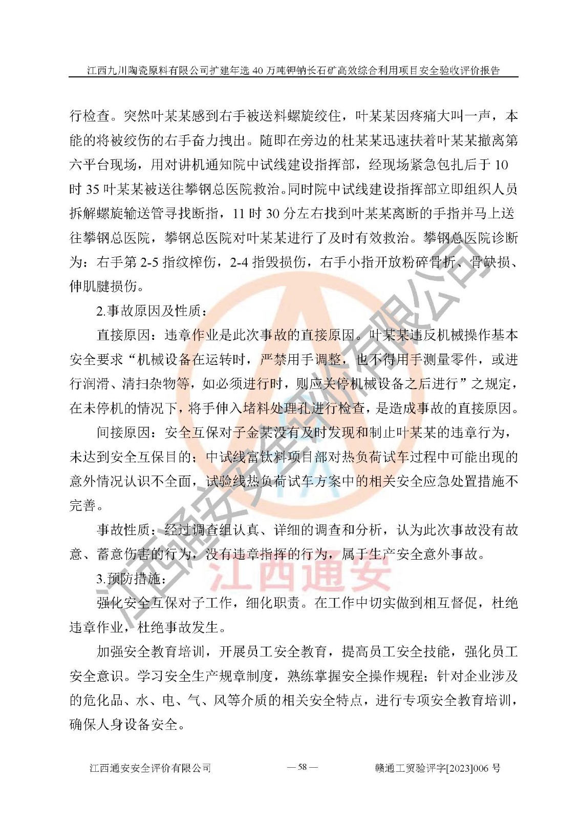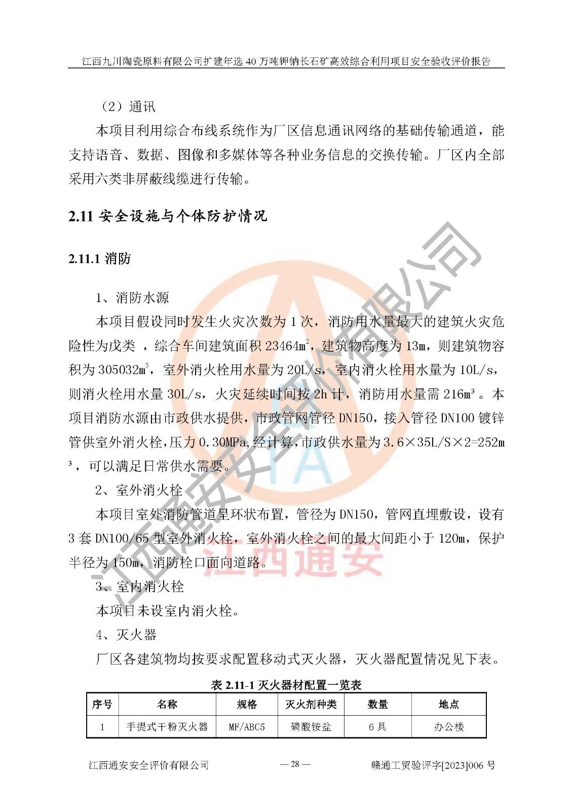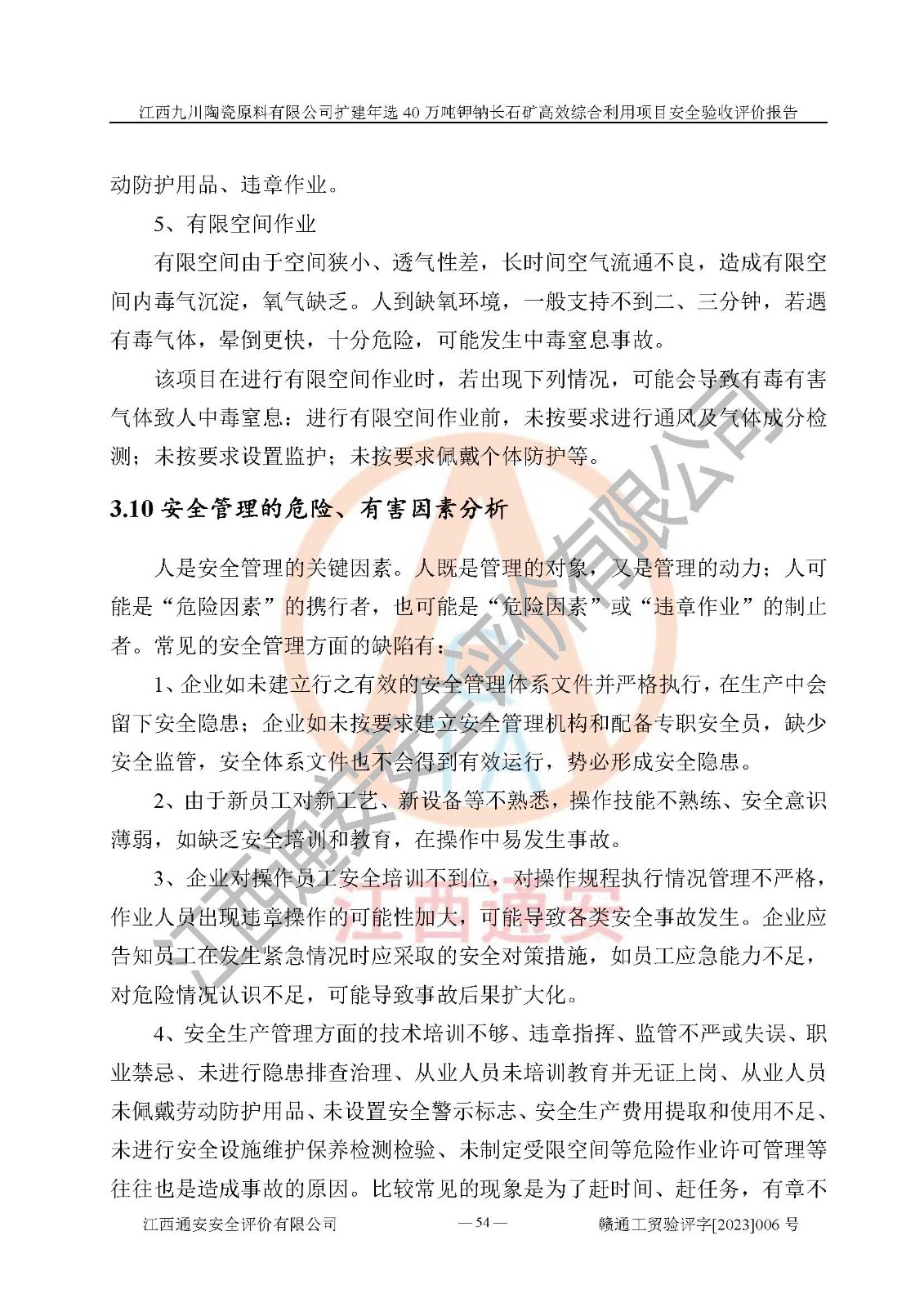 其它 | 根據(jù)《中華人民共和國安全生產(chǎn)法》、《新建項目安全設(shè)施“三同時”監(jiān)督管理辦法》(原**安全生產(chǎn)監(jiān)督管理總局令第77號修訂)等法律法規(guī)的要求,對江西九川陶瓷原料有限公司擴(kuò)建年選40萬噸鉀鈉長石礦**綜合利用項目安全驗收的基本條件進(jìn)行分析,結(jié)果如下: 1)本項目在初步設(shè)計及建設(shè)過程中基本能貫徹執(zhí)行**、地方及有關(guān)部門的安全生產(chǎn)法律法規(guī)、標(biāo)準(zhǔn)要求,取得了**相關(guān)部門的許可、備案。項目的設(shè)計、施工、監(jiān)理等單位均有相應(yīng)資質(zhì)。 2)本項目址選符合要求;總平面布置合理,主要建筑的防火間距符合符合《建筑設(shè)計防火規(guī)范(2018版)》(GB50016-2014)、《工業(yè)企業(yè)總平面設(shè)計規(guī)范》(GB50187-2012)有關(guān)規(guī)范、標(biāo)準(zhǔn)的要求。 3)本項目生產(chǎn)工藝成熟、試運行正常,試運行中過程中工藝和裝置、設(shè)備(設(shè)施)安全、可靠,未發(fā)生安全事故。 4)本項目的特種設(shè)備由有資質(zhì)單位設(shè)計、制造、安裝,特種設(shè)備經(jīng)宜春市特種設(shè)備檢驗中心檢驗合格,符合《中華人民共和國特種設(shè)備安全法》、《特種設(shè)備安全監(jiān)察條例》(中華人民共和國***令第549號)的規(guī)定。特種設(shè)備作業(yè)人員、特種作業(yè)人員均持證上崗。 5)企業(yè)主要負(fù)責(zé)人、安全管理人員均取得了江西省億源企業(yè)咨詢服務(wù)有限公司頒發(fā)的培訓(xùn)證書,特種作業(yè)人員操作證在**期內(nèi),其他從業(yè)人員經(jīng)安全培訓(xùn)符合,取得上崗證。 6)企業(yè)建立有安全管理制度,制定有各類人員的安全生產(chǎn)責(zé)任制、各項安全管理制度和操作規(guī)程。按照**有關(guān)規(guī)定編制了事故應(yīng)急救援預(yù)案并進(jìn)行了備案,并定期進(jìn)行演練等,符合要求。 7)本項目作業(yè)條件危險性分析結(jié)果:在選定的單元的危險程度均為“可能危險,需要注意”或“稍有危險,可以接受”,作業(yè)條件相對安全。 評價結(jié)論: 江西九川陶瓷原料有限公司擴(kuò)建年選40萬噸鉀鈉長石礦**綜合利用項目的安全設(shè)施及安全管理符合**及有關(guān)部門關(guān)于安全生產(chǎn)法律、法規(guī)、標(biāo)準(zhǔn)的要求,該項目試生產(chǎn)以來,工藝設(shè)備、安全設(shè)施及企業(yè)安全管理機(jī)制等運行正常,安全設(shè)施、措施達(dá)到設(shè)計要求和預(yù)期結(jié)果,可以滿足建設(shè)項目安全生產(chǎn)的要求,安全生產(chǎn)管理**,具備竣工驗收條件。 | ||||