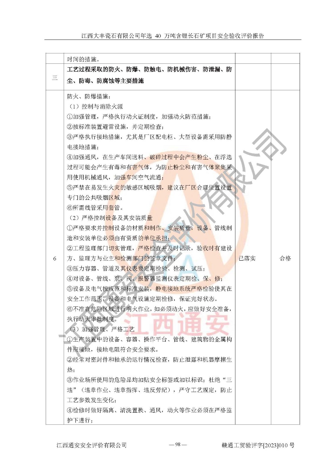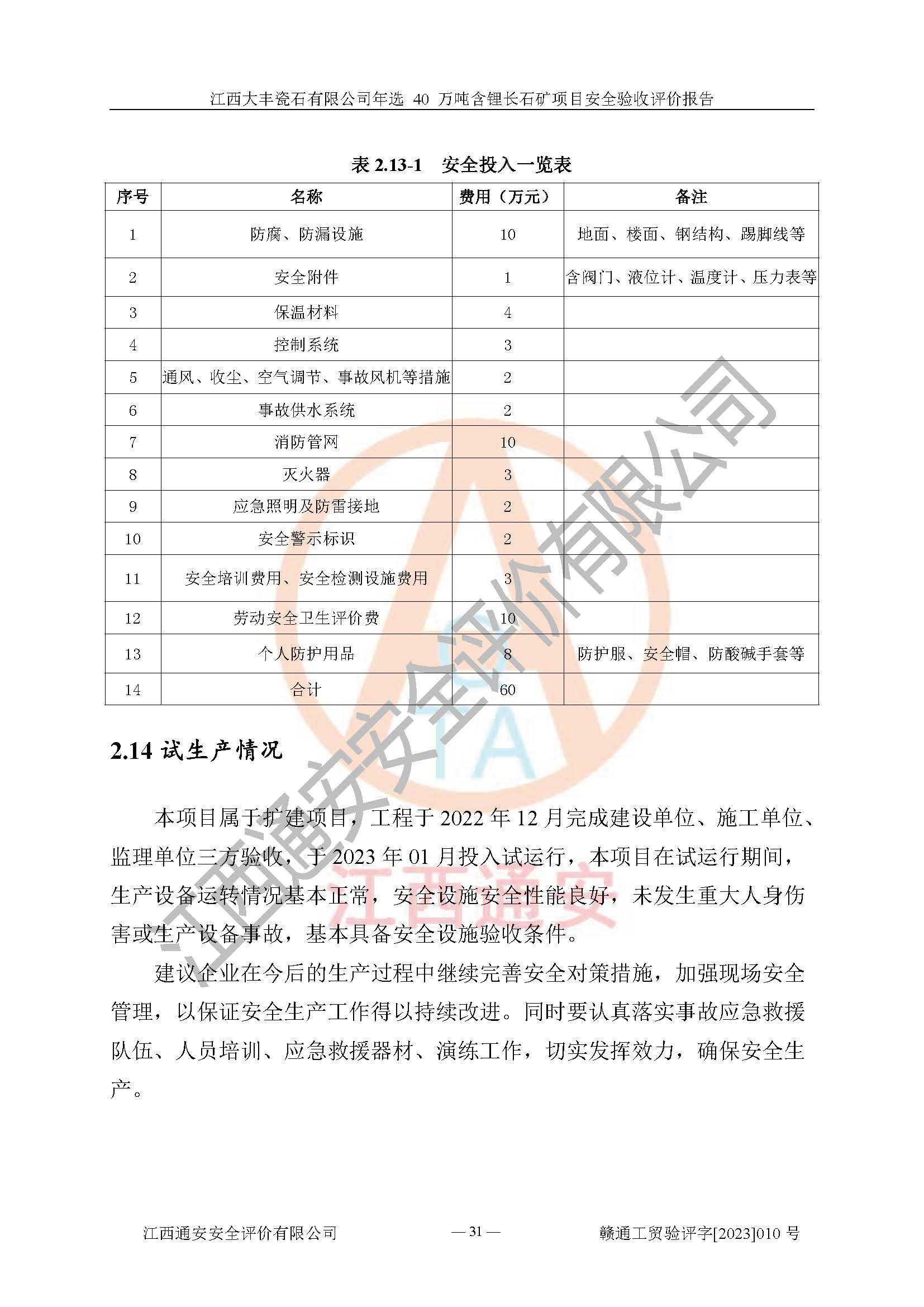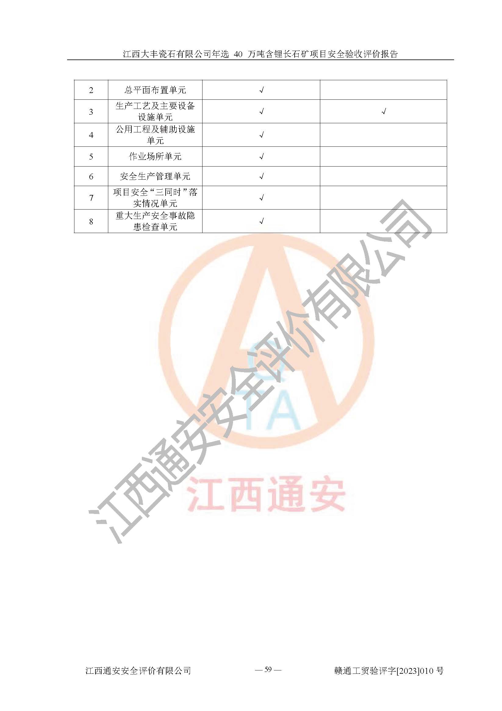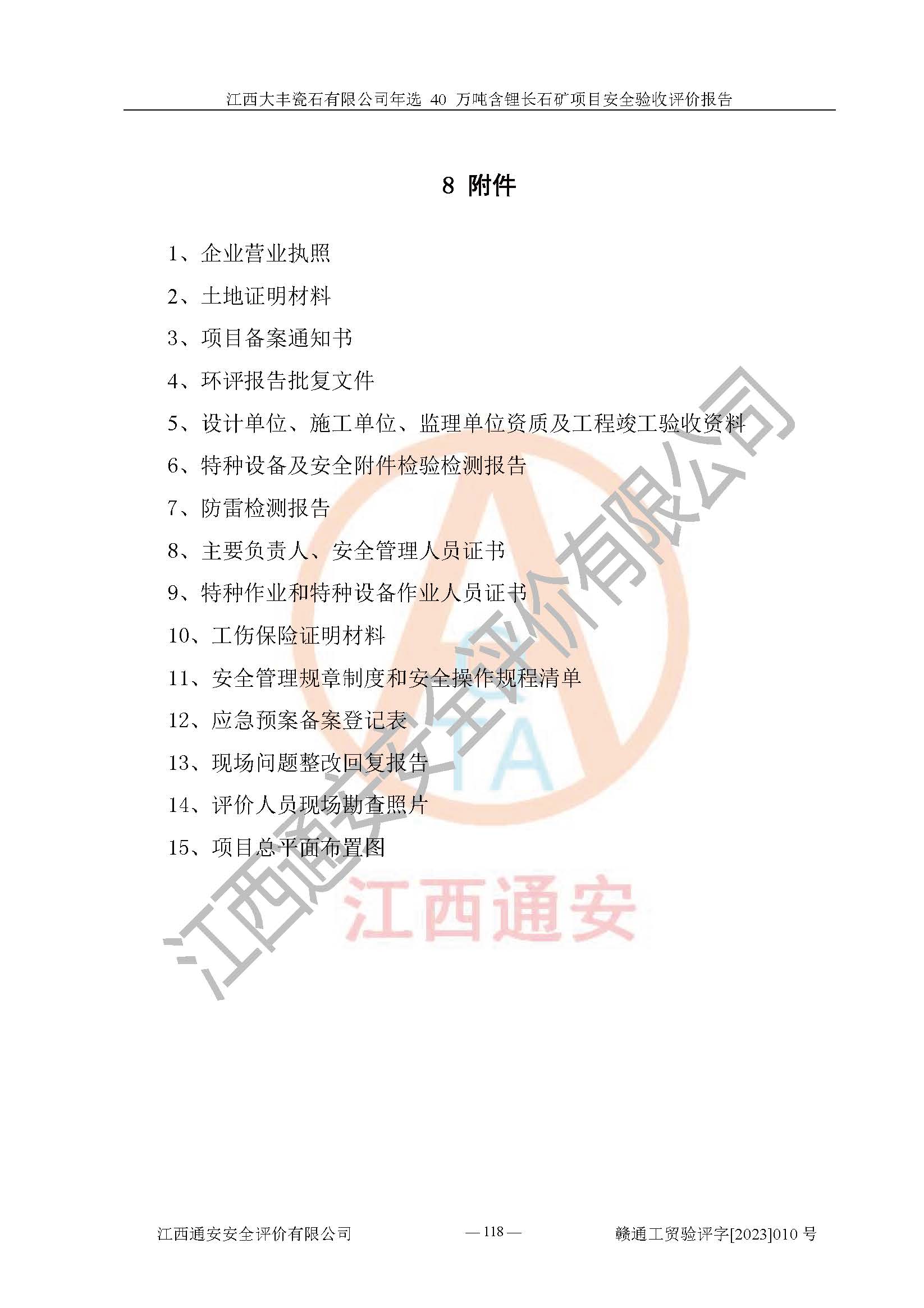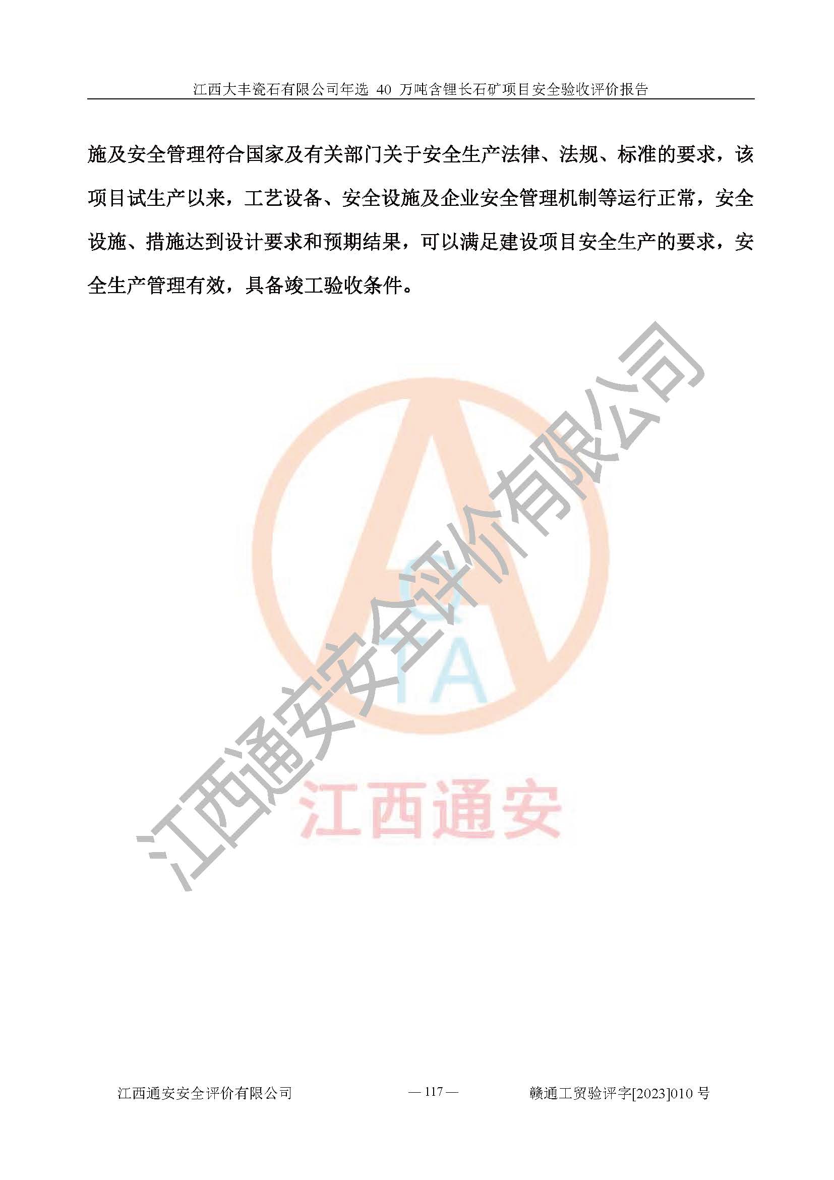 其它 | 根據(jù)《中華人民共和國安全生產(chǎn)法》、《新建項(xiàng)目安全設(shè)施“三同時”監(jiān)督管理辦法》(原**安全生產(chǎn)監(jiān)督管理總局令第77號修訂)等法律法規(guī)的要求,對江西大豐瓷石有限公司年選 40 萬噸含鋰長石礦項(xiàng)目安全驗(yàn)收的基本條件進(jìn)行分析,結(jié)果如下: 1)本項(xiàng)目在初步設(shè)計(jì)及建設(shè)過程中基本能貫徹執(zhí)行**、地方及有關(guān)部門的安全生產(chǎn)法律法規(guī)、標(biāo)準(zhǔn)要求,取得了**相關(guān)部門的許可、備案。項(xiàng)目的設(shè)計(jì)、施工、監(jiān)理等單位均有相應(yīng)資質(zhì)。 2)本項(xiàng)目址選符合要求;總平面布置合理,主要建筑的防火間距符合符合《建筑設(shè)計(jì)防火規(guī)范(2018版)》(GB50016-2014)、《工業(yè)企業(yè)總平面設(shè)計(jì)規(guī)范》(GB50187-2012)有關(guān)規(guī)范、標(biāo)準(zhǔn)的要求。 3)本項(xiàng)目生產(chǎn)工藝成熟、試運(yùn)行正常,試運(yùn)行中過程中工藝和裝置、設(shè)備(設(shè)施)安全、可靠,未發(fā)生安全事故。 4)本項(xiàng)目的特種設(shè)備由有資質(zhì)單位設(shè)計(jì)、制造、安裝,特種設(shè)備經(jīng)宜春市特種設(shè)備檢驗(yàn)中心檢驗(yàn)合格,符合《中華人民共和國特種設(shè)備安全法》、《特種設(shè)備安全監(jiān)察條例》(中華人民共和國***令第549號)的規(guī)定。特種設(shè)備作業(yè)人員、特種作業(yè)人員均持證上崗。 5)企業(yè)主要負(fù)責(zé)人、安全管理人員均取得了江西省億源企業(yè)咨詢服務(wù)有限公司頒發(fā)的培訓(xùn)證書,特種作業(yè)人員操作證在**期內(nèi),其他從業(yè)人員經(jīng)安全培訓(xùn)符合,取得上崗證。 6)企業(yè)建立有安全管理制度,制定有各類人員的安全生產(chǎn)責(zé)任制、各項(xiàng)安全管理制度和操作規(guī)程。按照**有關(guān)規(guī)定編制了事故應(yīng)急救援預(yù)案并進(jìn)行了備案,并定期進(jìn)行演練等,符合要求。 7)本項(xiàng)目作業(yè)條件危險(xiǎn)性分析結(jié)果:在選定的單元的危險(xiǎn)程度均為“可能危險(xiǎn),需要注意”或“稍有危險(xiǎn),可以接受”,作業(yè)條件相對安全。 評價結(jié)論: 江西大豐瓷石有限公司年選 40 萬噸含鋰長石礦項(xiàng)目的安全設(shè)施及安全管理符合**及有關(guān)部門關(guān)于安全生產(chǎn)法律、法規(guī)、標(biāo)準(zhǔn)的要求,該項(xiàng)目試生產(chǎn)以來,工藝設(shè)備、安全設(shè)施及企業(yè)安全管理機(jī)制等運(yùn)行正常,安全設(shè)施、措施達(dá)到設(shè)計(jì)要求和預(yù)期結(jié)果,可以滿足建設(shè)項(xiàng)目安全生產(chǎn)的要求,安全生產(chǎn)管理**,具備竣工驗(yàn)收條件。 | ||||