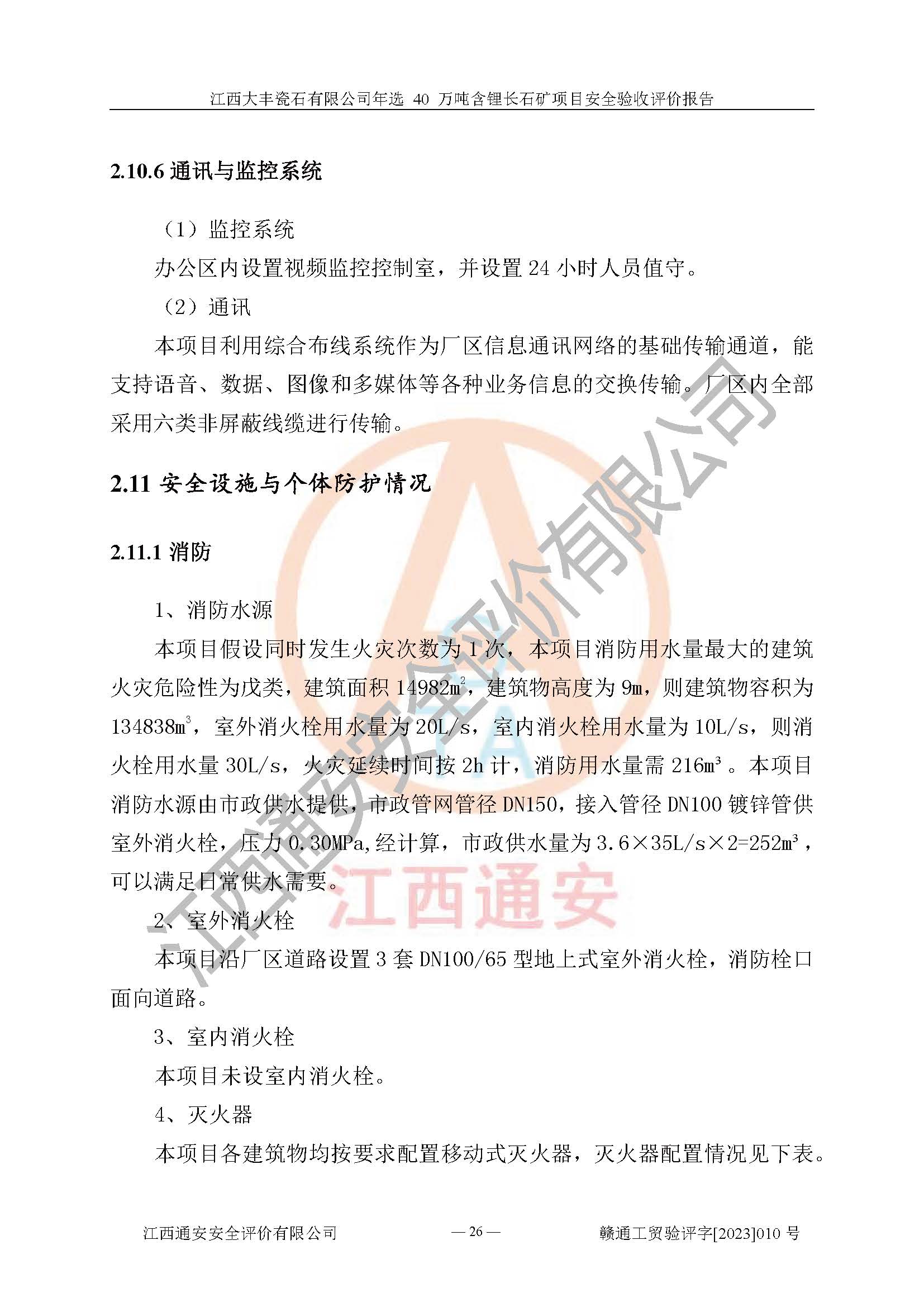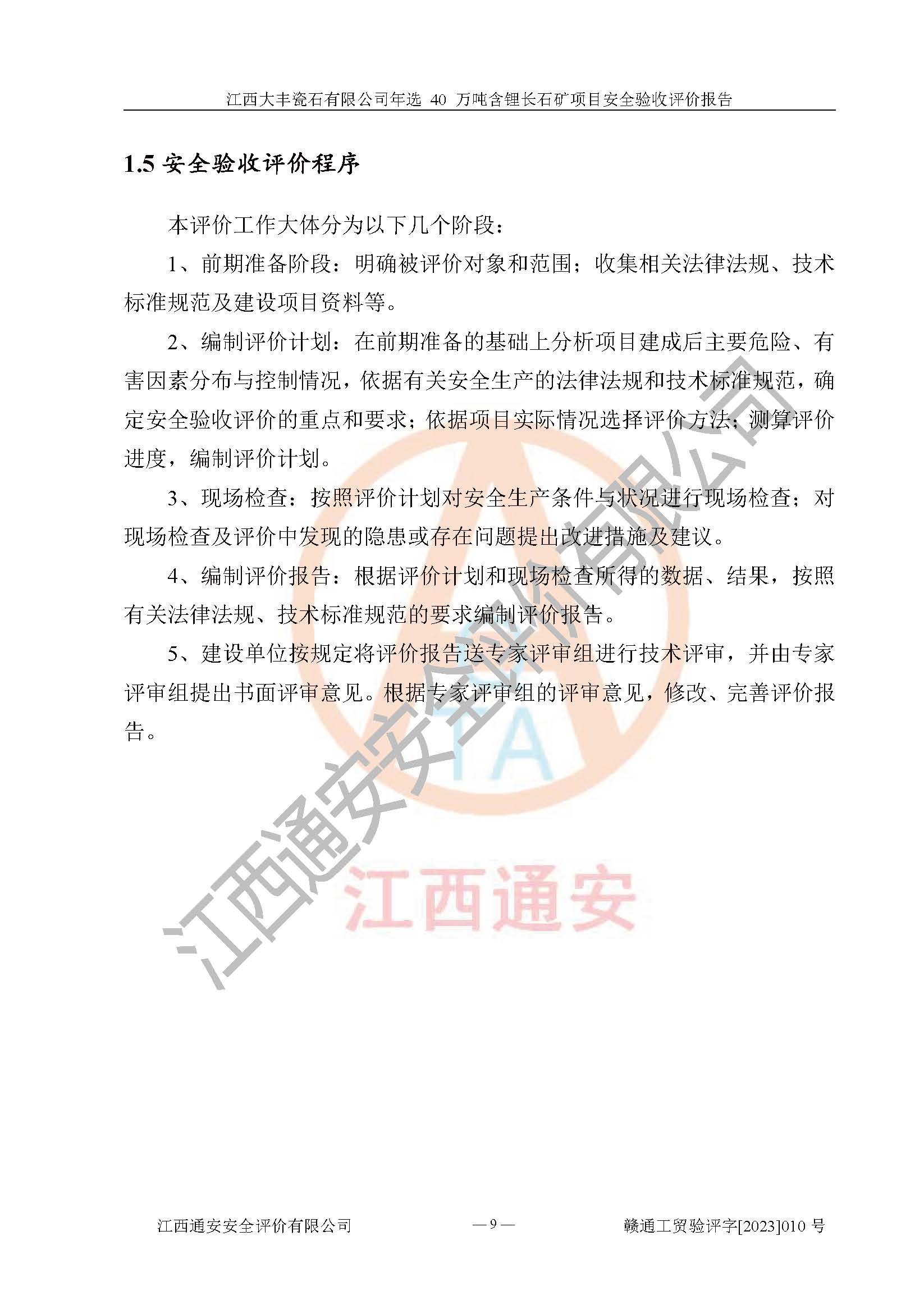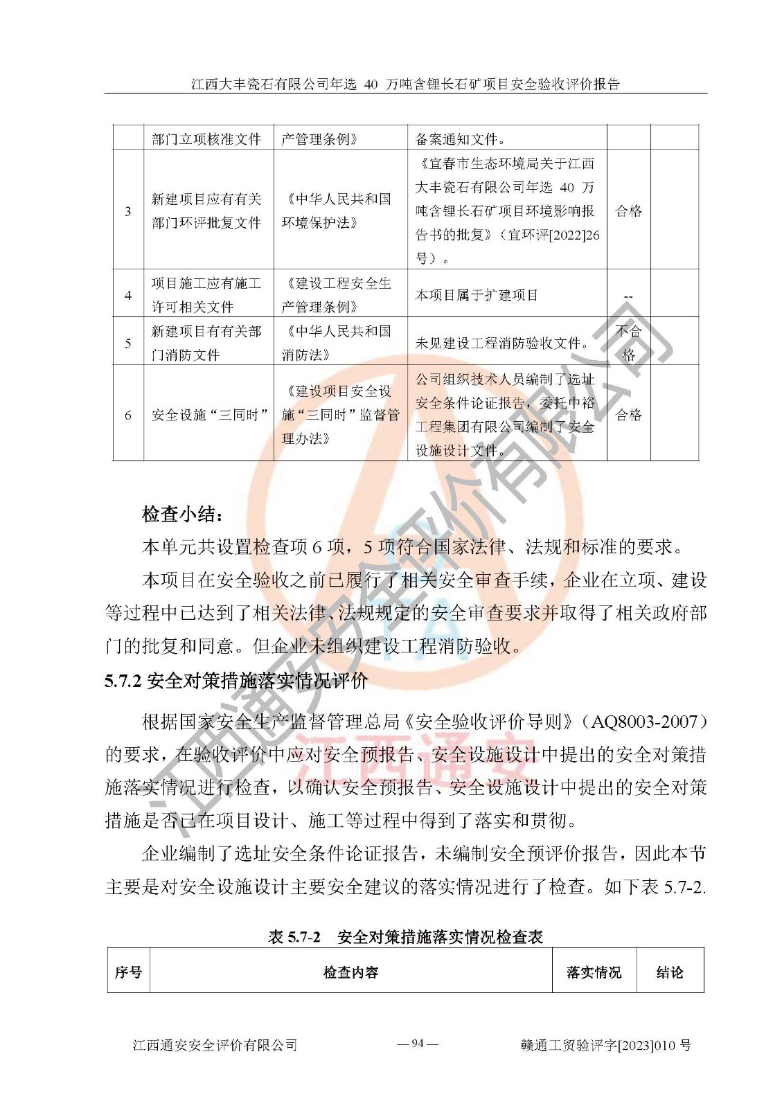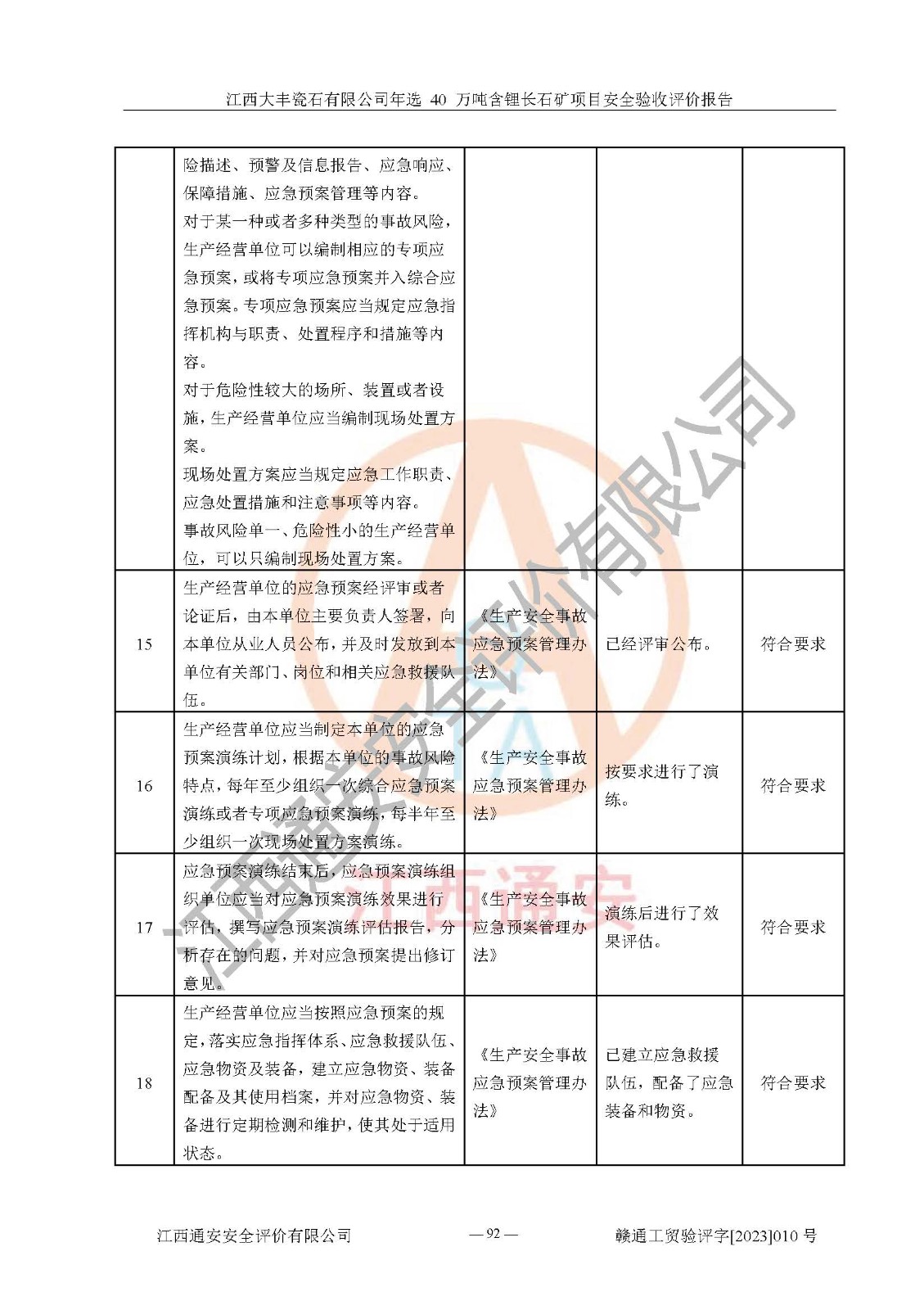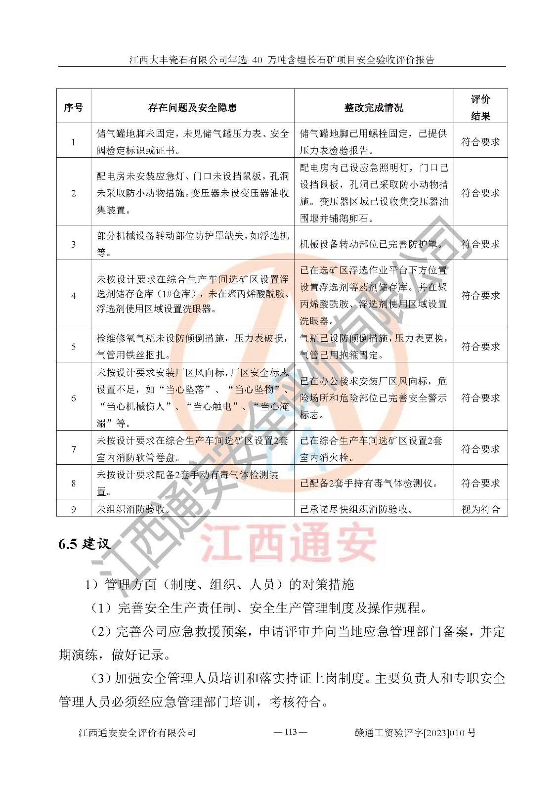 其它 | 根據(jù)《中華人民共和國安全生產(chǎn)法》、《新建項(xiàng)目安全設(shè)施“三同時”監(jiān)督管理辦法》(原**安全生產(chǎn)監(jiān)督管理總局令第77號修訂)等法律法規(guī)的要求,對江西大豐瓷石有限公司年選 40 萬噸含鋰長石礦項(xiàng)目安全驗(yàn)收的基本條件進(jìn)行分析,結(jié)果如下: 1)本項(xiàng)目在初步設(shè)計(jì)及建設(shè)過程中基本能貫徹執(zhí)行**、地方及有關(guān)部門的安全生產(chǎn)法律法規(guī)、標(biāo)準(zhǔn)要求,取得了**相關(guān)部門的許可、備案。項(xiàng)目的設(shè)計(jì)、施工、監(jiān)理等單位均有相應(yīng)資質(zhì)。 2)本項(xiàng)目址選符合要求;總平面布置合理,主要建筑的防火間距符合符合《建筑設(shè)計(jì)防火規(guī)范(2018版)》(GB50016-2014)、《工業(yè)企業(yè)總平面設(shè)計(jì)規(guī)范》(GB50187-2012)有關(guān)規(guī)范、標(biāo)準(zhǔn)的要求。 3)本項(xiàng)目生產(chǎn)工藝成熟、試運(yùn)行正常,試運(yùn)行中過程中工藝和裝置、設(shè)備(設(shè)施)安全、可靠,未發(fā)生安全事故。 4)本項(xiàng)目的特種設(shè)備由有資質(zhì)單位設(shè)計(jì)、制造、安裝,特種設(shè)備經(jīng)宜春市特種設(shè)備檢驗(yàn)中心檢驗(yàn)合格,符合《中華人民共和國特種設(shè)備安全法》、《特種設(shè)備安全監(jiān)察條例》(中華人民共和國***令第549號)的規(guī)定。特種設(shè)備作業(yè)人員、特種作業(yè)人員均持證上崗。 5)企業(yè)主要負(fù)責(zé)人、安全管理人員均取得了江西省億源企業(yè)咨詢服務(wù)有限公司頒發(fā)的培訓(xùn)證書,特種作業(yè)人員操作證在**期內(nèi),其他從業(yè)人員經(jīng)安全培訓(xùn)符合,取得上崗證。 6)企業(yè)建立有安全管理制度,制定有各類人員的安全生產(chǎn)責(zé)任制、各項(xiàng)安全管理制度和操作規(guī)程。按照**有關(guān)規(guī)定編制了事故應(yīng)急救援預(yù)案并進(jìn)行了備案,并定期進(jìn)行演練等,符合要求。 7)本項(xiàng)目作業(yè)條件危險(xiǎn)性分析結(jié)果:在選定的單元的危險(xiǎn)程度均為“可能危險(xiǎn),需要注意”或“稍有危險(xiǎn),可以接受”,作業(yè)條件相對安全。 評價結(jié)論: 江西大豐瓷石有限公司年選 40 萬噸含鋰長石礦項(xiàng)目的安全設(shè)施及安全管理符合**及有關(guān)部門關(guān)于安全生產(chǎn)法律、法規(guī)、標(biāo)準(zhǔn)的要求,該項(xiàng)目試生產(chǎn)以來,工藝設(shè)備、安全設(shè)施及企業(yè)安全管理機(jī)制等運(yùn)行正常,安全設(shè)施、措施達(dá)到設(shè)計(jì)要求和預(yù)期結(jié)果,可以滿足建設(shè)項(xiàng)目安全生產(chǎn)的要求,安全生產(chǎn)管理**,具備竣工驗(yàn)收條件。 | ||||