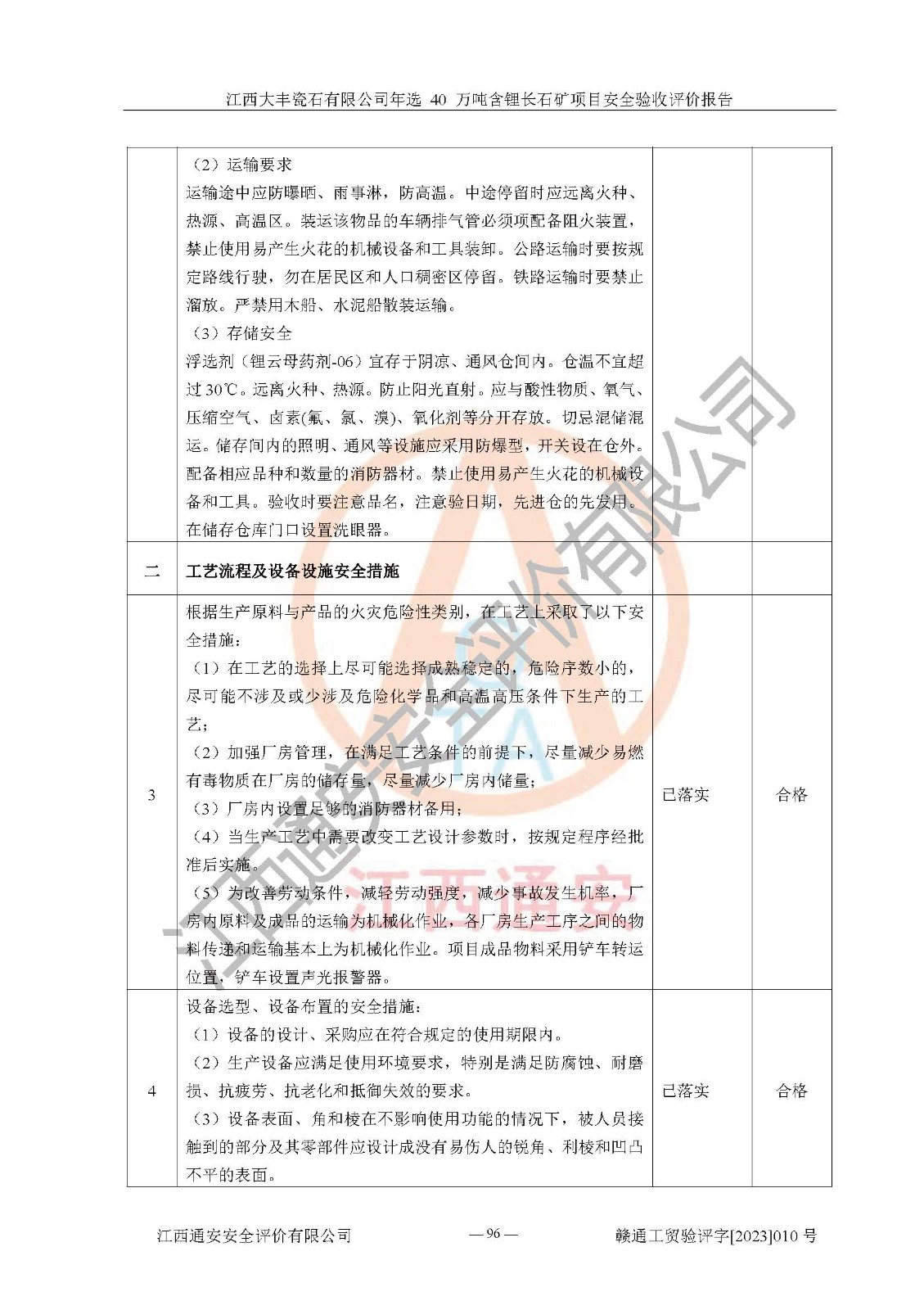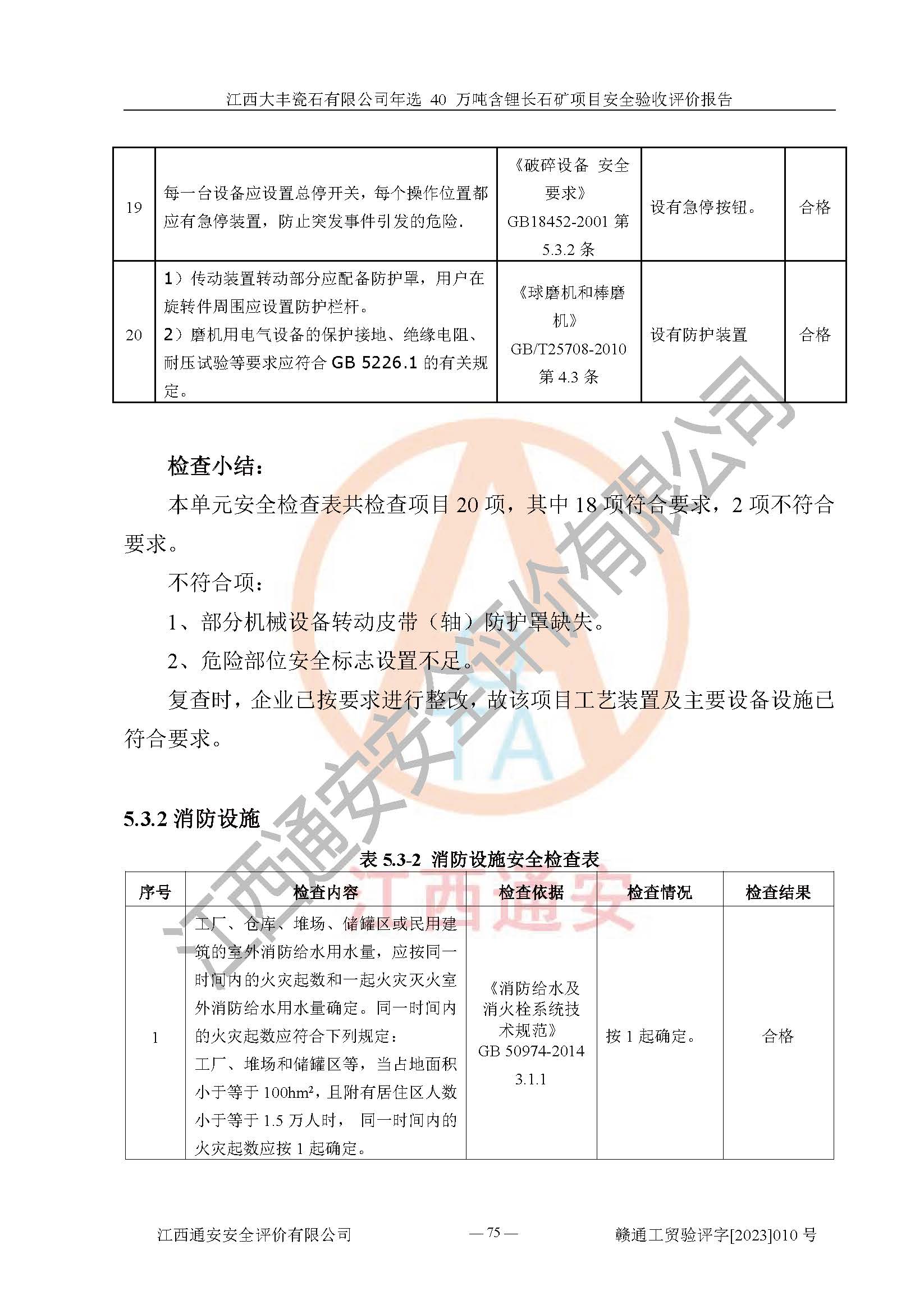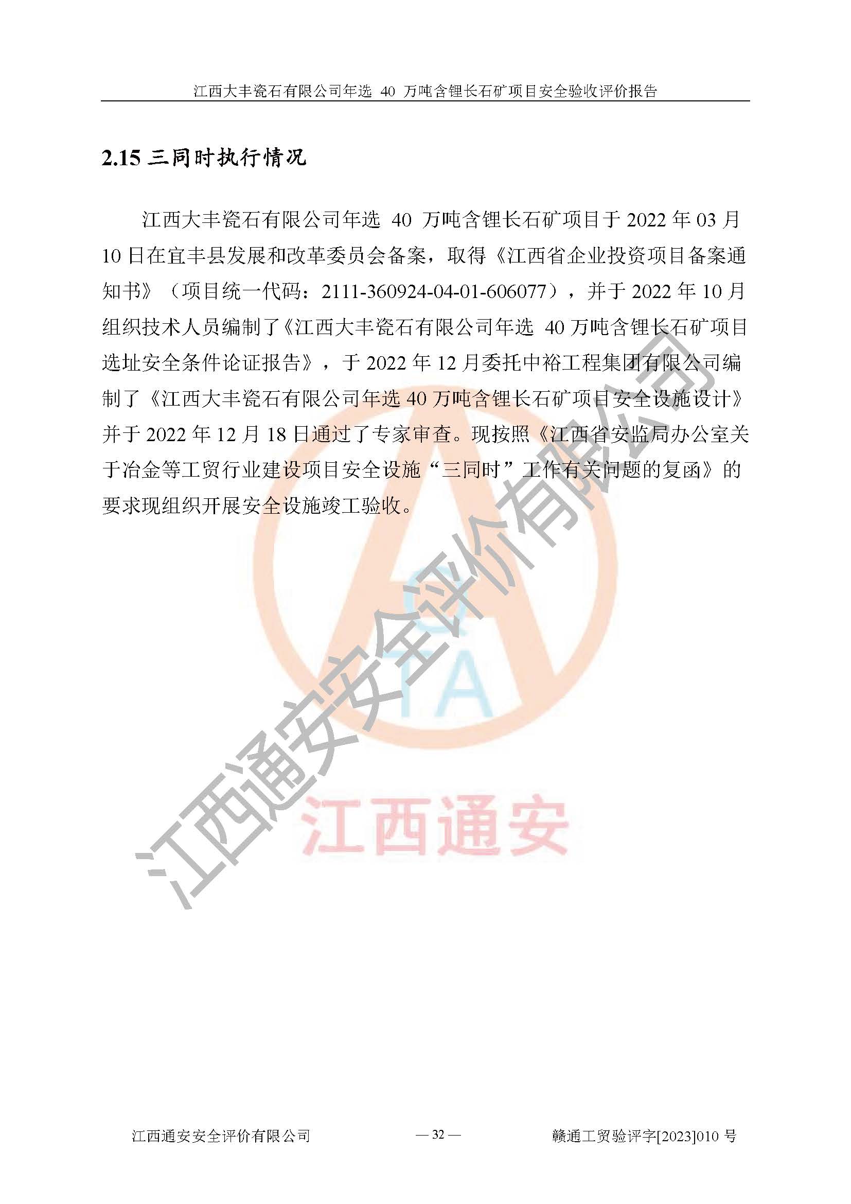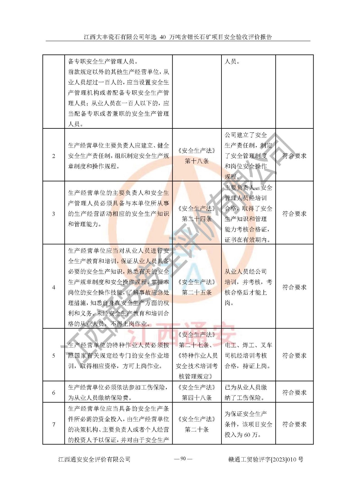 其它 | 根據(jù)《中華人民共和國安全生產(chǎn)法》、《新建項(xiàng)目安全設(shè)施“三同時”監(jiān)督管理辦法》(原**安全生產(chǎn)監(jiān)督管理總局令第77號修訂)等法律法規(guī)的要求,對江西大豐瓷石有限公司年選 40 萬噸含鋰長石礦項(xiàng)目安全驗(yàn)收的基本條件進(jìn)行分析,結(jié)果如下: 1)本項(xiàng)目在初步設(shè)計(jì)及建設(shè)過程中基本能貫徹執(zhí)行**、地方及有關(guān)部門的安全生產(chǎn)法律法規(guī)、標(biāo)準(zhǔn)要求,取得了**相關(guān)部門的許可、備案。項(xiàng)目的設(shè)計(jì)、施工、監(jiān)理等單位均有相應(yīng)資質(zhì)。 2)本項(xiàng)目址選符合要求;總平面布置合理,主要建筑的防火間距符合符合《建筑設(shè)計(jì)防火規(guī)范(2018版)》(GB50016-2014)、《工業(yè)企業(yè)總平面設(shè)計(jì)規(guī)范》(GB50187-2012)有關(guān)規(guī)范、標(biāo)準(zhǔn)的要求。 3)本項(xiàng)目生產(chǎn)工藝成熟、試運(yùn)行正常,試運(yùn)行中過程中工藝和裝置、設(shè)備(設(shè)施)安全、可靠,未發(fā)生安全事故。 4)本項(xiàng)目的特種設(shè)備由有資質(zhì)單位設(shè)計(jì)、制造、安裝,特種設(shè)備經(jīng)宜春市特種設(shè)備檢驗(yàn)中心檢驗(yàn)合格,符合《中華人民共和國特種設(shè)備安全法》、《特種設(shè)備安全監(jiān)察條例》(中華人民共和國***令第549號)的規(guī)定。特種設(shè)備作業(yè)人員、特種作業(yè)人員均持證上崗。 5)企業(yè)主要負(fù)責(zé)人、安全管理人員均取得了江西省億源企業(yè)咨詢服務(wù)有限公司頒發(fā)的培訓(xùn)證書,特種作業(yè)人員操作證在**期內(nèi),其他從業(yè)人員經(jīng)安全培訓(xùn)符合,取得上崗證。 6)企業(yè)建立有安全管理制度,制定有各類人員的安全生產(chǎn)責(zé)任制、各項(xiàng)安全管理制度和操作規(guī)程。按照**有關(guān)規(guī)定編制了事故應(yīng)急救援預(yù)案并進(jìn)行了備案,并定期進(jìn)行演練等,符合要求。 7)本項(xiàng)目作業(yè)條件危險(xiǎn)性分析結(jié)果:在選定的單元的危險(xiǎn)程度均為“可能危險(xiǎn),需要注意”或“稍有危險(xiǎn),可以接受”,作業(yè)條件相對安全。 評價結(jié)論: 江西大豐瓷石有限公司年選 40 萬噸含鋰長石礦項(xiàng)目的安全設(shè)施及安全管理符合**及有關(guān)部門關(guān)于安全生產(chǎn)法律、法規(guī)、標(biāo)準(zhǔn)的要求,該項(xiàng)目試生產(chǎn)以來,工藝設(shè)備、安全設(shè)施及企業(yè)安全管理機(jī)制等運(yùn)行正常,安全設(shè)施、措施達(dá)到設(shè)計(jì)要求和預(yù)期結(jié)果,可以滿足建設(shè)項(xiàng)目安全生產(chǎn)的要求,安全生產(chǎn)管理**,具備竣工驗(yàn)收條件。 | ||||