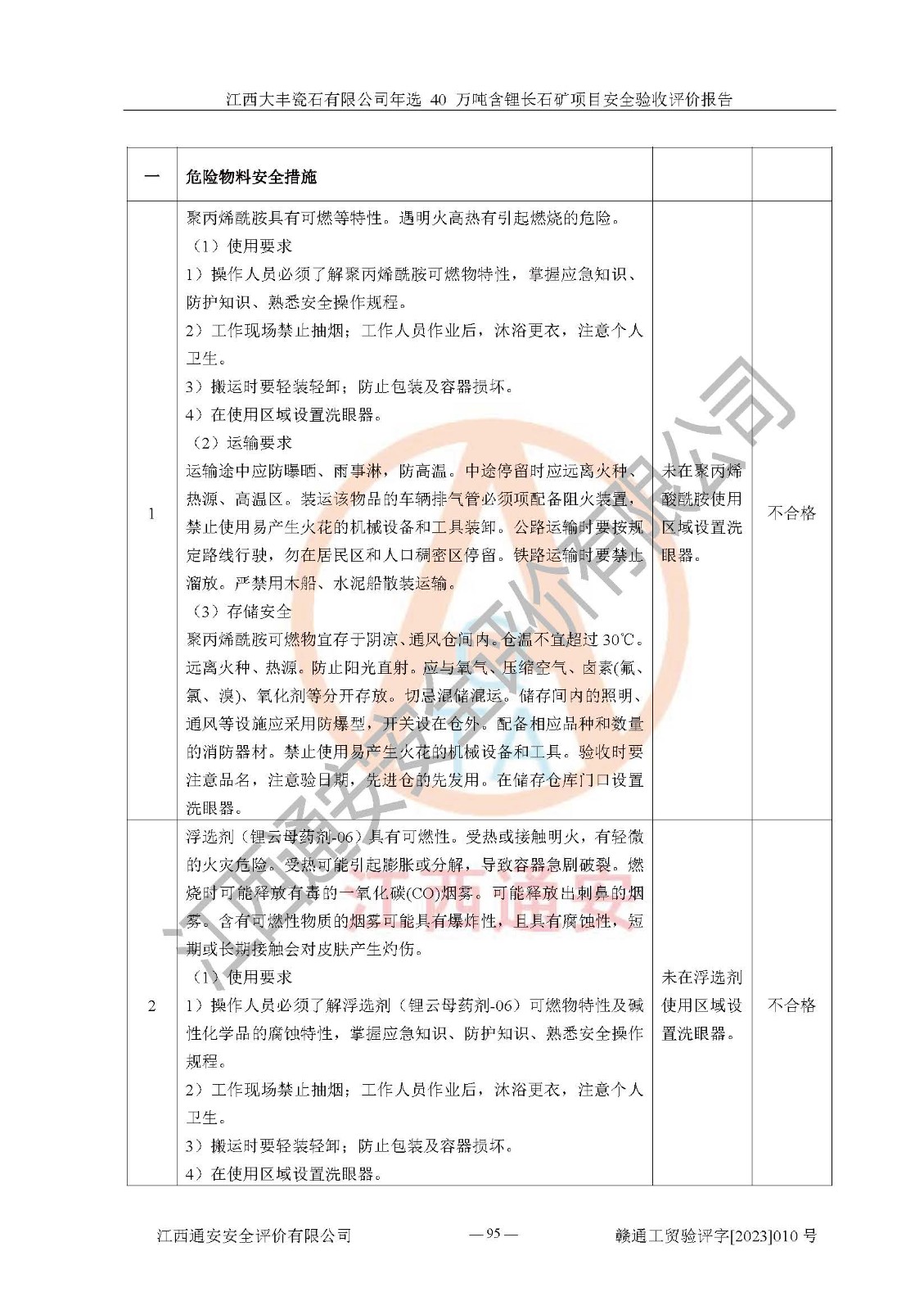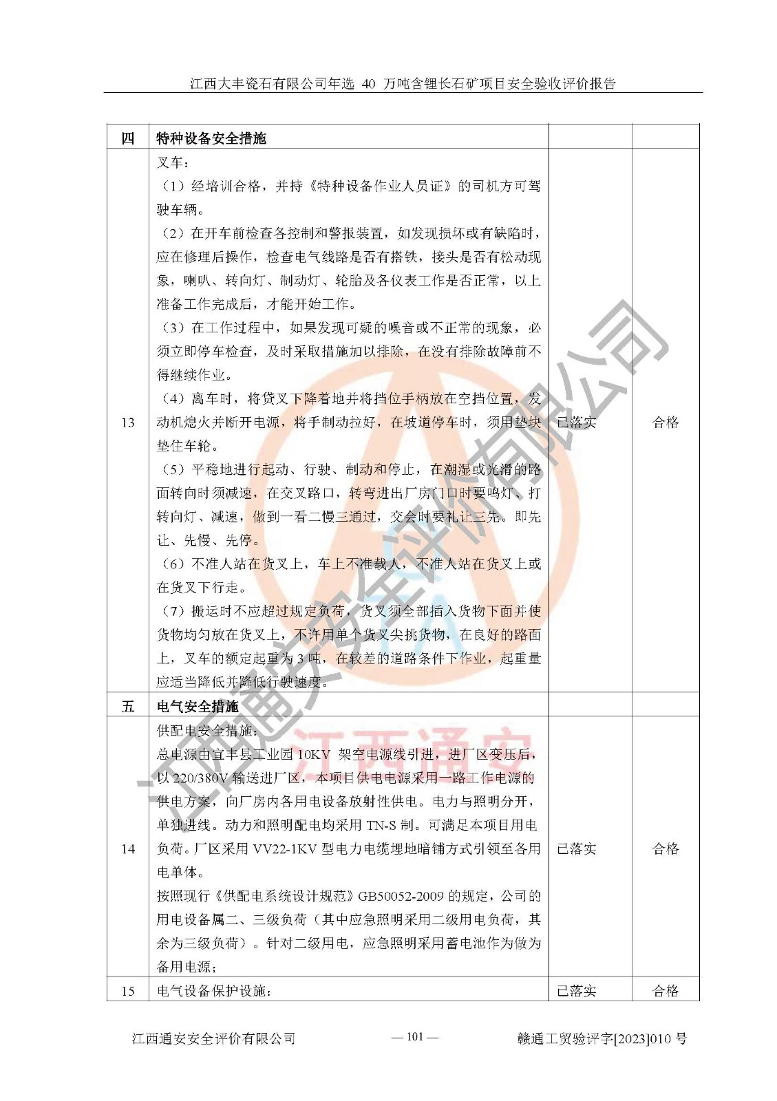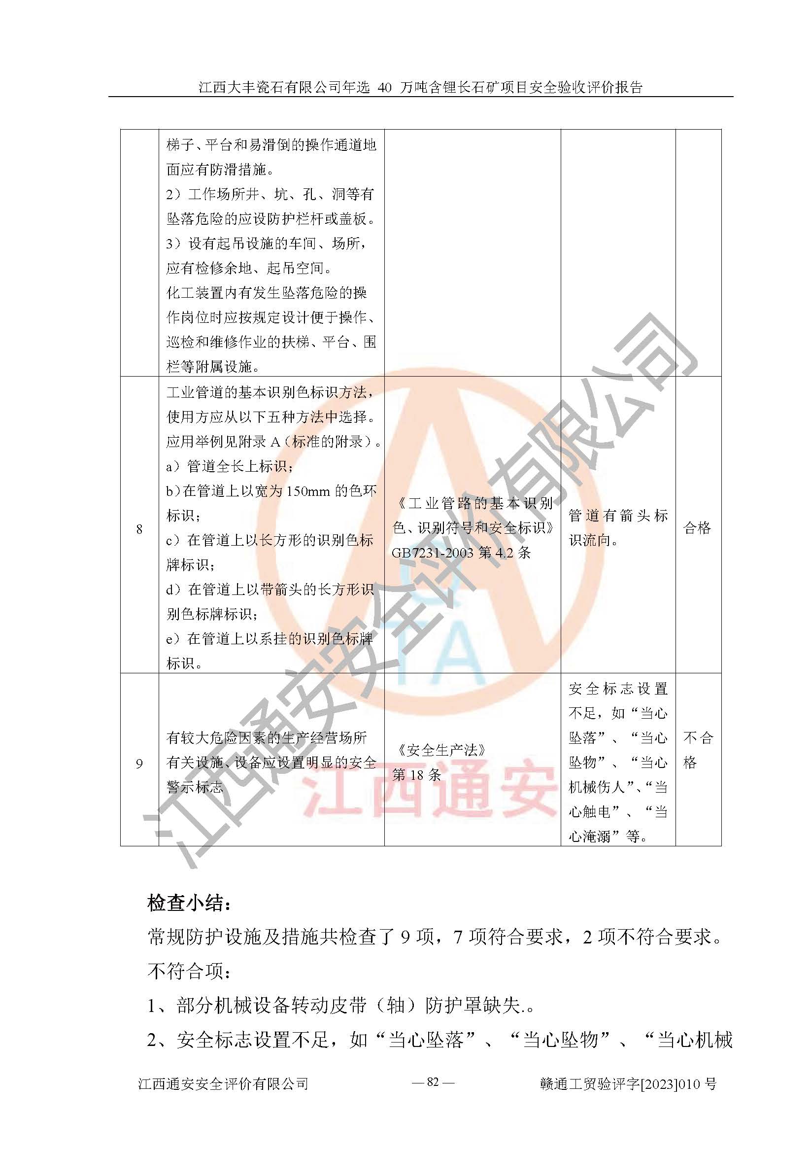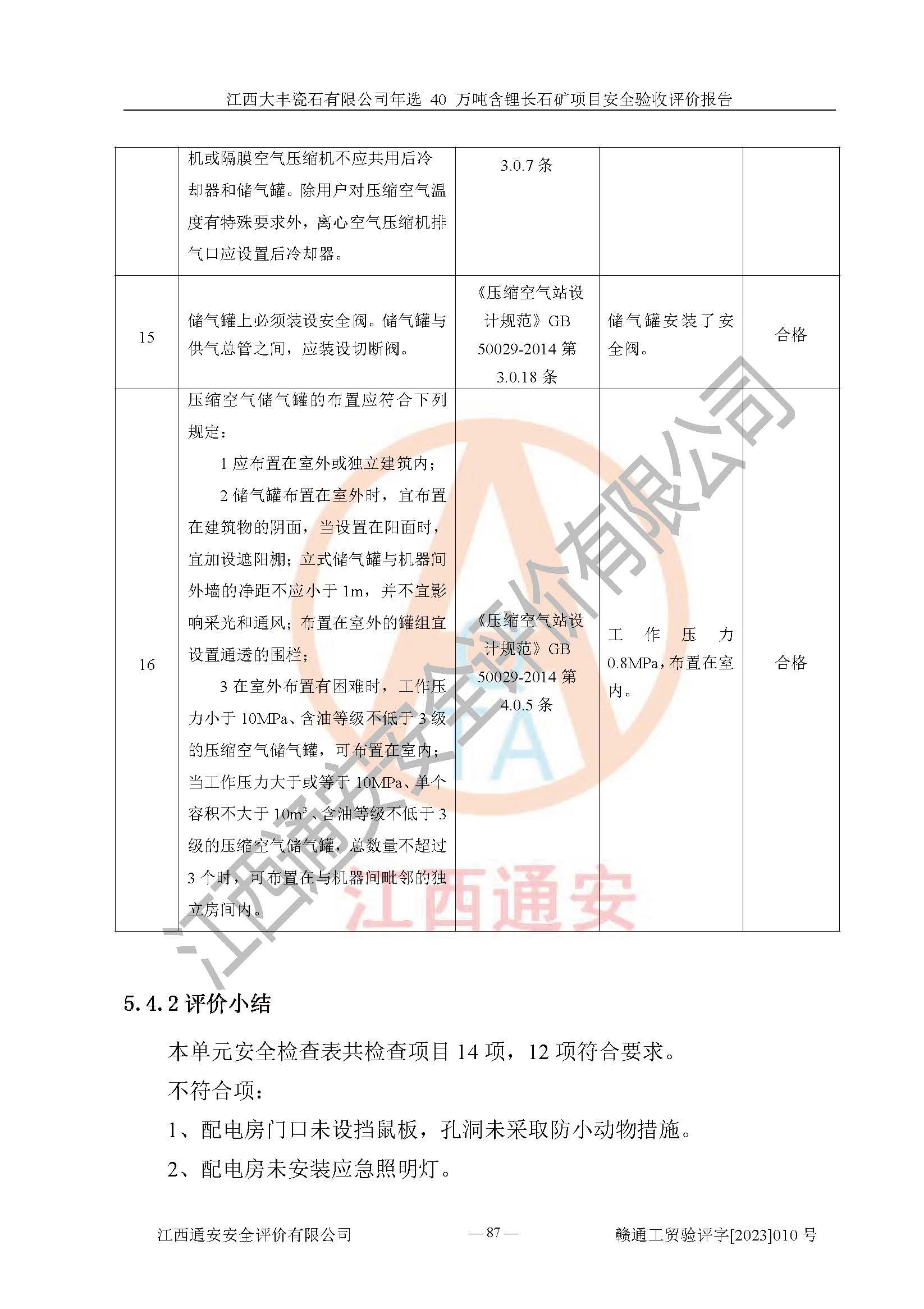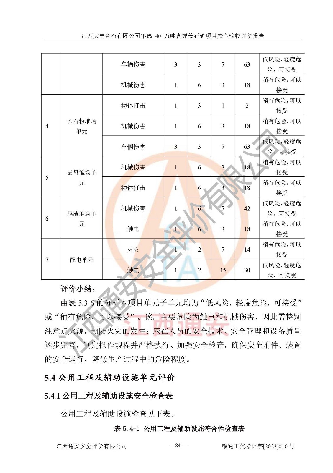 其它 | 根據(jù)《中華人民共和國安全生產(chǎn)法》、《新建項(xiàng)目安全設(shè)施“三同時”監(jiān)督管理辦法》(原**安全生產(chǎn)監(jiān)督管理總局令第77號修訂)等法律法規(guī)的要求,對江西大豐瓷石有限公司年選 40 萬噸含鋰長石礦項(xiàng)目安全驗(yàn)收的基本條件進(jìn)行分析,結(jié)果如下: 1)本項(xiàng)目在初步設(shè)計(jì)及建設(shè)過程中基本能貫徹執(zhí)行**、地方及有關(guān)部門的安全生產(chǎn)法律法規(guī)、標(biāo)準(zhǔn)要求,取得了**相關(guān)部門的許可、備案。項(xiàng)目的設(shè)計(jì)、施工、監(jiān)理等單位均有相應(yīng)資質(zhì)。 2)本項(xiàng)目址選符合要求;總平面布置合理,主要建筑的防火間距符合符合《建筑設(shè)計(jì)防火規(guī)范(2018版)》(GB50016-2014)、《工業(yè)企業(yè)總平面設(shè)計(jì)規(guī)范》(GB50187-2012)有關(guān)規(guī)范、標(biāo)準(zhǔn)的要求。 3)本項(xiàng)目生產(chǎn)工藝成熟、試運(yùn)行正常,試運(yùn)行中過程中工藝和裝置、設(shè)備(設(shè)施)安全、可靠,未發(fā)生安全事故。 4)本項(xiàng)目的特種設(shè)備由有資質(zhì)單位設(shè)計(jì)、制造、安裝,特種設(shè)備經(jīng)宜春市特種設(shè)備檢驗(yàn)中心檢驗(yàn)合格,符合《中華人民共和國特種設(shè)備安全法》、《特種設(shè)備安全監(jiān)察條例》(中華人民共和國***令第549號)的規(guī)定。特種設(shè)備作業(yè)人員、特種作業(yè)人員均持證上崗。 5)企業(yè)主要負(fù)責(zé)人、安全管理人員均取得了江西省億源企業(yè)咨詢服務(wù)有限公司頒發(fā)的培訓(xùn)證書,特種作業(yè)人員操作證在**期內(nèi),其他從業(yè)人員經(jīng)安全培訓(xùn)符合,取得上崗證。 6)企業(yè)建立有安全管理制度,制定有各類人員的安全生產(chǎn)責(zé)任制、各項(xiàng)安全管理制度和操作規(guī)程。按照**有關(guān)規(guī)定編制了事故應(yīng)急救援預(yù)案并進(jìn)行了備案,并定期進(jìn)行演練等,符合要求。 7)本項(xiàng)目作業(yè)條件危險(xiǎn)性分析結(jié)果:在選定的單元的危險(xiǎn)程度均為“可能危險(xiǎn),需要注意”或“稍有危險(xiǎn),可以接受”,作業(yè)條件相對安全。 評價結(jié)論: 江西大豐瓷石有限公司年選 40 萬噸含鋰長石礦項(xiàng)目的安全設(shè)施及安全管理符合**及有關(guān)部門關(guān)于安全生產(chǎn)法律、法規(guī)、標(biāo)準(zhǔn)的要求,該項(xiàng)目試生產(chǎn)以來,工藝設(shè)備、安全設(shè)施及企業(yè)安全管理機(jī)制等運(yùn)行正常,安全設(shè)施、措施達(dá)到設(shè)計(jì)要求和預(yù)期結(jié)果,可以滿足建設(shè)項(xiàng)目安全生產(chǎn)的要求,安全生產(chǎn)管理**,具備竣工驗(yàn)收條件。 | ||||