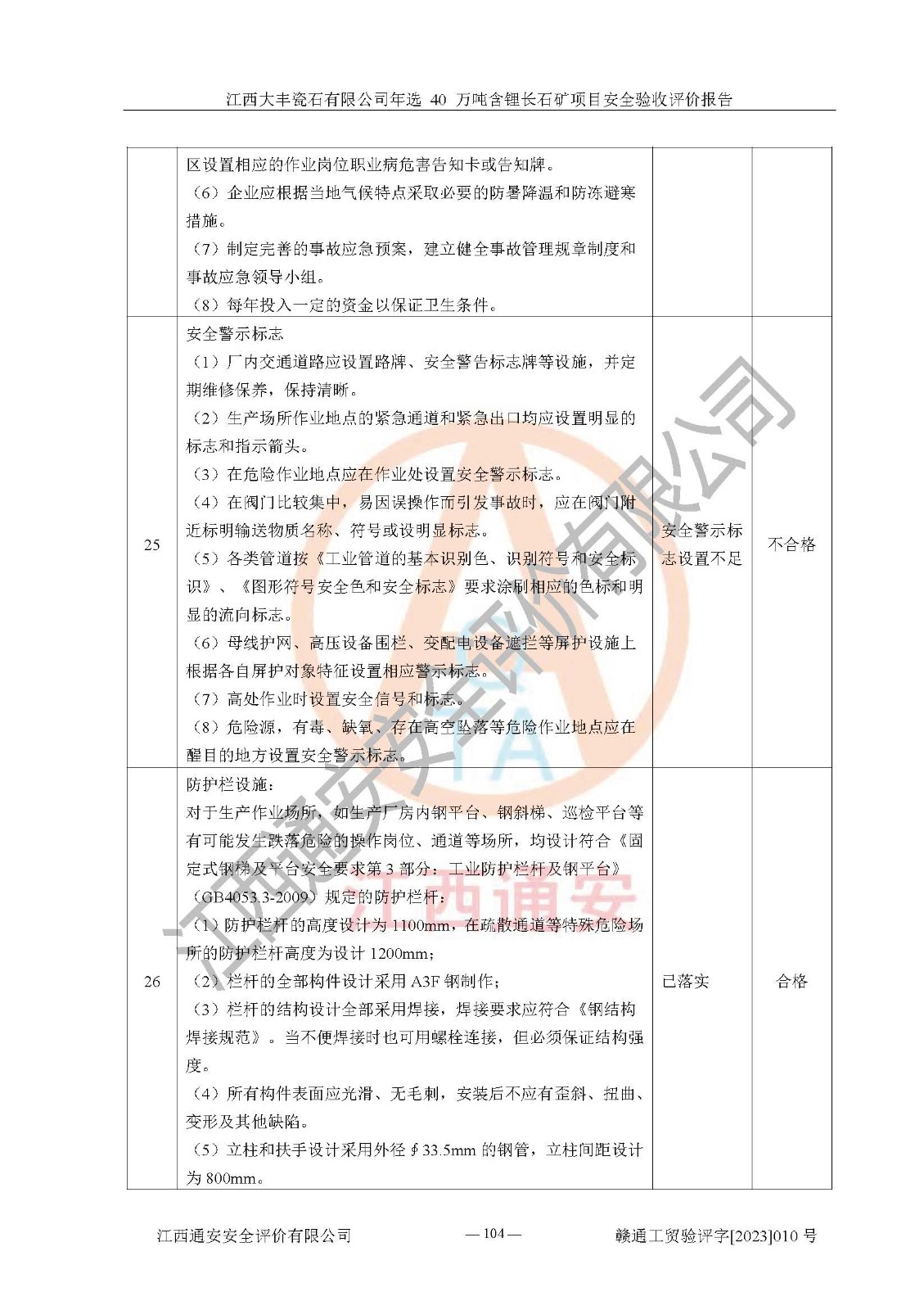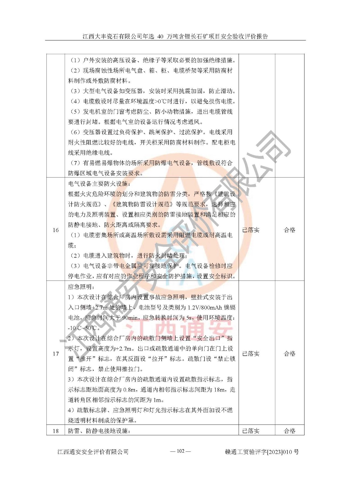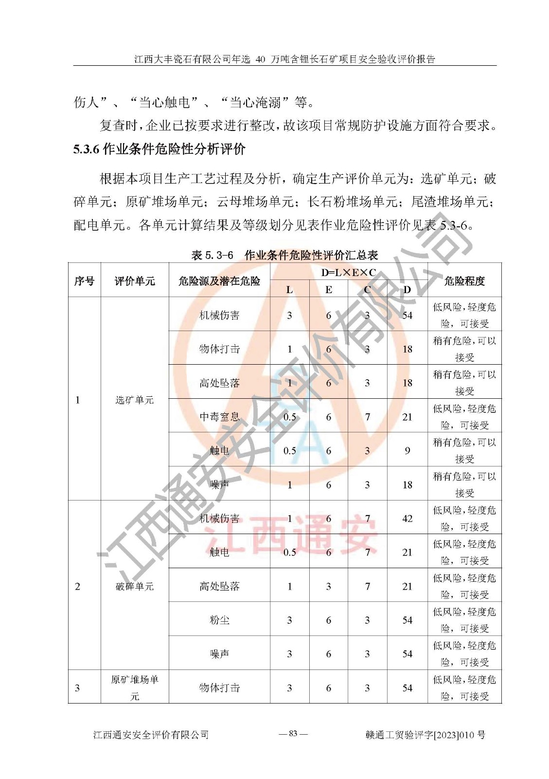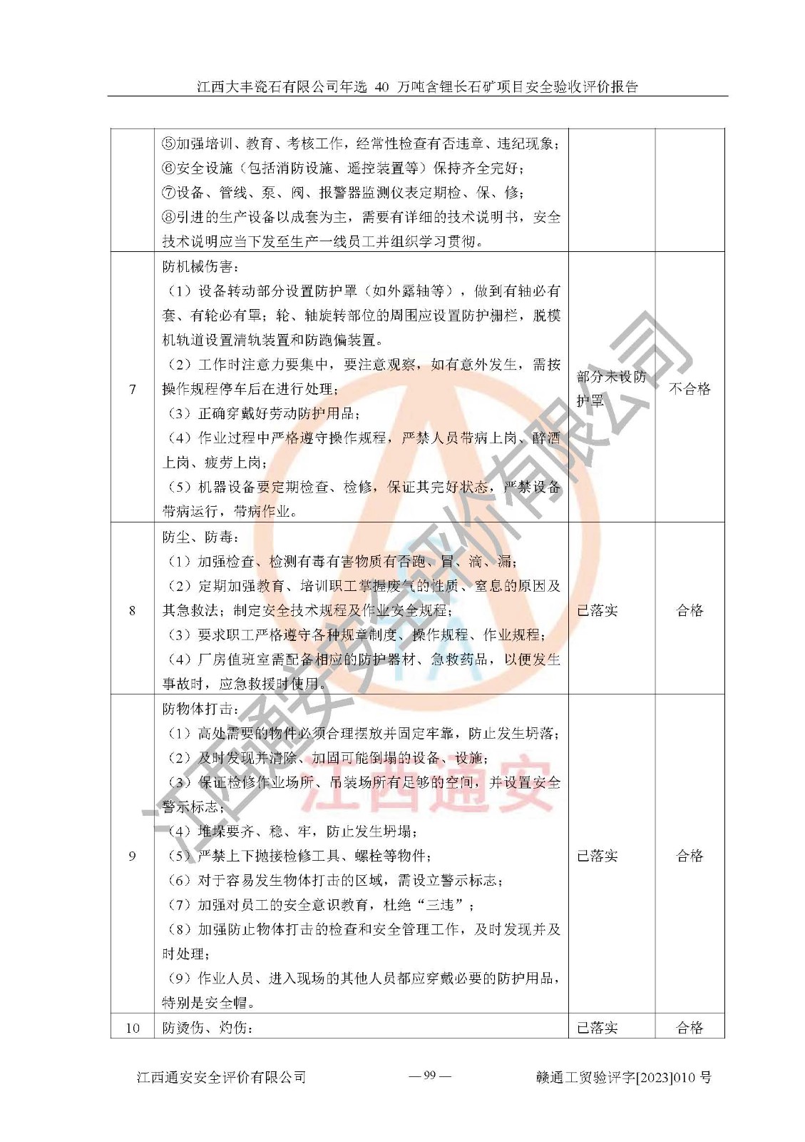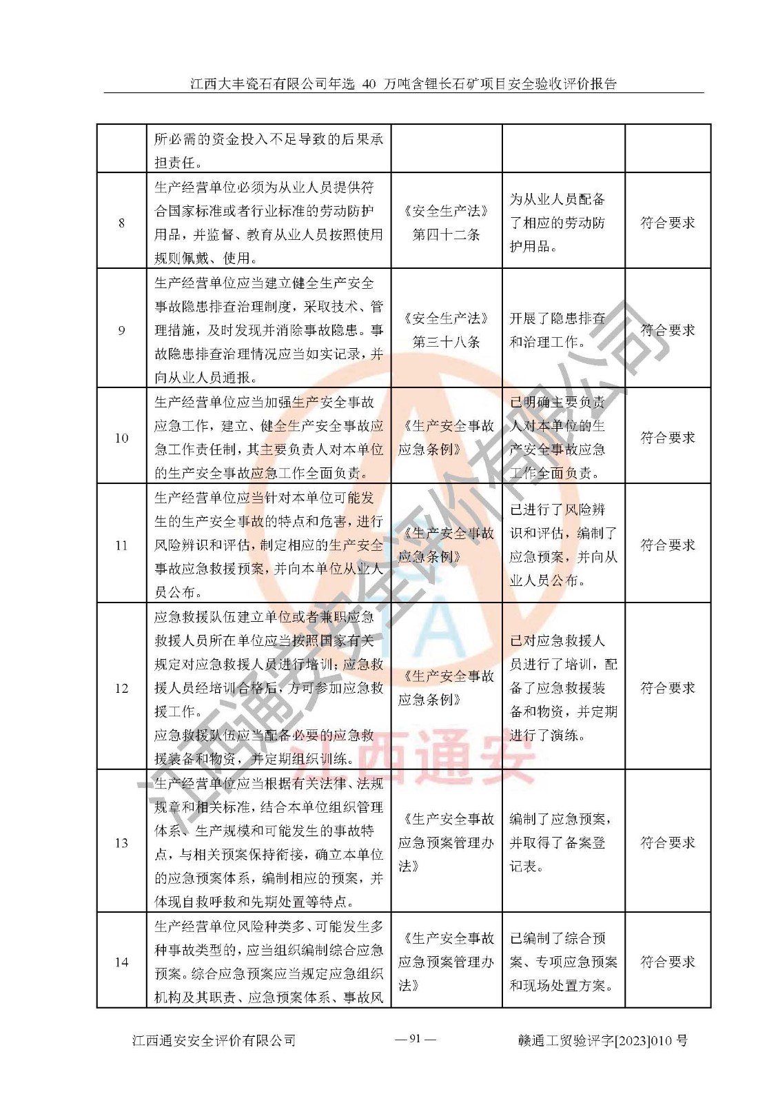 其它 | 根據(jù)《中華人民共和國安全生產(chǎn)法》、《新建項(xiàng)目安全設(shè)施“三同時”監(jiān)督管理辦法》(原**安全生產(chǎn)監(jiān)督管理總局令第77號修訂)等法律法規(guī)的要求,對江西大豐瓷石有限公司年選 40 萬噸含鋰長石礦項(xiàng)目安全驗(yàn)收的基本條件進(jìn)行分析,結(jié)果如下: 1)本項(xiàng)目在初步設(shè)計(jì)及建設(shè)過程中基本能貫徹執(zhí)行**、地方及有關(guān)部門的安全生產(chǎn)法律法規(guī)、標(biāo)準(zhǔn)要求,取得了**相關(guān)部門的許可、備案。項(xiàng)目的設(shè)計(jì)、施工、監(jiān)理等單位均有相應(yīng)資質(zhì)。 2)本項(xiàng)目址選符合要求;總平面布置合理,主要建筑的防火間距符合符合《建筑設(shè)計(jì)防火規(guī)范(2018版)》(GB50016-2014)、《工業(yè)企業(yè)總平面設(shè)計(jì)規(guī)范》(GB50187-2012)有關(guān)規(guī)范、標(biāo)準(zhǔn)的要求。 3)本項(xiàng)目生產(chǎn)工藝成熟、試運(yùn)行正常,試運(yùn)行中過程中工藝和裝置、設(shè)備(設(shè)施)安全、可靠,未發(fā)生安全事故。 4)本項(xiàng)目的特種設(shè)備由有資質(zhì)單位設(shè)計(jì)、制造、安裝,特種設(shè)備經(jīng)宜春市特種設(shè)備檢驗(yàn)中心檢驗(yàn)合格,符合《中華人民共和國特種設(shè)備安全法》、《特種設(shè)備安全監(jiān)察條例》(中華人民共和國***令第549號)的規(guī)定。特種設(shè)備作業(yè)人員、特種作業(yè)人員均持證上崗。 5)企業(yè)主要負(fù)責(zé)人、安全管理人員均取得了江西省億源企業(yè)咨詢服務(wù)有限公司頒發(fā)的培訓(xùn)證書,特種作業(yè)人員操作證在**期內(nèi),其他從業(yè)人員經(jīng)安全培訓(xùn)符合,取得上崗證。 6)企業(yè)建立有安全管理制度,制定有各類人員的安全生產(chǎn)責(zé)任制、各項(xiàng)安全管理制度和操作規(guī)程。按照**有關(guān)規(guī)定編制了事故應(yīng)急救援預(yù)案并進(jìn)行了備案,并定期進(jìn)行演練等,符合要求。 7)本項(xiàng)目作業(yè)條件危險(xiǎn)性分析結(jié)果:在選定的單元的危險(xiǎn)程度均為“可能危險(xiǎn),需要注意”或“稍有危險(xiǎn),可以接受”,作業(yè)條件相對安全。 評價結(jié)論: 江西大豐瓷石有限公司年選 40 萬噸含鋰長石礦項(xiàng)目的安全設(shè)施及安全管理符合**及有關(guān)部門關(guān)于安全生產(chǎn)法律、法規(guī)、標(biāo)準(zhǔn)的要求,該項(xiàng)目試生產(chǎn)以來,工藝設(shè)備、安全設(shè)施及企業(yè)安全管理機(jī)制等運(yùn)行正常,安全設(shè)施、措施達(dá)到設(shè)計(jì)要求和預(yù)期結(jié)果,可以滿足建設(shè)項(xiàng)目安全生產(chǎn)的要求,安全生產(chǎn)管理**,具備竣工驗(yàn)收條件。 | ||||