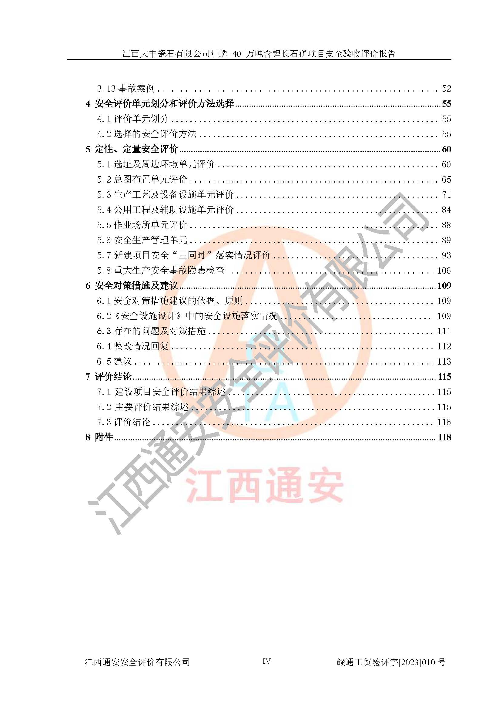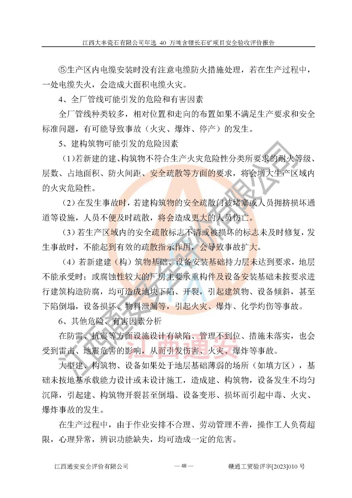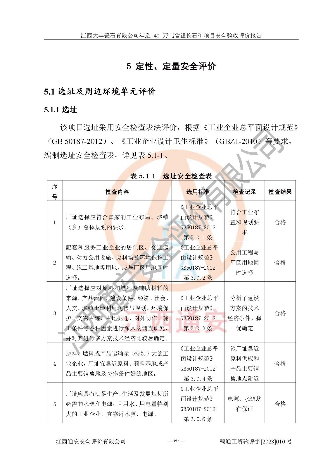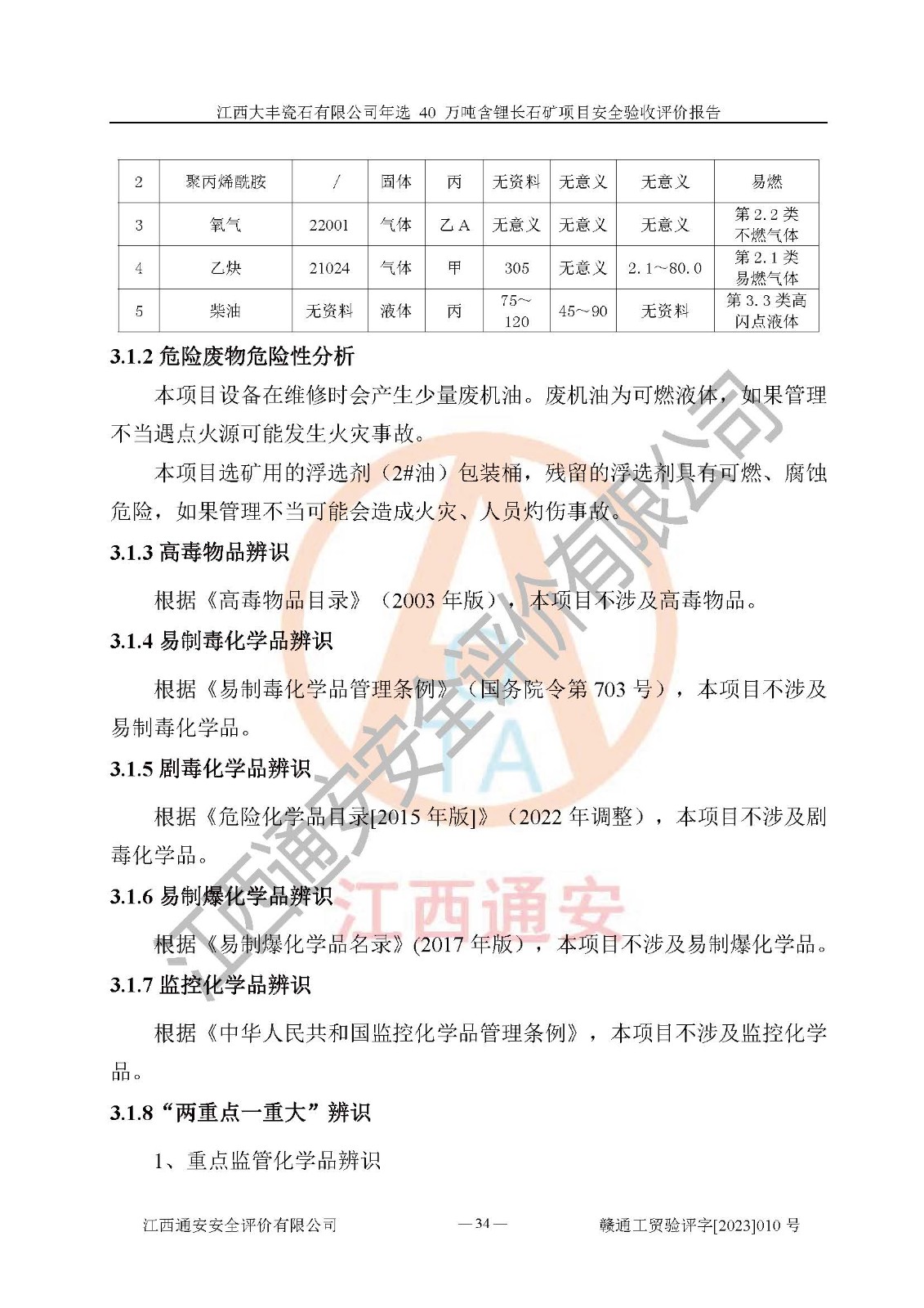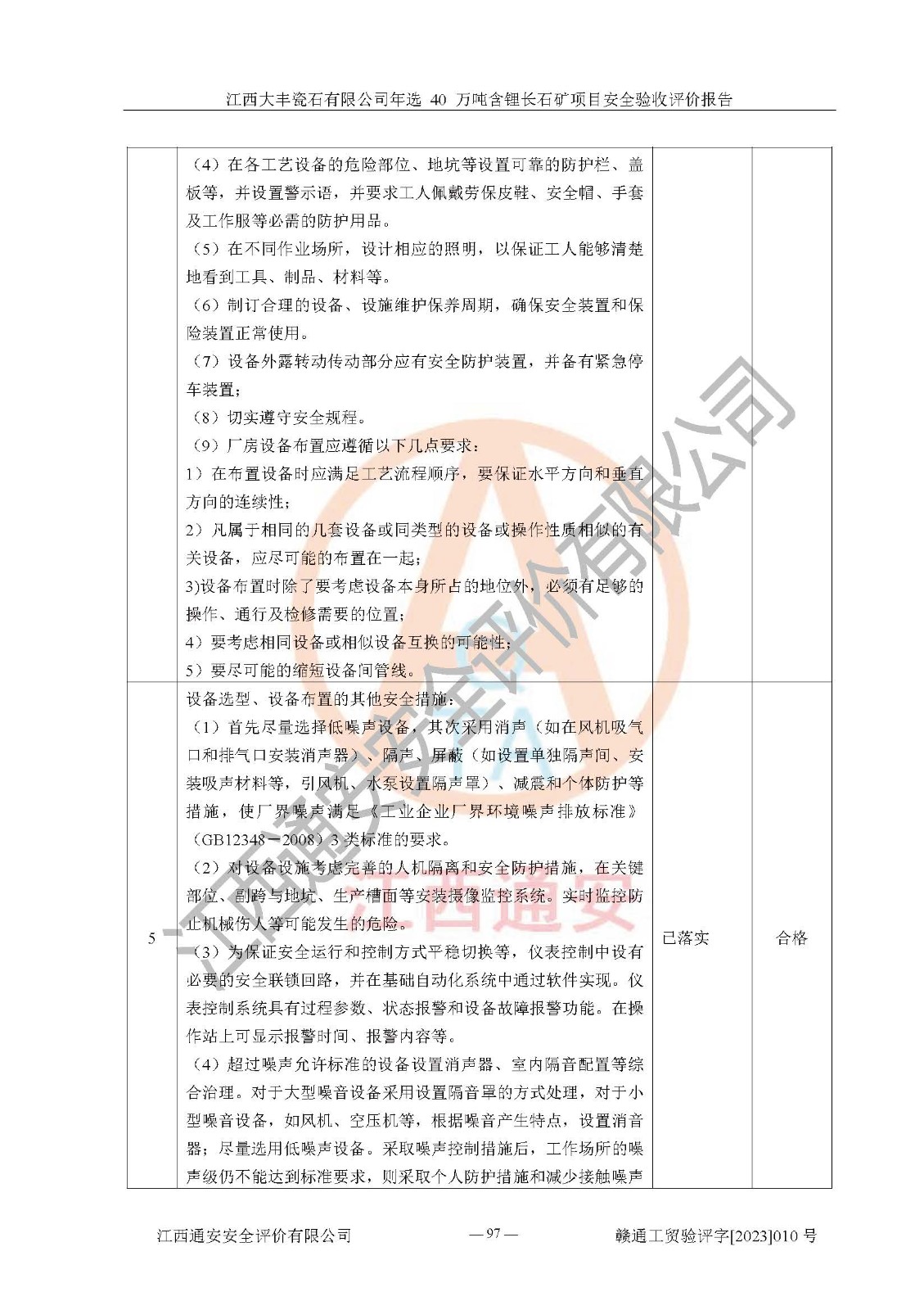 其它 | 根據(jù)《中華人民共和國安全生產(chǎn)法》、《新建項(xiàng)目安全設(shè)施“三同時”監(jiān)督管理辦法》(原**安全生產(chǎn)監(jiān)督管理總局令第77號修訂)等法律法規(guī)的要求,對江西大豐瓷石有限公司年選 40 萬噸含鋰長石礦項(xiàng)目安全驗(yàn)收的基本條件進(jìn)行分析,結(jié)果如下: 1)本項(xiàng)目在初步設(shè)計(jì)及建設(shè)過程中基本能貫徹執(zhí)行**、地方及有關(guān)部門的安全生產(chǎn)法律法規(guī)、標(biāo)準(zhǔn)要求,取得了**相關(guān)部門的許可、備案。項(xiàng)目的設(shè)計(jì)、施工、監(jiān)理等單位均有相應(yīng)資質(zhì)。 2)本項(xiàng)目址選符合要求;總平面布置合理,主要建筑的防火間距符合符合《建筑設(shè)計(jì)防火規(guī)范(2018版)》(GB50016-2014)、《工業(yè)企業(yè)總平面設(shè)計(jì)規(guī)范》(GB50187-2012)有關(guān)規(guī)范、標(biāo)準(zhǔn)的要求。 3)本項(xiàng)目生產(chǎn)工藝成熟、試運(yùn)行正常,試運(yùn)行中過程中工藝和裝置、設(shè)備(設(shè)施)安全、可靠,未發(fā)生安全事故。 4)本項(xiàng)目的特種設(shè)備由有資質(zhì)單位設(shè)計(jì)、制造、安裝,特種設(shè)備經(jīng)宜春市特種設(shè)備檢驗(yàn)中心檢驗(yàn)合格,符合《中華人民共和國特種設(shè)備安全法》、《特種設(shè)備安全監(jiān)察條例》(中華人民共和國***令第549號)的規(guī)定。特種設(shè)備作業(yè)人員、特種作業(yè)人員均持證上崗。 5)企業(yè)主要負(fù)責(zé)人、安全管理人員均取得了江西省億源企業(yè)咨詢服務(wù)有限公司頒發(fā)的培訓(xùn)證書,特種作業(yè)人員操作證在**期內(nèi),其他從業(yè)人員經(jīng)安全培訓(xùn)符合,取得上崗證。 6)企業(yè)建立有安全管理制度,制定有各類人員的安全生產(chǎn)責(zé)任制、各項(xiàng)安全管理制度和操作規(guī)程。按照**有關(guān)規(guī)定編制了事故應(yīng)急救援預(yù)案并進(jìn)行了備案,并定期進(jìn)行演練等,符合要求。 7)本項(xiàng)目作業(yè)條件危險(xiǎn)性分析結(jié)果:在選定的單元的危險(xiǎn)程度均為“可能危險(xiǎn),需要注意”或“稍有危險(xiǎn),可以接受”,作業(yè)條件相對安全。 評價結(jié)論: 江西大豐瓷石有限公司年選 40 萬噸含鋰長石礦項(xiàng)目的安全設(shè)施及安全管理符合**及有關(guān)部門關(guān)于安全生產(chǎn)法律、法規(guī)、標(biāo)準(zhǔn)的要求,該項(xiàng)目試生產(chǎn)以來,工藝設(shè)備、安全設(shè)施及企業(yè)安全管理機(jī)制等運(yùn)行正常,安全設(shè)施、措施達(dá)到設(shè)計(jì)要求和預(yù)期結(jié)果,可以滿足建設(shè)項(xiàng)目安全生產(chǎn)的要求,安全生產(chǎn)管理**,具備竣工驗(yàn)收條件。 | ||||