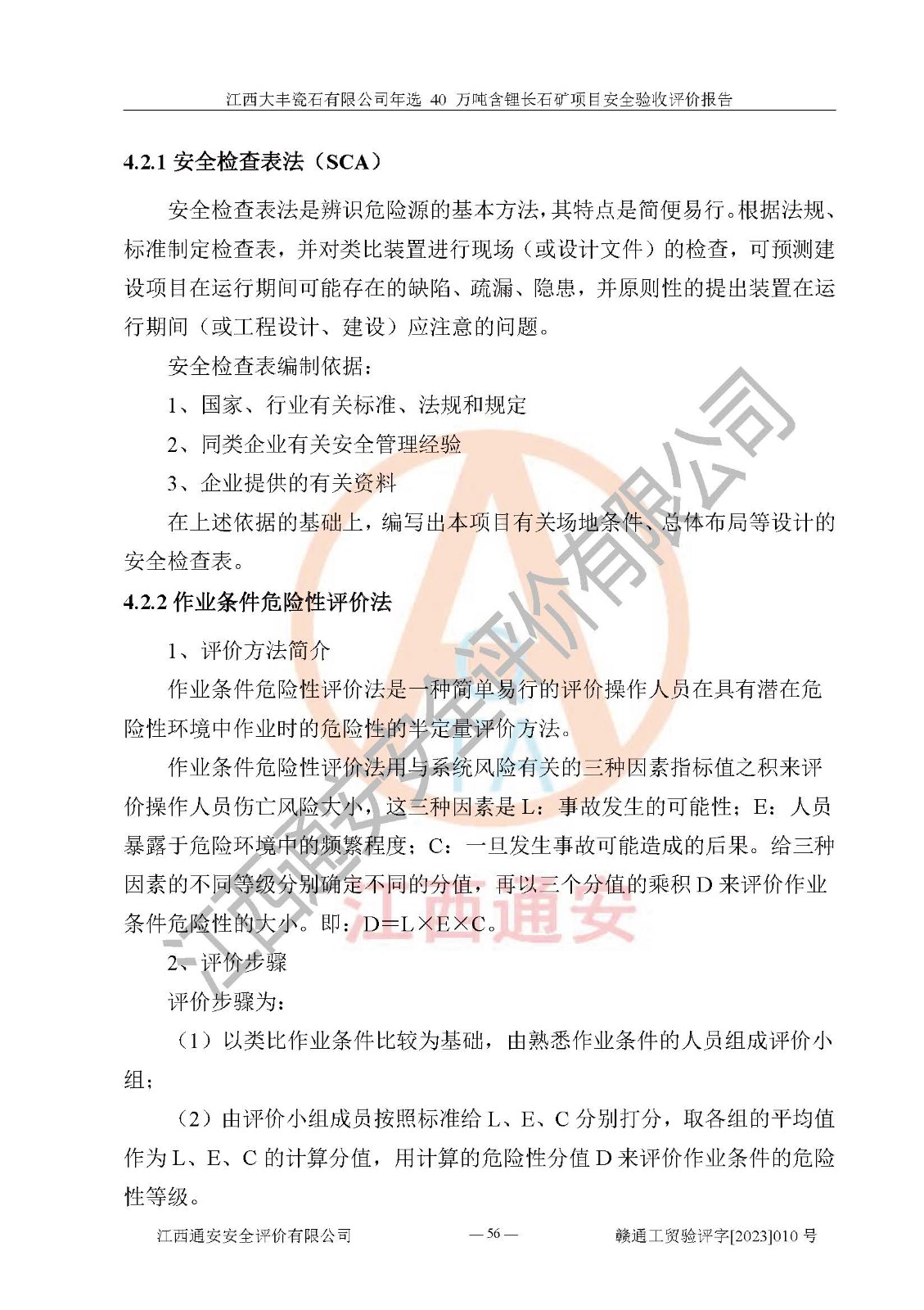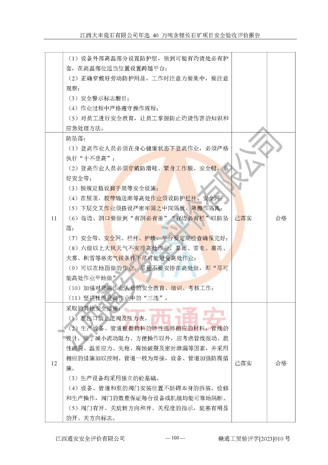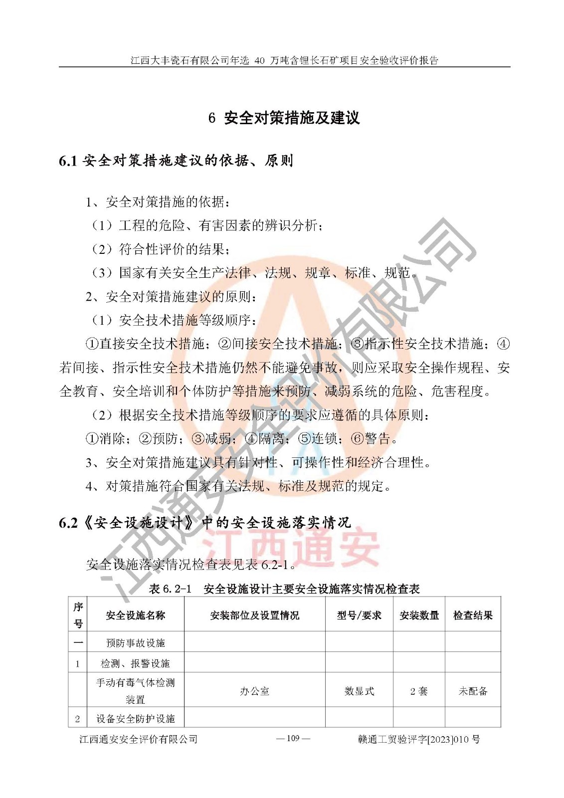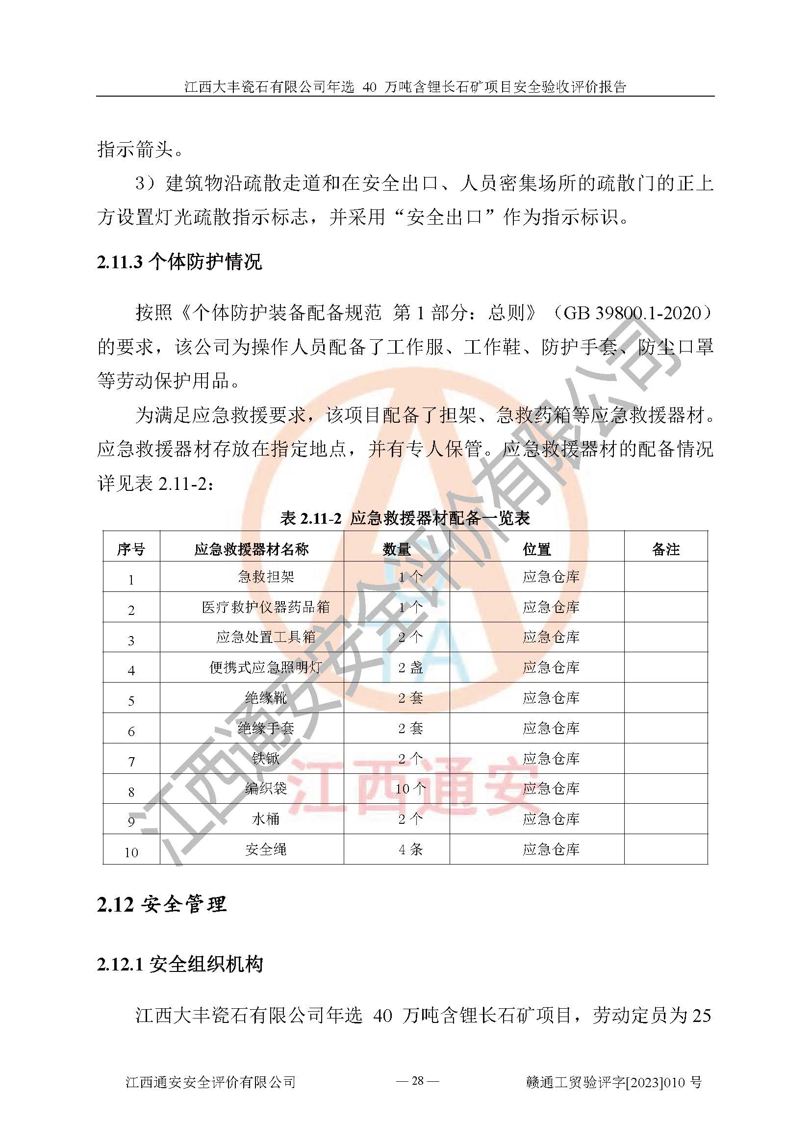 其它 | 根據(jù)《中華人民共和國安全生產(chǎn)法》、《新建項(xiàng)目安全設(shè)施“三同時”監(jiān)督管理辦法》(原**安全生產(chǎn)監(jiān)督管理總局令第77號修訂)等法律法規(guī)的要求,對江西大豐瓷石有限公司年選 40 萬噸含鋰長石礦項(xiàng)目安全驗(yàn)收的基本條件進(jìn)行分析,結(jié)果如下: 1)本項(xiàng)目在初步設(shè)計(jì)及建設(shè)過程中基本能貫徹執(zhí)行**、地方及有關(guān)部門的安全生產(chǎn)法律法規(guī)、標(biāo)準(zhǔn)要求,取得了**相關(guān)部門的許可、備案。項(xiàng)目的設(shè)計(jì)、施工、監(jiān)理等單位均有相應(yīng)資質(zhì)。 2)本項(xiàng)目址選符合要求;總平面布置合理,主要建筑的防火間距符合符合《建筑設(shè)計(jì)防火規(guī)范(2018版)》(GB50016-2014)、《工業(yè)企業(yè)總平面設(shè)計(jì)規(guī)范》(GB50187-2012)有關(guān)規(guī)范、標(biāo)準(zhǔn)的要求。 3)本項(xiàng)目生產(chǎn)工藝成熟、試運(yùn)行正常,試運(yùn)行中過程中工藝和裝置、設(shè)備(設(shè)施)安全、可靠,未發(fā)生安全事故。 4)本項(xiàng)目的特種設(shè)備由有資質(zhì)單位設(shè)計(jì)、制造、安裝,特種設(shè)備經(jīng)宜春市特種設(shè)備檢驗(yàn)中心檢驗(yàn)合格,符合《中華人民共和國特種設(shè)備安全法》、《特種設(shè)備安全監(jiān)察條例》(中華人民共和國***令第549號)的規(guī)定。特種設(shè)備作業(yè)人員、特種作業(yè)人員均持證上崗。 5)企業(yè)主要負(fù)責(zé)人、安全管理人員均取得了江西省億源企業(yè)咨詢服務(wù)有限公司頒發(fā)的培訓(xùn)證書,特種作業(yè)人員操作證在**期內(nèi),其他從業(yè)人員經(jīng)安全培訓(xùn)符合,取得上崗證。 6)企業(yè)建立有安全管理制度,制定有各類人員的安全生產(chǎn)責(zé)任制、各項(xiàng)安全管理制度和操作規(guī)程。按照**有關(guān)規(guī)定編制了事故應(yīng)急救援預(yù)案并進(jìn)行了備案,并定期進(jìn)行演練等,符合要求。 7)本項(xiàng)目作業(yè)條件危險(xiǎn)性分析結(jié)果:在選定的單元的危險(xiǎn)程度均為“可能危險(xiǎn),需要注意”或“稍有危險(xiǎn),可以接受”,作業(yè)條件相對安全。 評價結(jié)論: 江西大豐瓷石有限公司年選 40 萬噸含鋰長石礦項(xiàng)目的安全設(shè)施及安全管理符合**及有關(guān)部門關(guān)于安全生產(chǎn)法律、法規(guī)、標(biāo)準(zhǔn)的要求,該項(xiàng)目試生產(chǎn)以來,工藝設(shè)備、安全設(shè)施及企業(yè)安全管理機(jī)制等運(yùn)行正常,安全設(shè)施、措施達(dá)到設(shè)計(jì)要求和預(yù)期結(jié)果,可以滿足建設(shè)項(xiàng)目安全生產(chǎn)的要求,安全生產(chǎn)管理**,具備竣工驗(yàn)收條件。 | ||||