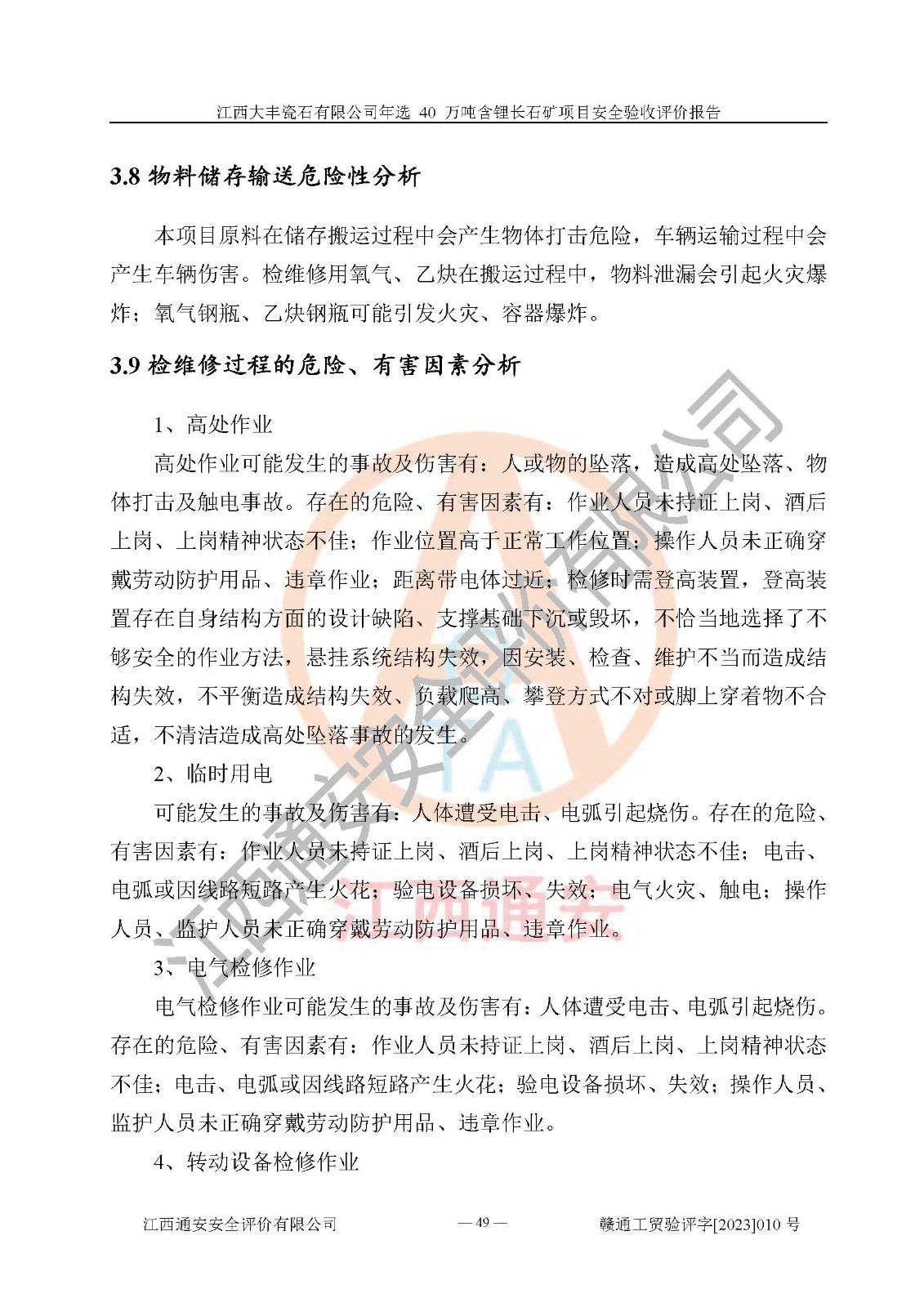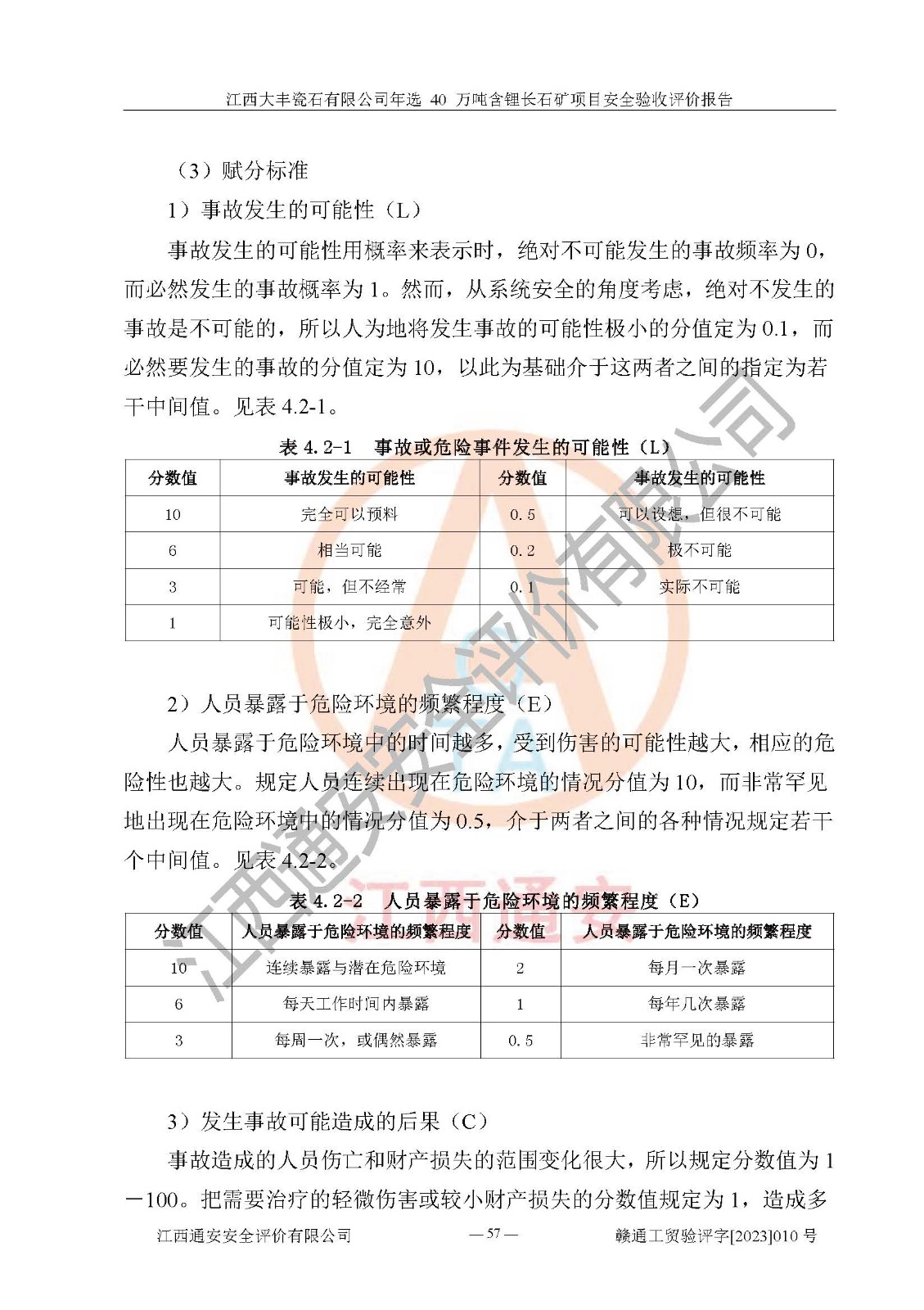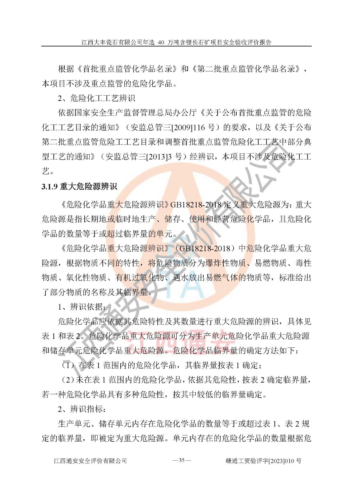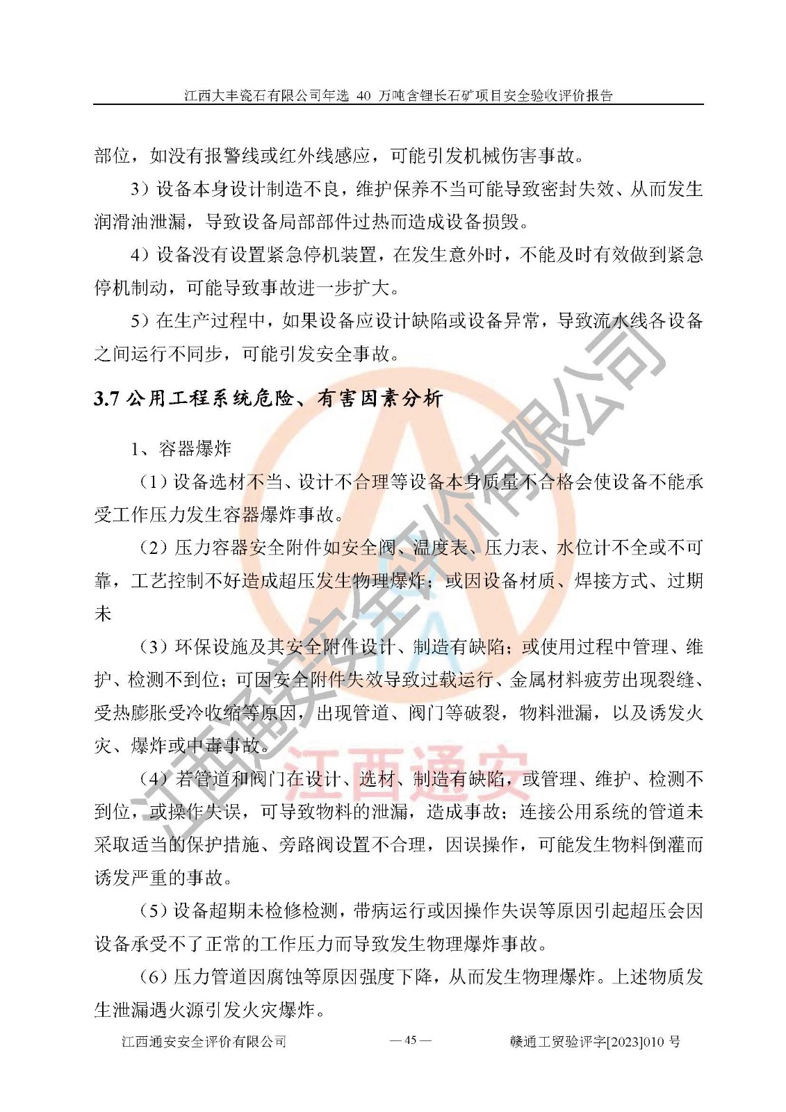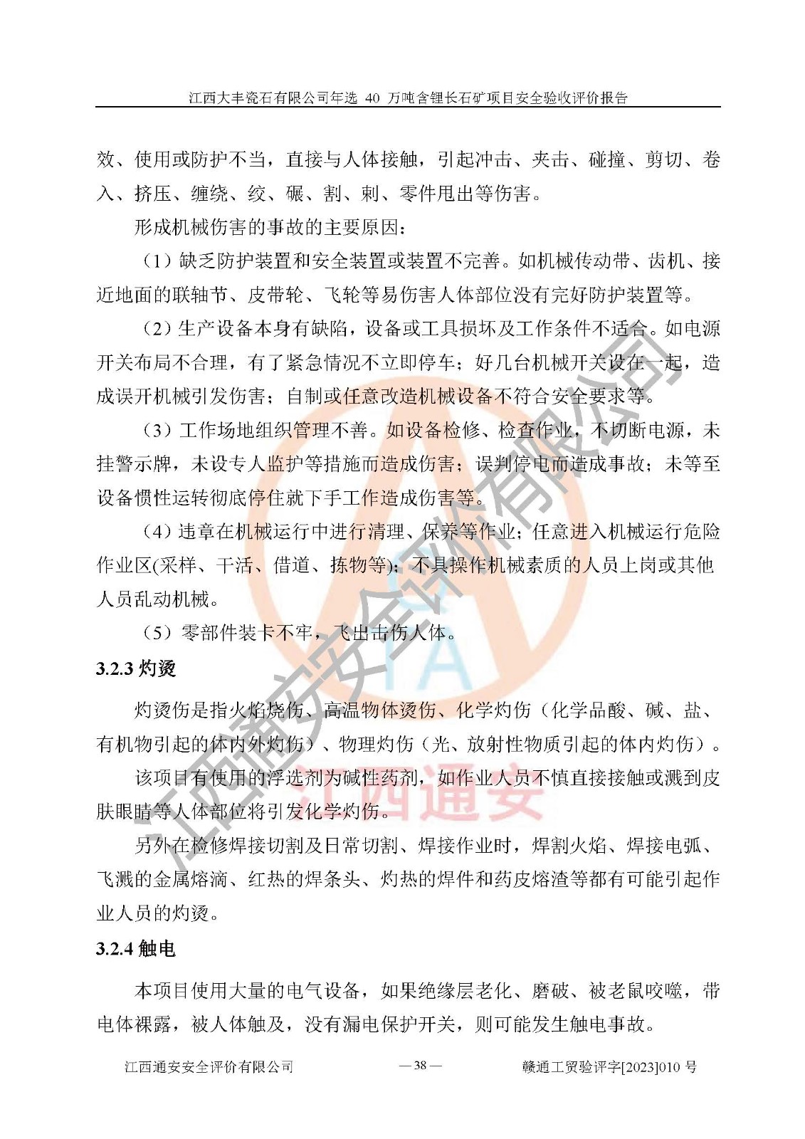 其它 | 根據(jù)《中華人民共和國安全生產(chǎn)法》、《新建項(xiàng)目安全設(shè)施“三同時”監(jiān)督管理辦法》(原**安全生產(chǎn)監(jiān)督管理總局令第77號修訂)等法律法規(guī)的要求,對江西大豐瓷石有限公司年選 40 萬噸含鋰長石礦項(xiàng)目安全驗(yàn)收的基本條件進(jìn)行分析,結(jié)果如下: 1)本項(xiàng)目在初步設(shè)計(jì)及建設(shè)過程中基本能貫徹執(zhí)行**、地方及有關(guān)部門的安全生產(chǎn)法律法規(guī)、標(biāo)準(zhǔn)要求,取得了**相關(guān)部門的許可、備案。項(xiàng)目的設(shè)計(jì)、施工、監(jiān)理等單位均有相應(yīng)資質(zhì)。 2)本項(xiàng)目址選符合要求;總平面布置合理,主要建筑的防火間距符合符合《建筑設(shè)計(jì)防火規(guī)范(2018版)》(GB50016-2014)、《工業(yè)企業(yè)總平面設(shè)計(jì)規(guī)范》(GB50187-2012)有關(guān)規(guī)范、標(biāo)準(zhǔn)的要求。 3)本項(xiàng)目生產(chǎn)工藝成熟、試運(yùn)行正常,試運(yùn)行中過程中工藝和裝置、設(shè)備(設(shè)施)安全、可靠,未發(fā)生安全事故。 4)本項(xiàng)目的特種設(shè)備由有資質(zhì)單位設(shè)計(jì)、制造、安裝,特種設(shè)備經(jīng)宜春市特種設(shè)備檢驗(yàn)中心檢驗(yàn)合格,符合《中華人民共和國特種設(shè)備安全法》、《特種設(shè)備安全監(jiān)察條例》(中華人民共和國***令第549號)的規(guī)定。特種設(shè)備作業(yè)人員、特種作業(yè)人員均持證上崗。 5)企業(yè)主要負(fù)責(zé)人、安全管理人員均取得了江西省億源企業(yè)咨詢服務(wù)有限公司頒發(fā)的培訓(xùn)證書,特種作業(yè)人員操作證在**期內(nèi),其他從業(yè)人員經(jīng)安全培訓(xùn)符合,取得上崗證。 6)企業(yè)建立有安全管理制度,制定有各類人員的安全生產(chǎn)責(zé)任制、各項(xiàng)安全管理制度和操作規(guī)程。按照**有關(guān)規(guī)定編制了事故應(yīng)急救援預(yù)案并進(jìn)行了備案,并定期進(jìn)行演練等,符合要求。 7)本項(xiàng)目作業(yè)條件危險(xiǎn)性分析結(jié)果:在選定的單元的危險(xiǎn)程度均為“可能危險(xiǎn),需要注意”或“稍有危險(xiǎn),可以接受”,作業(yè)條件相對安全。 評價結(jié)論: 江西大豐瓷石有限公司年選 40 萬噸含鋰長石礦項(xiàng)目的安全設(shè)施及安全管理符合**及有關(guān)部門關(guān)于安全生產(chǎn)法律、法規(guī)、標(biāo)準(zhǔn)的要求,該項(xiàng)目試生產(chǎn)以來,工藝設(shè)備、安全設(shè)施及企業(yè)安全管理機(jī)制等運(yùn)行正常,安全設(shè)施、措施達(dá)到設(shè)計(jì)要求和預(yù)期結(jié)果,可以滿足建設(shè)項(xiàng)目安全生產(chǎn)的要求,安全生產(chǎn)管理**,具備竣工驗(yàn)收條件。 | ||||