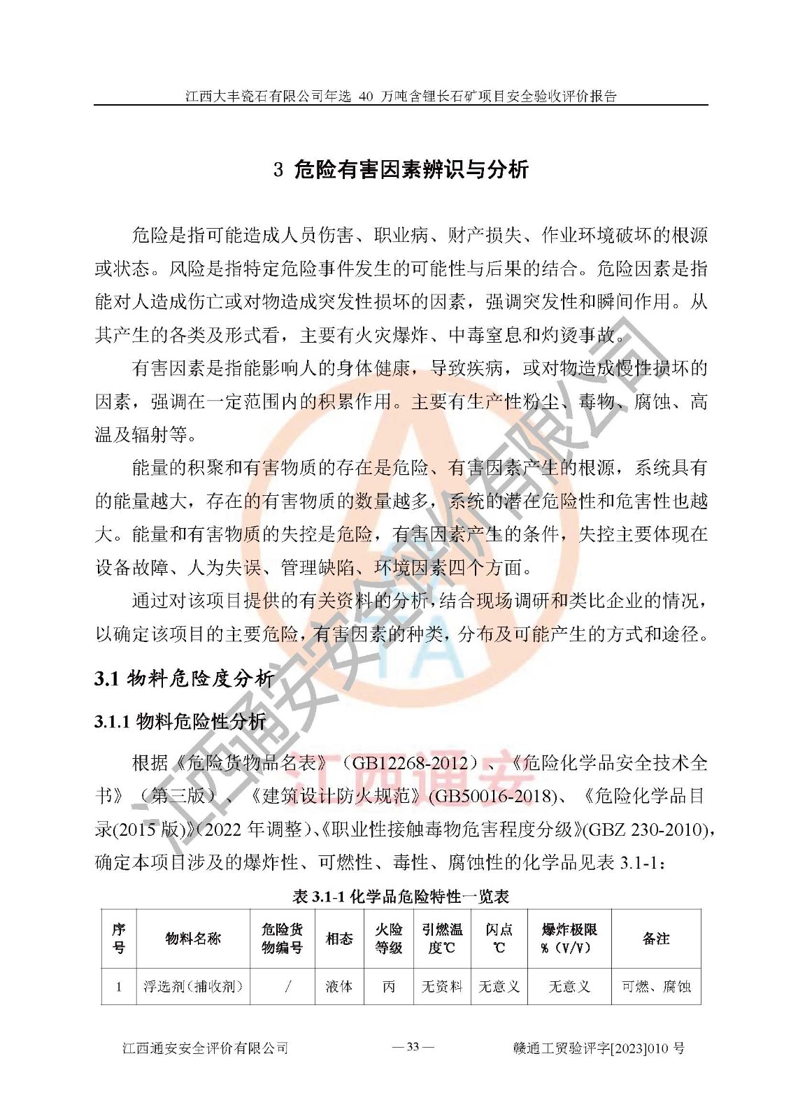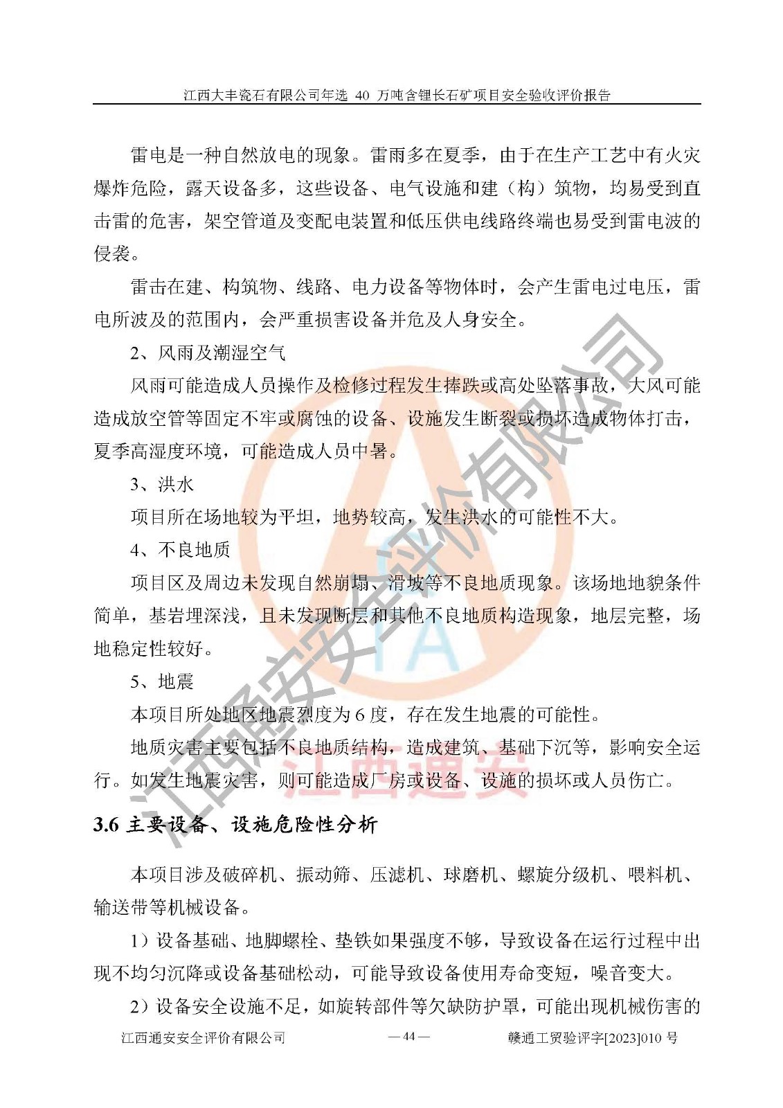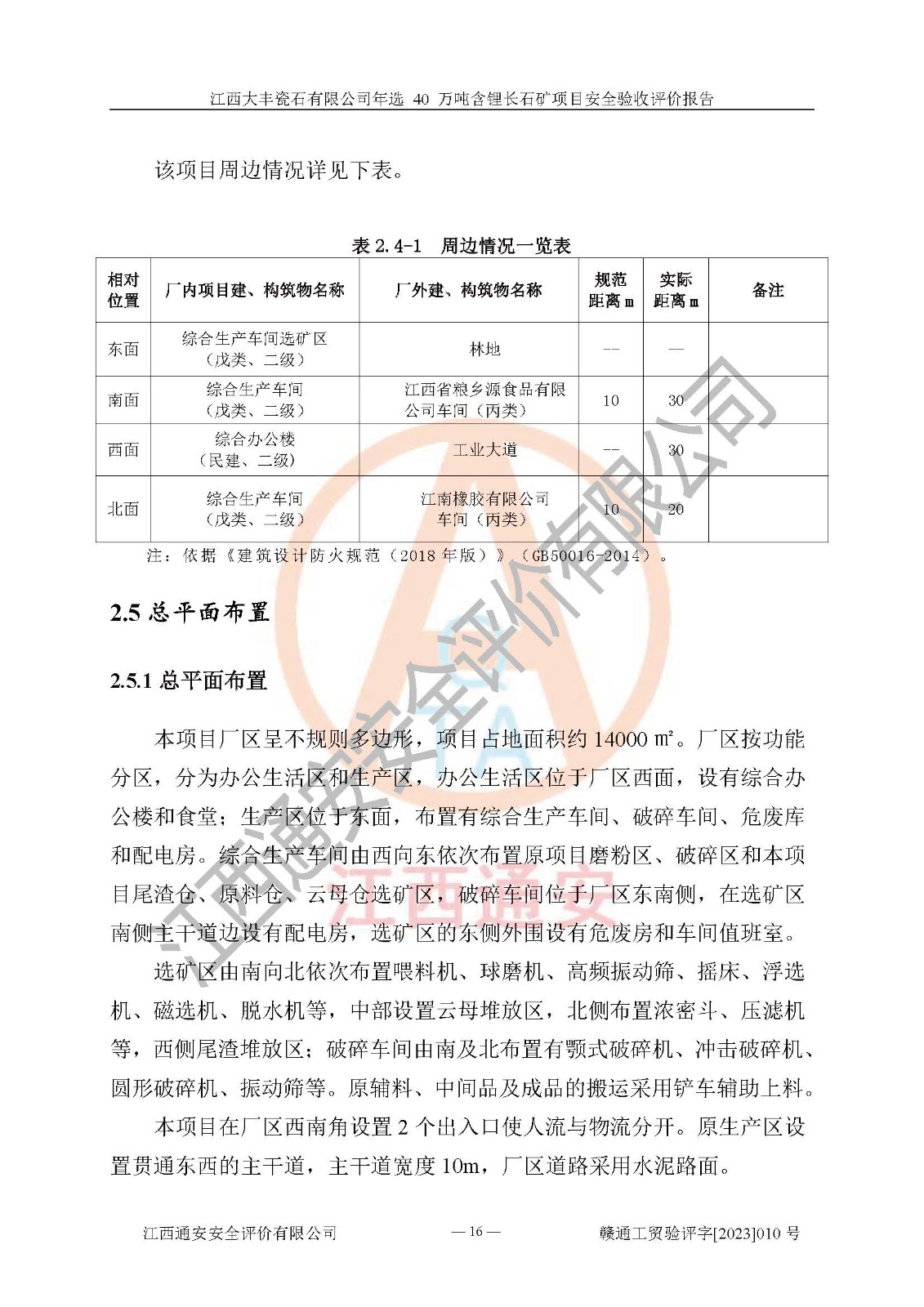 項(xiàng)目簡介 | 江西大豐瓷石有限公司成立于2000年05月12日,統(tǒng)一社會信用代碼:91360924716530656C,注冊地址江西宜豐良崗工業(yè)園內(nèi),注冊資金貳佰陸拾萬元整,經(jīng)營范圍:加工、銷售瓷石、長石、滑石、硅灰石、瓷土、高嶺土、石英、黏土、方解石、透輝石、白云石、石灰石;進(jìn)出口貿(mào)易(**限定公司經(jīng)營或禁止的進(jìn)出口商品除外)。本項(xiàng)目為年選 40 萬噸含鋰長石礦項(xiàng)目,總投資3000萬元。 江西大豐瓷石有限公司于2016年前后建設(shè)投產(chǎn)了江西大豐瓷石有限公司年產(chǎn)6萬噸瓷土加工銷售項(xiàng)目,為宜春市陶瓷產(chǎn)業(yè)提供優(yōu)質(zhì)的瓷土粉原料。為了適應(yīng)市場需求以及公司更好的發(fā)展,從鋰長石礦中提取優(yōu)質(zhì)的鋰云母資源,江西大豐瓷石有限公司決定在原廠區(qū)內(nèi)空地上擴(kuò)建“江西大豐瓷石有限公司年選 40 萬噸含鋰長石礦項(xiàng)目”。本次擴(kuò)建主要增加鋰云母提取工藝,為宜春市各鋰電產(chǎn)業(yè)提供優(yōu)質(zhì)的鋰云母原料。 本項(xiàng)目于2022年03月10日在宜豐縣發(fā)展和改革委員會備案,取得《江西省企業(yè)投資項(xiàng)目備案通知書》(宜豐縣發(fā)展和改革委員會,項(xiàng)目統(tǒng)一代碼為:2111-360924-04-01-606077),2022年10月組織技術(shù)人員編制了《江西大豐瓷石有限公司年選 40萬噸含鋰長石礦項(xiàng)目選址安全條件論證報(bào)告》,2022年12月委托中裕工程集團(tuán)有限公司編制了《江西大豐瓷石有限公司年選40萬噸含鋰長石礦項(xiàng)目安全設(shè)施設(shè)計(jì)》。本項(xiàng)目外購含鋰長石礦,通過破碎、球磨、磁選、浮選、濃密、脫水等工藝后*終產(chǎn)出鋰云母精礦粉、長石粉及尾泥。其中在生產(chǎn)工藝中主要涉及的化學(xué)品為聚丙烯酸酰胺、浮選劑,檢維修工序使用到的氧氣、乙炔以及裝載車和叉車使用到的燃料柴油。經(jīng)辨識,該項(xiàng)目不構(gòu)成危險(xiǎn)品重大危險(xiǎn)源。根據(jù)生產(chǎn)工藝特點(diǎn)及物料的理化特性可知,該項(xiàng)目生產(chǎn)過程中存在火災(zāi)、爆炸、機(jī)械傷害、灼燙、觸電、**傷害、高處墜落、坍塌、物體打擊、淹溺、中毒窒息、其他傷害等危險(xiǎn)有害因素。 | ||||