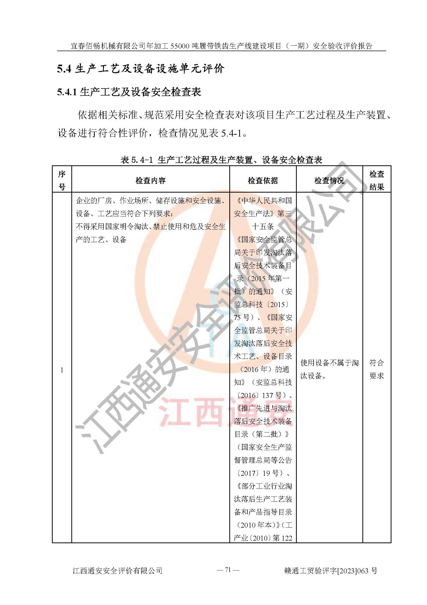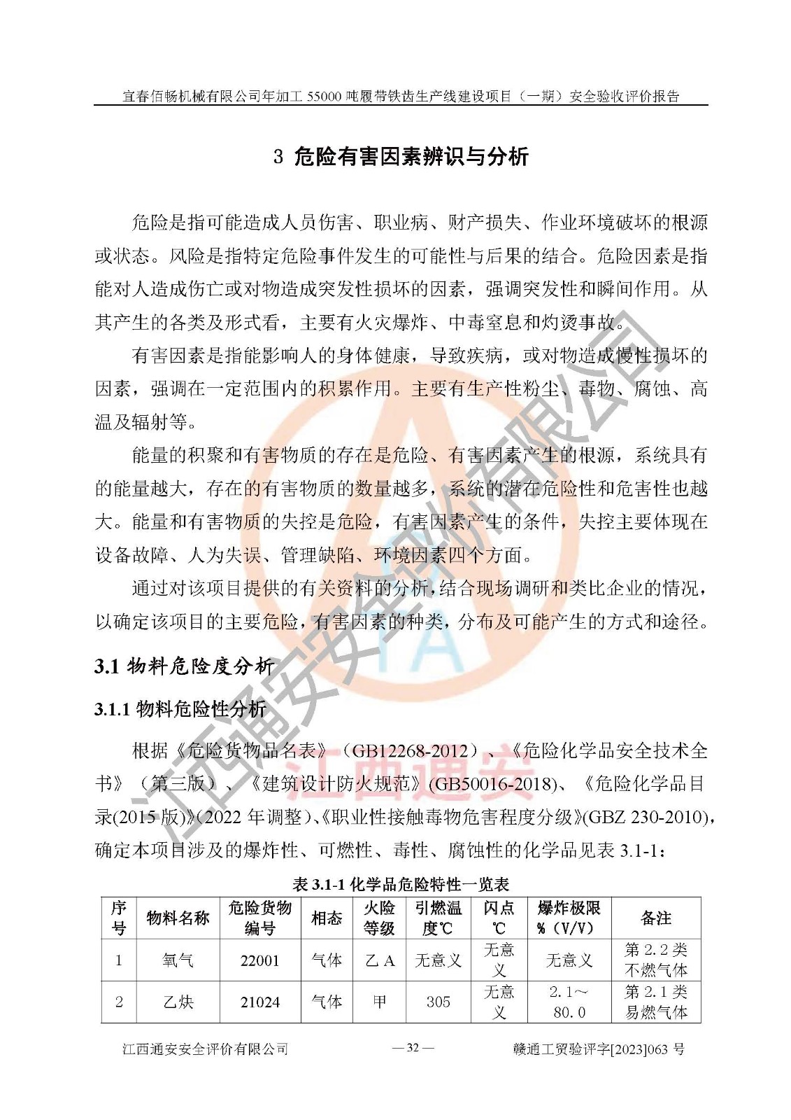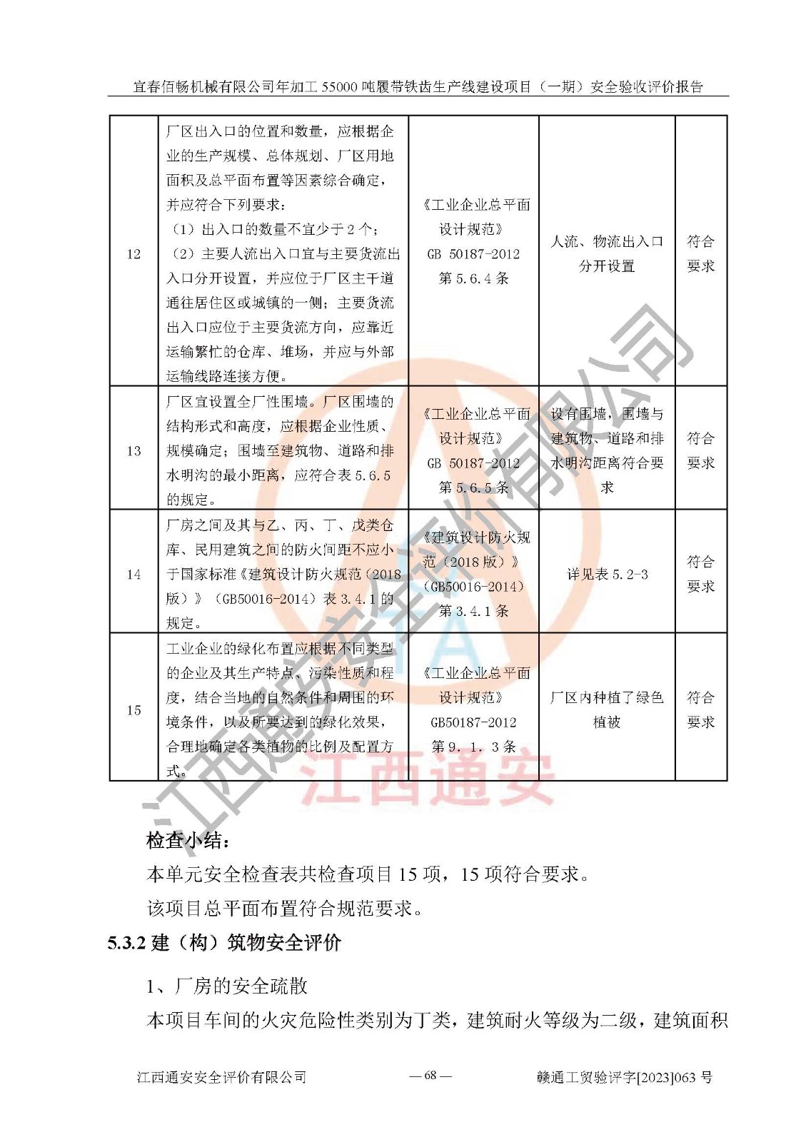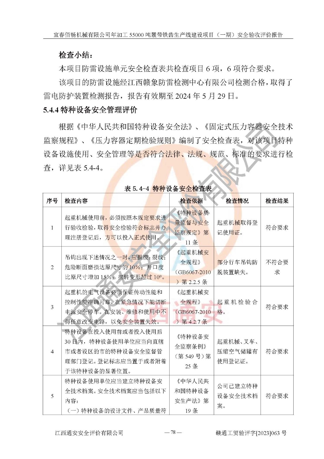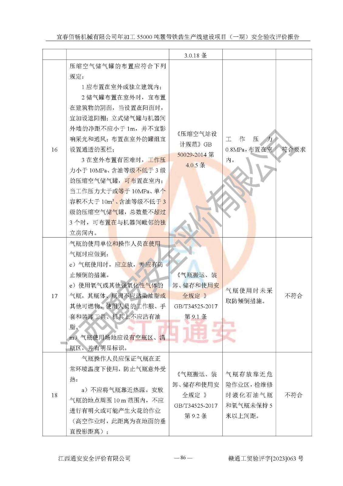 其它 | 根據(jù)《中華人民共和國(guó)安全生產(chǎn)法》、《新建項(xiàng)目安全設(shè)施“三同時(shí)”監(jiān)督管理辦法》(原**安全生產(chǎn)監(jiān)督管理總局令第77號(hào)修訂)等法律法規(guī)的要求,對(duì)宜春佰暢機(jī)械有限公司年加工55000噸履帶鐵齒生產(chǎn)線建設(shè)項(xiàng)目(一期)安全驗(yàn)收的基本條件進(jìn)行分析,結(jié)果如下: 1)本項(xiàng)目在初步設(shè)計(jì)及建設(shè)過程中基本能貫徹執(zhí)行**、地方及有關(guān)部門的安全生產(chǎn)法律法規(guī)、標(biāo)準(zhǔn)要求,取得了**相關(guān)部門的許可、備案。項(xiàng)目的設(shè)計(jì)、施工、監(jiān)理等單位均有相應(yīng)資質(zhì)。 2)本項(xiàng)目址選符合要求;總平面布置合理,主要建筑的防火間距符合符合《建筑設(shè)計(jì)防火規(guī)范(2018版)》(GB50016-2014)、《工業(yè)企業(yè)總平面設(shè)計(jì)規(guī)范》(GB50187-2012)有關(guān)規(guī)范、標(biāo)準(zhǔn)的要求。 3)本項(xiàng)目生產(chǎn)工藝成熟、試運(yùn)行正常,試運(yùn)行中過程中工藝和裝置、設(shè)備(設(shè)施)安全、可靠,未發(fā)生安全事故。 4)本項(xiàng)目的特種設(shè)備由有資質(zhì)單位設(shè)計(jì)、制造、安裝,特種設(shè)備經(jīng)宜春市特種設(shè)備檢驗(yàn)中心檢驗(yàn)合格,符合《中華人民共和國(guó)特種設(shè)備安全法》、《特種設(shè)備安全監(jiān)察條例》(中華人民共和國(guó)***令第549號(hào))的規(guī)定。特種設(shè)備作業(yè)人員、特種作業(yè)人員均持證上崗。 5)公司主要負(fù)責(zé)人及安全管理人員取得了上高縣毅興人力資源有限公司頒發(fā)的培訓(xùn)證書,特種作業(yè)人員操作證在**期內(nèi),其他從業(yè)人員經(jīng)安全培訓(xùn)符合,取得上崗證。符合要求。 6)公司建立有安全管理制度,制定有各類人員的安全生產(chǎn)責(zé)任制、各項(xiàng)安全管理制度和操作規(guī)程。按照**有關(guān)規(guī)定編制了事故應(yīng)急救援預(yù)案并進(jìn)行了備案,并定期進(jìn)行演練等,符合要求。 7)本項(xiàng)目作業(yè)條件危險(xiǎn)性分析結(jié)果:在選定的單元的危險(xiǎn)程度均為“一般危險(xiǎn),需要注意”或“稍有危險(xiǎn),可以接受”,作業(yè)條件相對(duì)安全。 評(píng)價(jià)結(jié)論: 宜春佰暢機(jī)械有限公司年加工55000噸履帶鐵齒生產(chǎn)線建設(shè)項(xiàng)目(一期)的安全設(shè)施及安全管理符合**及有關(guān)部門關(guān)于安全生產(chǎn)法律、法規(guī)、標(biāo)準(zhǔn)的要求,該項(xiàng)目試生產(chǎn)以來,工藝設(shè)備、安全設(shè)施及企業(yè)安全管理機(jī)制等運(yùn)行正常,安全設(shè)施、措施達(dá)到設(shè)計(jì)要求和預(yù)期結(jié)果,可以滿足建設(shè)項(xiàng)目安全生產(chǎn)的要求,安全生產(chǎn)管理**,具備竣工驗(yàn)收條件。 | ||||