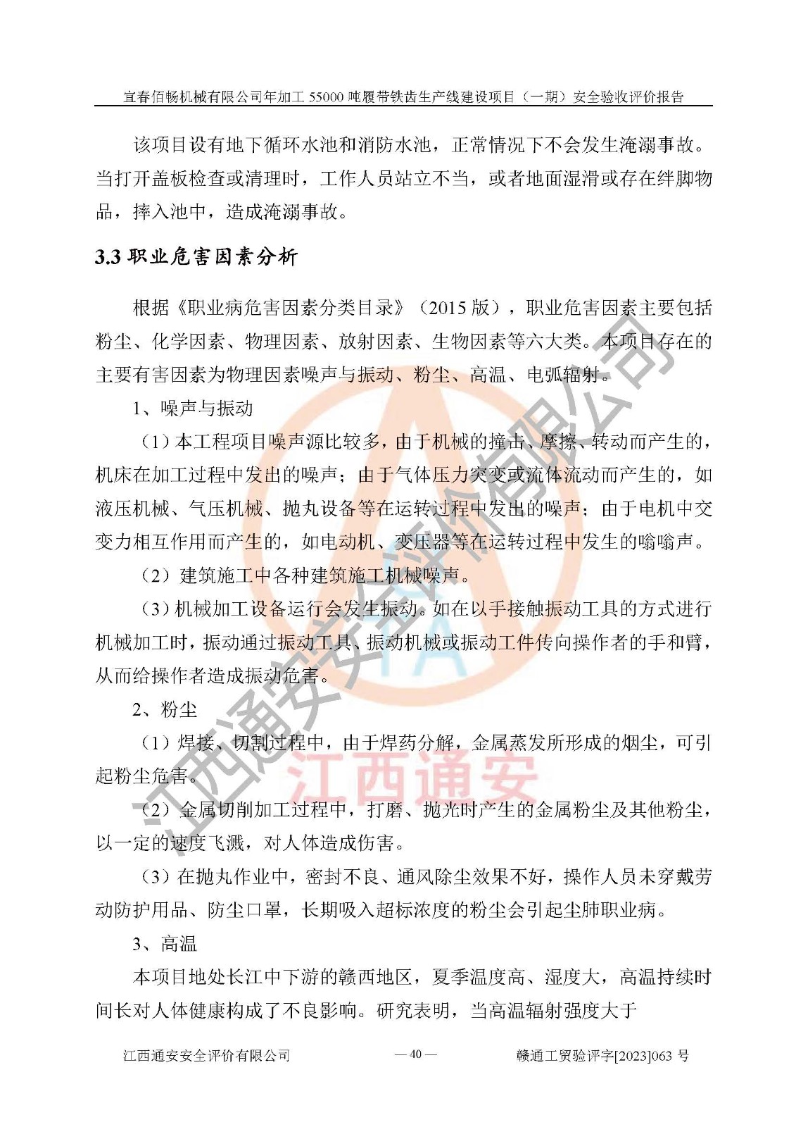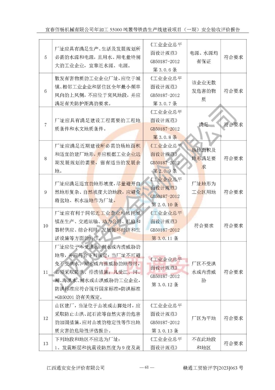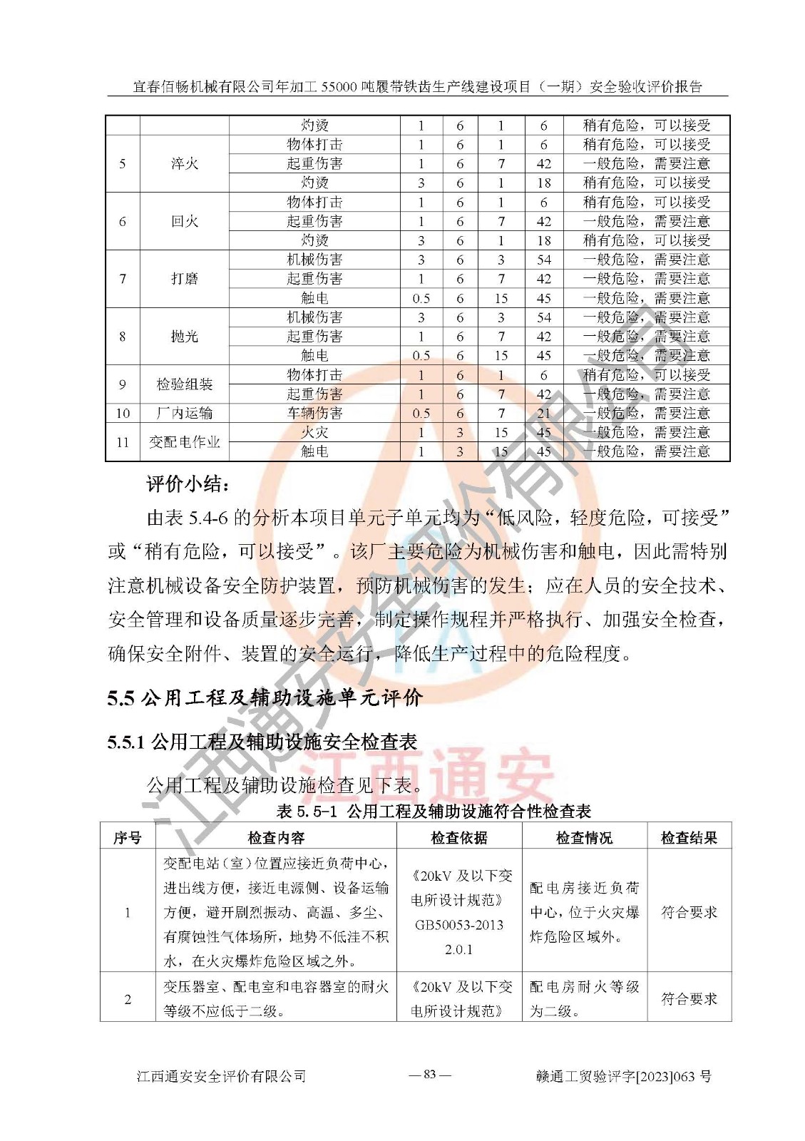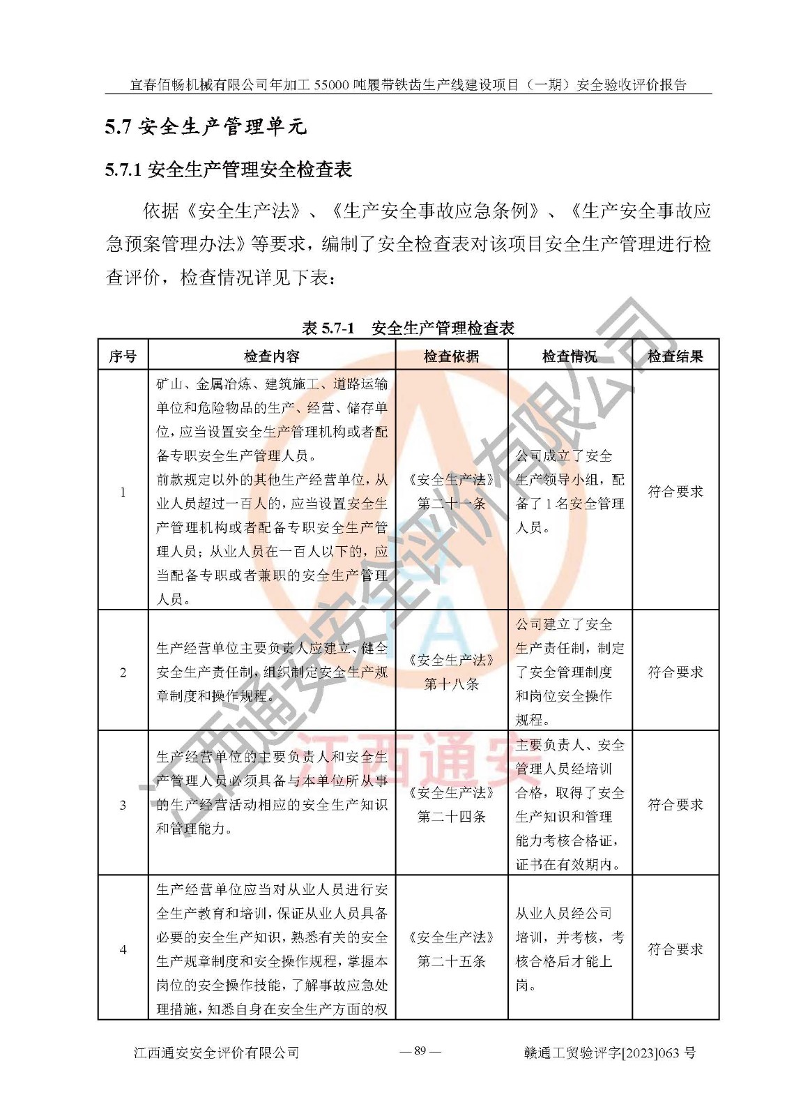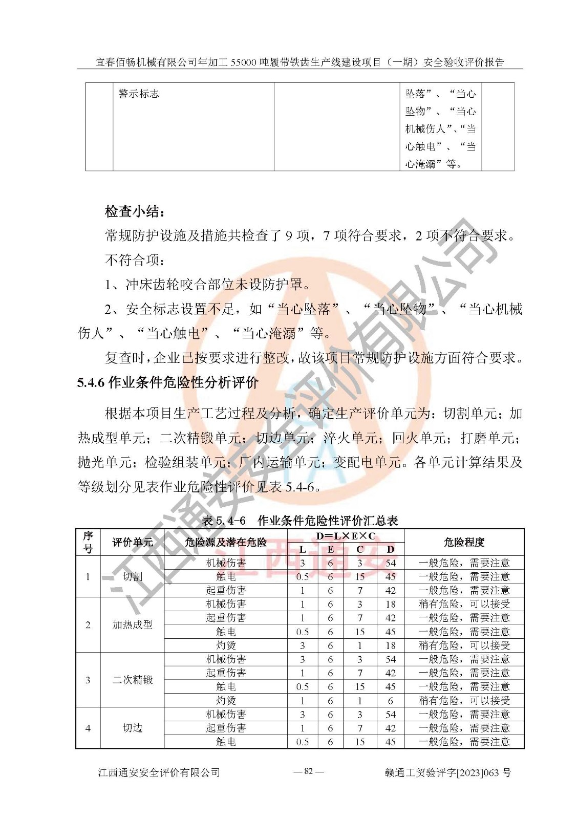 其它 | 根據(jù)《中華人民共和國(guó)安全生產(chǎn)法》、《新建項(xiàng)目安全設(shè)施“三同時(shí)”監(jiān)督管理辦法》(原**安全生產(chǎn)監(jiān)督管理總局令第77號(hào)修訂)等法律法規(guī)的要求,對(duì)宜春佰暢機(jī)械有限公司年加工55000噸履帶鐵齒生產(chǎn)線建設(shè)項(xiàng)目(一期)安全驗(yàn)收的基本條件進(jìn)行分析,結(jié)果如下: 1)本項(xiàng)目在初步設(shè)計(jì)及建設(shè)過程中基本能貫徹執(zhí)行**、地方及有關(guān)部門的安全生產(chǎn)法律法規(guī)、標(biāo)準(zhǔn)要求,取得了**相關(guān)部門的許可、備案。項(xiàng)目的設(shè)計(jì)、施工、監(jiān)理等單位均有相應(yīng)資質(zhì)。 2)本項(xiàng)目址選符合要求;總平面布置合理,主要建筑的防火間距符合符合《建筑設(shè)計(jì)防火規(guī)范(2018版)》(GB50016-2014)、《工業(yè)企業(yè)總平面設(shè)計(jì)規(guī)范》(GB50187-2012)有關(guān)規(guī)范、標(biāo)準(zhǔn)的要求。 3)本項(xiàng)目生產(chǎn)工藝成熟、試運(yùn)行正常,試運(yùn)行中過程中工藝和裝置、設(shè)備(設(shè)施)安全、可靠,未發(fā)生安全事故。 4)本項(xiàng)目的特種設(shè)備由有資質(zhì)單位設(shè)計(jì)、制造、安裝,特種設(shè)備經(jīng)宜春市特種設(shè)備檢驗(yàn)中心檢驗(yàn)合格,符合《中華人民共和國(guó)特種設(shè)備安全法》、《特種設(shè)備安全監(jiān)察條例》(中華人民共和國(guó)***令第549號(hào))的規(guī)定。特種設(shè)備作業(yè)人員、特種作業(yè)人員均持證上崗。 5)公司主要負(fù)責(zé)人及安全管理人員取得了上高縣毅興人力資源有限公司頒發(fā)的培訓(xùn)證書,特種作業(yè)人員操作證在**期內(nèi),其他從業(yè)人員經(jīng)安全培訓(xùn)符合,取得上崗證。符合要求。 6)公司建立有安全管理制度,制定有各類人員的安全生產(chǎn)責(zé)任制、各項(xiàng)安全管理制度和操作規(guī)程。按照**有關(guān)規(guī)定編制了事故應(yīng)急救援預(yù)案并進(jìn)行了備案,并定期進(jìn)行演練等,符合要求。 7)本項(xiàng)目作業(yè)條件危險(xiǎn)性分析結(jié)果:在選定的單元的危險(xiǎn)程度均為“一般危險(xiǎn),需要注意”或“稍有危險(xiǎn),可以接受”,作業(yè)條件相對(duì)安全。 評(píng)價(jià)結(jié)論: 宜春佰暢機(jī)械有限公司年加工55000噸履帶鐵齒生產(chǎn)線建設(shè)項(xiàng)目(一期)的安全設(shè)施及安全管理符合**及有關(guān)部門關(guān)于安全生產(chǎn)法律、法規(guī)、標(biāo)準(zhǔn)的要求,該項(xiàng)目試生產(chǎn)以來,工藝設(shè)備、安全設(shè)施及企業(yè)安全管理機(jī)制等運(yùn)行正常,安全設(shè)施、措施達(dá)到設(shè)計(jì)要求和預(yù)期結(jié)果,可以滿足建設(shè)項(xiàng)目安全生產(chǎn)的要求,安全生產(chǎn)管理**,具備竣工驗(yàn)收條件。 | ||||