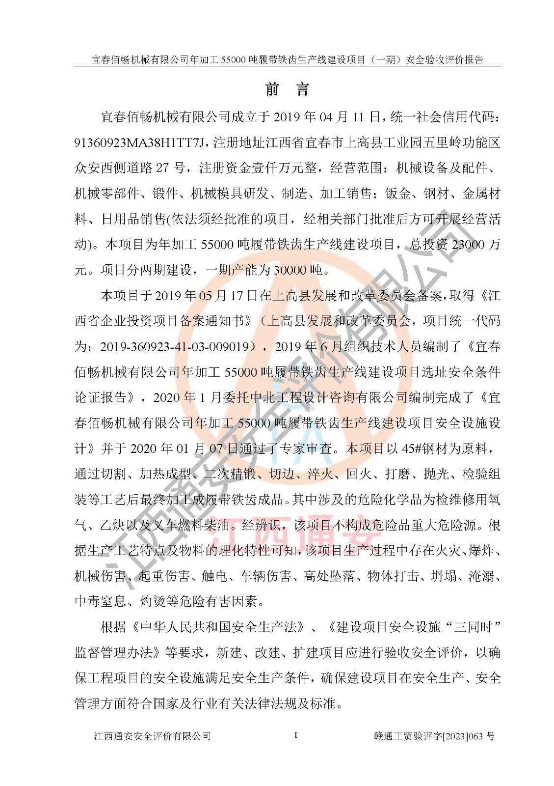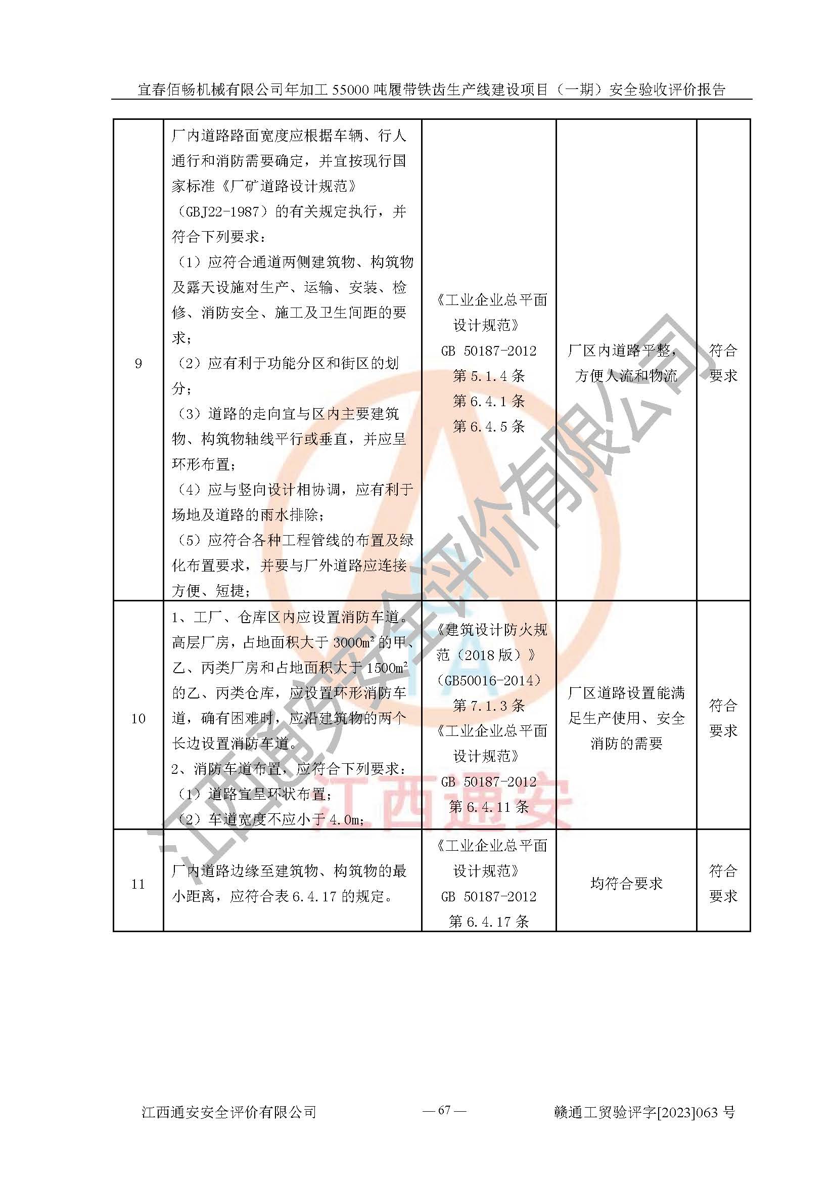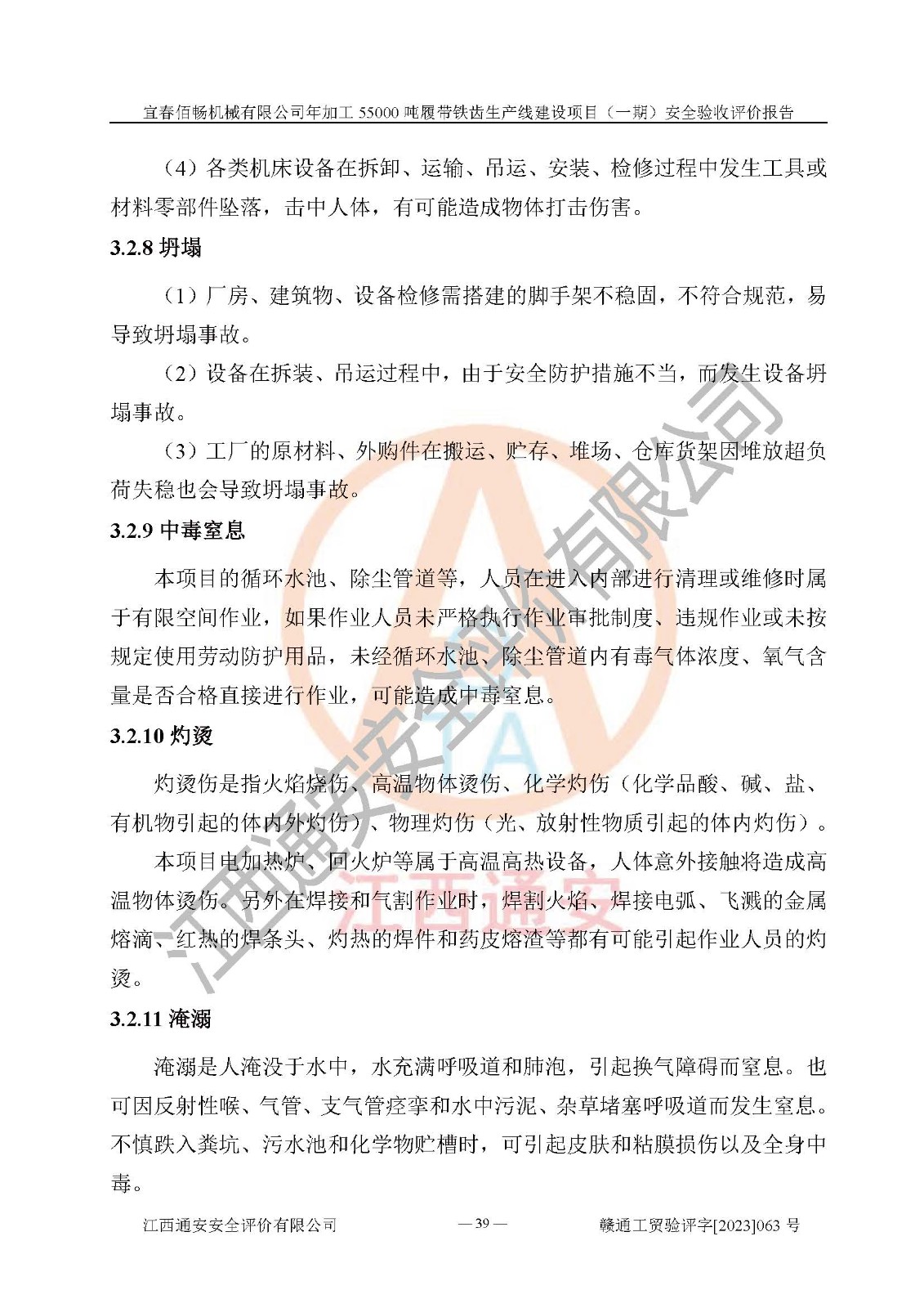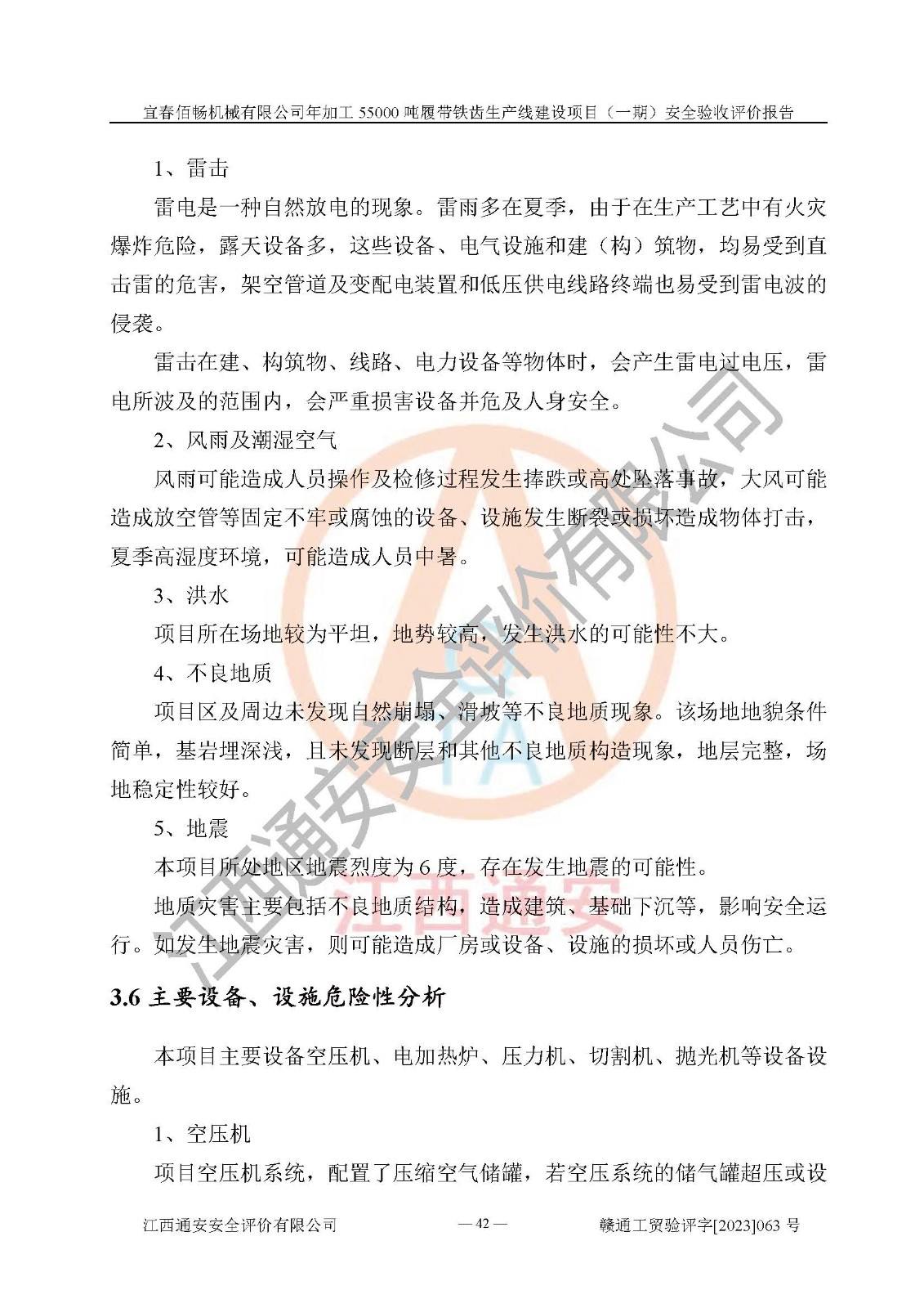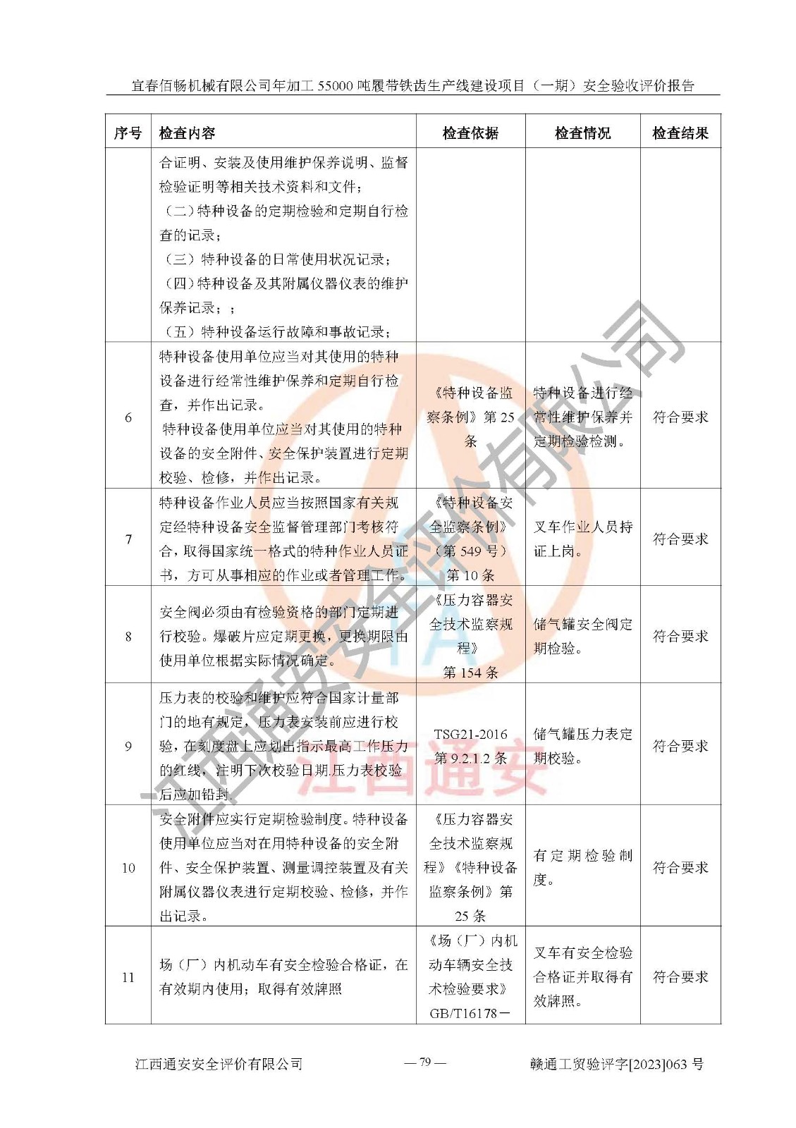 其它 | 根據(jù)《中華人民共和國(guó)安全生產(chǎn)法》、《新建項(xiàng)目安全設(shè)施“三同時(shí)”監(jiān)督管理辦法》(原**安全生產(chǎn)監(jiān)督管理總局令第77號(hào)修訂)等法律法規(guī)的要求,對(duì)宜春佰暢機(jī)械有限公司年加工55000噸履帶鐵齒生產(chǎn)線建設(shè)項(xiàng)目(一期)安全驗(yàn)收的基本條件進(jìn)行分析,結(jié)果如下: 1)本項(xiàng)目在初步設(shè)計(jì)及建設(shè)過程中基本能貫徹執(zhí)行**、地方及有關(guān)部門的安全生產(chǎn)法律法規(guī)、標(biāo)準(zhǔn)要求,取得了**相關(guān)部門的許可、備案。項(xiàng)目的設(shè)計(jì)、施工、監(jiān)理等單位均有相應(yīng)資質(zhì)。 2)本項(xiàng)目址選符合要求;總平面布置合理,主要建筑的防火間距符合符合《建筑設(shè)計(jì)防火規(guī)范(2018版)》(GB50016-2014)、《工業(yè)企業(yè)總平面設(shè)計(jì)規(guī)范》(GB50187-2012)有關(guān)規(guī)范、標(biāo)準(zhǔn)的要求。 3)本項(xiàng)目生產(chǎn)工藝成熟、試運(yùn)行正常,試運(yùn)行中過程中工藝和裝置、設(shè)備(設(shè)施)安全、可靠,未發(fā)生安全事故。 4)本項(xiàng)目的特種設(shè)備由有資質(zhì)單位設(shè)計(jì)、制造、安裝,特種設(shè)備經(jīng)宜春市特種設(shè)備檢驗(yàn)中心檢驗(yàn)合格,符合《中華人民共和國(guó)特種設(shè)備安全法》、《特種設(shè)備安全監(jiān)察條例》(中華人民共和國(guó)***令第549號(hào))的規(guī)定。特種設(shè)備作業(yè)人員、特種作業(yè)人員均持證上崗。 5)公司主要負(fù)責(zé)人及安全管理人員取得了上高縣毅興人力資源有限公司頒發(fā)的培訓(xùn)證書,特種作業(yè)人員操作證在**期內(nèi),其他從業(yè)人員經(jīng)安全培訓(xùn)符合,取得上崗證。符合要求。 6)公司建立有安全管理制度,制定有各類人員的安全生產(chǎn)責(zé)任制、各項(xiàng)安全管理制度和操作規(guī)程。按照**有關(guān)規(guī)定編制了事故應(yīng)急救援預(yù)案并進(jìn)行了備案,并定期進(jìn)行演練等,符合要求。 7)本項(xiàng)目作業(yè)條件危險(xiǎn)性分析結(jié)果:在選定的單元的危險(xiǎn)程度均為“一般危險(xiǎn),需要注意”或“稍有危險(xiǎn),可以接受”,作業(yè)條件相對(duì)安全。 評(píng)價(jià)結(jié)論: 宜春佰暢機(jī)械有限公司年加工55000噸履帶鐵齒生產(chǎn)線建設(shè)項(xiàng)目(一期)的安全設(shè)施及安全管理符合**及有關(guān)部門關(guān)于安全生產(chǎn)法律、法規(guī)、標(biāo)準(zhǔn)的要求,該項(xiàng)目試生產(chǎn)以來,工藝設(shè)備、安全設(shè)施及企業(yè)安全管理機(jī)制等運(yùn)行正常,安全設(shè)施、措施達(dá)到設(shè)計(jì)要求和預(yù)期結(jié)果,可以滿足建設(shè)項(xiàng)目安全生產(chǎn)的要求,安全生產(chǎn)管理**,具備竣工驗(yàn)收條件。 | ||||