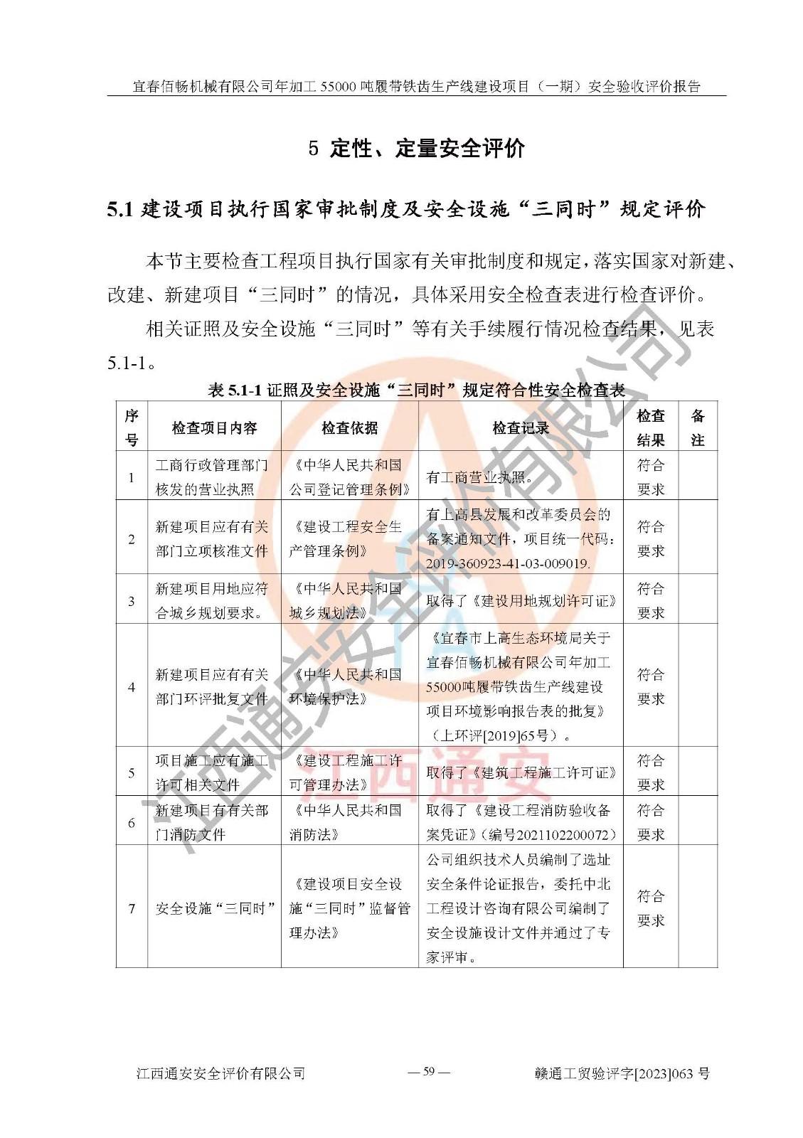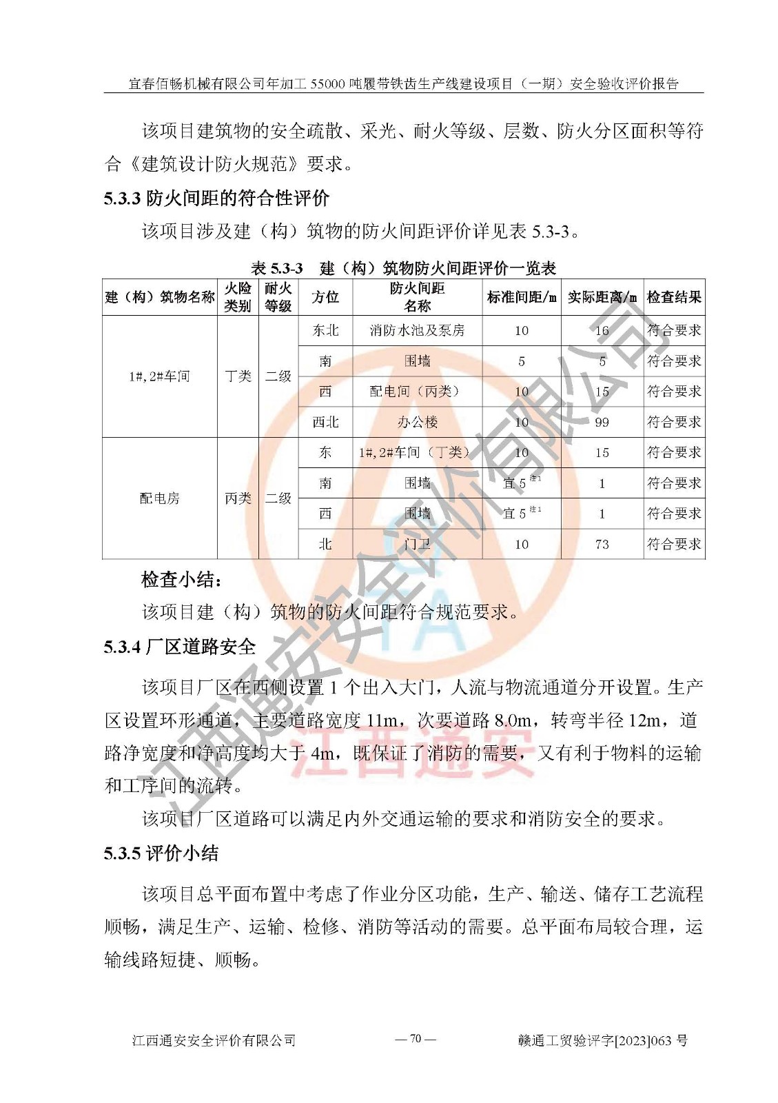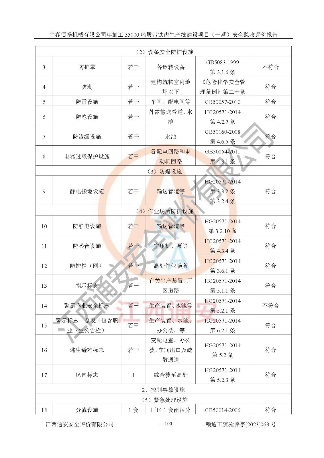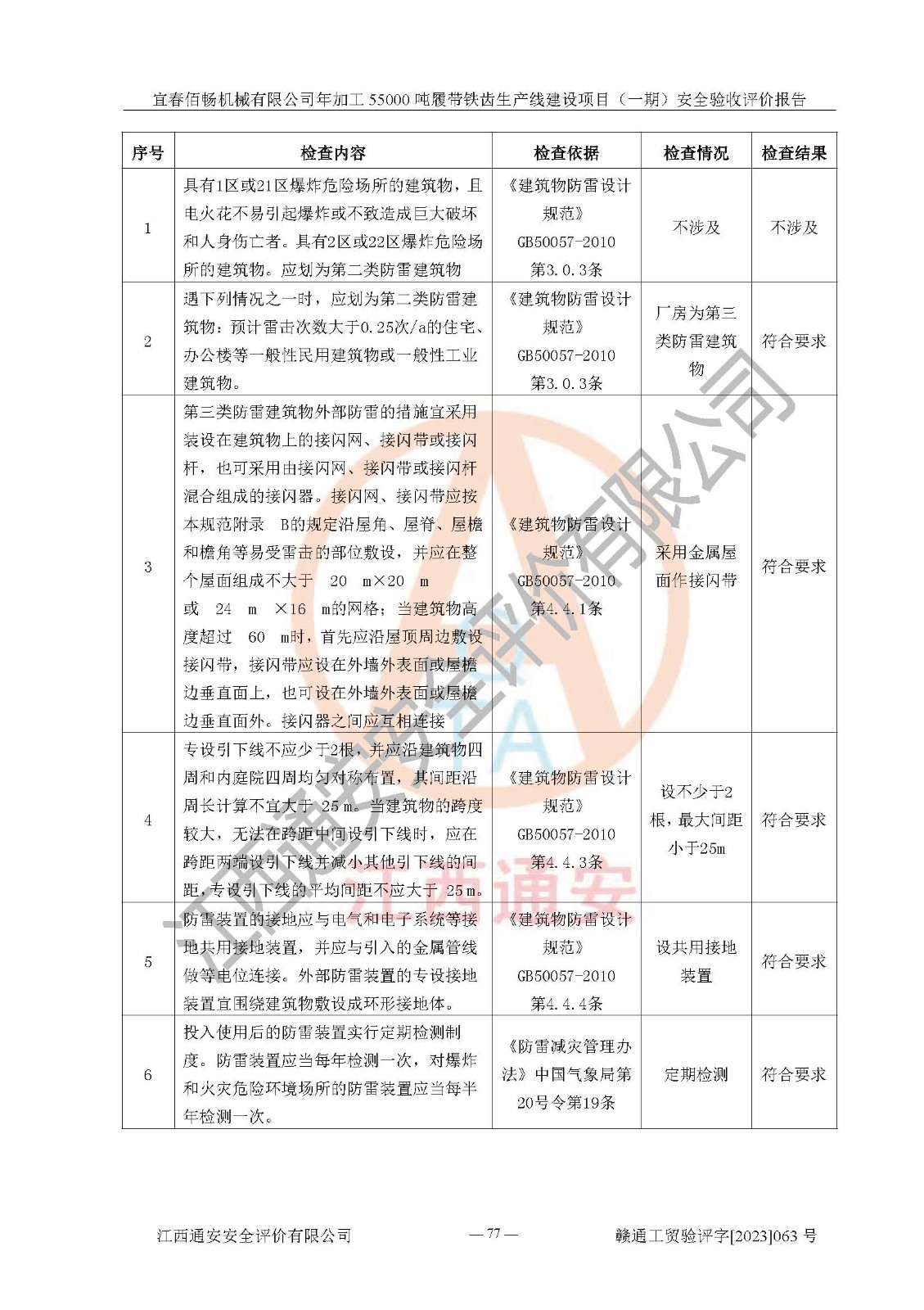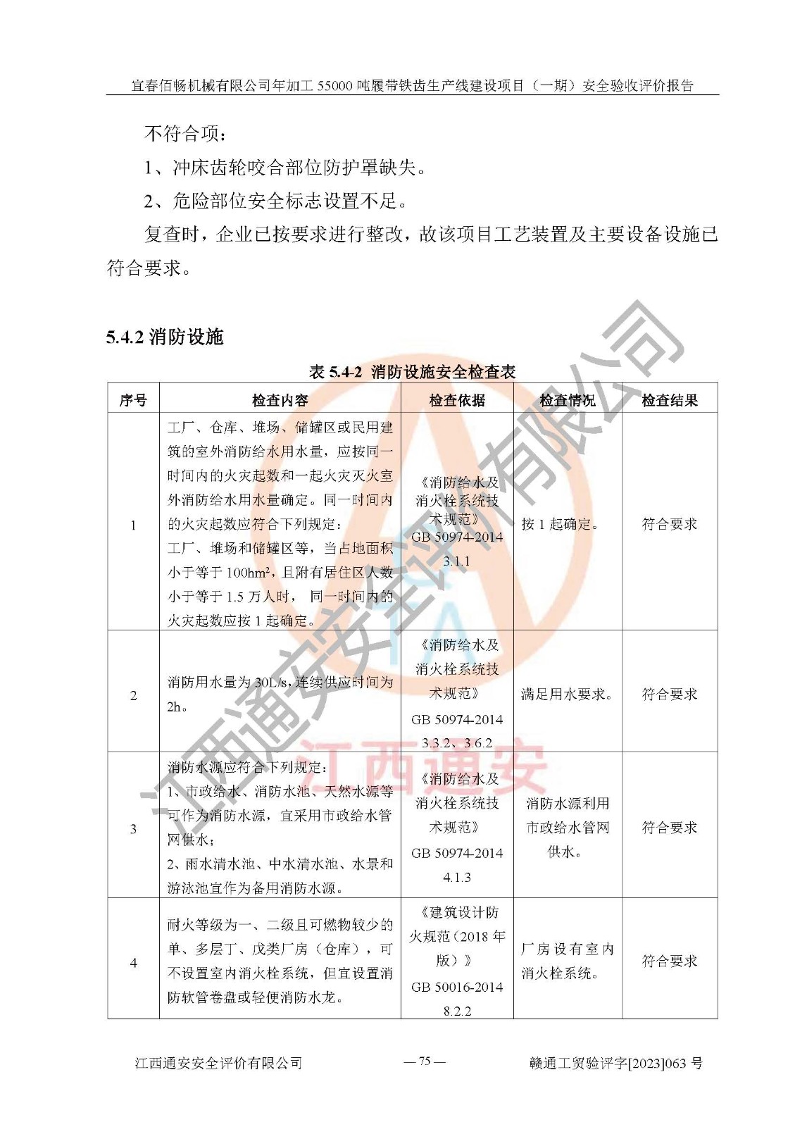 其它 | 根據(jù)《中華人民共和國(guó)安全生產(chǎn)法》、《新建項(xiàng)目安全設(shè)施“三同時(shí)”監(jiān)督管理辦法》(原**安全生產(chǎn)監(jiān)督管理總局令第77號(hào)修訂)等法律法規(guī)的要求,對(duì)宜春佰暢機(jī)械有限公司年加工55000噸履帶鐵齒生產(chǎn)線建設(shè)項(xiàng)目(一期)安全驗(yàn)收的基本條件進(jìn)行分析,結(jié)果如下: 1)本項(xiàng)目在初步設(shè)計(jì)及建設(shè)過程中基本能貫徹執(zhí)行**、地方及有關(guān)部門的安全生產(chǎn)法律法規(guī)、標(biāo)準(zhǔn)要求,取得了**相關(guān)部門的許可、備案。項(xiàng)目的設(shè)計(jì)、施工、監(jiān)理等單位均有相應(yīng)資質(zhì)。 2)本項(xiàng)目址選符合要求;總平面布置合理,主要建筑的防火間距符合符合《建筑設(shè)計(jì)防火規(guī)范(2018版)》(GB50016-2014)、《工業(yè)企業(yè)總平面設(shè)計(jì)規(guī)范》(GB50187-2012)有關(guān)規(guī)范、標(biāo)準(zhǔn)的要求。 3)本項(xiàng)目生產(chǎn)工藝成熟、試運(yùn)行正常,試運(yùn)行中過程中工藝和裝置、設(shè)備(設(shè)施)安全、可靠,未發(fā)生安全事故。 4)本項(xiàng)目的特種設(shè)備由有資質(zhì)單位設(shè)計(jì)、制造、安裝,特種設(shè)備經(jīng)宜春市特種設(shè)備檢驗(yàn)中心檢驗(yàn)合格,符合《中華人民共和國(guó)特種設(shè)備安全法》、《特種設(shè)備安全監(jiān)察條例》(中華人民共和國(guó)***令第549號(hào))的規(guī)定。特種設(shè)備作業(yè)人員、特種作業(yè)人員均持證上崗。 5)公司主要負(fù)責(zé)人及安全管理人員取得了上高縣毅興人力資源有限公司頒發(fā)的培訓(xùn)證書,特種作業(yè)人員操作證在**期內(nèi),其他從業(yè)人員經(jīng)安全培訓(xùn)符合,取得上崗證。符合要求。 6)公司建立有安全管理制度,制定有各類人員的安全生產(chǎn)責(zé)任制、各項(xiàng)安全管理制度和操作規(guī)程。按照**有關(guān)規(guī)定編制了事故應(yīng)急救援預(yù)案并進(jìn)行了備案,并定期進(jìn)行演練等,符合要求。 7)本項(xiàng)目作業(yè)條件危險(xiǎn)性分析結(jié)果:在選定的單元的危險(xiǎn)程度均為“一般危險(xiǎn),需要注意”或“稍有危險(xiǎn),可以接受”,作業(yè)條件相對(duì)安全。 評(píng)價(jià)結(jié)論: 宜春佰暢機(jī)械有限公司年加工55000噸履帶鐵齒生產(chǎn)線建設(shè)項(xiàng)目(一期)的安全設(shè)施及安全管理符合**及有關(guān)部門關(guān)于安全生產(chǎn)法律、法規(guī)、標(biāo)準(zhǔn)的要求,該項(xiàng)目試生產(chǎn)以來,工藝設(shè)備、安全設(shè)施及企業(yè)安全管理機(jī)制等運(yùn)行正常,安全設(shè)施、措施達(dá)到設(shè)計(jì)要求和預(yù)期結(jié)果,可以滿足建設(shè)項(xiàng)目安全生產(chǎn)的要求,安全生產(chǎn)管理**,具備竣工驗(yàn)收條件。 | ||||