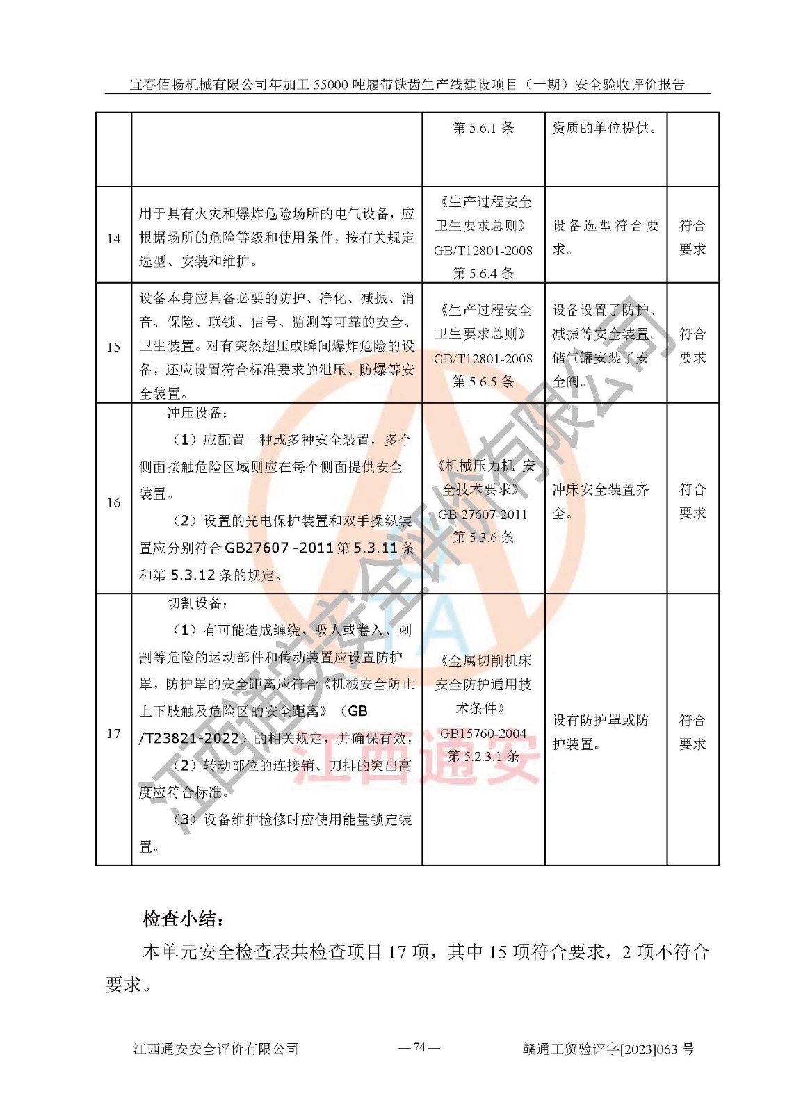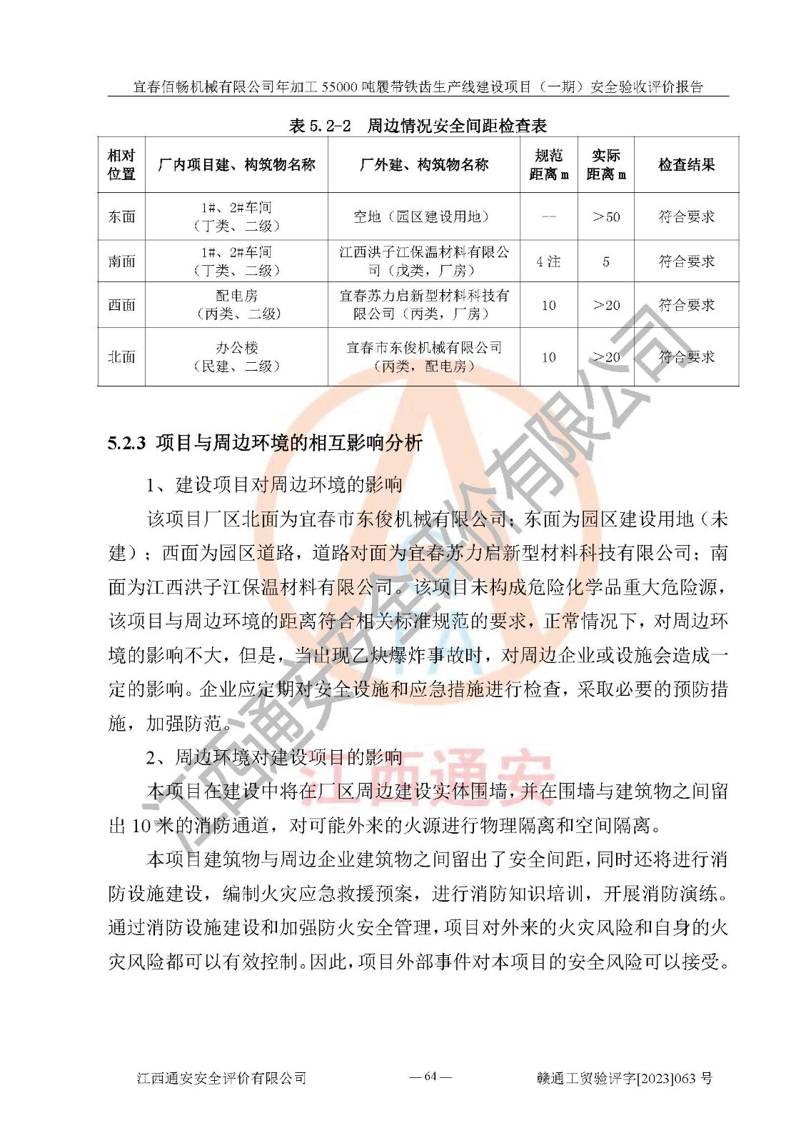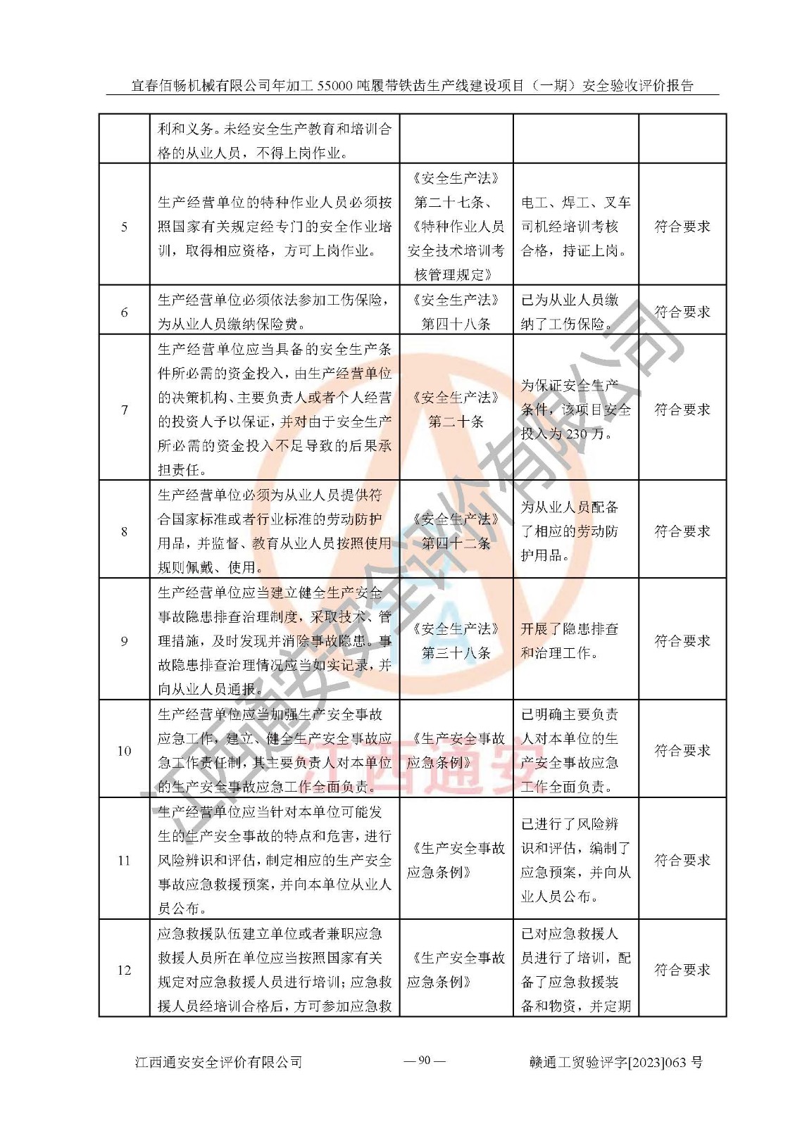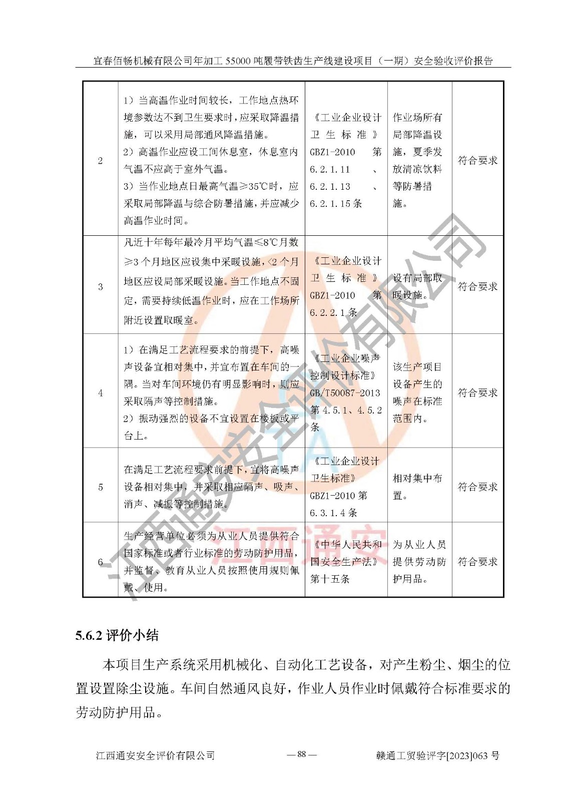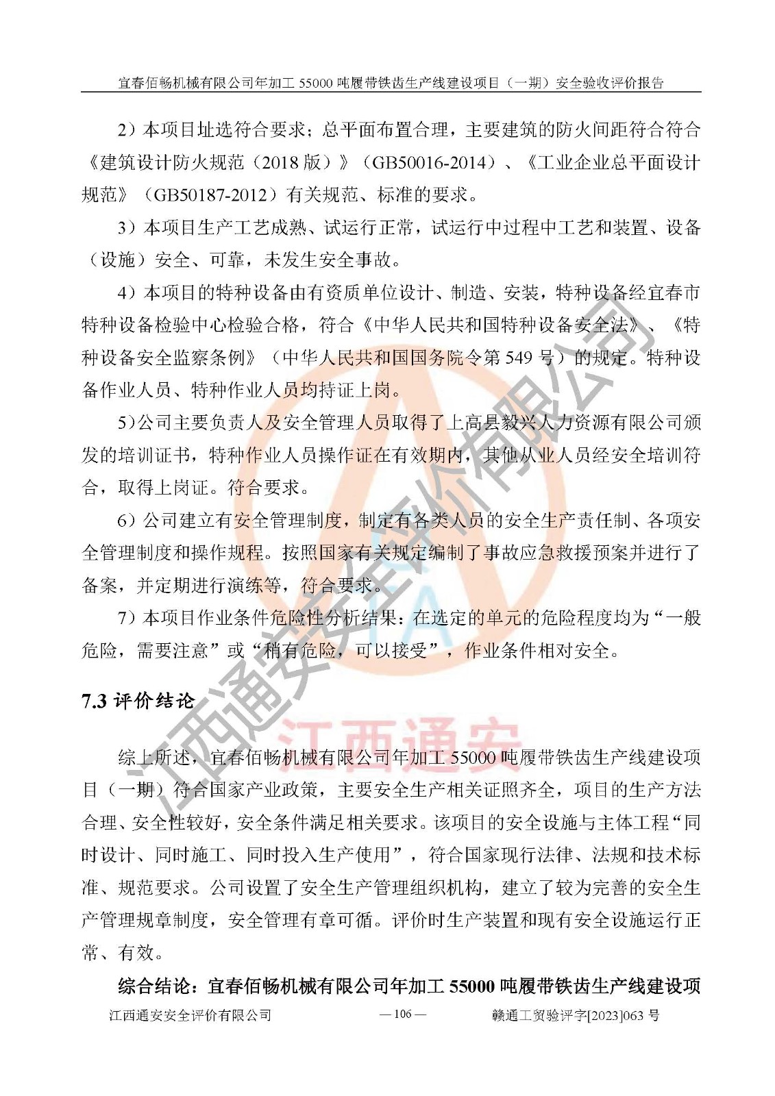 其它 | 根據(jù)《中華人民共和國(guó)安全生產(chǎn)法》、《新建項(xiàng)目安全設(shè)施“三同時(shí)”監(jiān)督管理辦法》(原**安全生產(chǎn)監(jiān)督管理總局令第77號(hào)修訂)等法律法規(guī)的要求,對(duì)宜春佰暢機(jī)械有限公司年加工55000噸履帶鐵齒生產(chǎn)線建設(shè)項(xiàng)目(一期)安全驗(yàn)收的基本條件進(jìn)行分析,結(jié)果如下: 1)本項(xiàng)目在初步設(shè)計(jì)及建設(shè)過程中基本能貫徹執(zhí)行**、地方及有關(guān)部門的安全生產(chǎn)法律法規(guī)、標(biāo)準(zhǔn)要求,取得了**相關(guān)部門的許可、備案。項(xiàng)目的設(shè)計(jì)、施工、監(jiān)理等單位均有相應(yīng)資質(zhì)。 2)本項(xiàng)目址選符合要求;總平面布置合理,主要建筑的防火間距符合符合《建筑設(shè)計(jì)防火規(guī)范(2018版)》(GB50016-2014)、《工業(yè)企業(yè)總平面設(shè)計(jì)規(guī)范》(GB50187-2012)有關(guān)規(guī)范、標(biāo)準(zhǔn)的要求。 3)本項(xiàng)目生產(chǎn)工藝成熟、試運(yùn)行正常,試運(yùn)行中過程中工藝和裝置、設(shè)備(設(shè)施)安全、可靠,未發(fā)生安全事故。 4)本項(xiàng)目的特種設(shè)備由有資質(zhì)單位設(shè)計(jì)、制造、安裝,特種設(shè)備經(jīng)宜春市特種設(shè)備檢驗(yàn)中心檢驗(yàn)合格,符合《中華人民共和國(guó)特種設(shè)備安全法》、《特種設(shè)備安全監(jiān)察條例》(中華人民共和國(guó)***令第549號(hào))的規(guī)定。特種設(shè)備作業(yè)人員、特種作業(yè)人員均持證上崗。 5)公司主要負(fù)責(zé)人及安全管理人員取得了上高縣毅興人力資源有限公司頒發(fā)的培訓(xùn)證書,特種作業(yè)人員操作證在**期內(nèi),其他從業(yè)人員經(jīng)安全培訓(xùn)符合,取得上崗證。符合要求。 6)公司建立有安全管理制度,制定有各類人員的安全生產(chǎn)責(zé)任制、各項(xiàng)安全管理制度和操作規(guī)程。按照**有關(guān)規(guī)定編制了事故應(yīng)急救援預(yù)案并進(jìn)行了備案,并定期進(jìn)行演練等,符合要求。 7)本項(xiàng)目作業(yè)條件危險(xiǎn)性分析結(jié)果:在選定的單元的危險(xiǎn)程度均為“一般危險(xiǎn),需要注意”或“稍有危險(xiǎn),可以接受”,作業(yè)條件相對(duì)安全。 評(píng)價(jià)結(jié)論: 宜春佰暢機(jī)械有限公司年加工55000噸履帶鐵齒生產(chǎn)線建設(shè)項(xiàng)目(一期)的安全設(shè)施及安全管理符合**及有關(guān)部門關(guān)于安全生產(chǎn)法律、法規(guī)、標(biāo)準(zhǔn)的要求,該項(xiàng)目試生產(chǎn)以來,工藝設(shè)備、安全設(shè)施及企業(yè)安全管理機(jī)制等運(yùn)行正常,安全設(shè)施、措施達(dá)到設(shè)計(jì)要求和預(yù)期結(jié)果,可以滿足建設(shè)項(xiàng)目安全生產(chǎn)的要求,安全生產(chǎn)管理**,具備竣工驗(yàn)收條件。 | ||||