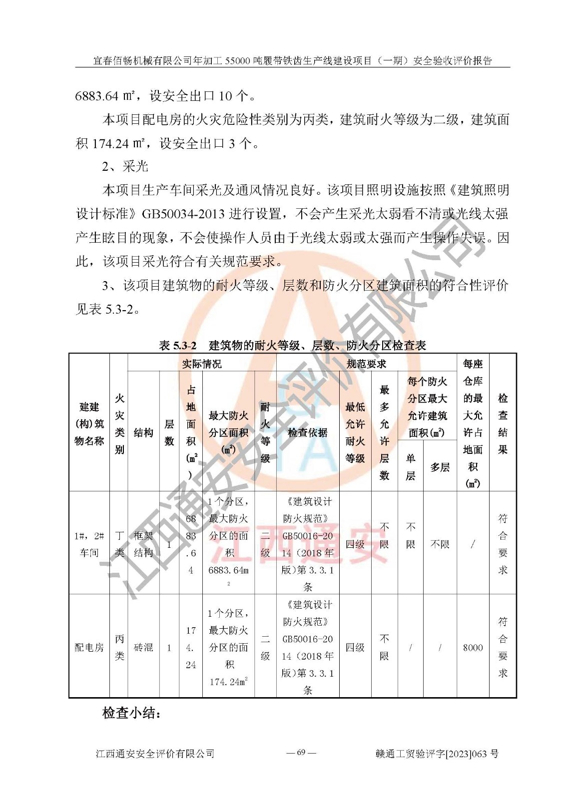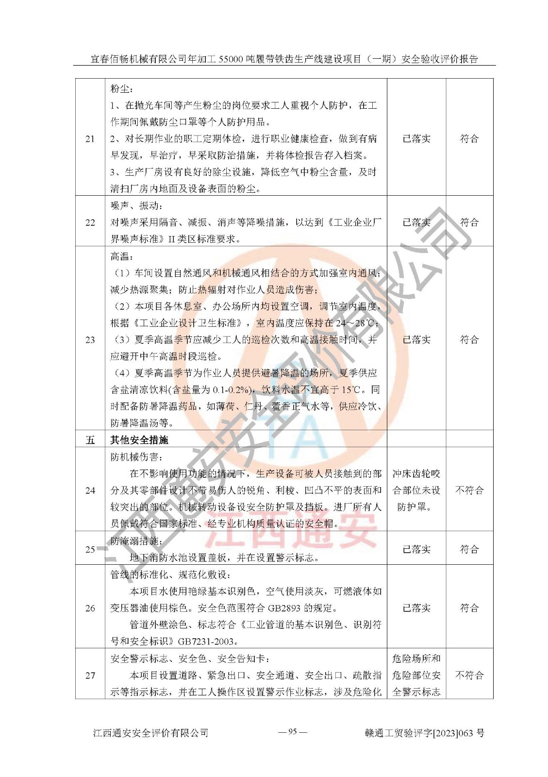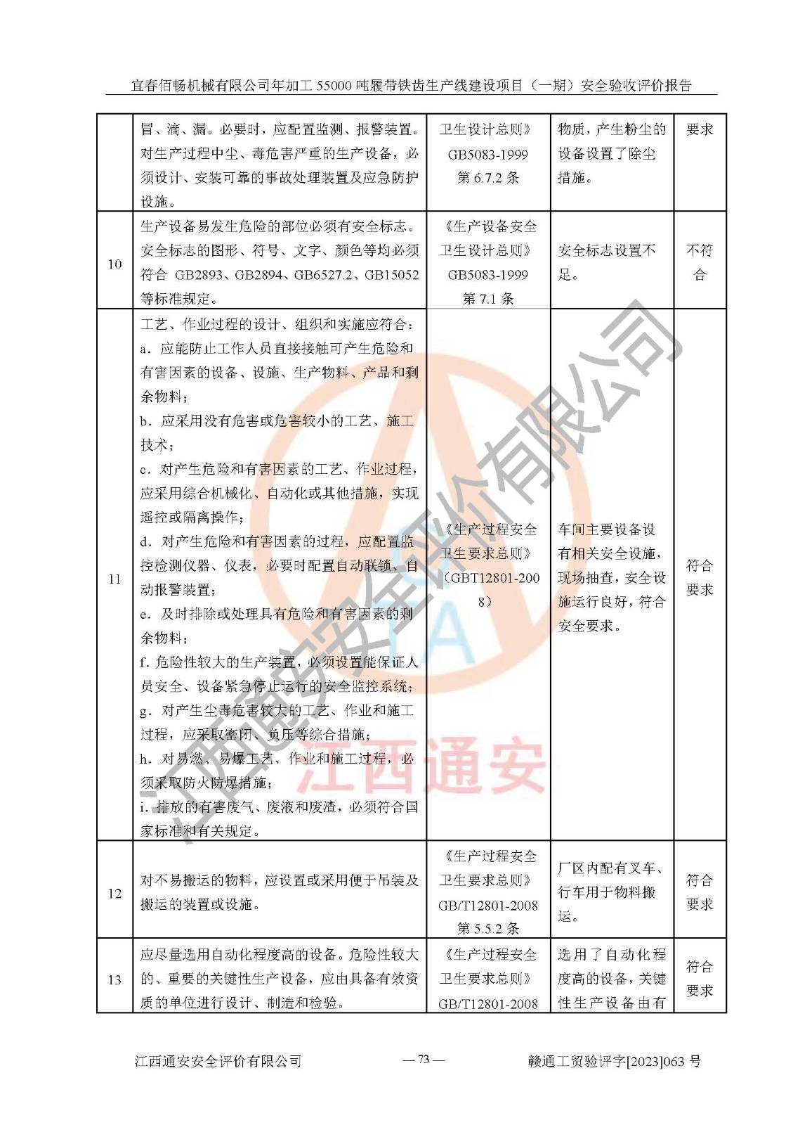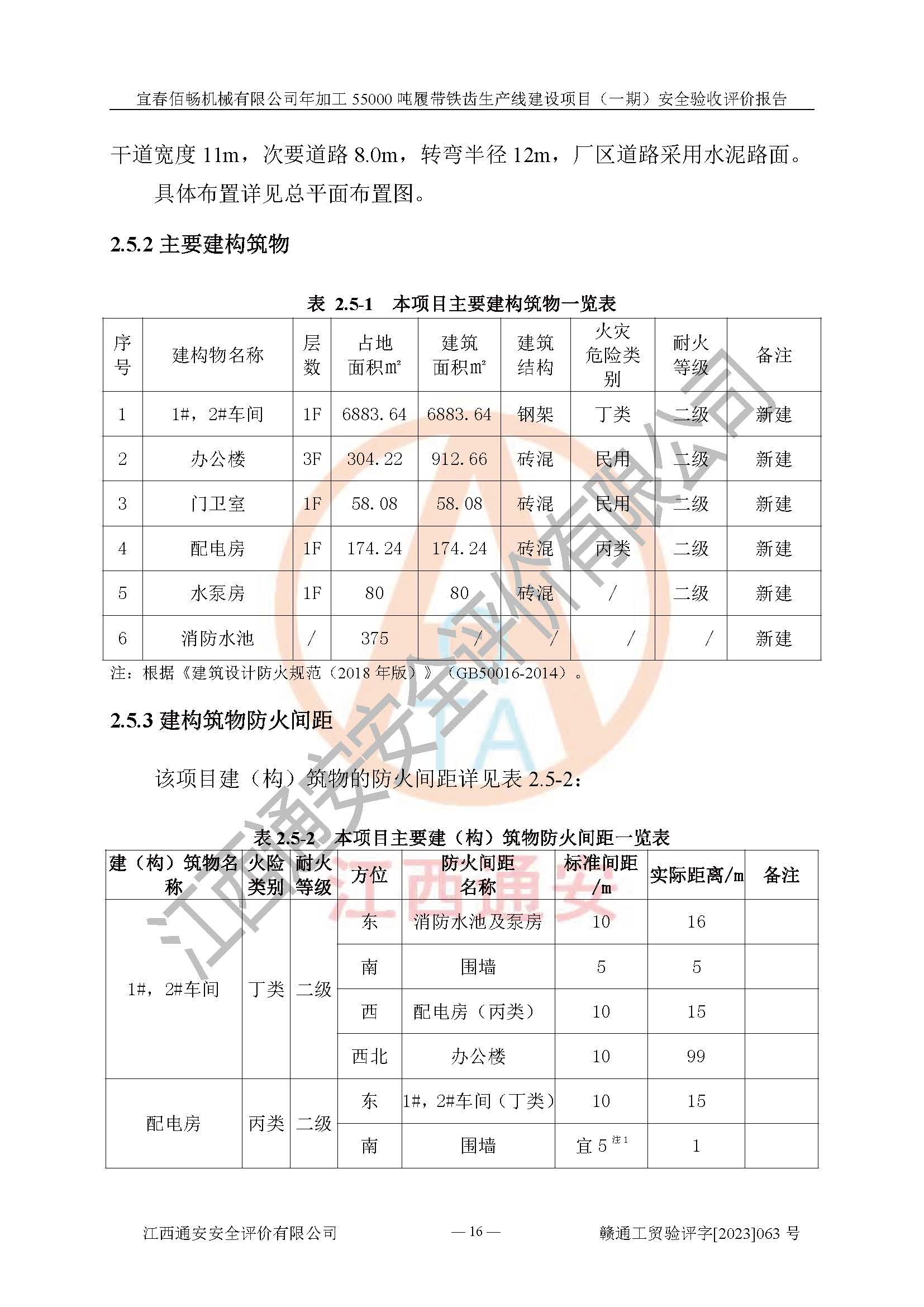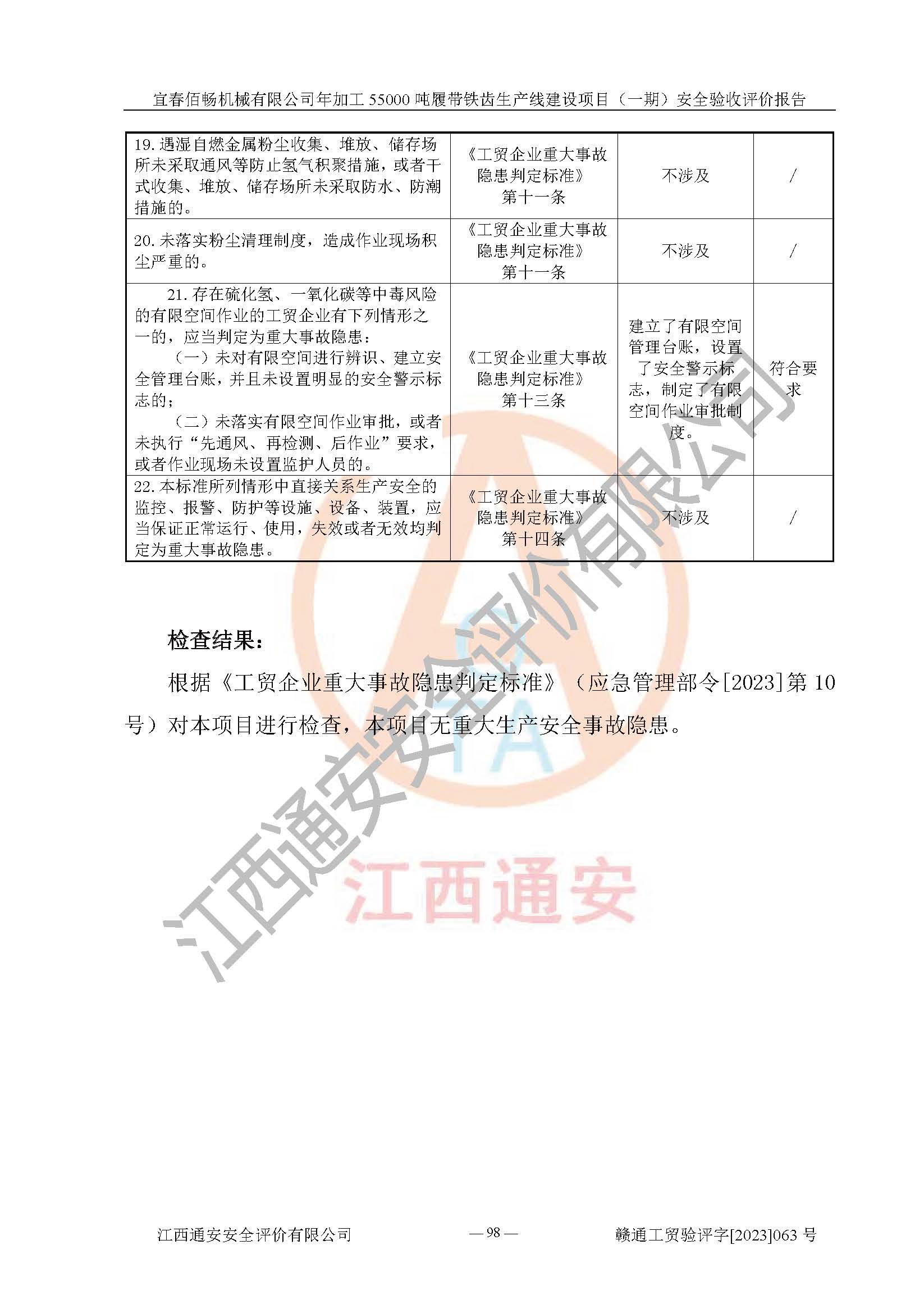 其它 | 根據(jù)《中華人民共和國(guó)安全生產(chǎn)法》、《新建項(xiàng)目安全設(shè)施“三同時(shí)”監(jiān)督管理辦法》(原**安全生產(chǎn)監(jiān)督管理總局令第77號(hào)修訂)等法律法規(guī)的要求,對(duì)宜春佰暢機(jī)械有限公司年加工55000噸履帶鐵齒生產(chǎn)線建設(shè)項(xiàng)目(一期)安全驗(yàn)收的基本條件進(jìn)行分析,結(jié)果如下: 1)本項(xiàng)目在初步設(shè)計(jì)及建設(shè)過程中基本能貫徹執(zhí)行**、地方及有關(guān)部門的安全生產(chǎn)法律法規(guī)、標(biāo)準(zhǔn)要求,取得了**相關(guān)部門的許可、備案。項(xiàng)目的設(shè)計(jì)、施工、監(jiān)理等單位均有相應(yīng)資質(zhì)。 2)本項(xiàng)目址選符合要求;總平面布置合理,主要建筑的防火間距符合符合《建筑設(shè)計(jì)防火規(guī)范(2018版)》(GB50016-2014)、《工業(yè)企業(yè)總平面設(shè)計(jì)規(guī)范》(GB50187-2012)有關(guān)規(guī)范、標(biāo)準(zhǔn)的要求。 3)本項(xiàng)目生產(chǎn)工藝成熟、試運(yùn)行正常,試運(yùn)行中過程中工藝和裝置、設(shè)備(設(shè)施)安全、可靠,未發(fā)生安全事故。 4)本項(xiàng)目的特種設(shè)備由有資質(zhì)單位設(shè)計(jì)、制造、安裝,特種設(shè)備經(jīng)宜春市特種設(shè)備檢驗(yàn)中心檢驗(yàn)合格,符合《中華人民共和國(guó)特種設(shè)備安全法》、《特種設(shè)備安全監(jiān)察條例》(中華人民共和國(guó)***令第549號(hào))的規(guī)定。特種設(shè)備作業(yè)人員、特種作業(yè)人員均持證上崗。 5)公司主要負(fù)責(zé)人及安全管理人員取得了上高縣毅興人力資源有限公司頒發(fā)的培訓(xùn)證書,特種作業(yè)人員操作證在**期內(nèi),其他從業(yè)人員經(jīng)安全培訓(xùn)符合,取得上崗證。符合要求。 6)公司建立有安全管理制度,制定有各類人員的安全生產(chǎn)責(zé)任制、各項(xiàng)安全管理制度和操作規(guī)程。按照**有關(guān)規(guī)定編制了事故應(yīng)急救援預(yù)案并進(jìn)行了備案,并定期進(jìn)行演練等,符合要求。 7)本項(xiàng)目作業(yè)條件危險(xiǎn)性分析結(jié)果:在選定的單元的危險(xiǎn)程度均為“一般危險(xiǎn),需要注意”或“稍有危險(xiǎn),可以接受”,作業(yè)條件相對(duì)安全。 評(píng)價(jià)結(jié)論: 宜春佰暢機(jī)械有限公司年加工55000噸履帶鐵齒生產(chǎn)線建設(shè)項(xiàng)目(一期)的安全設(shè)施及安全管理符合**及有關(guān)部門關(guān)于安全生產(chǎn)法律、法規(guī)、標(biāo)準(zhǔn)的要求,該項(xiàng)目試生產(chǎn)以來,工藝設(shè)備、安全設(shè)施及企業(yè)安全管理機(jī)制等運(yùn)行正常,安全設(shè)施、措施達(dá)到設(shè)計(jì)要求和預(yù)期結(jié)果,可以滿足建設(shè)項(xiàng)目安全生產(chǎn)的要求,安全生產(chǎn)管理**,具備竣工驗(yàn)收條件。 | ||||