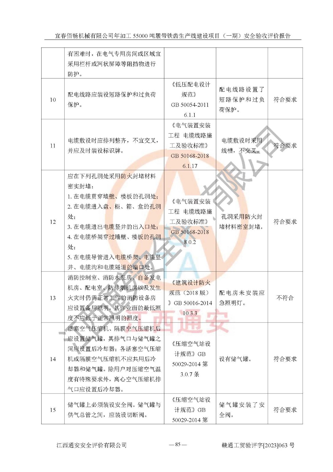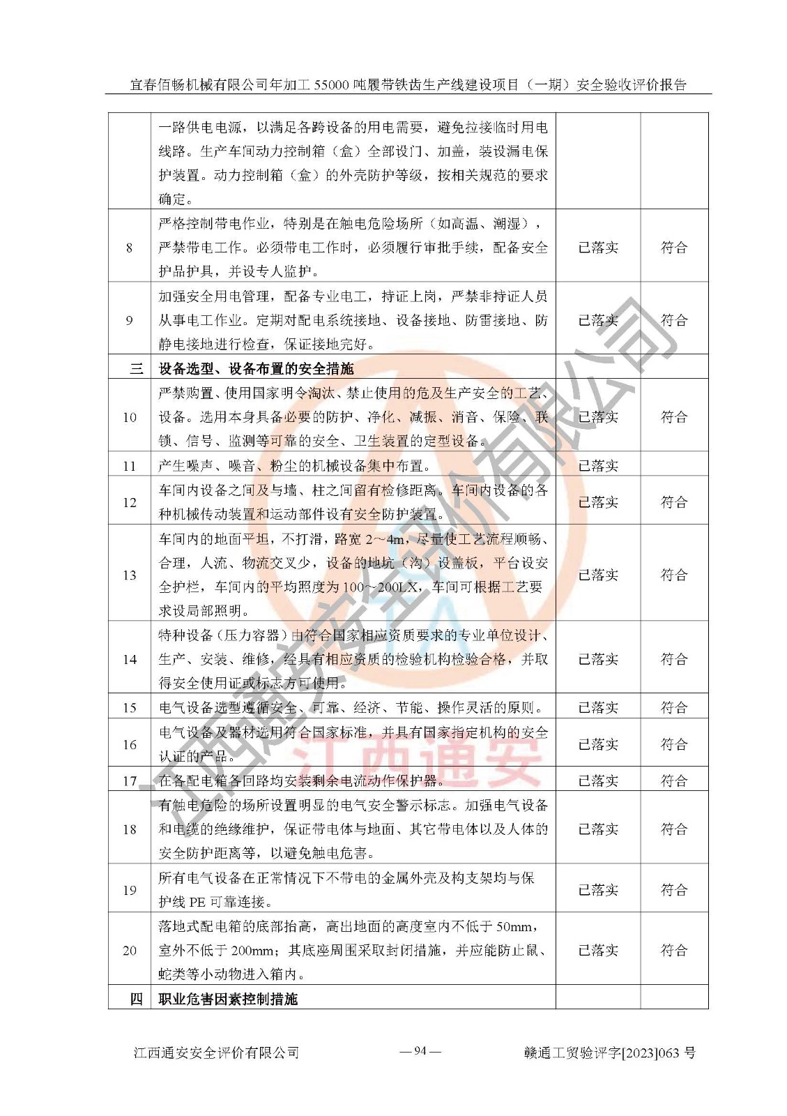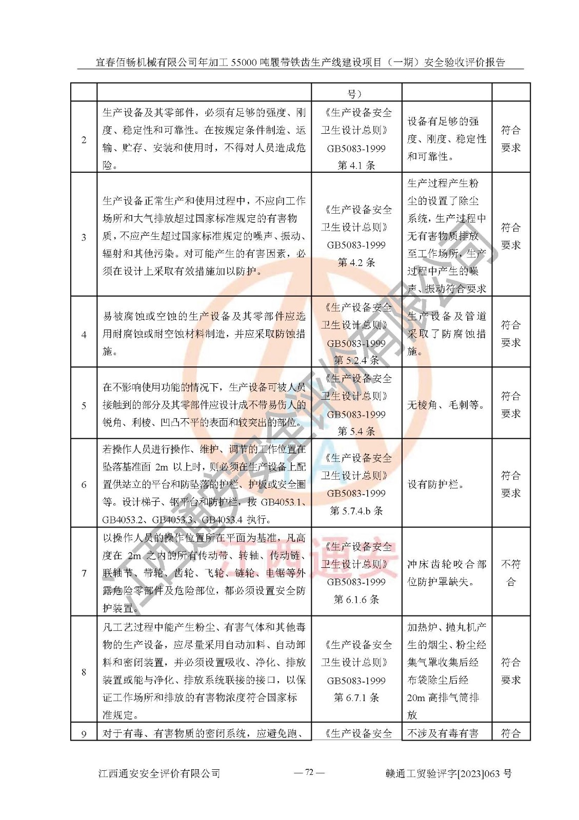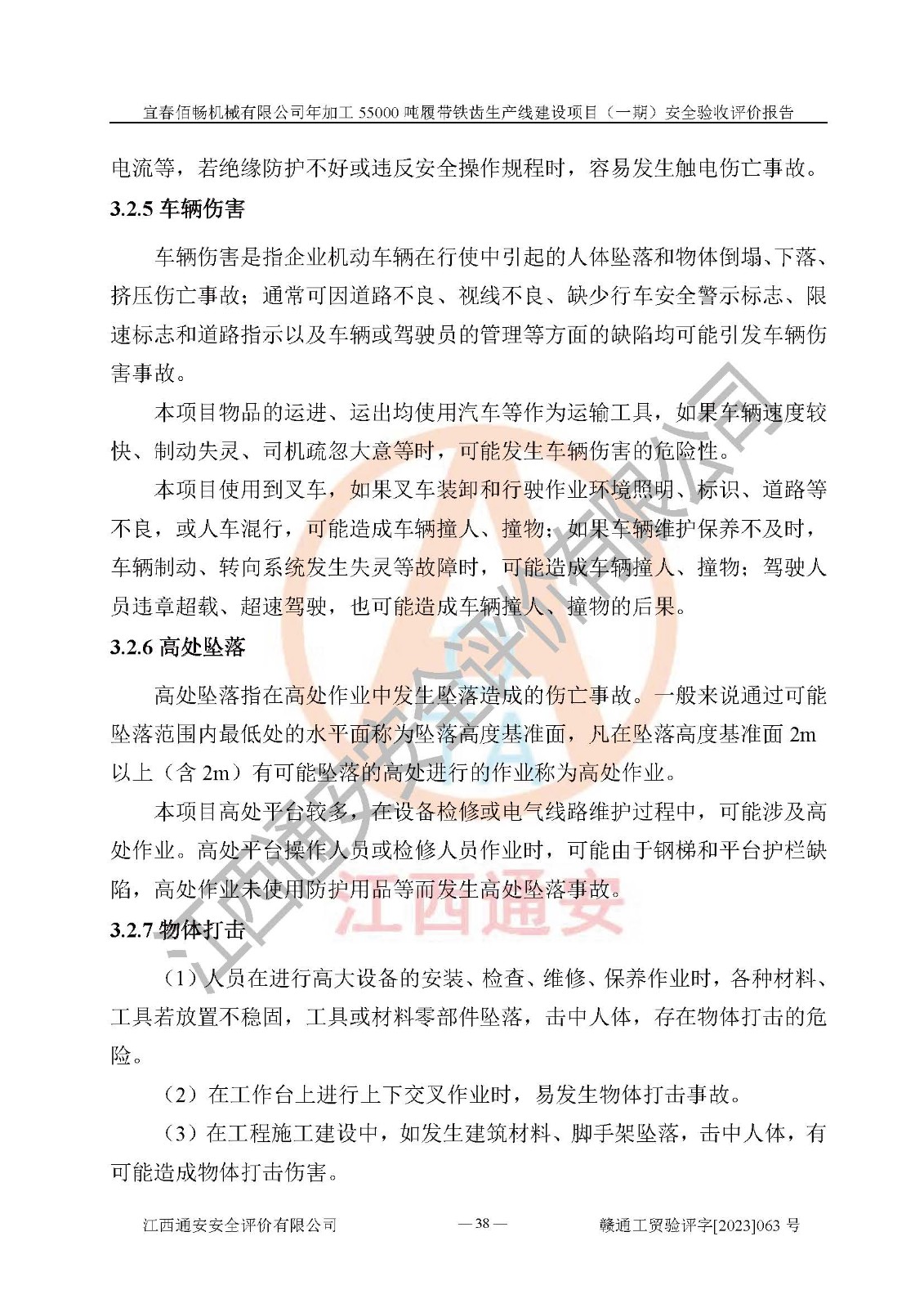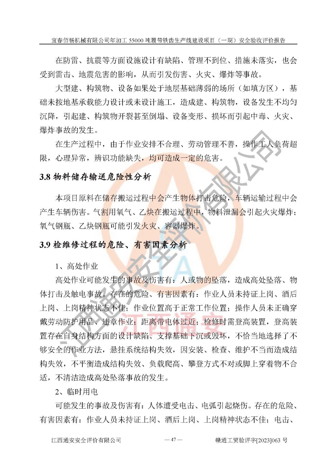 其它 | 根據(jù)《中華人民共和國(guó)安全生產(chǎn)法》、《新建項(xiàng)目安全設(shè)施“三同時(shí)”監(jiān)督管理辦法》(原**安全生產(chǎn)監(jiān)督管理總局令第77號(hào)修訂)等法律法規(guī)的要求,對(duì)宜春佰暢機(jī)械有限公司年加工55000噸履帶鐵齒生產(chǎn)線建設(shè)項(xiàng)目(一期)安全驗(yàn)收的基本條件進(jìn)行分析,結(jié)果如下: 1)本項(xiàng)目在初步設(shè)計(jì)及建設(shè)過程中基本能貫徹執(zhí)行**、地方及有關(guān)部門的安全生產(chǎn)法律法規(guī)、標(biāo)準(zhǔn)要求,取得了**相關(guān)部門的許可、備案。項(xiàng)目的設(shè)計(jì)、施工、監(jiān)理等單位均有相應(yīng)資質(zhì)。 2)本項(xiàng)目址選符合要求;總平面布置合理,主要建筑的防火間距符合符合《建筑設(shè)計(jì)防火規(guī)范(2018版)》(GB50016-2014)、《工業(yè)企業(yè)總平面設(shè)計(jì)規(guī)范》(GB50187-2012)有關(guān)規(guī)范、標(biāo)準(zhǔn)的要求。 3)本項(xiàng)目生產(chǎn)工藝成熟、試運(yùn)行正常,試運(yùn)行中過程中工藝和裝置、設(shè)備(設(shè)施)安全、可靠,未發(fā)生安全事故。 4)本項(xiàng)目的特種設(shè)備由有資質(zhì)單位設(shè)計(jì)、制造、安裝,特種設(shè)備經(jīng)宜春市特種設(shè)備檢驗(yàn)中心檢驗(yàn)合格,符合《中華人民共和國(guó)特種設(shè)備安全法》、《特種設(shè)備安全監(jiān)察條例》(中華人民共和國(guó)***令第549號(hào))的規(guī)定。特種設(shè)備作業(yè)人員、特種作業(yè)人員均持證上崗。 5)公司主要負(fù)責(zé)人及安全管理人員取得了上高縣毅興人力資源有限公司頒發(fā)的培訓(xùn)證書,特種作業(yè)人員操作證在**期內(nèi),其他從業(yè)人員經(jīng)安全培訓(xùn)符合,取得上崗證。符合要求。 6)公司建立有安全管理制度,制定有各類人員的安全生產(chǎn)責(zé)任制、各項(xiàng)安全管理制度和操作規(guī)程。按照**有關(guān)規(guī)定編制了事故應(yīng)急救援預(yù)案并進(jìn)行了備案,并定期進(jìn)行演練等,符合要求。 7)本項(xiàng)目作業(yè)條件危險(xiǎn)性分析結(jié)果:在選定的單元的危險(xiǎn)程度均為“一般危險(xiǎn),需要注意”或“稍有危險(xiǎn),可以接受”,作業(yè)條件相對(duì)安全。 評(píng)價(jià)結(jié)論: 宜春佰暢機(jī)械有限公司年加工55000噸履帶鐵齒生產(chǎn)線建設(shè)項(xiàng)目(一期)的安全設(shè)施及安全管理符合**及有關(guān)部門關(guān)于安全生產(chǎn)法律、法規(guī)、標(biāo)準(zhǔn)的要求,該項(xiàng)目試生產(chǎn)以來,工藝設(shè)備、安全設(shè)施及企業(yè)安全管理機(jī)制等運(yùn)行正常,安全設(shè)施、措施達(dá)到設(shè)計(jì)要求和預(yù)期結(jié)果,可以滿足建設(shè)項(xiàng)目安全生產(chǎn)的要求,安全生產(chǎn)管理**,具備竣工驗(yàn)收條件。 | ||||