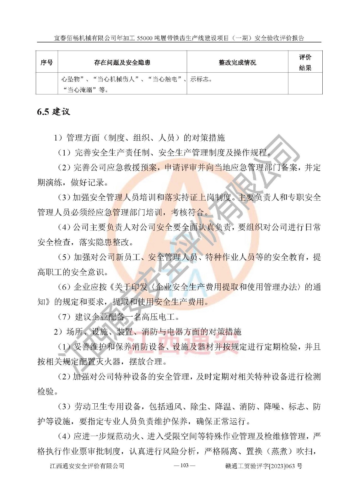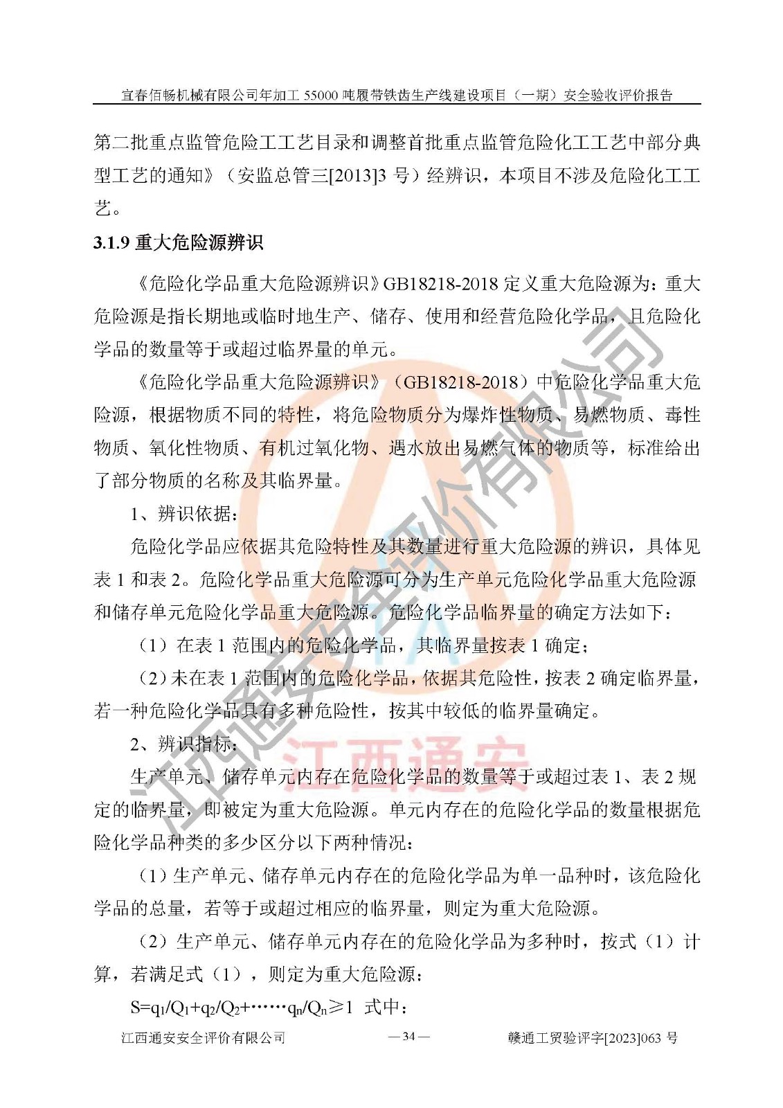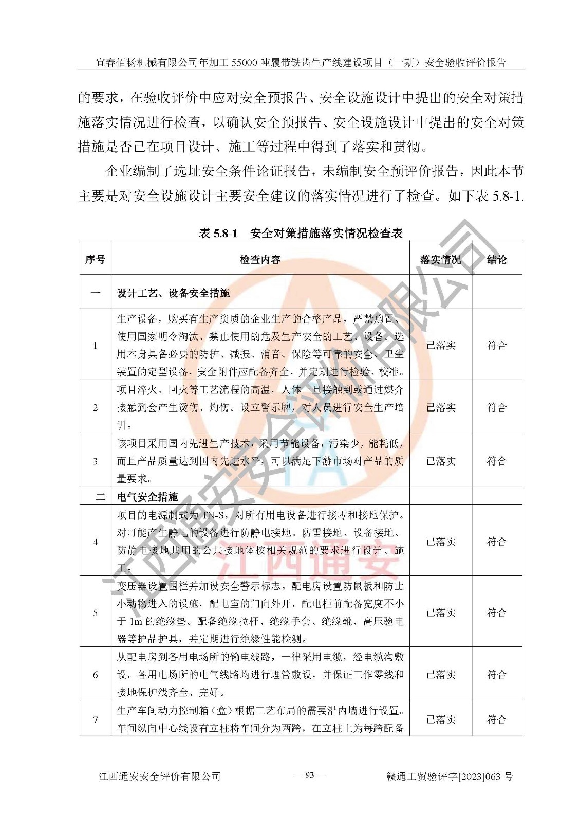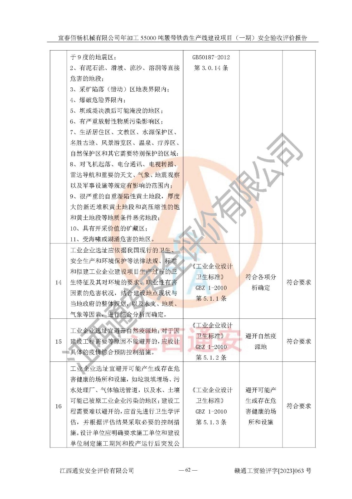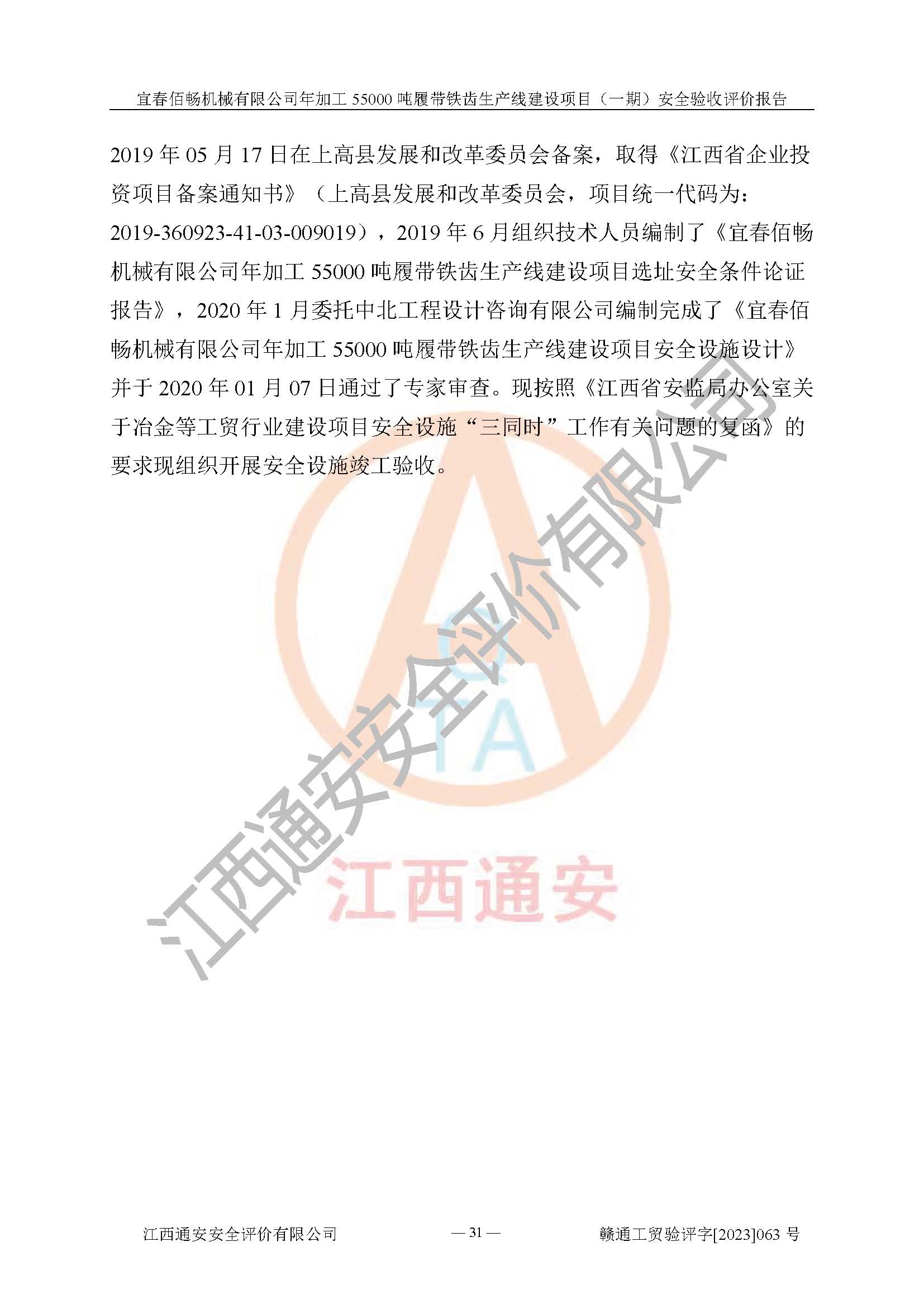 其它 | 根據(jù)《中華人民共和國(guó)安全生產(chǎn)法》、《新建項(xiàng)目安全設(shè)施“三同時(shí)”監(jiān)督管理辦法》(原**安全生產(chǎn)監(jiān)督管理總局令第77號(hào)修訂)等法律法規(guī)的要求,對(duì)宜春佰暢機(jī)械有限公司年加工55000噸履帶鐵齒生產(chǎn)線建設(shè)項(xiàng)目(一期)安全驗(yàn)收的基本條件進(jìn)行分析,結(jié)果如下: 1)本項(xiàng)目在初步設(shè)計(jì)及建設(shè)過程中基本能貫徹執(zhí)行**、地方及有關(guān)部門的安全生產(chǎn)法律法規(guī)、標(biāo)準(zhǔn)要求,取得了**相關(guān)部門的許可、備案。項(xiàng)目的設(shè)計(jì)、施工、監(jiān)理等單位均有相應(yīng)資質(zhì)。 2)本項(xiàng)目址選符合要求;總平面布置合理,主要建筑的防火間距符合符合《建筑設(shè)計(jì)防火規(guī)范(2018版)》(GB50016-2014)、《工業(yè)企業(yè)總平面設(shè)計(jì)規(guī)范》(GB50187-2012)有關(guān)規(guī)范、標(biāo)準(zhǔn)的要求。 3)本項(xiàng)目生產(chǎn)工藝成熟、試運(yùn)行正常,試運(yùn)行中過程中工藝和裝置、設(shè)備(設(shè)施)安全、可靠,未發(fā)生安全事故。 4)本項(xiàng)目的特種設(shè)備由有資質(zhì)單位設(shè)計(jì)、制造、安裝,特種設(shè)備經(jīng)宜春市特種設(shè)備檢驗(yàn)中心檢驗(yàn)合格,符合《中華人民共和國(guó)特種設(shè)備安全法》、《特種設(shè)備安全監(jiān)察條例》(中華人民共和國(guó)***令第549號(hào))的規(guī)定。特種設(shè)備作業(yè)人員、特種作業(yè)人員均持證上崗。 5)公司主要負(fù)責(zé)人及安全管理人員取得了上高縣毅興人力資源有限公司頒發(fā)的培訓(xùn)證書,特種作業(yè)人員操作證在**期內(nèi),其他從業(yè)人員經(jīng)安全培訓(xùn)符合,取得上崗證。符合要求。 6)公司建立有安全管理制度,制定有各類人員的安全生產(chǎn)責(zé)任制、各項(xiàng)安全管理制度和操作規(guī)程。按照**有關(guān)規(guī)定編制了事故應(yīng)急救援預(yù)案并進(jìn)行了備案,并定期進(jìn)行演練等,符合要求。 7)本項(xiàng)目作業(yè)條件危險(xiǎn)性分析結(jié)果:在選定的單元的危險(xiǎn)程度均為“一般危險(xiǎn),需要注意”或“稍有危險(xiǎn),可以接受”,作業(yè)條件相對(duì)安全。 評(píng)價(jià)結(jié)論: 宜春佰暢機(jī)械有限公司年加工55000噸履帶鐵齒生產(chǎn)線建設(shè)項(xiàng)目(一期)的安全設(shè)施及安全管理符合**及有關(guān)部門關(guān)于安全生產(chǎn)法律、法規(guī)、標(biāo)準(zhǔn)的要求,該項(xiàng)目試生產(chǎn)以來,工藝設(shè)備、安全設(shè)施及企業(yè)安全管理機(jī)制等運(yùn)行正常,安全設(shè)施、措施達(dá)到設(shè)計(jì)要求和預(yù)期結(jié)果,可以滿足建設(shè)項(xiàng)目安全生產(chǎn)的要求,安全生產(chǎn)管理**,具備竣工驗(yàn)收條件。 | ||||
