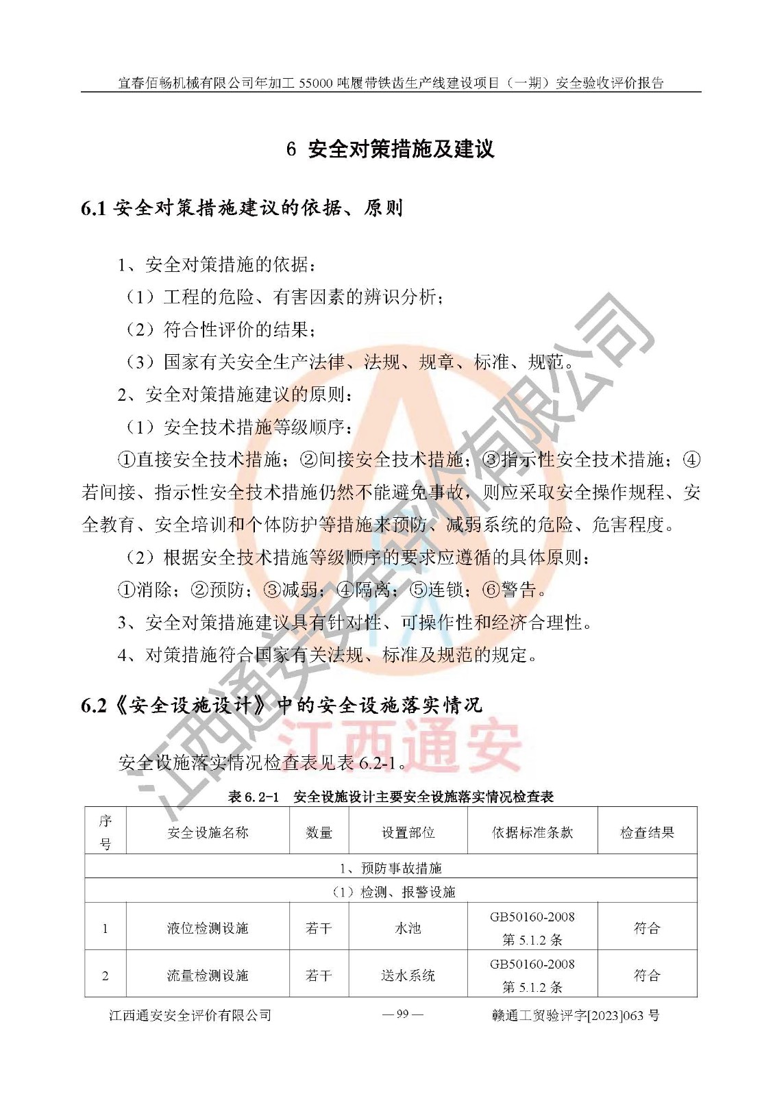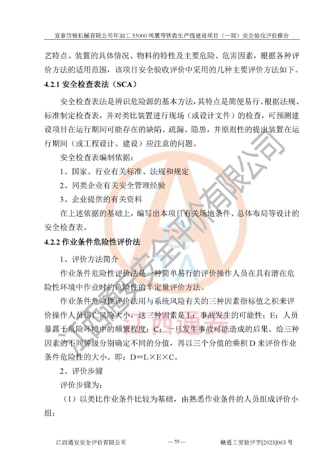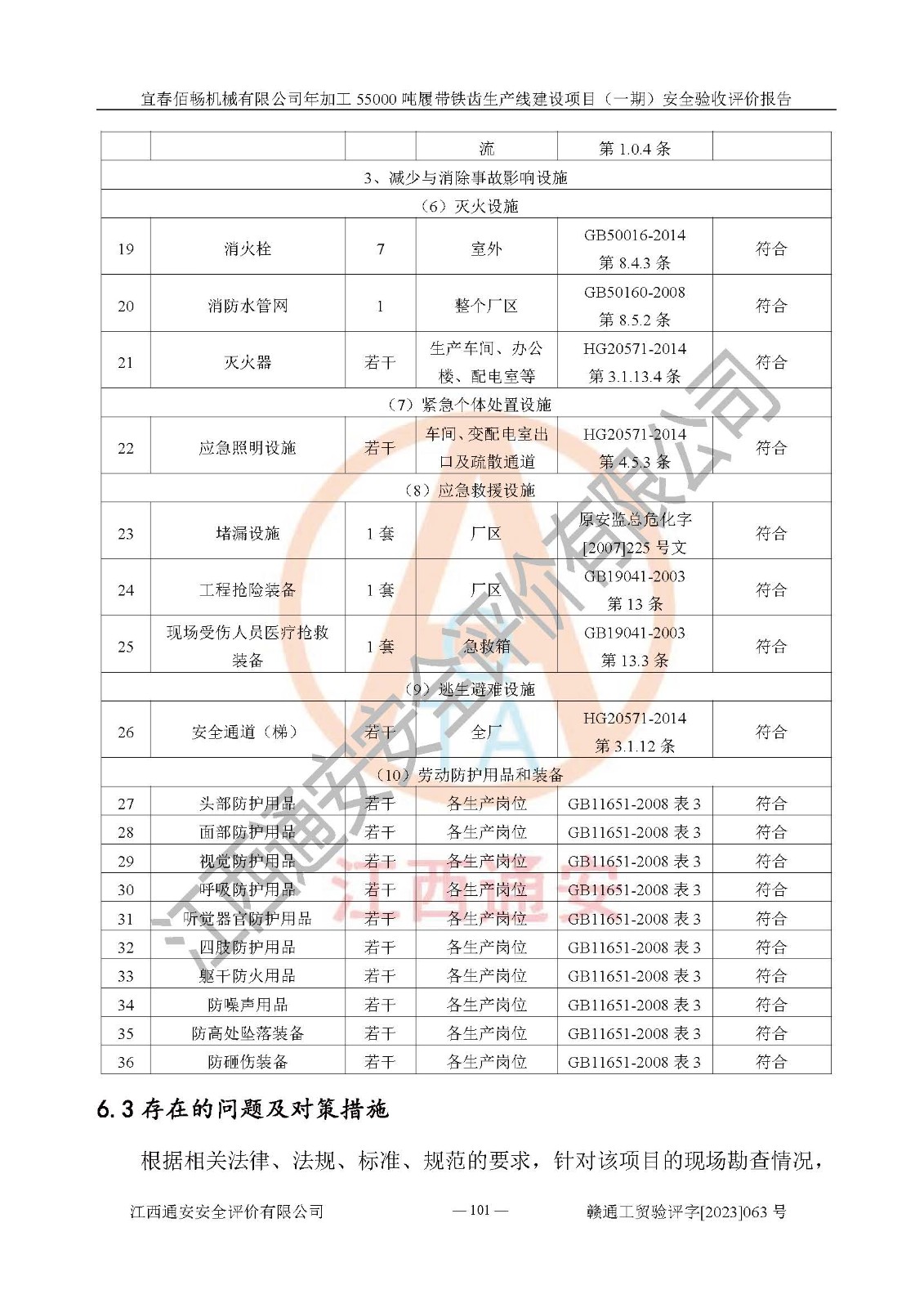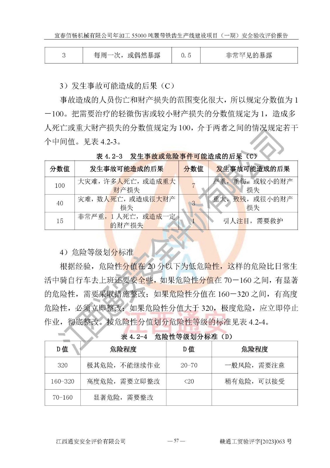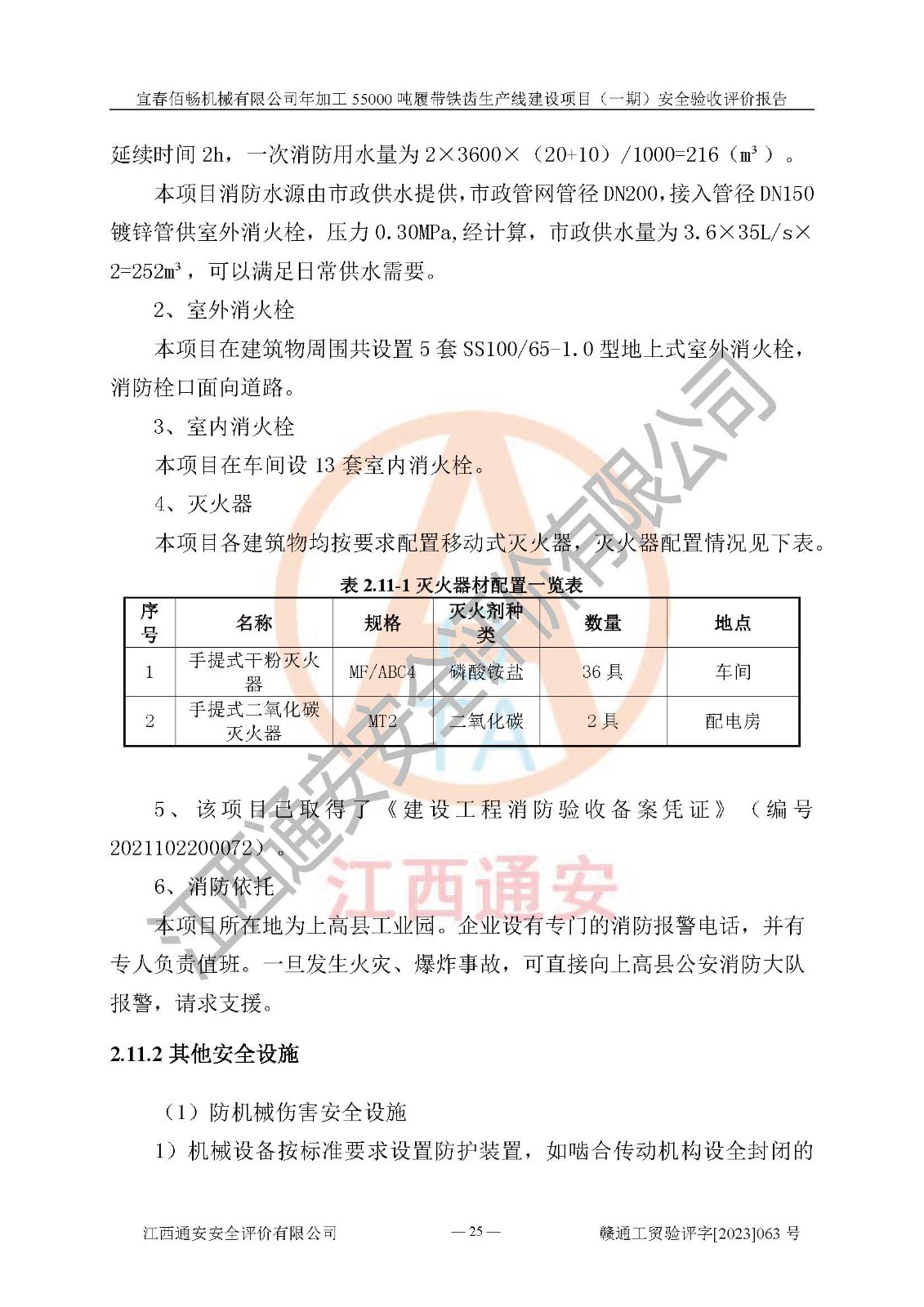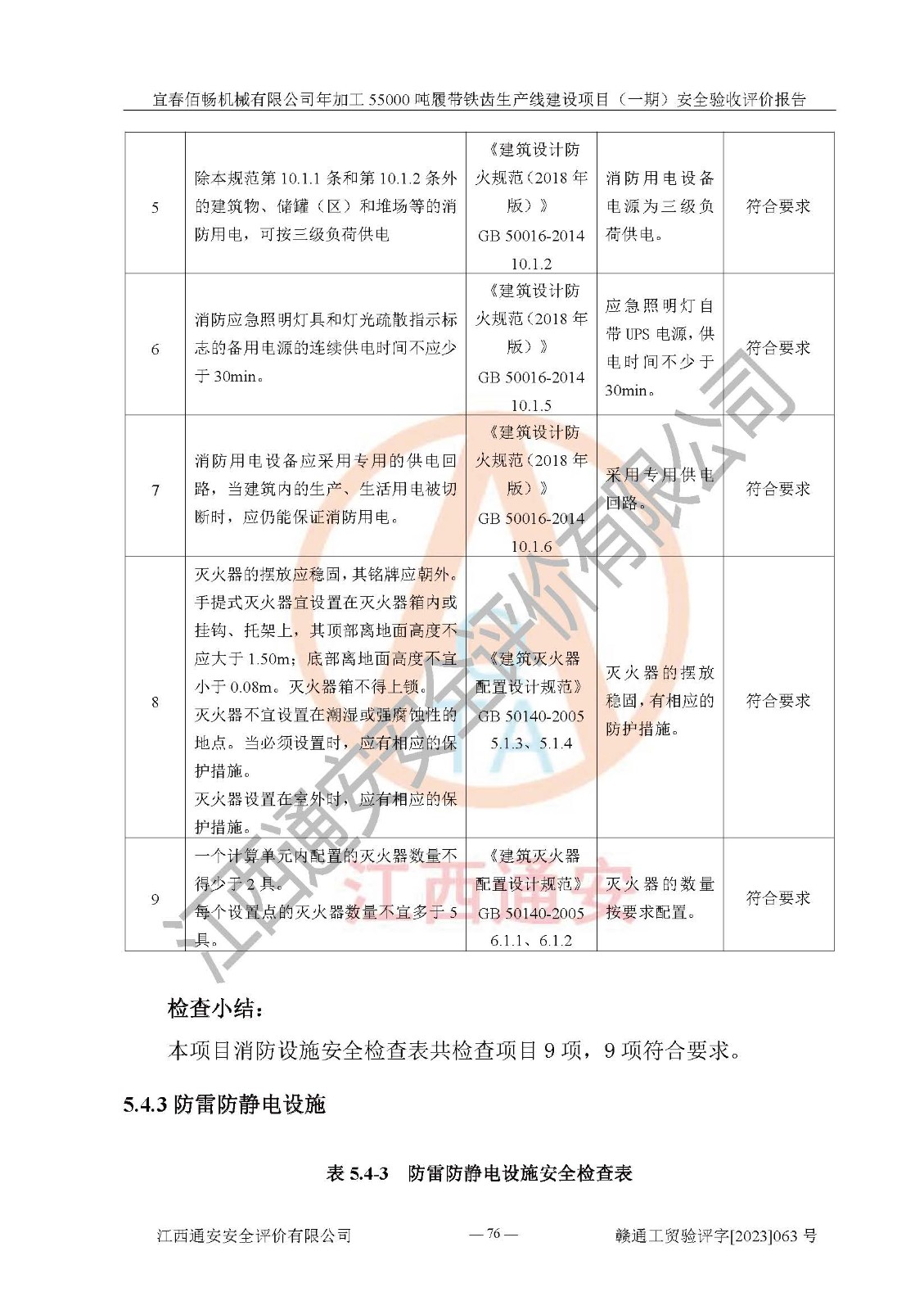 其它 | 根據(jù)《中華人民共和國(guó)安全生產(chǎn)法》、《新建項(xiàng)目安全設(shè)施“三同時(shí)”監(jiān)督管理辦法》(原**安全生產(chǎn)監(jiān)督管理總局令第77號(hào)修訂)等法律法規(guī)的要求,對(duì)宜春佰暢機(jī)械有限公司年加工55000噸履帶鐵齒生產(chǎn)線建設(shè)項(xiàng)目(一期)安全驗(yàn)收的基本條件進(jìn)行分析,結(jié)果如下: 1)本項(xiàng)目在初步設(shè)計(jì)及建設(shè)過程中基本能貫徹執(zhí)行**、地方及有關(guān)部門的安全生產(chǎn)法律法規(guī)、標(biāo)準(zhǔn)要求,取得了**相關(guān)部門的許可、備案。項(xiàng)目的設(shè)計(jì)、施工、監(jiān)理等單位均有相應(yīng)資質(zhì)。 2)本項(xiàng)目址選符合要求;總平面布置合理,主要建筑的防火間距符合符合《建筑設(shè)計(jì)防火規(guī)范(2018版)》(GB50016-2014)、《工業(yè)企業(yè)總平面設(shè)計(jì)規(guī)范》(GB50187-2012)有關(guān)規(guī)范、標(biāo)準(zhǔn)的要求。 3)本項(xiàng)目生產(chǎn)工藝成熟、試運(yùn)行正常,試運(yùn)行中過程中工藝和裝置、設(shè)備(設(shè)施)安全、可靠,未發(fā)生安全事故。 4)本項(xiàng)目的特種設(shè)備由有資質(zhì)單位設(shè)計(jì)、制造、安裝,特種設(shè)備經(jīng)宜春市特種設(shè)備檢驗(yàn)中心檢驗(yàn)合格,符合《中華人民共和國(guó)特種設(shè)備安全法》、《特種設(shè)備安全監(jiān)察條例》(中華人民共和國(guó)***令第549號(hào))的規(guī)定。特種設(shè)備作業(yè)人員、特種作業(yè)人員均持證上崗。 5)公司主要負(fù)責(zé)人及安全管理人員取得了上高縣毅興人力資源有限公司頒發(fā)的培訓(xùn)證書,特種作業(yè)人員操作證在**期內(nèi),其他從業(yè)人員經(jīng)安全培訓(xùn)符合,取得上崗證。符合要求。 6)公司建立有安全管理制度,制定有各類人員的安全生產(chǎn)責(zé)任制、各項(xiàng)安全管理制度和操作規(guī)程。按照**有關(guān)規(guī)定編制了事故應(yīng)急救援預(yù)案并進(jìn)行了備案,并定期進(jìn)行演練等,符合要求。 7)本項(xiàng)目作業(yè)條件危險(xiǎn)性分析結(jié)果:在選定的單元的危險(xiǎn)程度均為“一般危險(xiǎn),需要注意”或“稍有危險(xiǎn),可以接受”,作業(yè)條件相對(duì)安全。 評(píng)價(jià)結(jié)論: 宜春佰暢機(jī)械有限公司年加工55000噸履帶鐵齒生產(chǎn)線建設(shè)項(xiàng)目(一期)的安全設(shè)施及安全管理符合**及有關(guān)部門關(guān)于安全生產(chǎn)法律、法規(guī)、標(biāo)準(zhǔn)的要求,該項(xiàng)目試生產(chǎn)以來,工藝設(shè)備、安全設(shè)施及企業(yè)安全管理機(jī)制等運(yùn)行正常,安全設(shè)施、措施達(dá)到設(shè)計(jì)要求和預(yù)期結(jié)果,可以滿足建設(shè)項(xiàng)目安全生產(chǎn)的要求,安全生產(chǎn)管理**,具備竣工驗(yàn)收條件。 | ||||