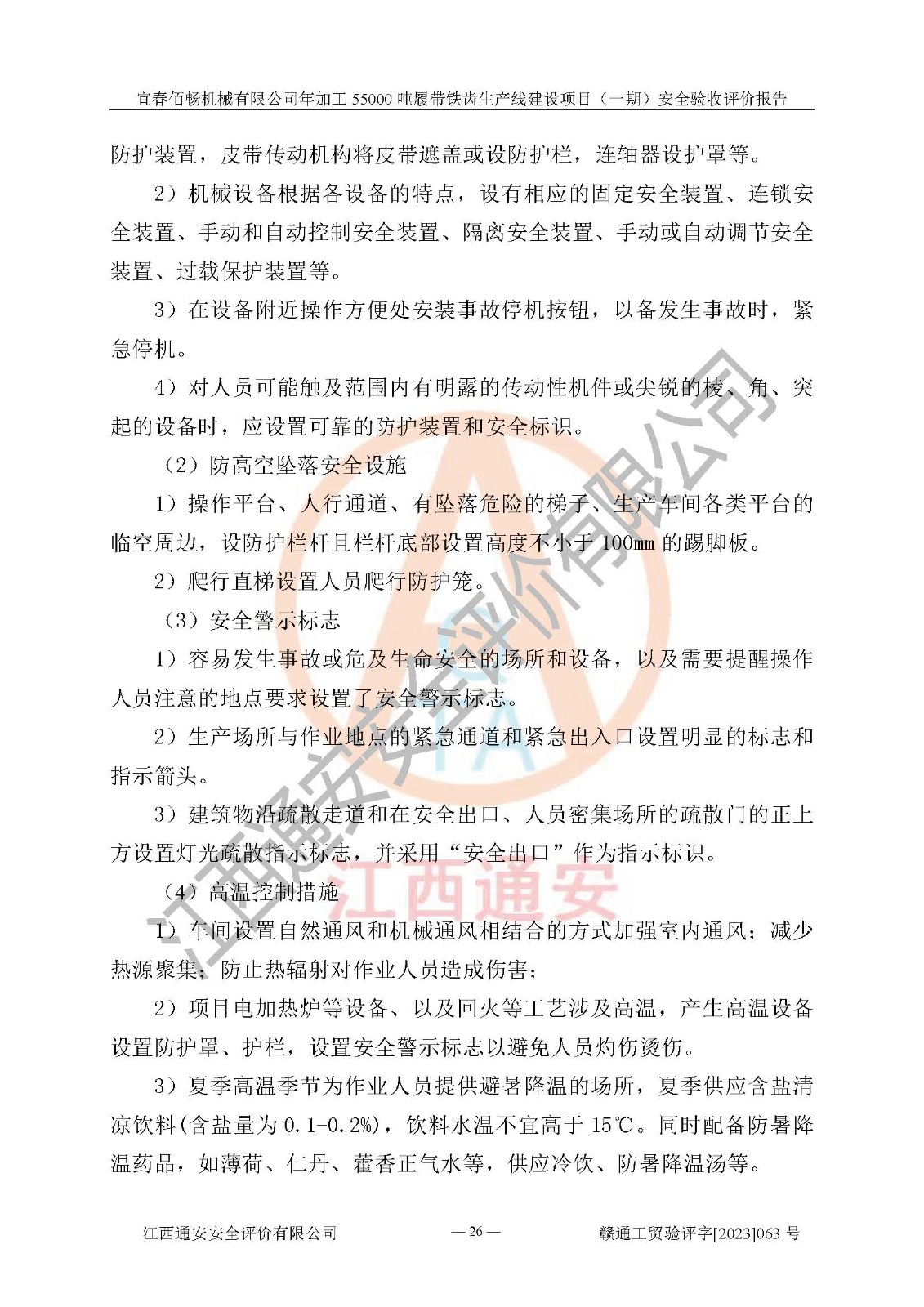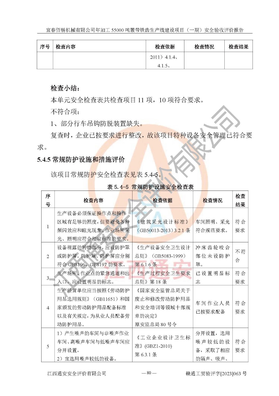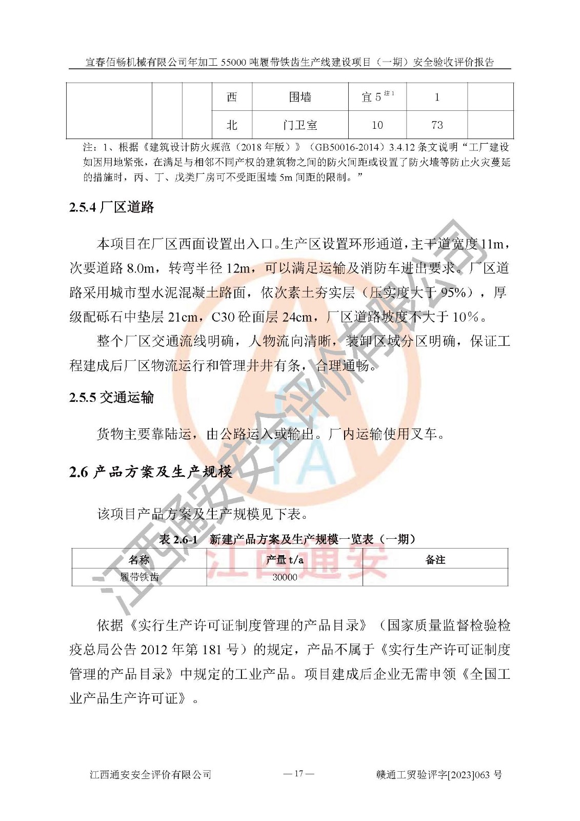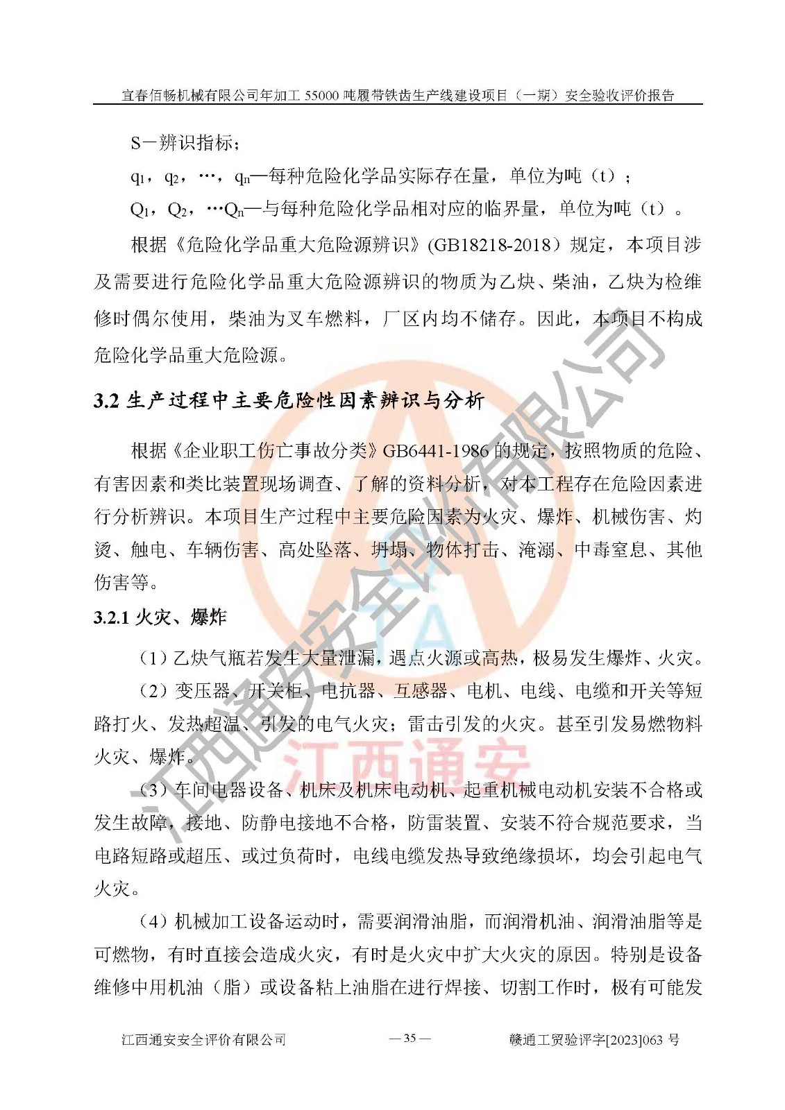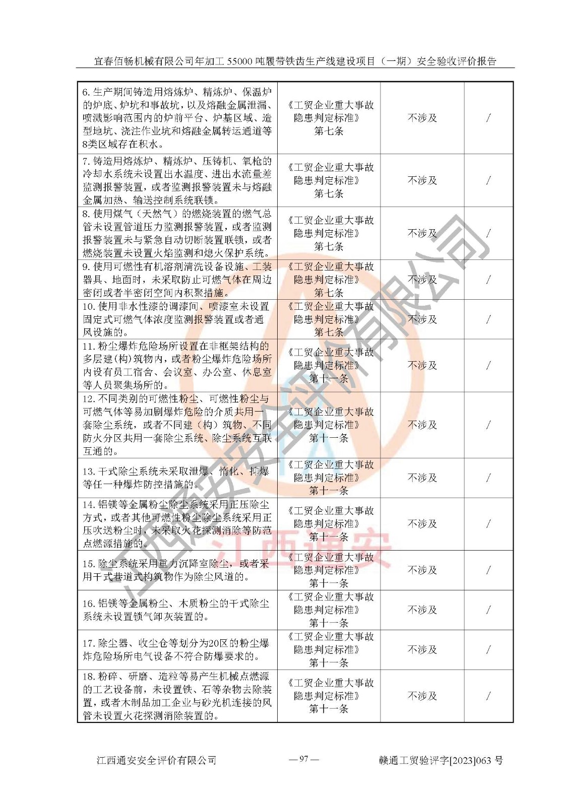 其它 | 根據(jù)《中華人民共和國(guó)安全生產(chǎn)法》、《新建項(xiàng)目安全設(shè)施“三同時(shí)”監(jiān)督管理辦法》(原**安全生產(chǎn)監(jiān)督管理總局令第77號(hào)修訂)等法律法規(guī)的要求,對(duì)宜春佰暢機(jī)械有限公司年加工55000噸履帶鐵齒生產(chǎn)線建設(shè)項(xiàng)目(一期)安全驗(yàn)收的基本條件進(jìn)行分析,結(jié)果如下: 1)本項(xiàng)目在初步設(shè)計(jì)及建設(shè)過程中基本能貫徹執(zhí)行**、地方及有關(guān)部門的安全生產(chǎn)法律法規(guī)、標(biāo)準(zhǔn)要求,取得了**相關(guān)部門的許可、備案。項(xiàng)目的設(shè)計(jì)、施工、監(jiān)理等單位均有相應(yīng)資質(zhì)。 2)本項(xiàng)目址選符合要求;總平面布置合理,主要建筑的防火間距符合符合《建筑設(shè)計(jì)防火規(guī)范(2018版)》(GB50016-2014)、《工業(yè)企業(yè)總平面設(shè)計(jì)規(guī)范》(GB50187-2012)有關(guān)規(guī)范、標(biāo)準(zhǔn)的要求。 3)本項(xiàng)目生產(chǎn)工藝成熟、試運(yùn)行正常,試運(yùn)行中過程中工藝和裝置、設(shè)備(設(shè)施)安全、可靠,未發(fā)生安全事故。 4)本項(xiàng)目的特種設(shè)備由有資質(zhì)單位設(shè)計(jì)、制造、安裝,特種設(shè)備經(jīng)宜春市特種設(shè)備檢驗(yàn)中心檢驗(yàn)合格,符合《中華人民共和國(guó)特種設(shè)備安全法》、《特種設(shè)備安全監(jiān)察條例》(中華人民共和國(guó)***令第549號(hào))的規(guī)定。特種設(shè)備作業(yè)人員、特種作業(yè)人員均持證上崗。 5)公司主要負(fù)責(zé)人及安全管理人員取得了上高縣毅興人力資源有限公司頒發(fā)的培訓(xùn)證書,特種作業(yè)人員操作證在**期內(nèi),其他從業(yè)人員經(jīng)安全培訓(xùn)符合,取得上崗證。符合要求。 6)公司建立有安全管理制度,制定有各類人員的安全生產(chǎn)責(zé)任制、各項(xiàng)安全管理制度和操作規(guī)程。按照**有關(guān)規(guī)定編制了事故應(yīng)急救援預(yù)案并進(jìn)行了備案,并定期進(jìn)行演練等,符合要求。 7)本項(xiàng)目作業(yè)條件危險(xiǎn)性分析結(jié)果:在選定的單元的危險(xiǎn)程度均為“一般危險(xiǎn),需要注意”或“稍有危險(xiǎn),可以接受”,作業(yè)條件相對(duì)安全。 評(píng)價(jià)結(jié)論: 宜春佰暢機(jī)械有限公司年加工55000噸履帶鐵齒生產(chǎn)線建設(shè)項(xiàng)目(一期)的安全設(shè)施及安全管理符合**及有關(guān)部門關(guān)于安全生產(chǎn)法律、法規(guī)、標(biāo)準(zhǔn)的要求,該項(xiàng)目試生產(chǎn)以來,工藝設(shè)備、安全設(shè)施及企業(yè)安全管理機(jī)制等運(yùn)行正常,安全設(shè)施、措施達(dá)到設(shè)計(jì)要求和預(yù)期結(jié)果,可以滿足建設(shè)項(xiàng)目安全生產(chǎn)的要求,安全生產(chǎn)管理**,具備竣工驗(yàn)收條件。 | ||||