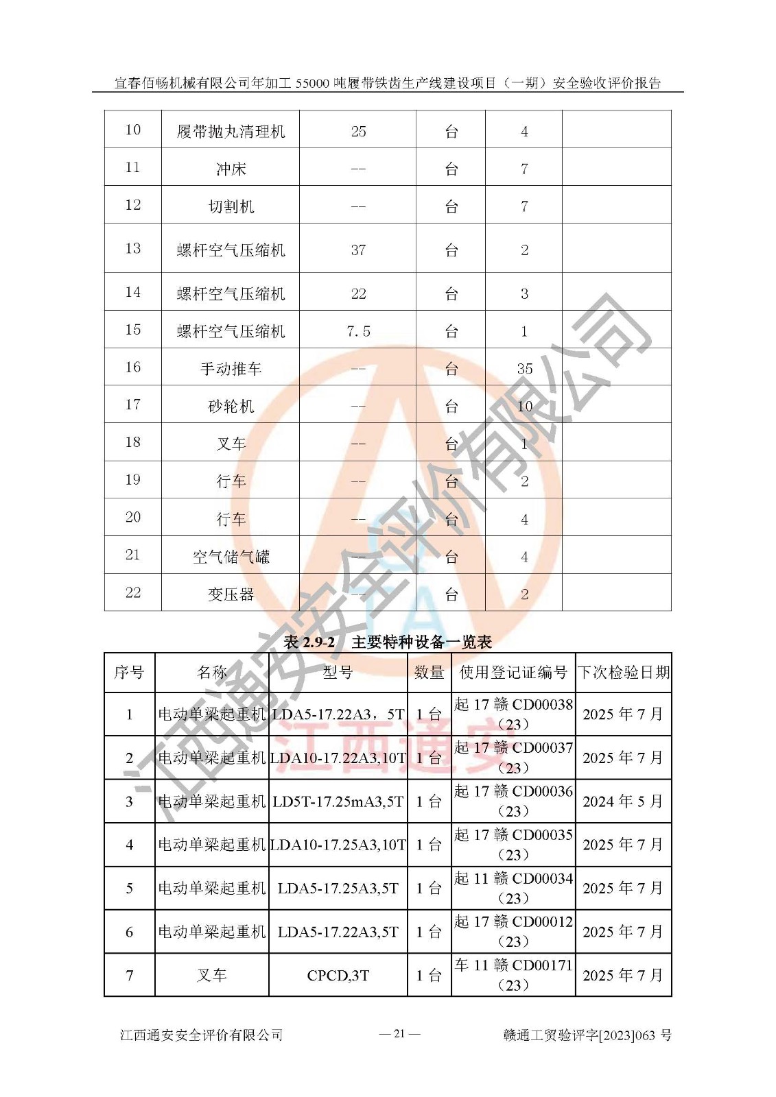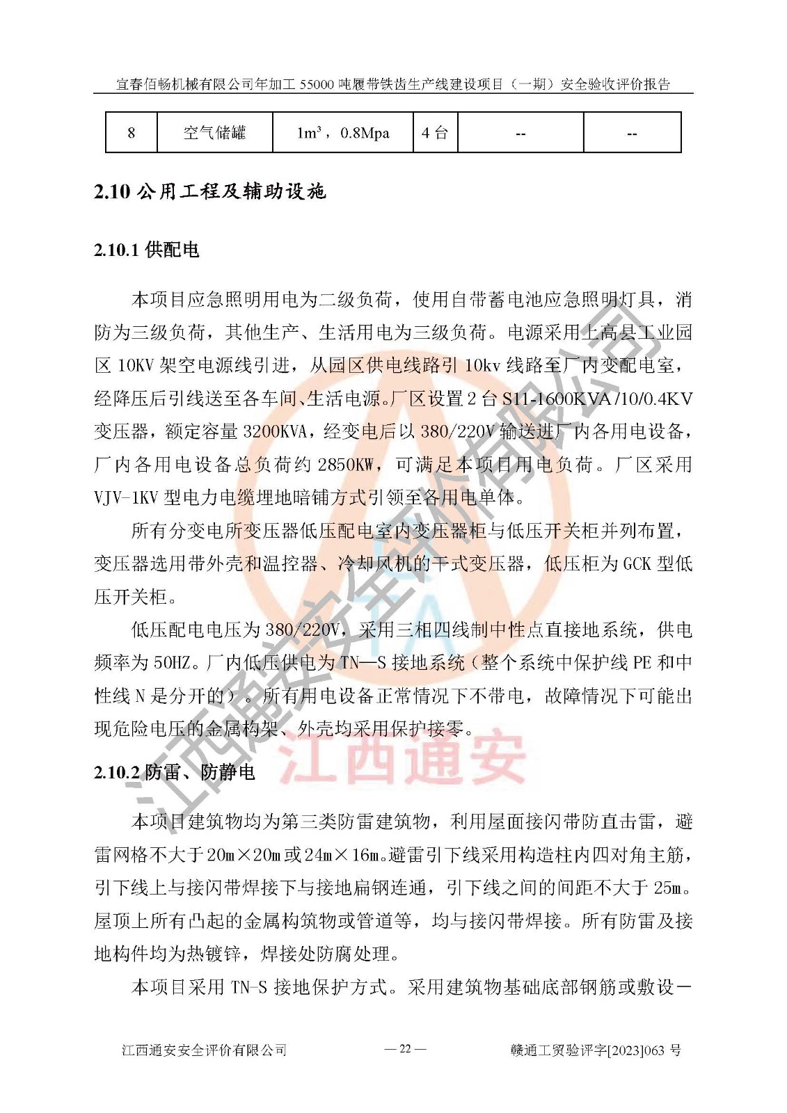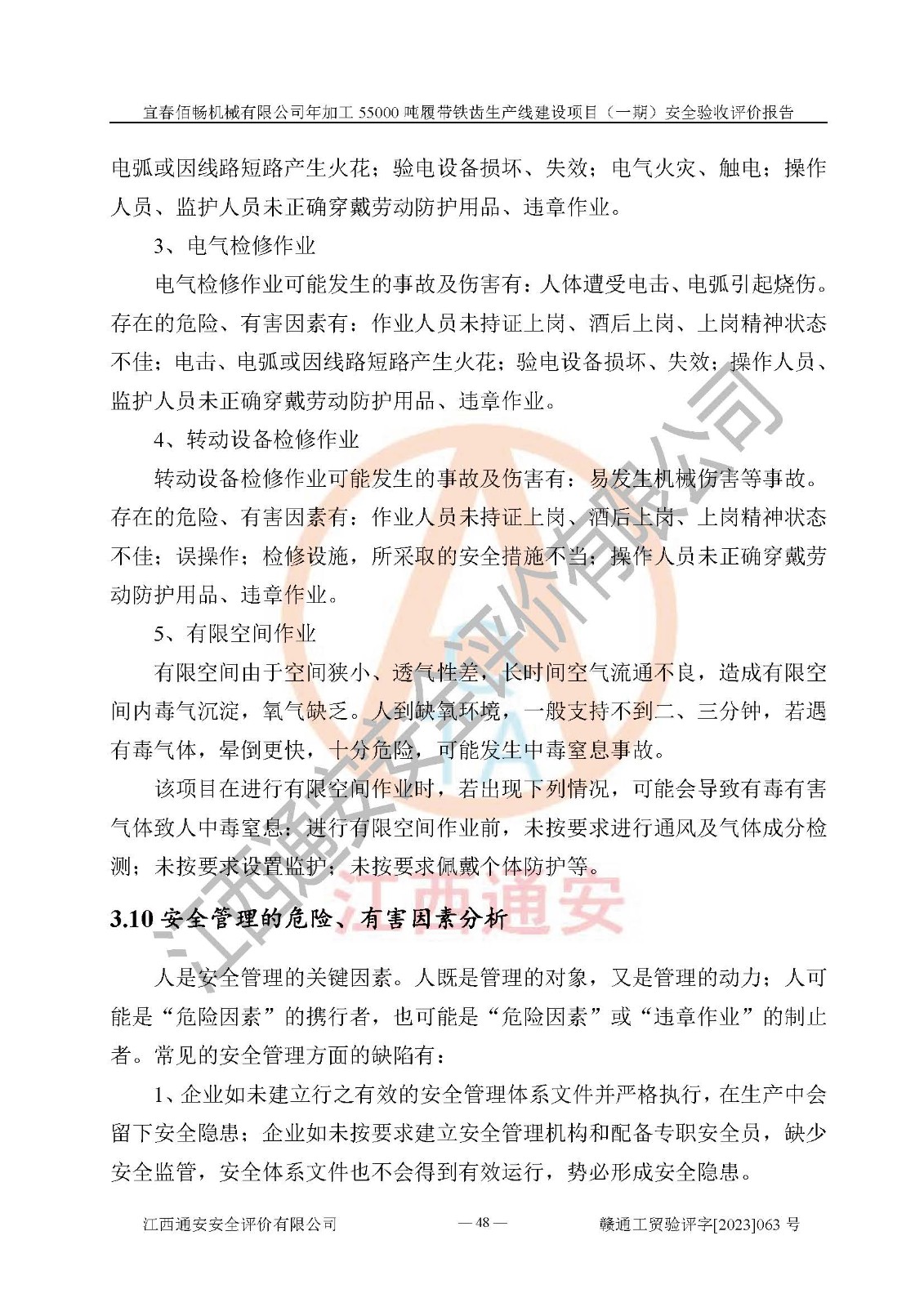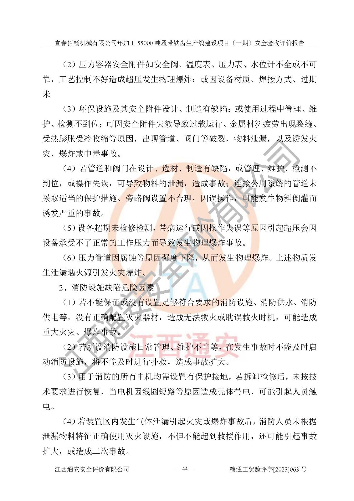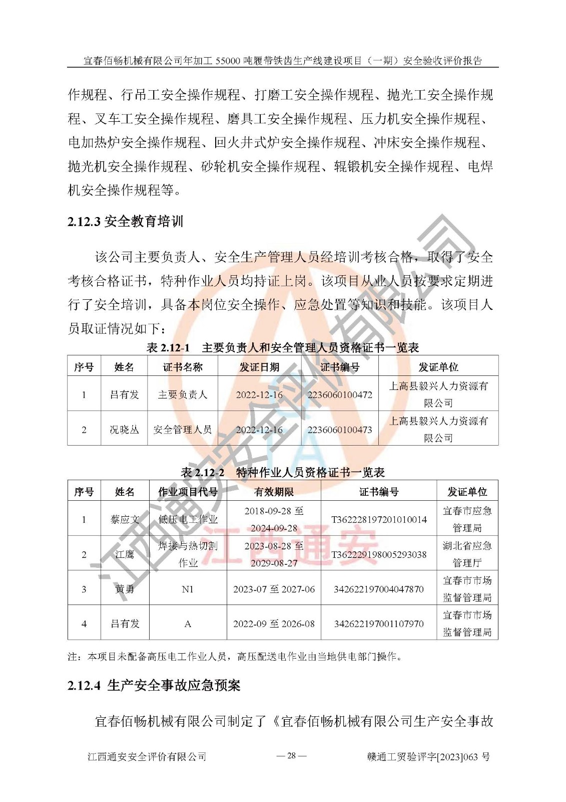 其它 | 根據(jù)《中華人民共和國(guó)安全生產(chǎn)法》、《新建項(xiàng)目安全設(shè)施“三同時(shí)”監(jiān)督管理辦法》(原**安全生產(chǎn)監(jiān)督管理總局令第77號(hào)修訂)等法律法規(guī)的要求,對(duì)宜春佰暢機(jī)械有限公司年加工55000噸履帶鐵齒生產(chǎn)線建設(shè)項(xiàng)目(一期)安全驗(yàn)收的基本條件進(jìn)行分析,結(jié)果如下: 1)本項(xiàng)目在初步設(shè)計(jì)及建設(shè)過程中基本能貫徹執(zhí)行**、地方及有關(guān)部門的安全生產(chǎn)法律法規(guī)、標(biāo)準(zhǔn)要求,取得了**相關(guān)部門的許可、備案。項(xiàng)目的設(shè)計(jì)、施工、監(jiān)理等單位均有相應(yīng)資質(zhì)。 2)本項(xiàng)目址選符合要求;總平面布置合理,主要建筑的防火間距符合符合《建筑設(shè)計(jì)防火規(guī)范(2018版)》(GB50016-2014)、《工業(yè)企業(yè)總平面設(shè)計(jì)規(guī)范》(GB50187-2012)有關(guān)規(guī)范、標(biāo)準(zhǔn)的要求。 3)本項(xiàng)目生產(chǎn)工藝成熟、試運(yùn)行正常,試運(yùn)行中過程中工藝和裝置、設(shè)備(設(shè)施)安全、可靠,未發(fā)生安全事故。 4)本項(xiàng)目的特種設(shè)備由有資質(zhì)單位設(shè)計(jì)、制造、安裝,特種設(shè)備經(jīng)宜春市特種設(shè)備檢驗(yàn)中心檢驗(yàn)合格,符合《中華人民共和國(guó)特種設(shè)備安全法》、《特種設(shè)備安全監(jiān)察條例》(中華人民共和國(guó)***令第549號(hào))的規(guī)定。特種設(shè)備作業(yè)人員、特種作業(yè)人員均持證上崗。 5)公司主要負(fù)責(zé)人及安全管理人員取得了上高縣毅興人力資源有限公司頒發(fā)的培訓(xùn)證書,特種作業(yè)人員操作證在**期內(nèi),其他從業(yè)人員經(jīng)安全培訓(xùn)符合,取得上崗證。符合要求。 6)公司建立有安全管理制度,制定有各類人員的安全生產(chǎn)責(zé)任制、各項(xiàng)安全管理制度和操作規(guī)程。按照**有關(guān)規(guī)定編制了事故應(yīng)急救援預(yù)案并進(jìn)行了備案,并定期進(jìn)行演練等,符合要求。 7)本項(xiàng)目作業(yè)條件危險(xiǎn)性分析結(jié)果:在選定的單元的危險(xiǎn)程度均為“一般危險(xiǎn),需要注意”或“稍有危險(xiǎn),可以接受”,作業(yè)條件相對(duì)安全。 評(píng)價(jià)結(jié)論: 宜春佰暢機(jī)械有限公司年加工55000噸履帶鐵齒生產(chǎn)線建設(shè)項(xiàng)目(一期)的安全設(shè)施及安全管理符合**及有關(guān)部門關(guān)于安全生產(chǎn)法律、法規(guī)、標(biāo)準(zhǔn)的要求,該項(xiàng)目試生產(chǎn)以來,工藝設(shè)備、安全設(shè)施及企業(yè)安全管理機(jī)制等運(yùn)行正常,安全設(shè)施、措施達(dá)到設(shè)計(jì)要求和預(yù)期結(jié)果,可以滿足建設(shè)項(xiàng)目安全生產(chǎn)的要求,安全生產(chǎn)管理**,具備竣工驗(yàn)收條件。 | ||||