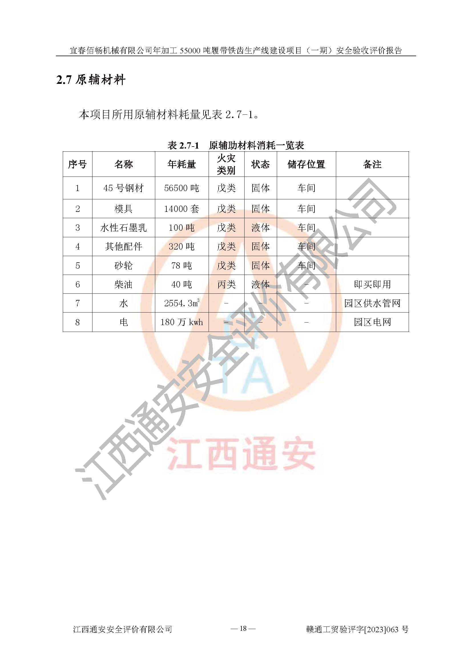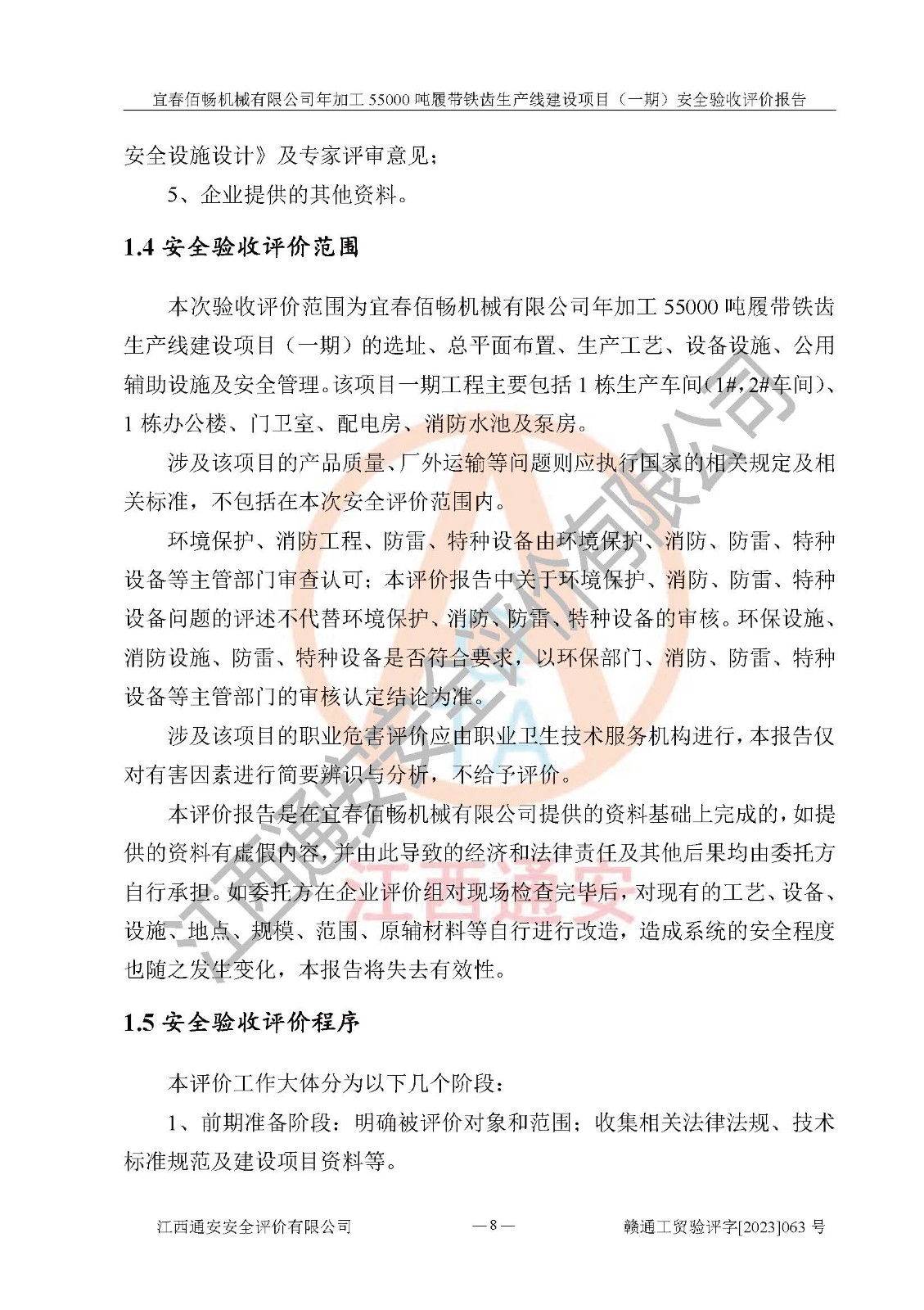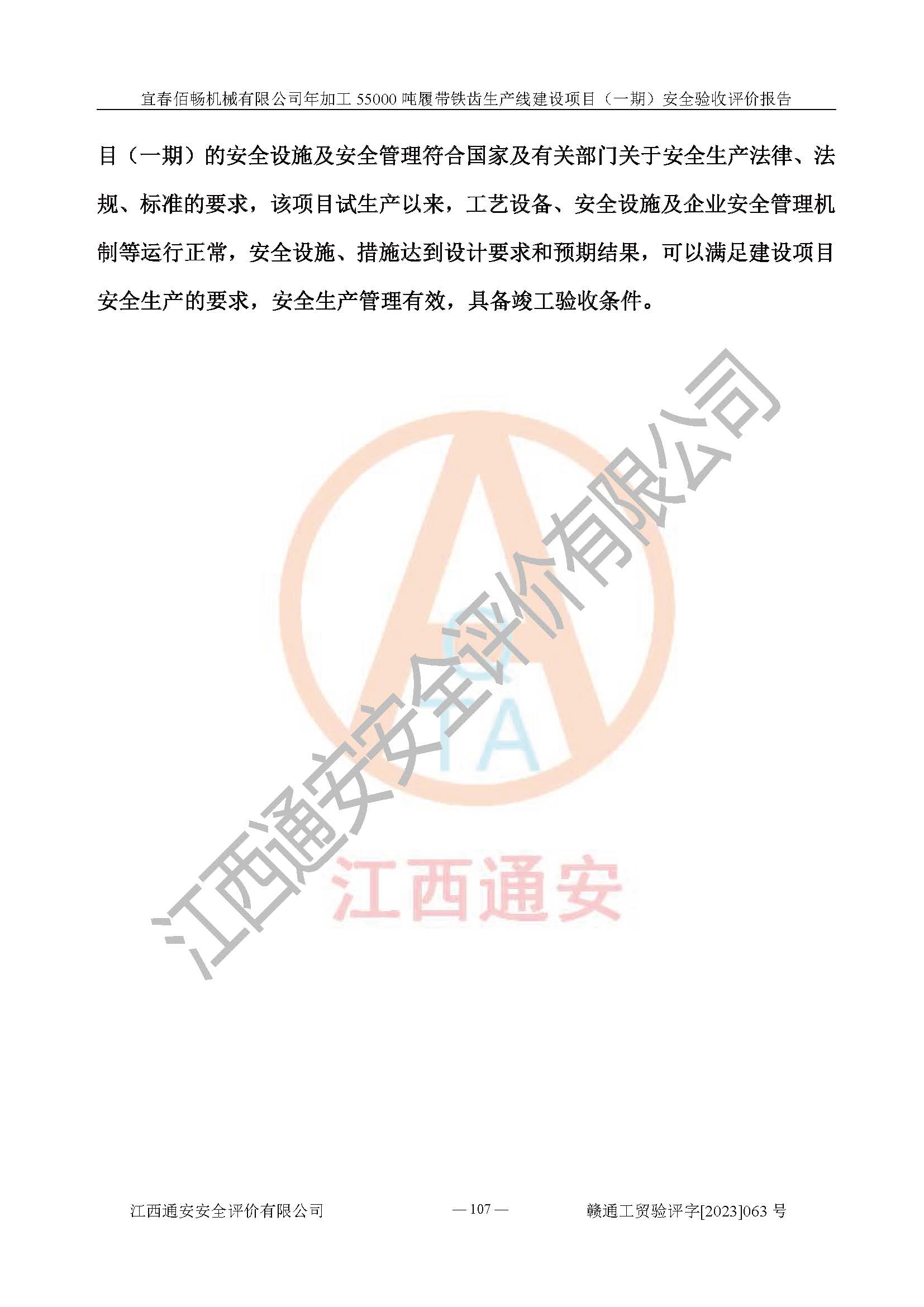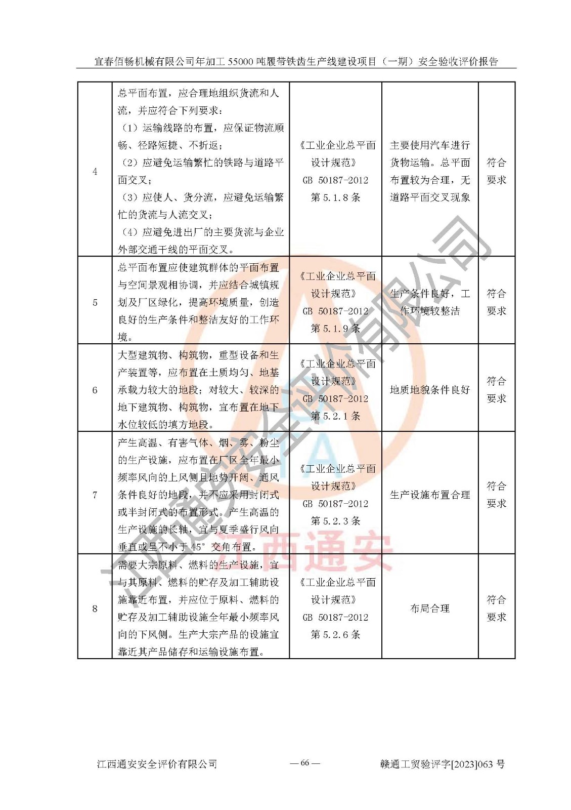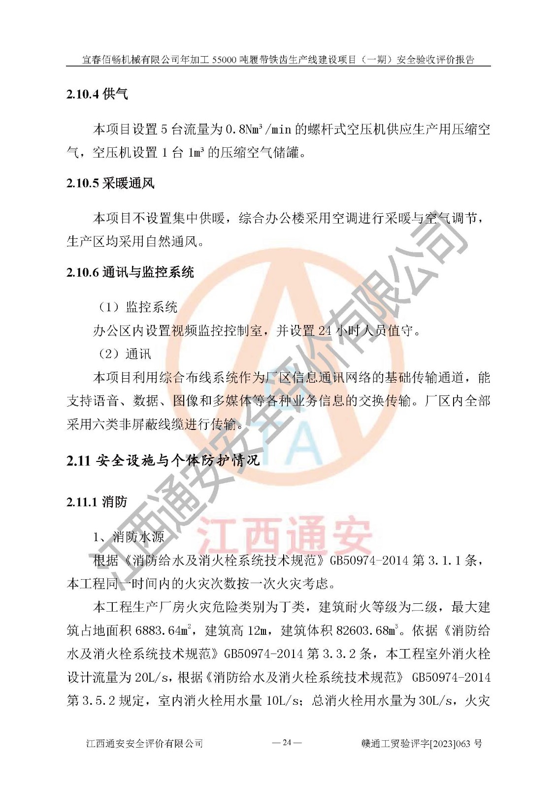 其它 | 根據(jù)《中華人民共和國(guó)安全生產(chǎn)法》、《新建項(xiàng)目安全設(shè)施“三同時(shí)”監(jiān)督管理辦法》(原**安全生產(chǎn)監(jiān)督管理總局令第77號(hào)修訂)等法律法規(guī)的要求,對(duì)宜春佰暢機(jī)械有限公司年加工55000噸履帶鐵齒生產(chǎn)線建設(shè)項(xiàng)目(一期)安全驗(yàn)收的基本條件進(jìn)行分析,結(jié)果如下: 1)本項(xiàng)目在初步設(shè)計(jì)及建設(shè)過程中基本能貫徹執(zhí)行**、地方及有關(guān)部門的安全生產(chǎn)法律法規(guī)、標(biāo)準(zhǔn)要求,取得了**相關(guān)部門的許可、備案。項(xiàng)目的設(shè)計(jì)、施工、監(jiān)理等單位均有相應(yīng)資質(zhì)。 2)本項(xiàng)目址選符合要求;總平面布置合理,主要建筑的防火間距符合符合《建筑設(shè)計(jì)防火規(guī)范(2018版)》(GB50016-2014)、《工業(yè)企業(yè)總平面設(shè)計(jì)規(guī)范》(GB50187-2012)有關(guān)規(guī)范、標(biāo)準(zhǔn)的要求。 3)本項(xiàng)目生產(chǎn)工藝成熟、試運(yùn)行正常,試運(yùn)行中過程中工藝和裝置、設(shè)備(設(shè)施)安全、可靠,未發(fā)生安全事故。 4)本項(xiàng)目的特種設(shè)備由有資質(zhì)單位設(shè)計(jì)、制造、安裝,特種設(shè)備經(jīng)宜春市特種設(shè)備檢驗(yàn)中心檢驗(yàn)合格,符合《中華人民共和國(guó)特種設(shè)備安全法》、《特種設(shè)備安全監(jiān)察條例》(中華人民共和國(guó)***令第549號(hào))的規(guī)定。特種設(shè)備作業(yè)人員、特種作業(yè)人員均持證上崗。 5)公司主要負(fù)責(zé)人及安全管理人員取得了上高縣毅興人力資源有限公司頒發(fā)的培訓(xùn)證書,特種作業(yè)人員操作證在**期內(nèi),其他從業(yè)人員經(jīng)安全培訓(xùn)符合,取得上崗證。符合要求。 6)公司建立有安全管理制度,制定有各類人員的安全生產(chǎn)責(zé)任制、各項(xiàng)安全管理制度和操作規(guī)程。按照**有關(guān)規(guī)定編制了事故應(yīng)急救援預(yù)案并進(jìn)行了備案,并定期進(jìn)行演練等,符合要求。 7)本項(xiàng)目作業(yè)條件危險(xiǎn)性分析結(jié)果:在選定的單元的危險(xiǎn)程度均為“一般危險(xiǎn),需要注意”或“稍有危險(xiǎn),可以接受”,作業(yè)條件相對(duì)安全。 評(píng)價(jià)結(jié)論: 宜春佰暢機(jī)械有限公司年加工55000噸履帶鐵齒生產(chǎn)線建設(shè)項(xiàng)目(一期)的安全設(shè)施及安全管理符合**及有關(guān)部門關(guān)于安全生產(chǎn)法律、法規(guī)、標(biāo)準(zhǔn)的要求,該項(xiàng)目試生產(chǎn)以來,工藝設(shè)備、安全設(shè)施及企業(yè)安全管理機(jī)制等運(yùn)行正常,安全設(shè)施、措施達(dá)到設(shè)計(jì)要求和預(yù)期結(jié)果,可以滿足建設(shè)項(xiàng)目安全生產(chǎn)的要求,安全生產(chǎn)管理**,具備竣工驗(yàn)收條件。 | ||||
