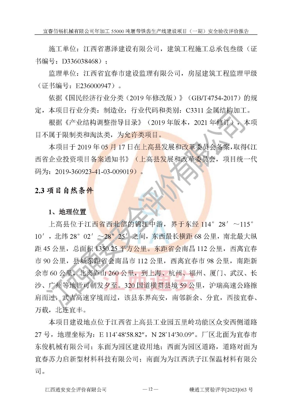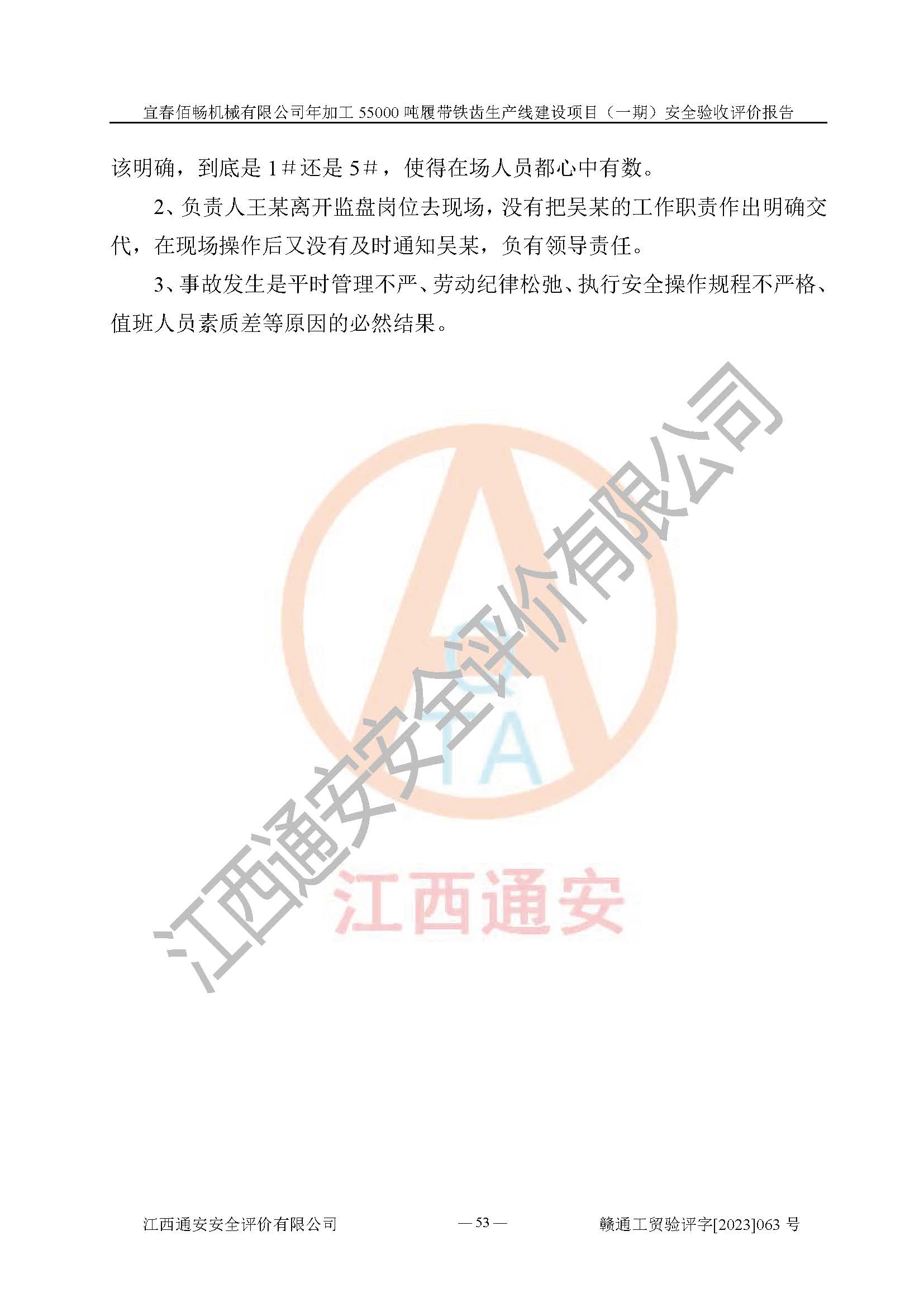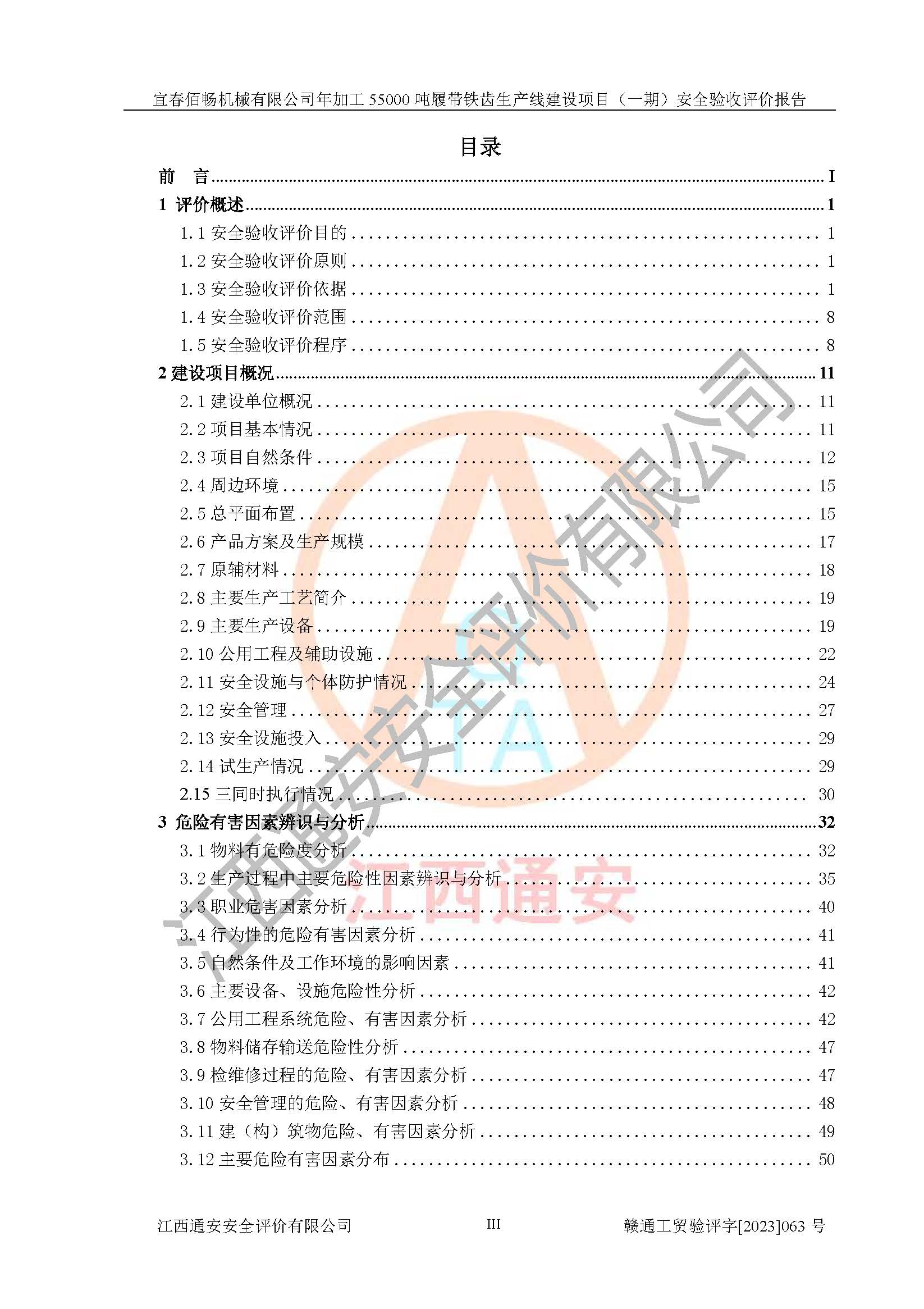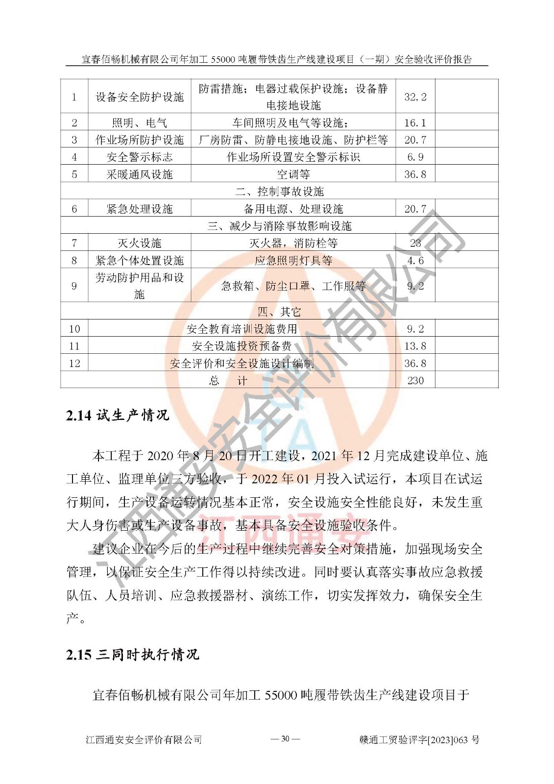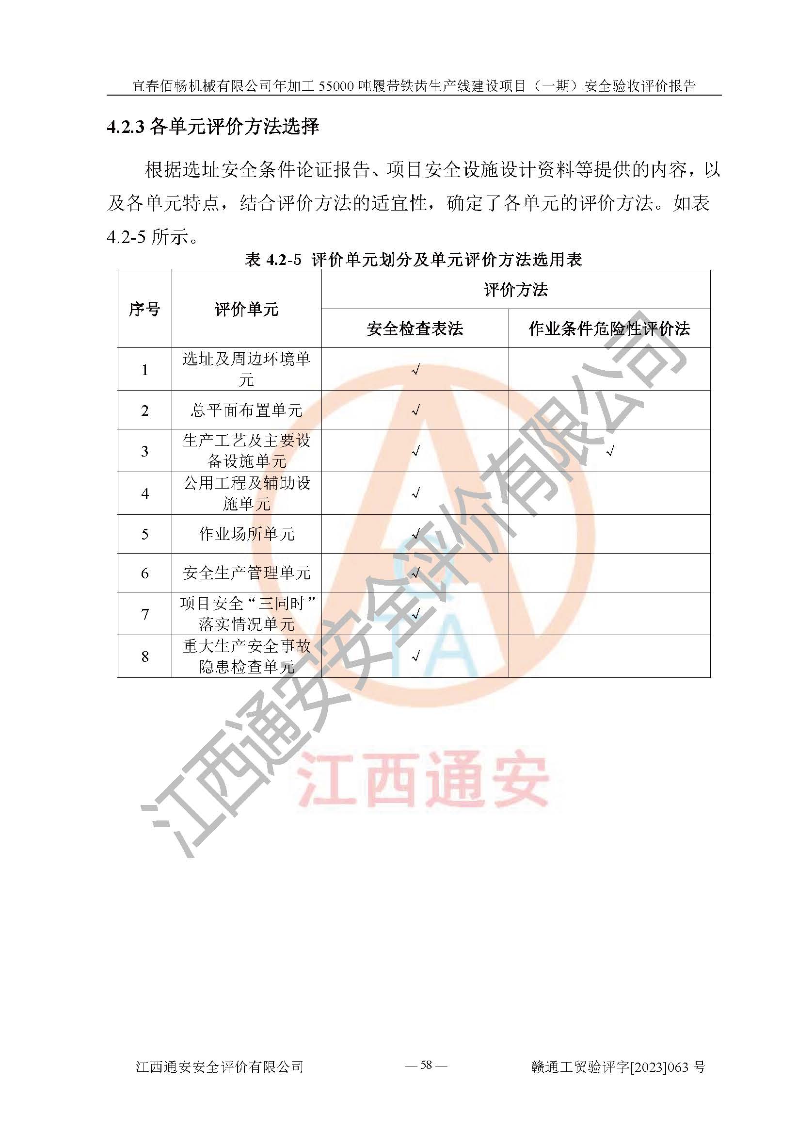 其它 | 根據(jù)《中華人民共和國(guó)安全生產(chǎn)法》、《新建項(xiàng)目安全設(shè)施“三同時(shí)”監(jiān)督管理辦法》(原**安全生產(chǎn)監(jiān)督管理總局令第77號(hào)修訂)等法律法規(guī)的要求,對(duì)宜春佰暢機(jī)械有限公司年加工55000噸履帶鐵齒生產(chǎn)線建設(shè)項(xiàng)目(一期)安全驗(yàn)收的基本條件進(jìn)行分析,結(jié)果如下: 1)本項(xiàng)目在初步設(shè)計(jì)及建設(shè)過程中基本能貫徹執(zhí)行**、地方及有關(guān)部門的安全生產(chǎn)法律法規(guī)、標(biāo)準(zhǔn)要求,取得了**相關(guān)部門的許可、備案。項(xiàng)目的設(shè)計(jì)、施工、監(jiān)理等單位均有相應(yīng)資質(zhì)。 2)本項(xiàng)目址選符合要求;總平面布置合理,主要建筑的防火間距符合符合《建筑設(shè)計(jì)防火規(guī)范(2018版)》(GB50016-2014)、《工業(yè)企業(yè)總平面設(shè)計(jì)規(guī)范》(GB50187-2012)有關(guān)規(guī)范、標(biāo)準(zhǔn)的要求。 3)本項(xiàng)目生產(chǎn)工藝成熟、試運(yùn)行正常,試運(yùn)行中過程中工藝和裝置、設(shè)備(設(shè)施)安全、可靠,未發(fā)生安全事故。 4)本項(xiàng)目的特種設(shè)備由有資質(zhì)單位設(shè)計(jì)、制造、安裝,特種設(shè)備經(jīng)宜春市特種設(shè)備檢驗(yàn)中心檢驗(yàn)合格,符合《中華人民共和國(guó)特種設(shè)備安全法》、《特種設(shè)備安全監(jiān)察條例》(中華人民共和國(guó)***令第549號(hào))的規(guī)定。特種設(shè)備作業(yè)人員、特種作業(yè)人員均持證上崗。 5)公司主要負(fù)責(zé)人及安全管理人員取得了上高縣毅興人力資源有限公司頒發(fā)的培訓(xùn)證書,特種作業(yè)人員操作證在**期內(nèi),其他從業(yè)人員經(jīng)安全培訓(xùn)符合,取得上崗證。符合要求。 6)公司建立有安全管理制度,制定有各類人員的安全生產(chǎn)責(zé)任制、各項(xiàng)安全管理制度和操作規(guī)程。按照**有關(guān)規(guī)定編制了事故應(yīng)急救援預(yù)案并進(jìn)行了備案,并定期進(jìn)行演練等,符合要求。 7)本項(xiàng)目作業(yè)條件危險(xiǎn)性分析結(jié)果:在選定的單元的危險(xiǎn)程度均為“一般危險(xiǎn),需要注意”或“稍有危險(xiǎn),可以接受”,作業(yè)條件相對(duì)安全。 評(píng)價(jià)結(jié)論: 宜春佰暢機(jī)械有限公司年加工55000噸履帶鐵齒生產(chǎn)線建設(shè)項(xiàng)目(一期)的安全設(shè)施及安全管理符合**及有關(guān)部門關(guān)于安全生產(chǎn)法律、法規(guī)、標(biāo)準(zhǔn)的要求,該項(xiàng)目試生產(chǎn)以來,工藝設(shè)備、安全設(shè)施及企業(yè)安全管理機(jī)制等運(yùn)行正常,安全設(shè)施、措施達(dá)到設(shè)計(jì)要求和預(yù)期結(jié)果,可以滿足建設(shè)項(xiàng)目安全生產(chǎn)的要求,安全生產(chǎn)管理**,具備竣工驗(yàn)收條件。 | ||||