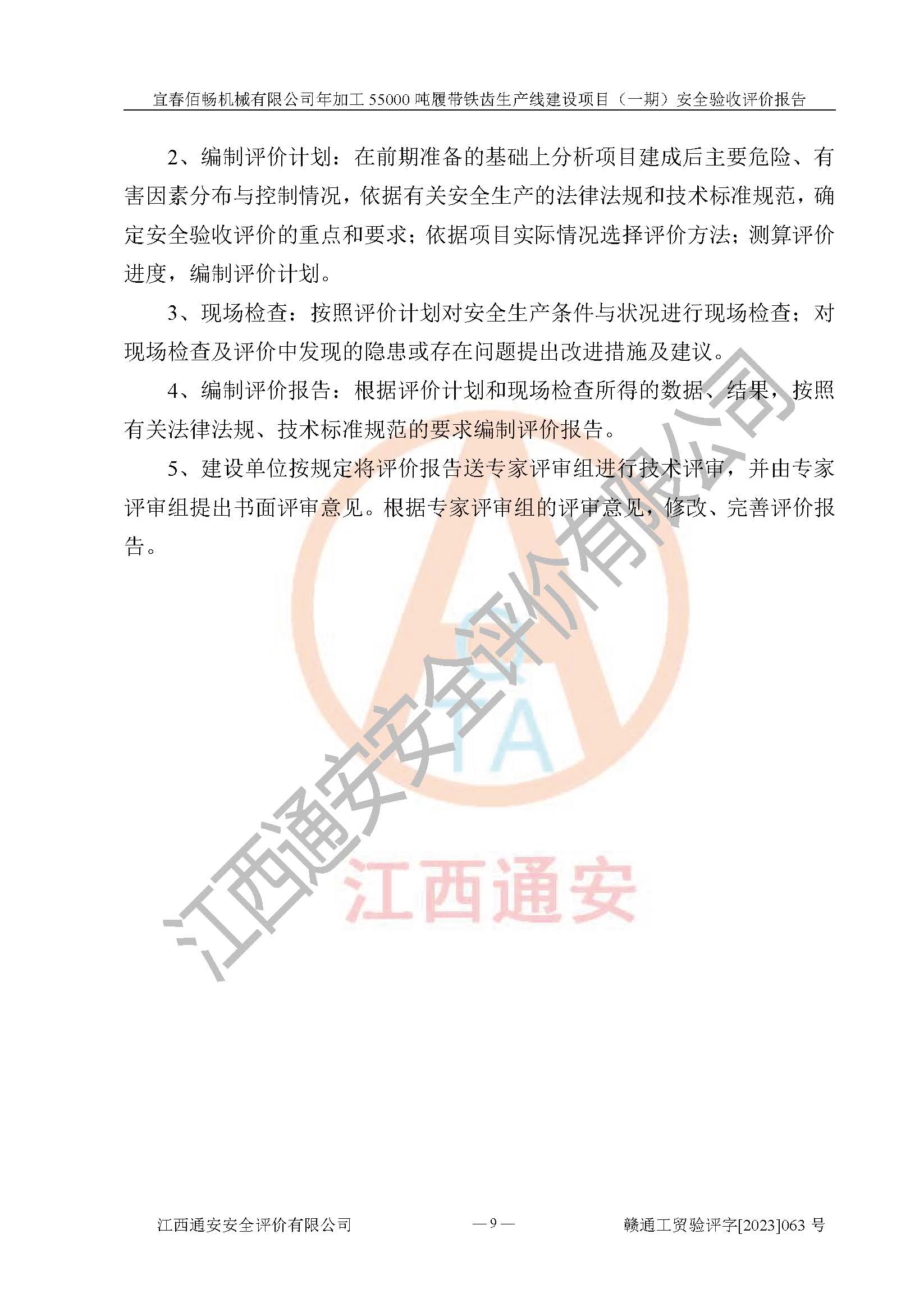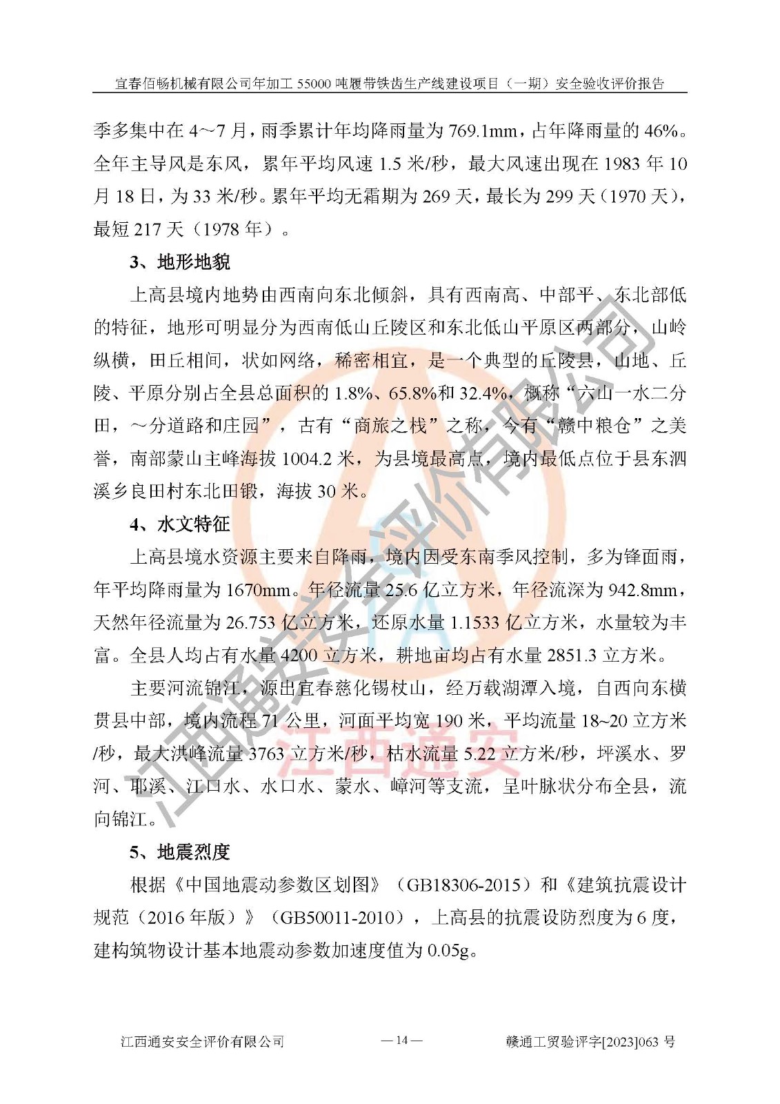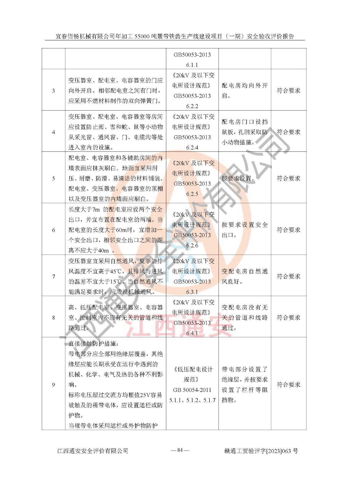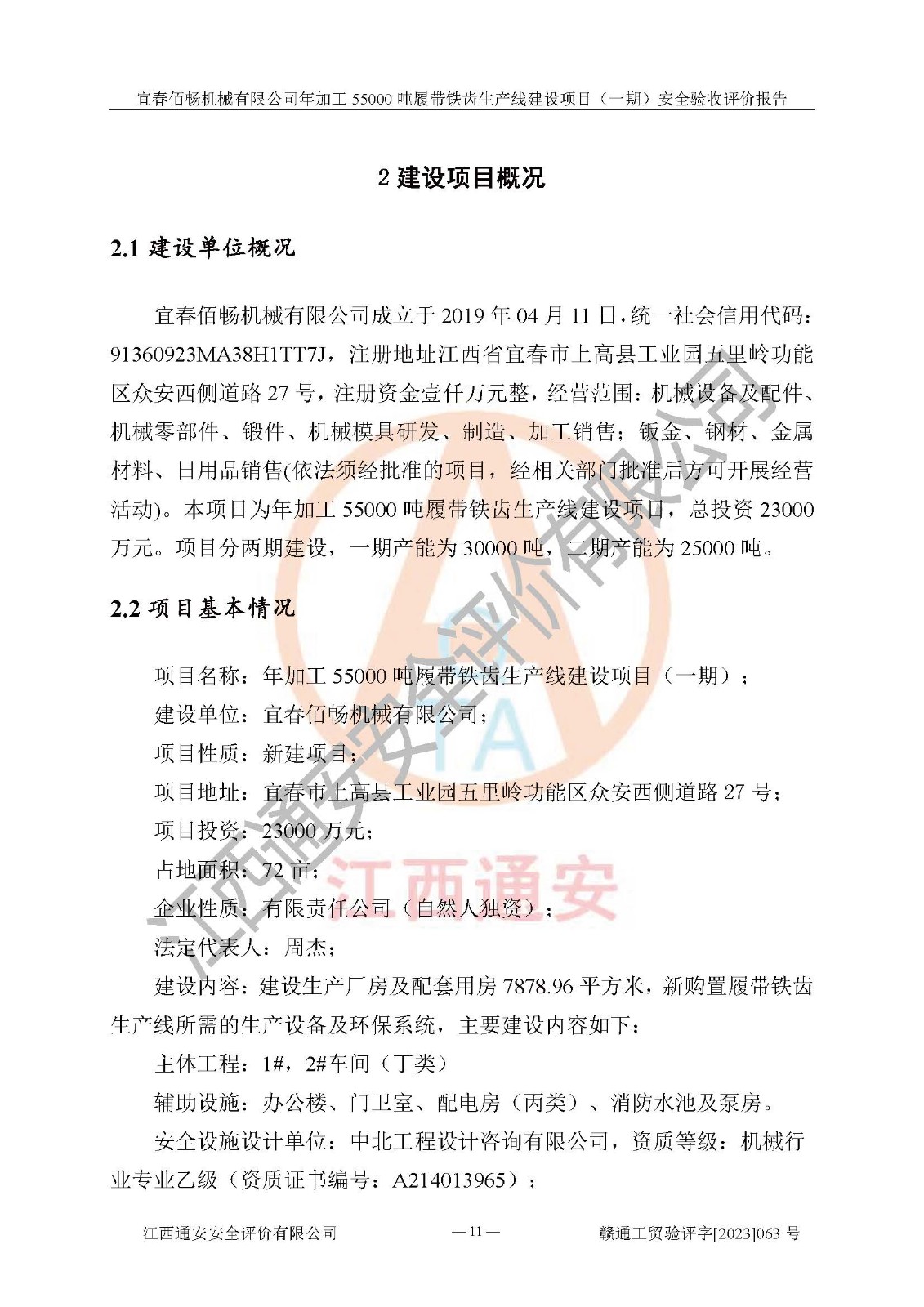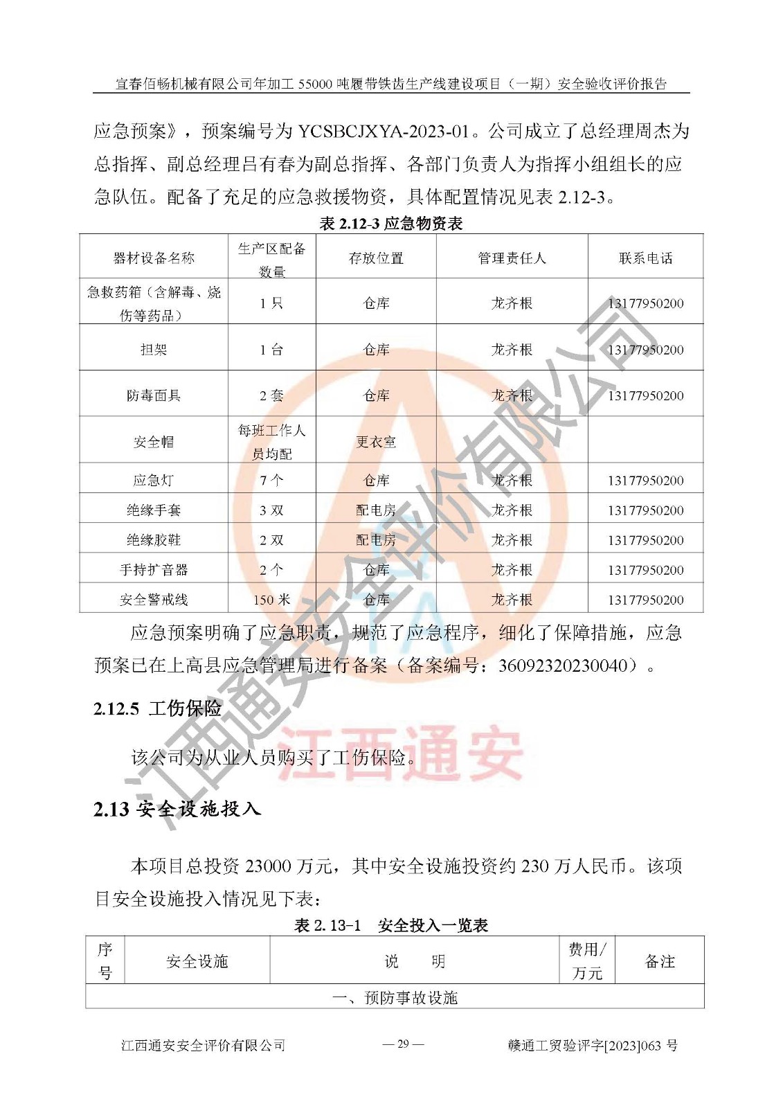 其它 | 根據(jù)《中華人民共和國(guó)安全生產(chǎn)法》、《新建項(xiàng)目安全設(shè)施“三同時(shí)”監(jiān)督管理辦法》(原**安全生產(chǎn)監(jiān)督管理總局令第77號(hào)修訂)等法律法規(guī)的要求,對(duì)宜春佰暢機(jī)械有限公司年加工55000噸履帶鐵齒生產(chǎn)線建設(shè)項(xiàng)目(一期)安全驗(yàn)收的基本條件進(jìn)行分析,結(jié)果如下: 1)本項(xiàng)目在初步設(shè)計(jì)及建設(shè)過程中基本能貫徹執(zhí)行**、地方及有關(guān)部門的安全生產(chǎn)法律法規(guī)、標(biāo)準(zhǔn)要求,取得了**相關(guān)部門的許可、備案。項(xiàng)目的設(shè)計(jì)、施工、監(jiān)理等單位均有相應(yīng)資質(zhì)。 2)本項(xiàng)目址選符合要求;總平面布置合理,主要建筑的防火間距符合符合《建筑設(shè)計(jì)防火規(guī)范(2018版)》(GB50016-2014)、《工業(yè)企業(yè)總平面設(shè)計(jì)規(guī)范》(GB50187-2012)有關(guān)規(guī)范、標(biāo)準(zhǔn)的要求。 3)本項(xiàng)目生產(chǎn)工藝成熟、試運(yùn)行正常,試運(yùn)行中過程中工藝和裝置、設(shè)備(設(shè)施)安全、可靠,未發(fā)生安全事故。 4)本項(xiàng)目的特種設(shè)備由有資質(zhì)單位設(shè)計(jì)、制造、安裝,特種設(shè)備經(jīng)宜春市特種設(shè)備檢驗(yàn)中心檢驗(yàn)合格,符合《中華人民共和國(guó)特種設(shè)備安全法》、《特種設(shè)備安全監(jiān)察條例》(中華人民共和國(guó)***令第549號(hào))的規(guī)定。特種設(shè)備作業(yè)人員、特種作業(yè)人員均持證上崗。 5)公司主要負(fù)責(zé)人及安全管理人員取得了上高縣毅興人力資源有限公司頒發(fā)的培訓(xùn)證書,特種作業(yè)人員操作證在**期內(nèi),其他從業(yè)人員經(jīng)安全培訓(xùn)符合,取得上崗證。符合要求。 6)公司建立有安全管理制度,制定有各類人員的安全生產(chǎn)責(zé)任制、各項(xiàng)安全管理制度和操作規(guī)程。按照**有關(guān)規(guī)定編制了事故應(yīng)急救援預(yù)案并進(jìn)行了備案,并定期進(jìn)行演練等,符合要求。 7)本項(xiàng)目作業(yè)條件危險(xiǎn)性分析結(jié)果:在選定的單元的危險(xiǎn)程度均為“一般危險(xiǎn),需要注意”或“稍有危險(xiǎn),可以接受”,作業(yè)條件相對(duì)安全。 評(píng)價(jià)結(jié)論: 宜春佰暢機(jī)械有限公司年加工55000噸履帶鐵齒生產(chǎn)線建設(shè)項(xiàng)目(一期)的安全設(shè)施及安全管理符合**及有關(guān)部門關(guān)于安全生產(chǎn)法律、法規(guī)、標(biāo)準(zhǔn)的要求,該項(xiàng)目試生產(chǎn)以來,工藝設(shè)備、安全設(shè)施及企業(yè)安全管理機(jī)制等運(yùn)行正常,安全設(shè)施、措施達(dá)到設(shè)計(jì)要求和預(yù)期結(jié)果,可以滿足建設(shè)項(xiàng)目安全生產(chǎn)的要求,安全生產(chǎn)管理**,具備竣工驗(yàn)收條件。 | ||||