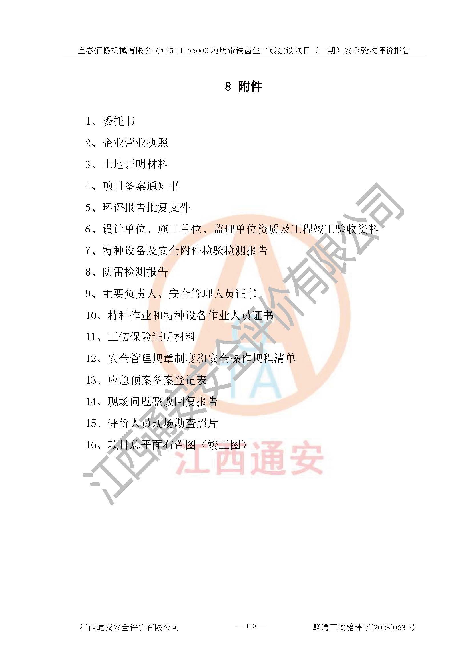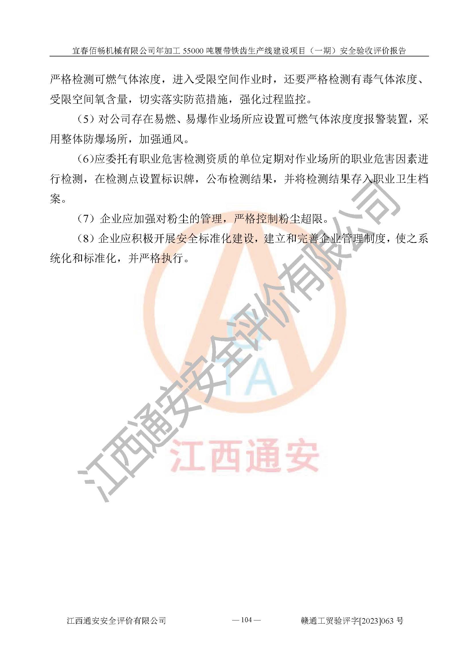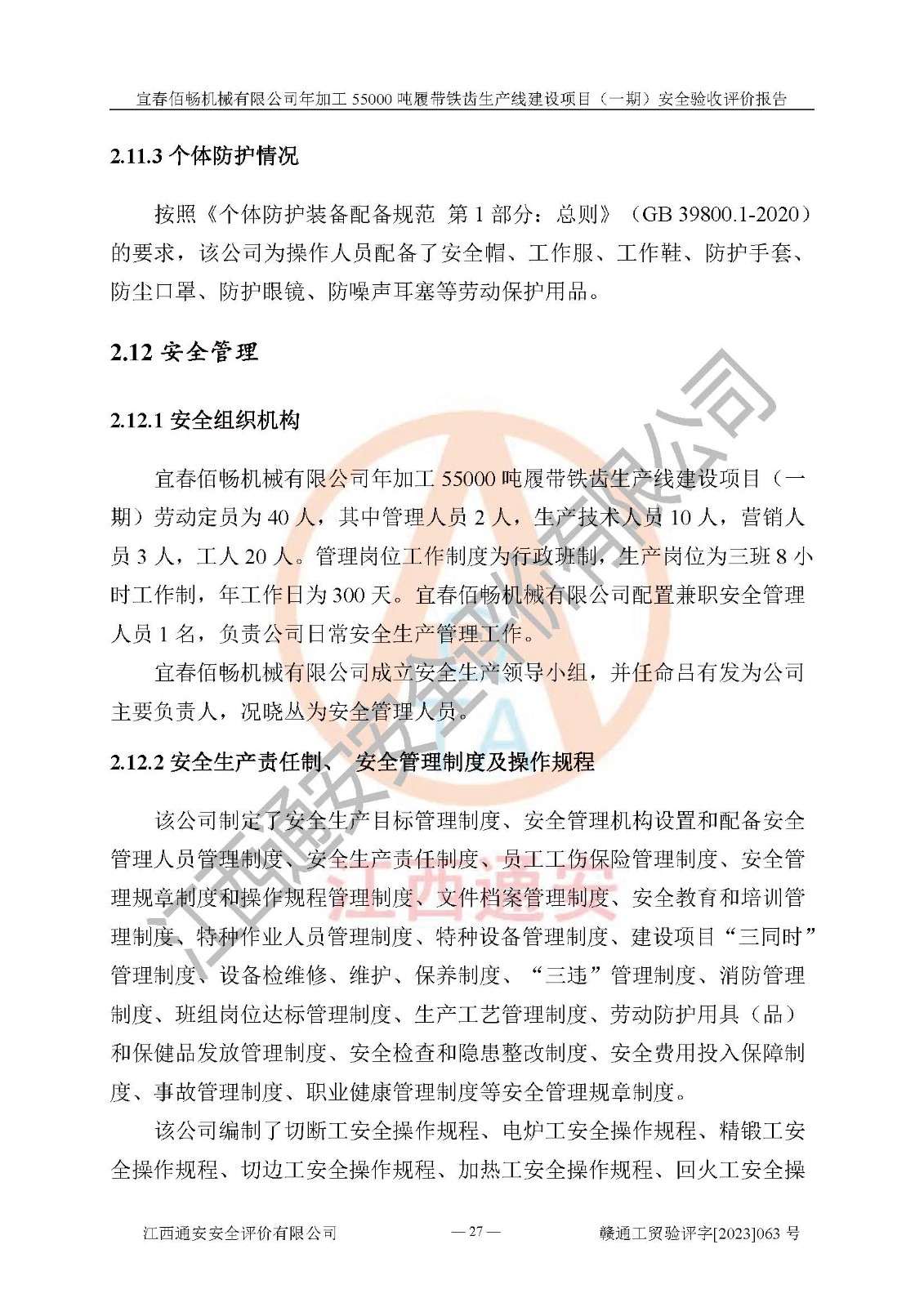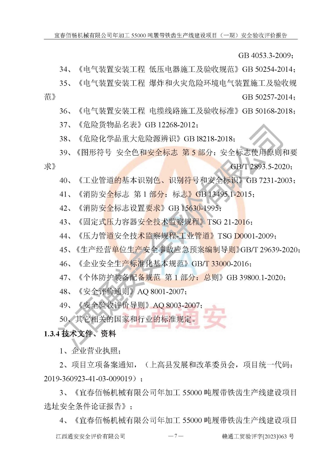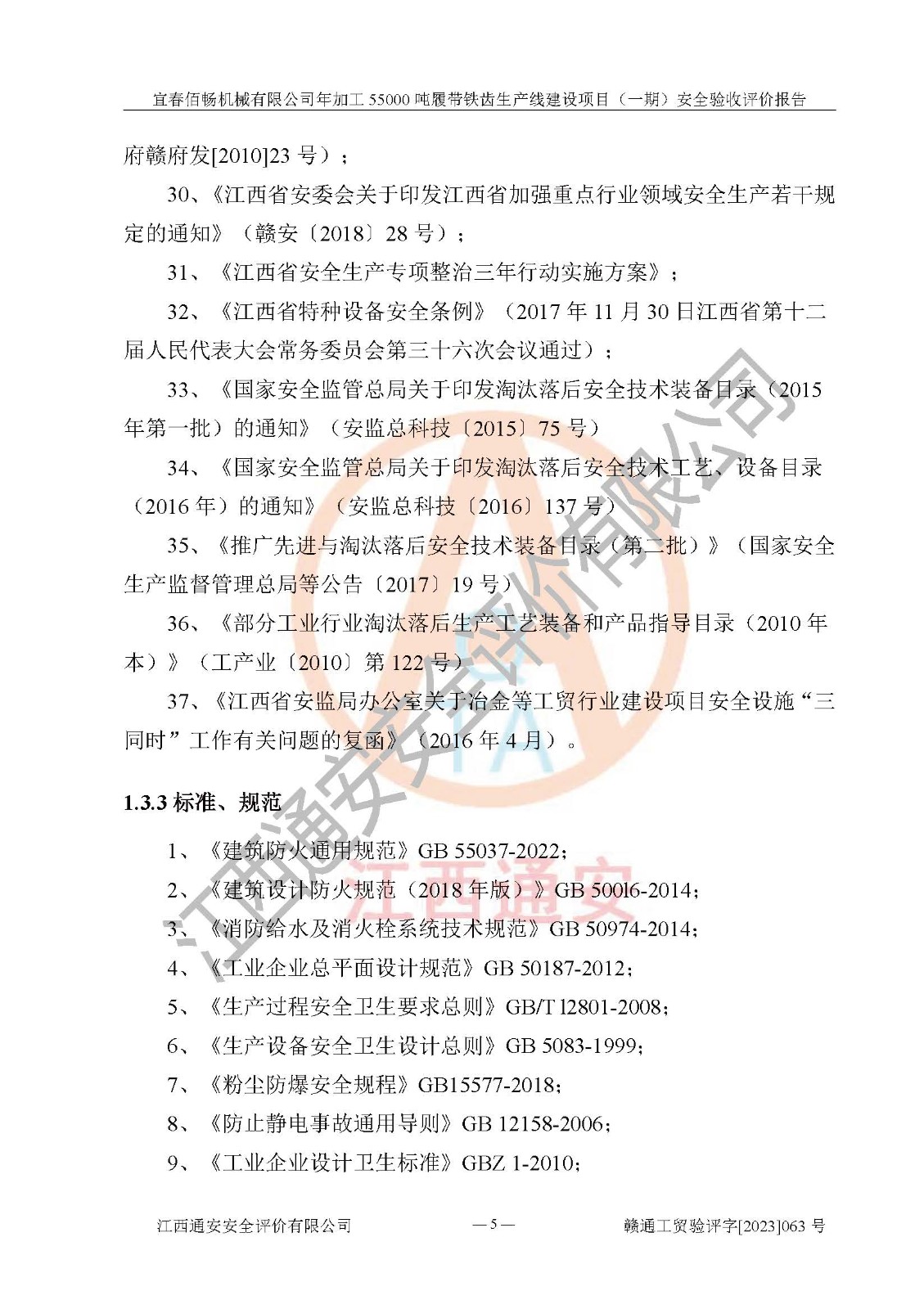 其它 | 根據(jù)《中華人民共和國(guó)安全生產(chǎn)法》、《新建項(xiàng)目安全設(shè)施“三同時(shí)”監(jiān)督管理辦法》(原**安全生產(chǎn)監(jiān)督管理總局令第77號(hào)修訂)等法律法規(guī)的要求,對(duì)宜春佰暢機(jī)械有限公司年加工55000噸履帶鐵齒生產(chǎn)線建設(shè)項(xiàng)目(一期)安全驗(yàn)收的基本條件進(jìn)行分析,結(jié)果如下: 1)本項(xiàng)目在初步設(shè)計(jì)及建設(shè)過程中基本能貫徹執(zhí)行**、地方及有關(guān)部門的安全生產(chǎn)法律法規(guī)、標(biāo)準(zhǔn)要求,取得了**相關(guān)部門的許可、備案。項(xiàng)目的設(shè)計(jì)、施工、監(jiān)理等單位均有相應(yīng)資質(zhì)。 2)本項(xiàng)目址選符合要求;總平面布置合理,主要建筑的防火間距符合符合《建筑設(shè)計(jì)防火規(guī)范(2018版)》(GB50016-2014)、《工業(yè)企業(yè)總平面設(shè)計(jì)規(guī)范》(GB50187-2012)有關(guān)規(guī)范、標(biāo)準(zhǔn)的要求。 3)本項(xiàng)目生產(chǎn)工藝成熟、試運(yùn)行正常,試運(yùn)行中過程中工藝和裝置、設(shè)備(設(shè)施)安全、可靠,未發(fā)生安全事故。 4)本項(xiàng)目的特種設(shè)備由有資質(zhì)單位設(shè)計(jì)、制造、安裝,特種設(shè)備經(jīng)宜春市特種設(shè)備檢驗(yàn)中心檢驗(yàn)合格,符合《中華人民共和國(guó)特種設(shè)備安全法》、《特種設(shè)備安全監(jiān)察條例》(中華人民共和國(guó)***令第549號(hào))的規(guī)定。特種設(shè)備作業(yè)人員、特種作業(yè)人員均持證上崗。 5)公司主要負(fù)責(zé)人及安全管理人員取得了上高縣毅興人力資源有限公司頒發(fā)的培訓(xùn)證書,特種作業(yè)人員操作證在**期內(nèi),其他從業(yè)人員經(jīng)安全培訓(xùn)符合,取得上崗證。符合要求。 6)公司建立有安全管理制度,制定有各類人員的安全生產(chǎn)責(zé)任制、各項(xiàng)安全管理制度和操作規(guī)程。按照**有關(guān)規(guī)定編制了事故應(yīng)急救援預(yù)案并進(jìn)行了備案,并定期進(jìn)行演練等,符合要求。 7)本項(xiàng)目作業(yè)條件危險(xiǎn)性分析結(jié)果:在選定的單元的危險(xiǎn)程度均為“一般危險(xiǎn),需要注意”或“稍有危險(xiǎn),可以接受”,作業(yè)條件相對(duì)安全。 評(píng)價(jià)結(jié)論: 宜春佰暢機(jī)械有限公司年加工55000噸履帶鐵齒生產(chǎn)線建設(shè)項(xiàng)目(一期)的安全設(shè)施及安全管理符合**及有關(guān)部門關(guān)于安全生產(chǎn)法律、法規(guī)、標(biāo)準(zhǔn)的要求,該項(xiàng)目試生產(chǎn)以來,工藝設(shè)備、安全設(shè)施及企業(yè)安全管理機(jī)制等運(yùn)行正常,安全設(shè)施、措施達(dá)到設(shè)計(jì)要求和預(yù)期結(jié)果,可以滿足建設(shè)項(xiàng)目安全生產(chǎn)的要求,安全生產(chǎn)管理**,具備竣工驗(yàn)收條件。 | ||||